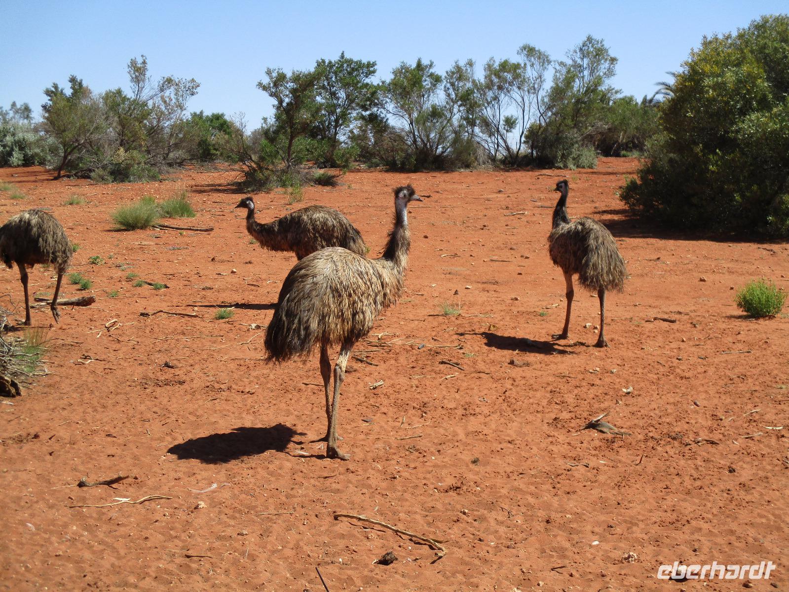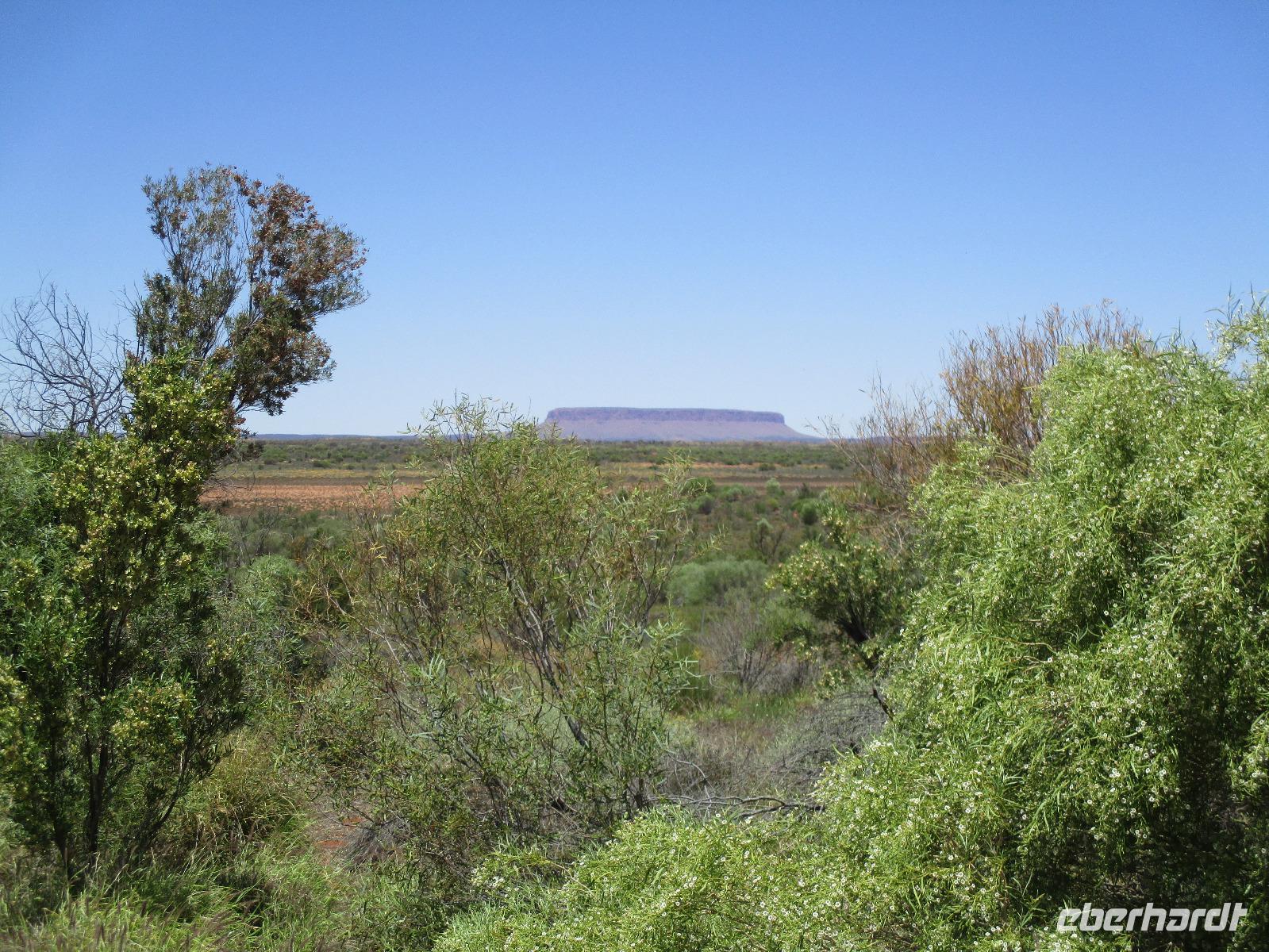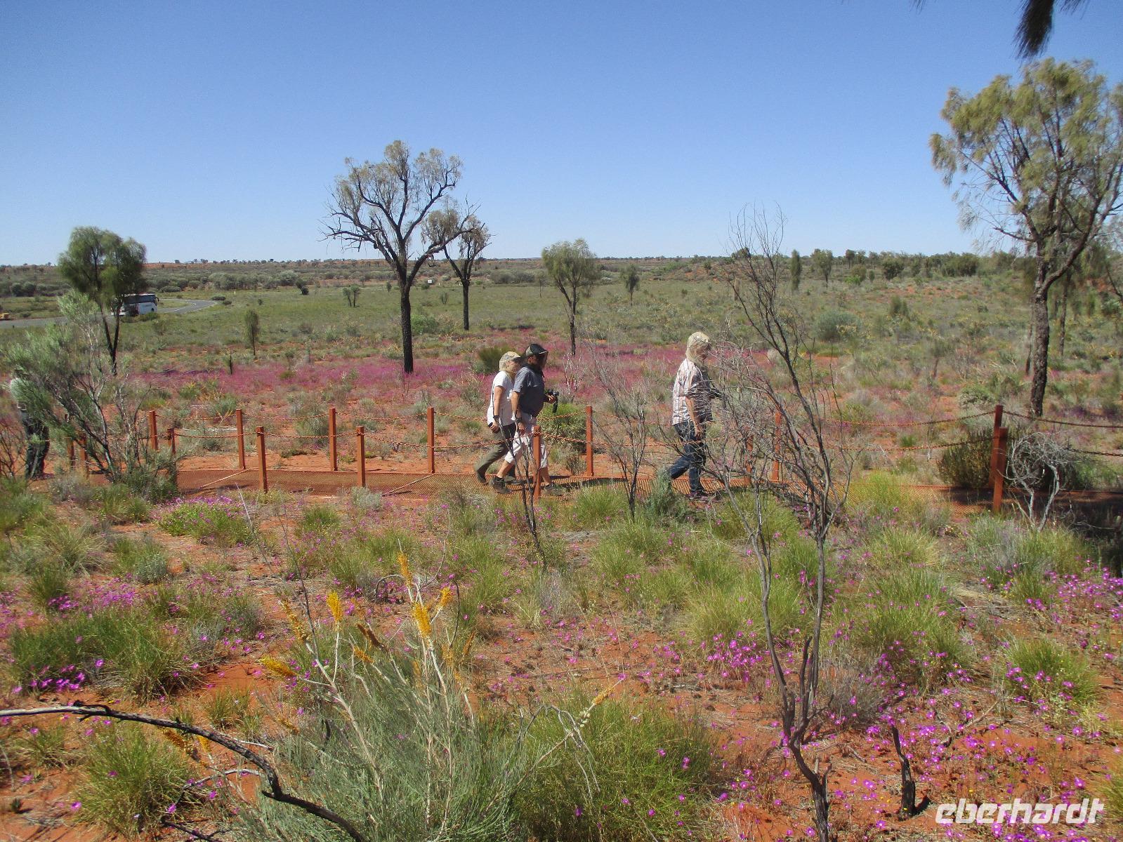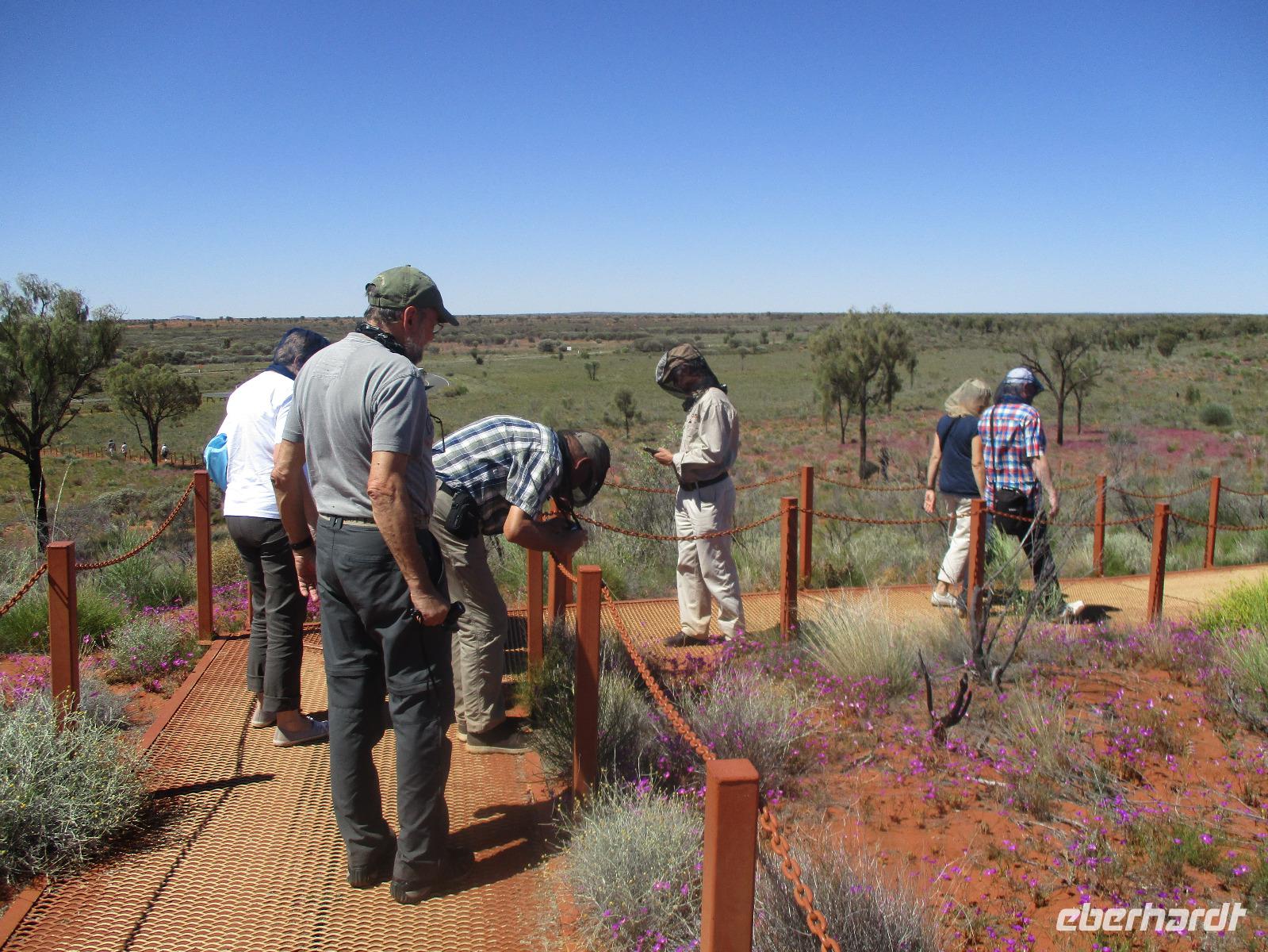 Am Morgen verließen wir Alice Springs. Unser Ziel war heute der Ayers Rock, das berühmteste Wahrzeichen Australiens mitten im roten Outback. Wir fuhren heute etwa 500 km, ein Stück des Highways Nr. 1, der auf einer Länge von ca. 16.000 km von Nord nach Süd den australischen Kontinent durchquert. Zunächst befuhren wir das erste Stück dieser Strecke, der hier Stuart Highway heißt. Jener Stuart war der erste Weiße, der einen Weg durch das undurchdringliche Gelände von Nord nach Süd gefunden hatte. Entlang seines Weges wurde die Telegrafenlinie errichtet. Nach einem kurzen Stopp an einer Raststätte, wo wir Emus sehen konnten, die dort gehalten werden, ging es weiter auf dem Lasseter Highway. Nach einiger Zeit sahen wir die sogenannte größte Zahnbürste der Welt, den Mount Conner, ein Tafelberg, der die Form einer überdimensionierten Zahnbürste hat. Danach dauerte es gar nicht mehr lange, und wir konnten in der Ferne das Ziel unserer Träume entdecken: den Ayers Rock, den die Ureinwohner Uluru nennen. Vorher aber stiegen wir noch einmal kurz aus und stiegen auf rotem Sand hinauf auf einen Hügel. Dort zeigte uns Marcel einen Busch, die Vogelerbse, dessen Blüten tatsächlich wie Vögel aussehen. Hier bekamen wir einen ersten Eindruck davon, wie lästig Fliegen sein können. Auf der Suche nach Flüssigkeit, flogen sie in unablässiger Weise um unsere Köpfe, in Augen, Nase, Ohren und Mund. Um dieser Plage Herr zu werden, erstanden wir bei Marcel Netze, die wir auf unsere Köpfe stülpen konnten. Besonders schön sahen wir damit zwar nicht aus, aber gegen die lästigen Fliegen halfen sie tatsächlich sehr gut.
