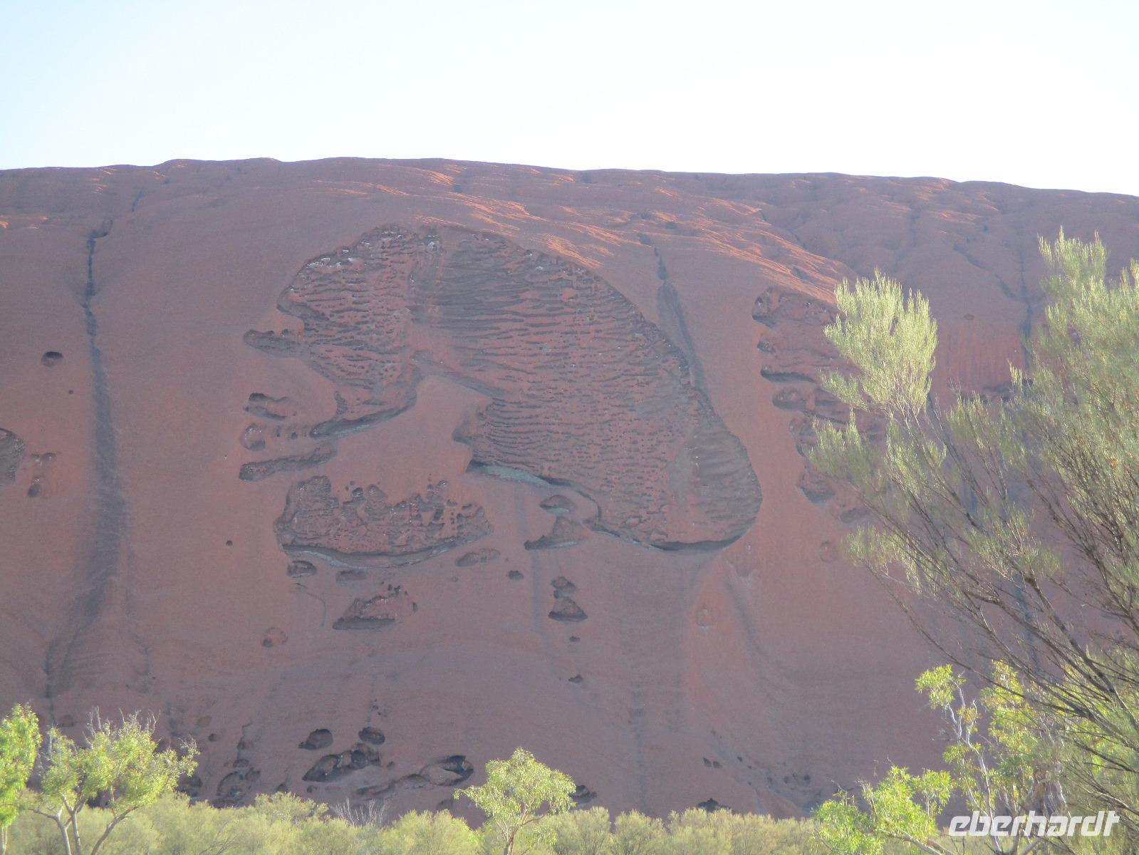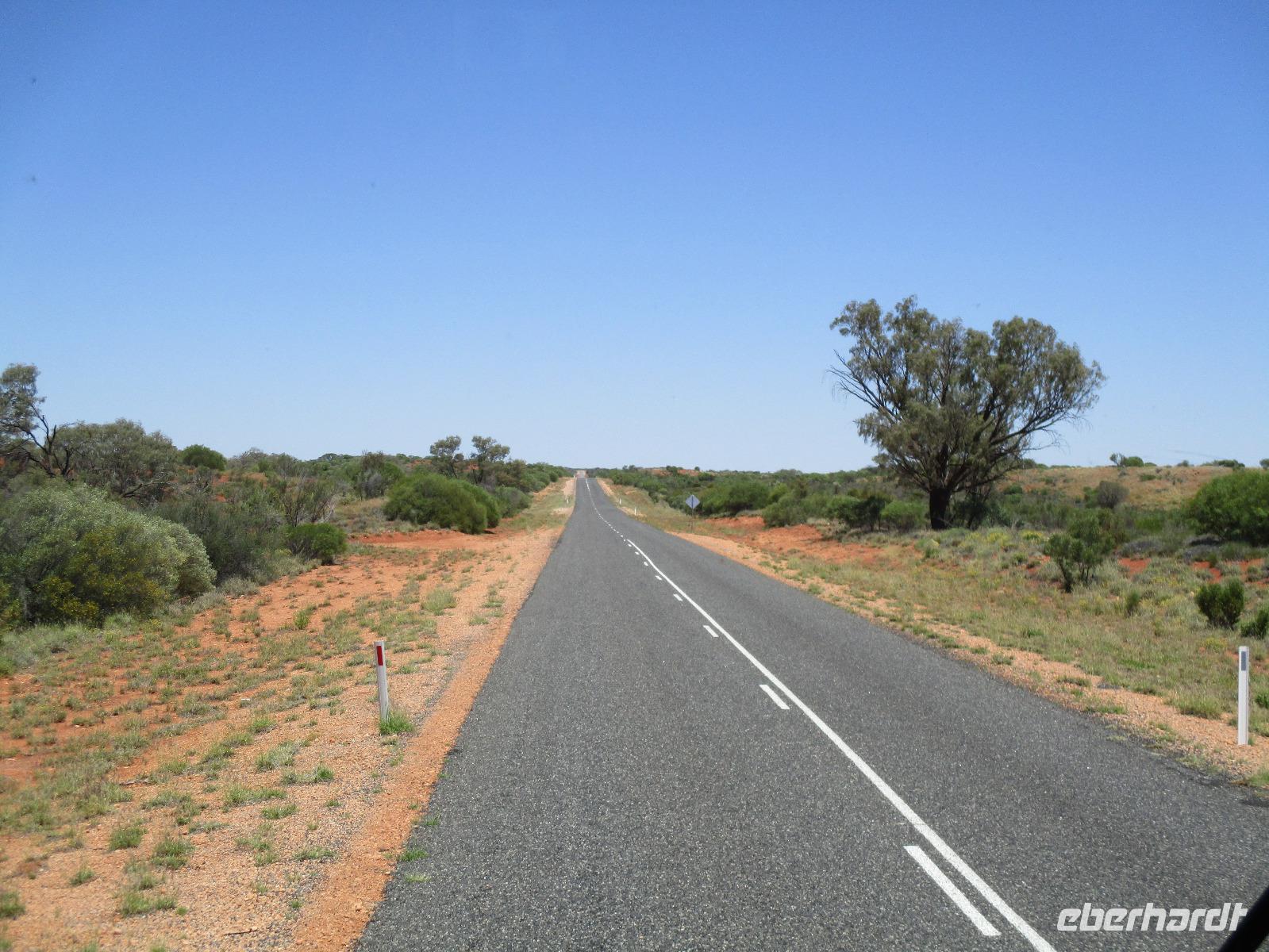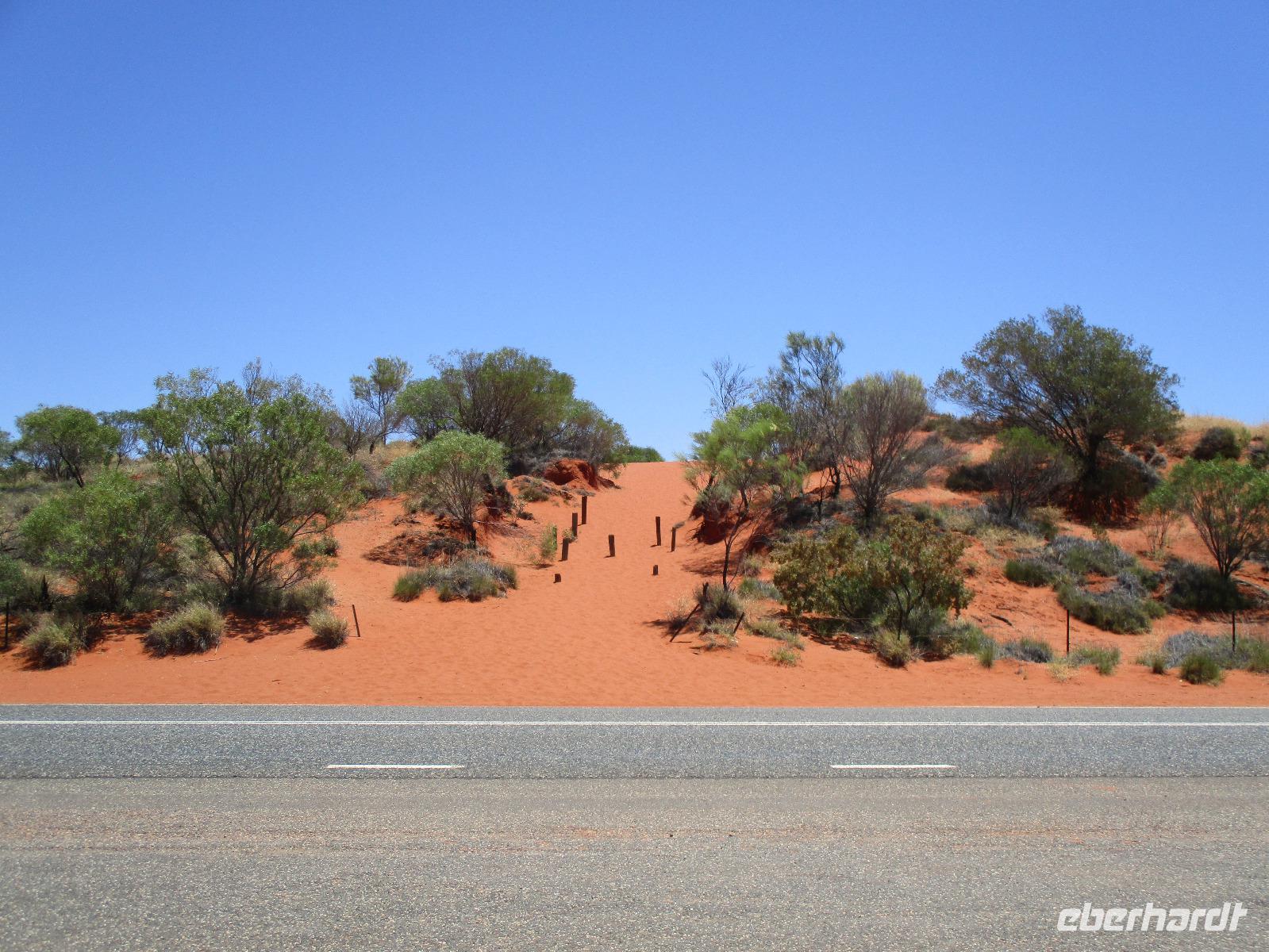 Am Morgen verließen wir Alice Springs. Unser Ziel war heute der Ayers Rock, das berühmteste Wahrzeichen Australiens mitten im roten Outback. Wir fuhren heute etwa 500 km, ein Stück des Highways Nr. 1, der auf einer Länge von ca. 16.000 km von Nord nach Süd den australischen Kontinent durchquert. Zunächst befuhren wir das erste Stück dieser Strecke, der hier Stuart Highway heißt. Jener Stuart war der erste Weiße, der einen Weg durch das undurchdringliche Gelände von Nord nach Süd gefunden hatte. Entlang seines Weges wurde die Telegrafenlinie errichtet. Nach einem kurzen Stopp an einer Raststätte, wo wir Emus sehen konnten, die dort gehalten werden, ging es weiter auf dem Lasseter Highway. Nach einiger Zeit sahen wir die sogenannte größte Zahnbürste der Welt, den Mount Conner, ein Tafelberg, der die Form einer überdimensionierten Zahnbürste hat. Danach dauerte es gar nicht mehr lange, und wir konnten in der Ferne das Ziel unserer Träume entdecken: den Ayers Rock, den die Ureinwohner Uluru nennen. Vorher aber stiegen wir noch einmal kurz aus und stiegen auf rotem Sand hinauf auf einen Hügel. Dort zeigte uns Marcel einen Busch, die Vogelerbse, dessen Blüten tatsächlich wie Vögel aussehen. Hier bekamen wir einen ersten Eindruck davon, wie lästig Fliegen sein können. Auf der Suche nach Flüssigkeit, flogen sie in unablässiger Weise um unsere Köpfe, in Augen, Nase, Ohren und Mund. Um dieser Plage Herr zu werden, erstanden wir bei Marcel Netze, die wir auf unsere Köpfe stülpen konnten. Besonders schön sahen wir damit zwar nicht aus, aber gegen die lästigen Fliegen halfen sie tatsächlich sehr gut.