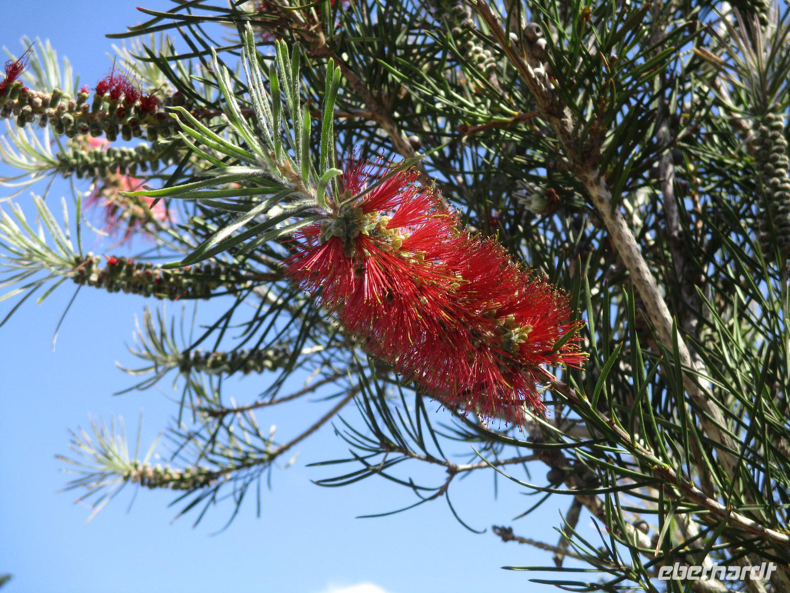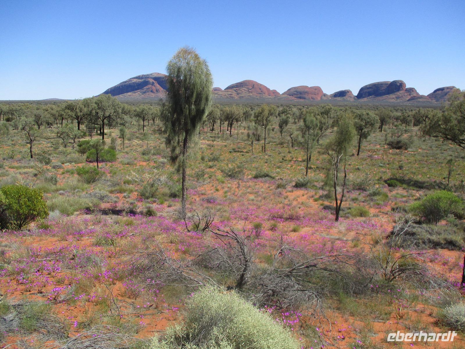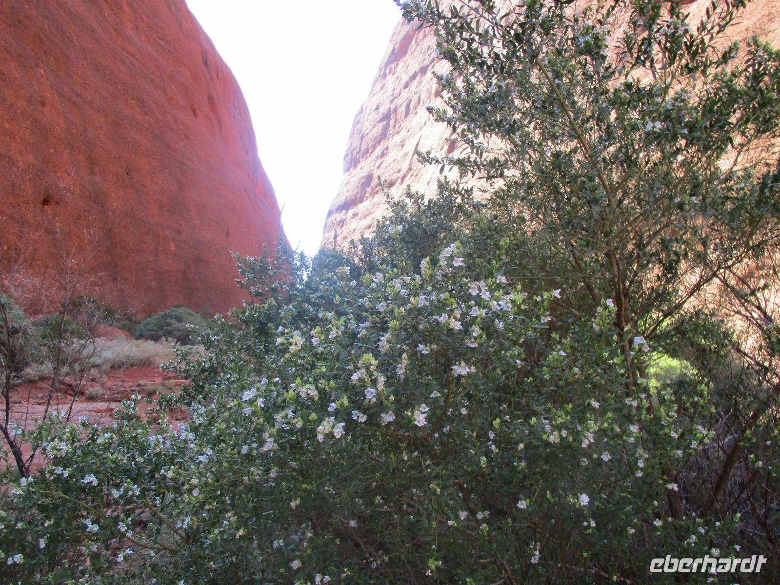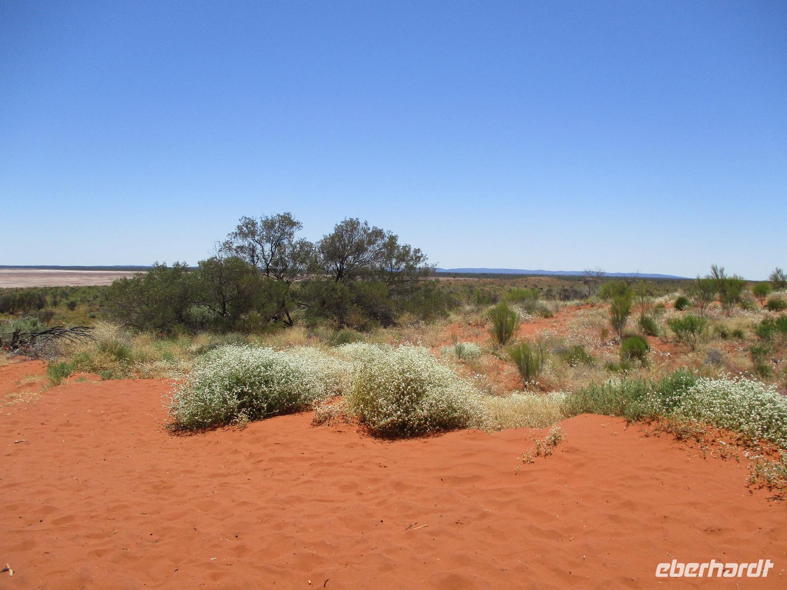 Am Morgen verließen wir Alice Springs. Unser Ziel war heute der Ayers Rock, das berühmteste Wahrzeichen Australiens mitten im roten Outback. Wir fuhren heute etwa 500 km, ein Stück des Highways Nr. 1, der auf einer Länge von ca. 16.000 km von Nord nach Süd den australischen Kontinent durchquert. Zunächst befuhren wir das erste Stück dieser Strecke, der hier Stuart Highway heißt. Jener Stuart war der erste Weiße, der einen Weg durch das undurchdringliche Gelände von Nord nach Süd gefunden hatte. Entlang seines Weges wurde die Telegrafenlinie errichtet. Nach einem kurzen Stopp an einer Raststätte, wo wir Emus sehen konnten, die dort gehalten werden, ging es weiter auf dem Lasseter Highway. Nach einiger Zeit sahen wir die sogenannte größte Zahnbürste der Welt, den Mount Conner, ein Tafelberg, der die Form einer überdimensionierten Zahnbürste hat. Danach dauerte es gar nicht mehr lange, und wir konnten in der Ferne das Ziel unserer Träume entdecken: den Ayers Rock, den die Ureinwohner Uluru nennen. Vorher aber stiegen wir noch einmal kurz aus und stiegen auf rotem Sand hinauf auf einen Hügel. Dort zeigte uns Marcel einen Busch, die Vogelerbse, dessen Blüten tatsächlich wie Vögel aussehen. Hier bekamen wir einen ersten Eindruck davon, wie lästig Fliegen sein können. Auf der Suche nach Flüssigkeit, flogen sie in unablässiger Weise um unsere Köpfe, in Augen, Nase, Ohren und Mund. Um dieser Plage Herr zu werden, erstanden wir bei Marcel Netze, die wir auf unsere Köpfe stülpen konnten. Besonders schön sahen wir damit zwar nicht aus, aber gegen die lästigen Fliegen halfen sie tatsächlich sehr gut.