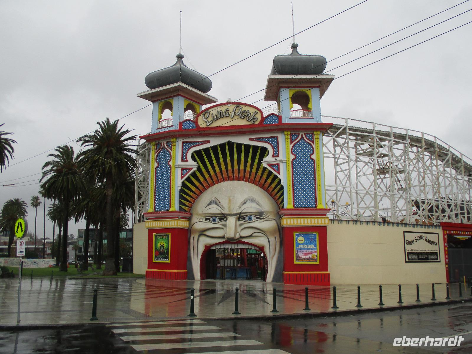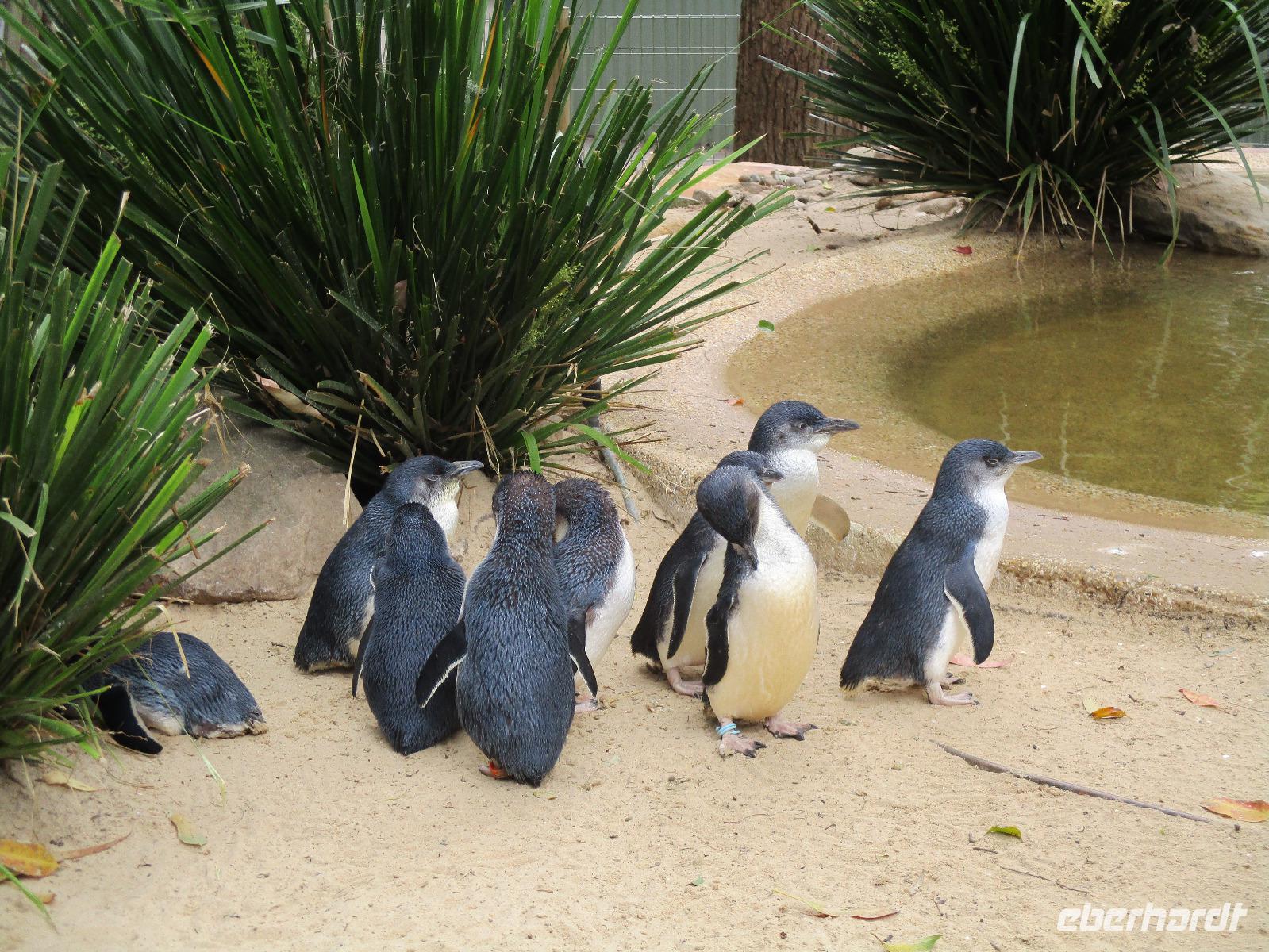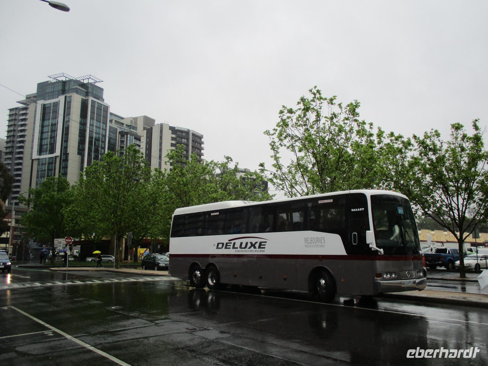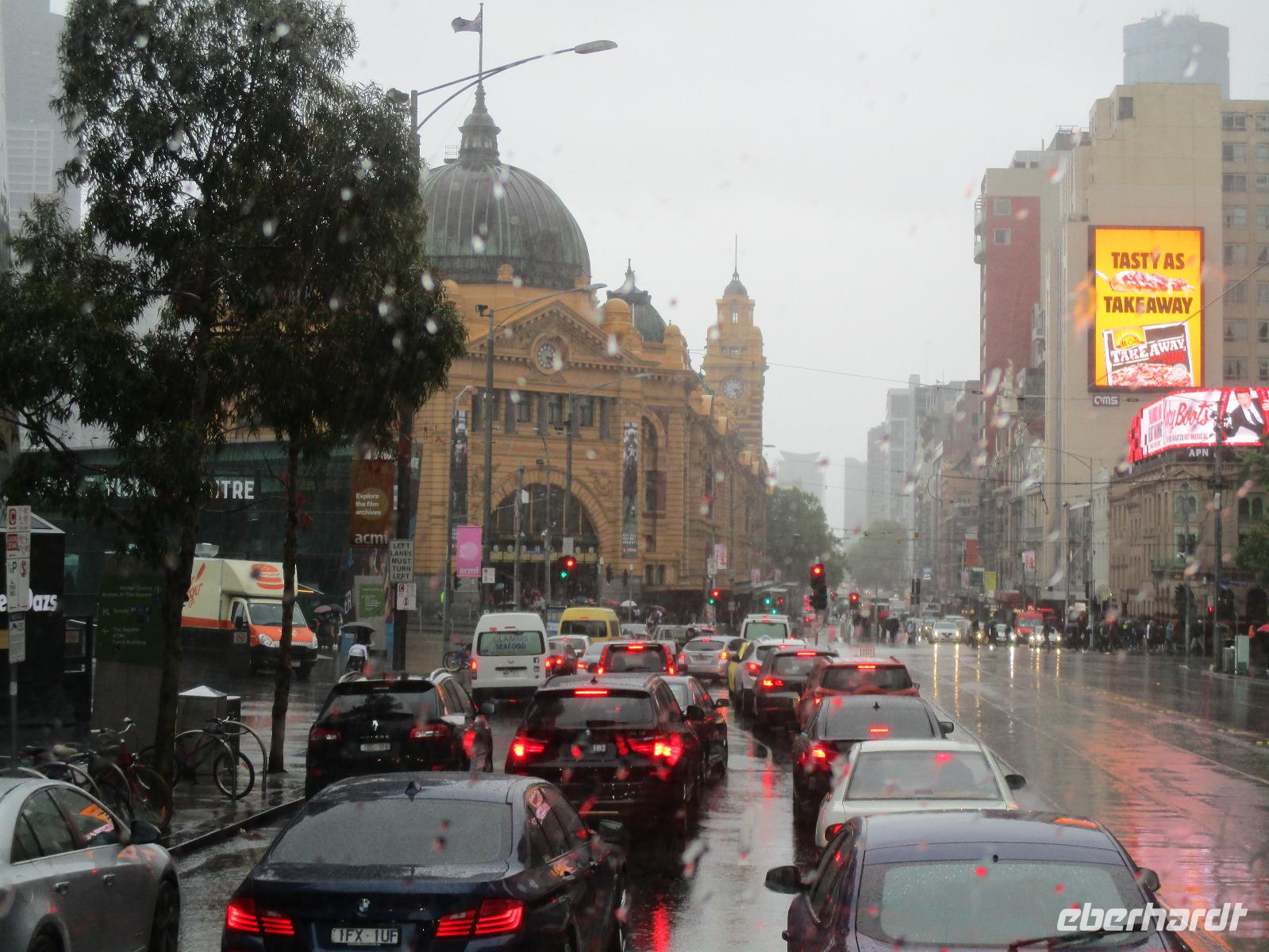 Bereits am Morgen wurden wir mit unserem Gepäck am Hotel abgeholt. Am Flughafen verabschiedeten wir uns von Uli und bestiegen unser Flugzeug nach Melbourne. Nachdem uns Sydney mit Sonne und schönem Wetter verwöhnt hatte, erwartete uns Melbourne mit reichlich Regen. Gleich am Flughafen holte uns unsere Reiseleiterin Ina ab, wir begannen unsere Stadtrundfahrt an der Markthalle Victoria Market. Es gab Gelegenheit für erste Einkäufe und einen Imbiss im historischen Markt. Sogar ein Bratwurststand ist vorhanden, und so aßen einige gleich eine deutsch anmutende Wurst im Brötchen. Während der Rundfahrt, die von reichlich Regenwetter geprägt war, sahen wir die Formel-1-Strecke, auf der wir auch ein kurzes Stück fuhren, den Eingang des Luna Parks, die Peter-und-Paul-Kirche, den Botanischen Garten und den Yarra-Fluss. Danach erreichten wir unser Hotel Travelodge Southbank. Wir spazierten um Meat & Wine - Restaurant, wo wir ein sehr gutes Abendessen mit Steak oder Fisch genossen. Danach besuchten wir kurz das Casino im Crown Hotel und bestaunten die luxuriöse Ausstattung des Gebäudes. Einige erkundeten auf ihrem Heimweg zum Hotel noch das Skydeck, das ist die Aussichtsplattform im 88. Stock des Eureka-Towers, der sich in unmittelbarer Nachbarschaft unseres Hotels befand.