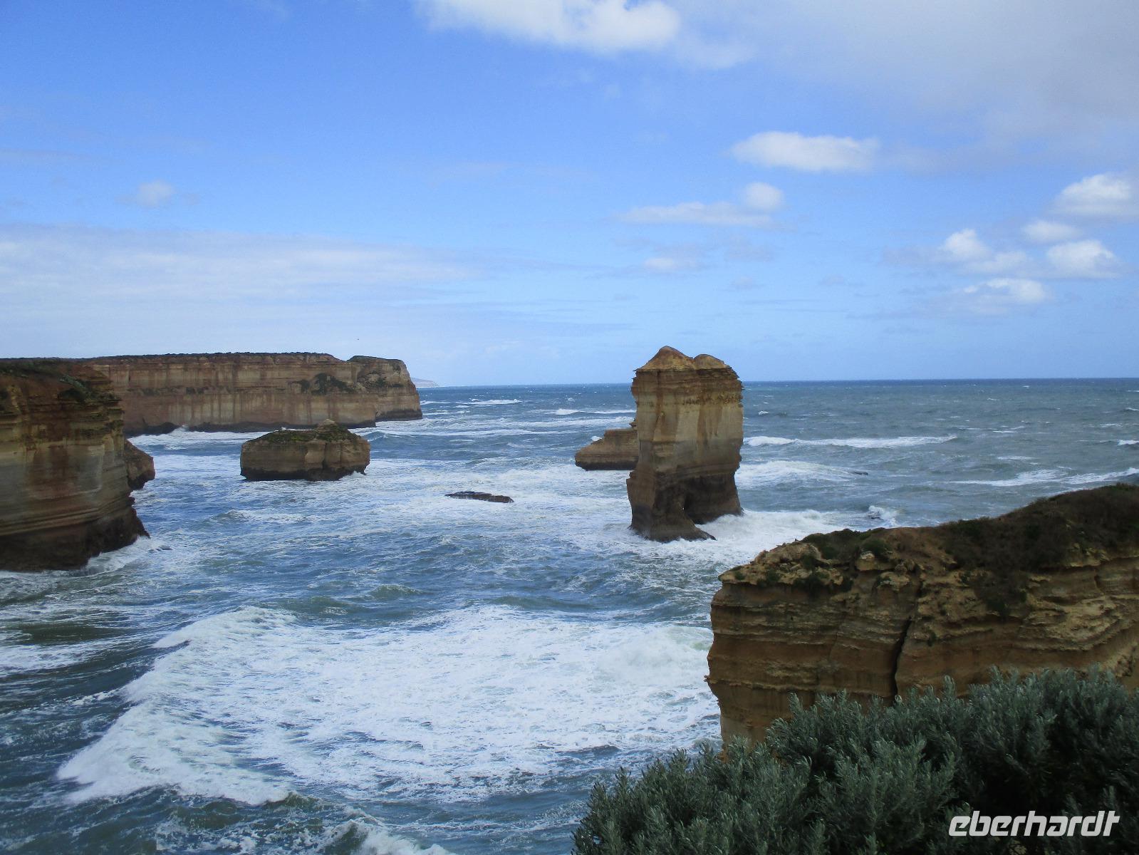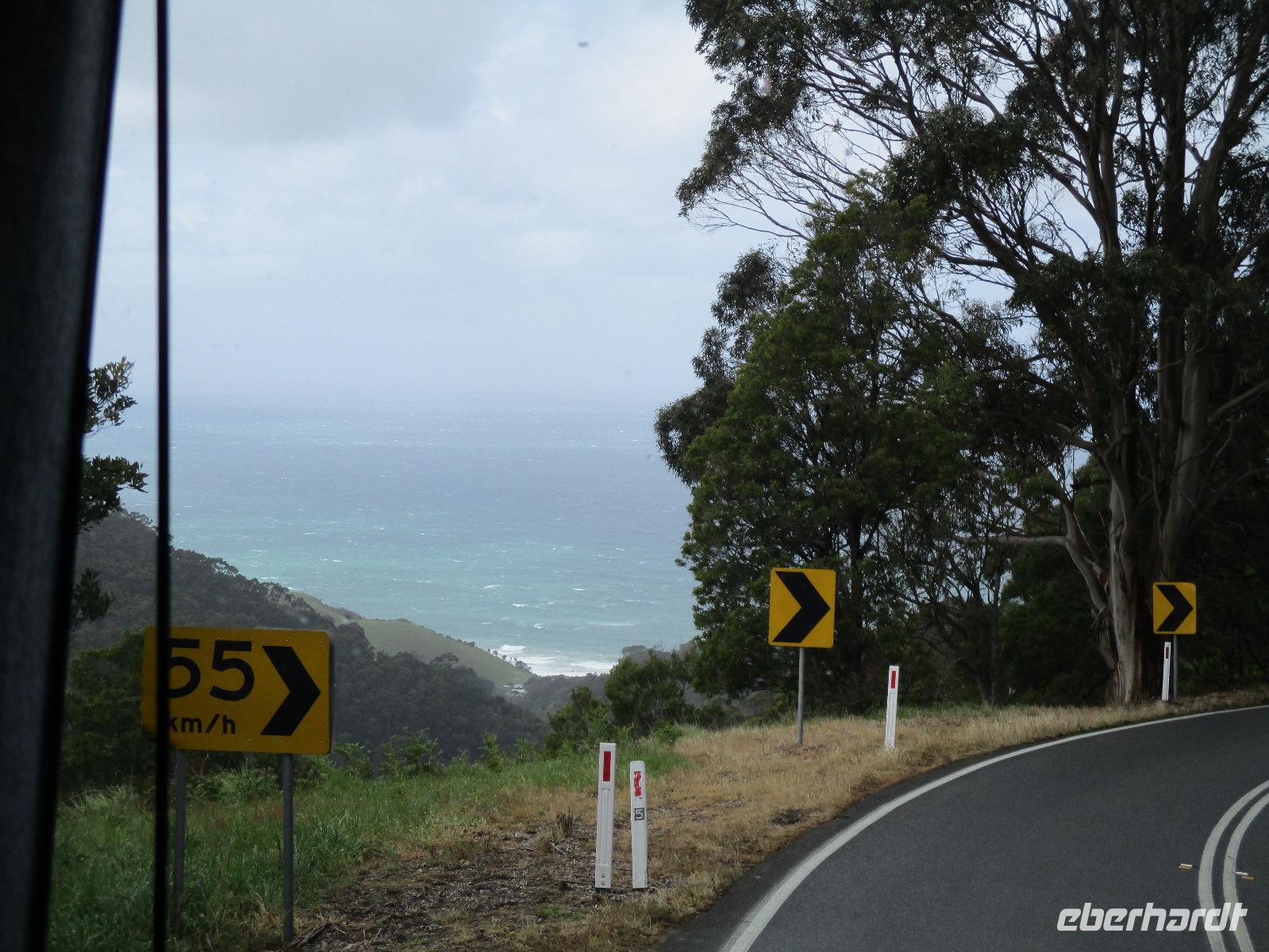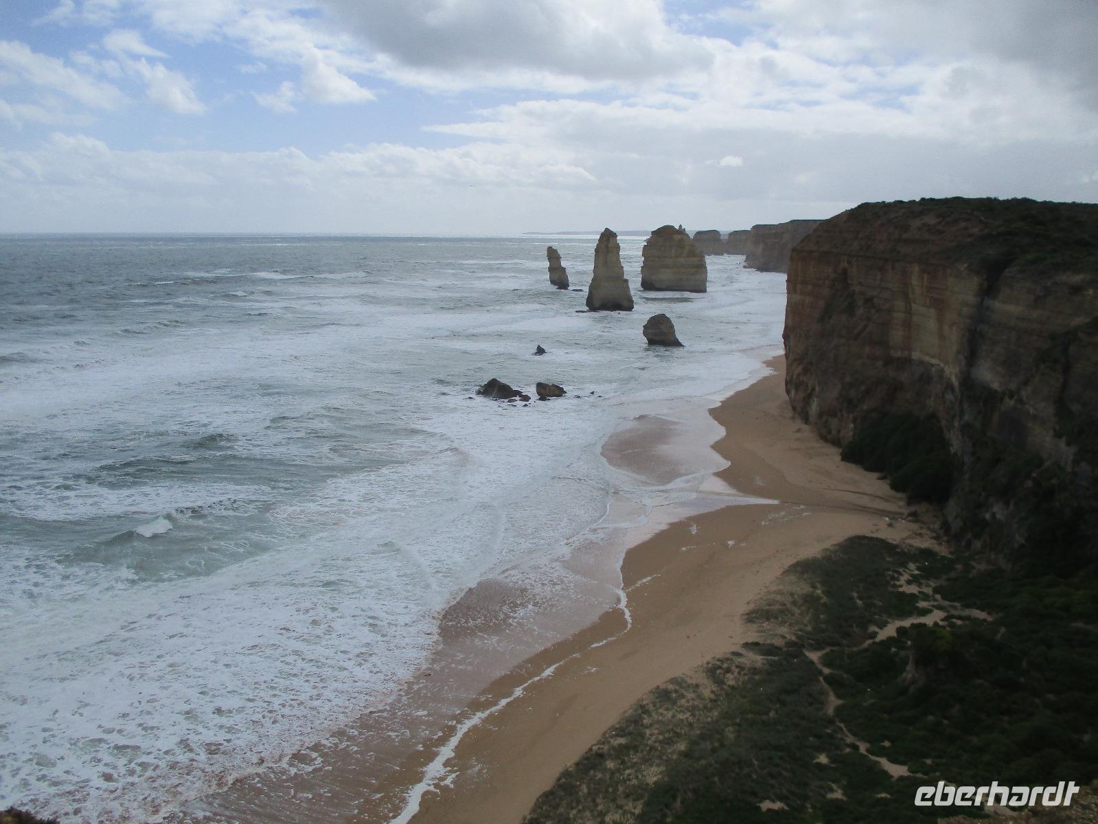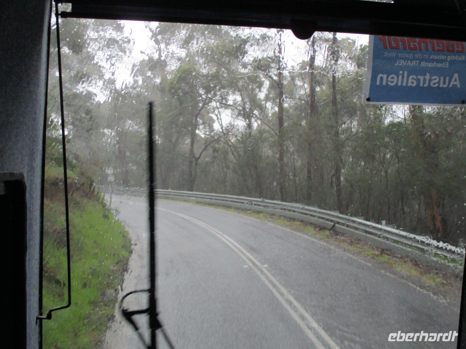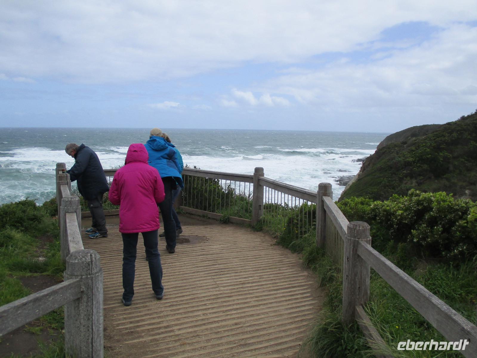 Bereits kurz nach dem Frühstück verließen wir die Stadt und fuhren zur Great Ocean Road, die imposante Blicke und Ausblicke über den Ozean und die Küste bietet. Unsere Reiseleiterin Ina erzählte uns unterwegs viel Interessantes und Wissenswertes zu Melbourne, zur Küste und Geschichte der Gegend. Leider hatte es durch den vielen Regen einen Erdrutsch gegeben, so dass wir einen Teil der Great Ocean Road nicht befahren konnten. Diesen Teil der Strecke fuhren wir durch den Wald, der hier kalter Regenwald ist. Auch diese Fahrt war beeindruckend, einmal hagelte es sogar an diesem Vormittag. Im Apollo Bay Hotel aßen wir zu Mittag und erkundeten danach noch den Strand und ein paar Geschäfte in Apollo Bay. Bei den 12 Aposteln, die tatsächlich nur 8 Apostel sind, hielten wir mehrmals an und erkundeten die raue Küste mit Wind und tosender Brandung unter den Aposteln, Felsformationen, die markant im Wasser entlang der Küste stehen. Sonne und Regen wechselten sich ab, so dass wir die raue Natur hier an der Great Ocean Road live erleben konnten.