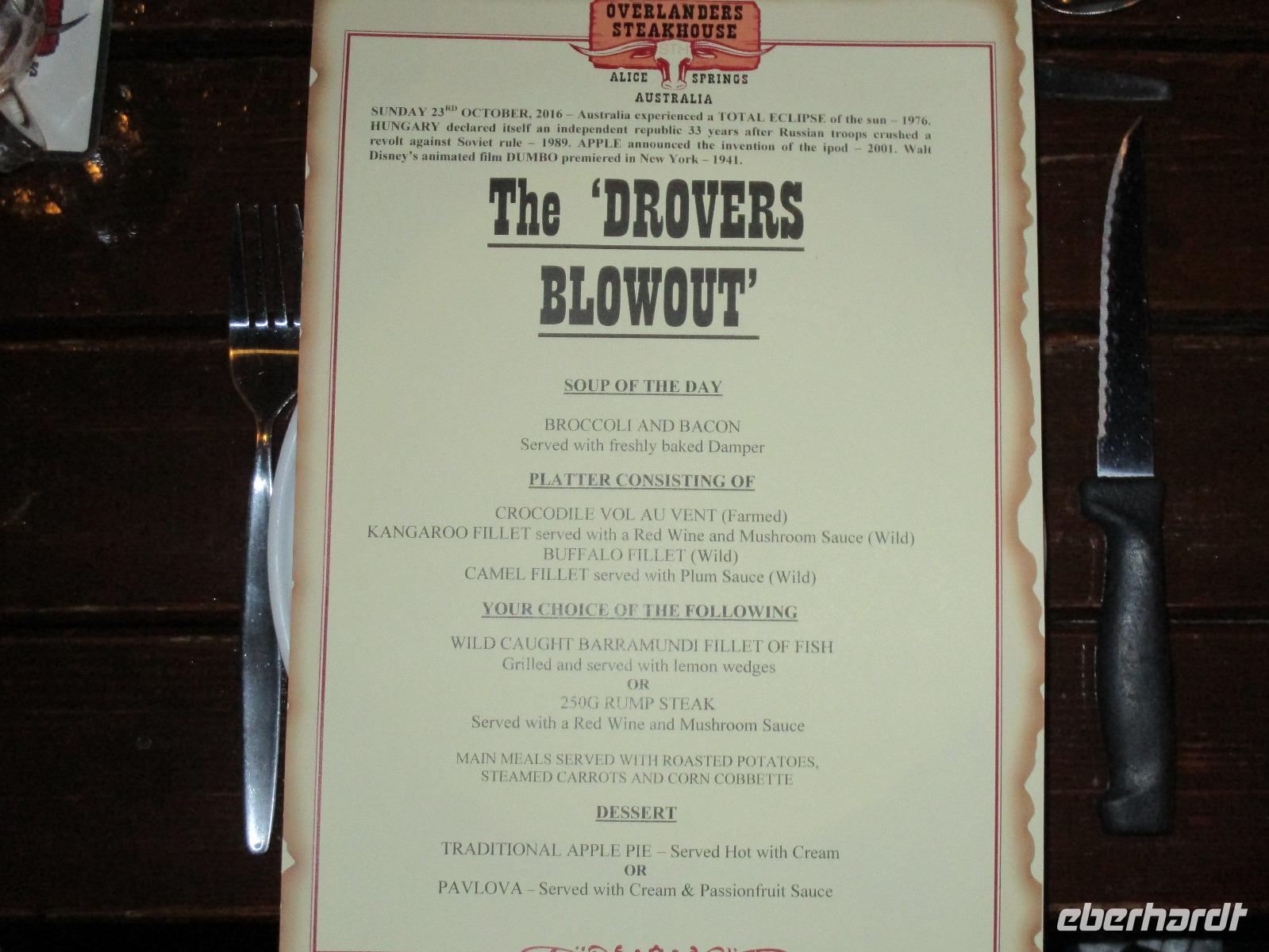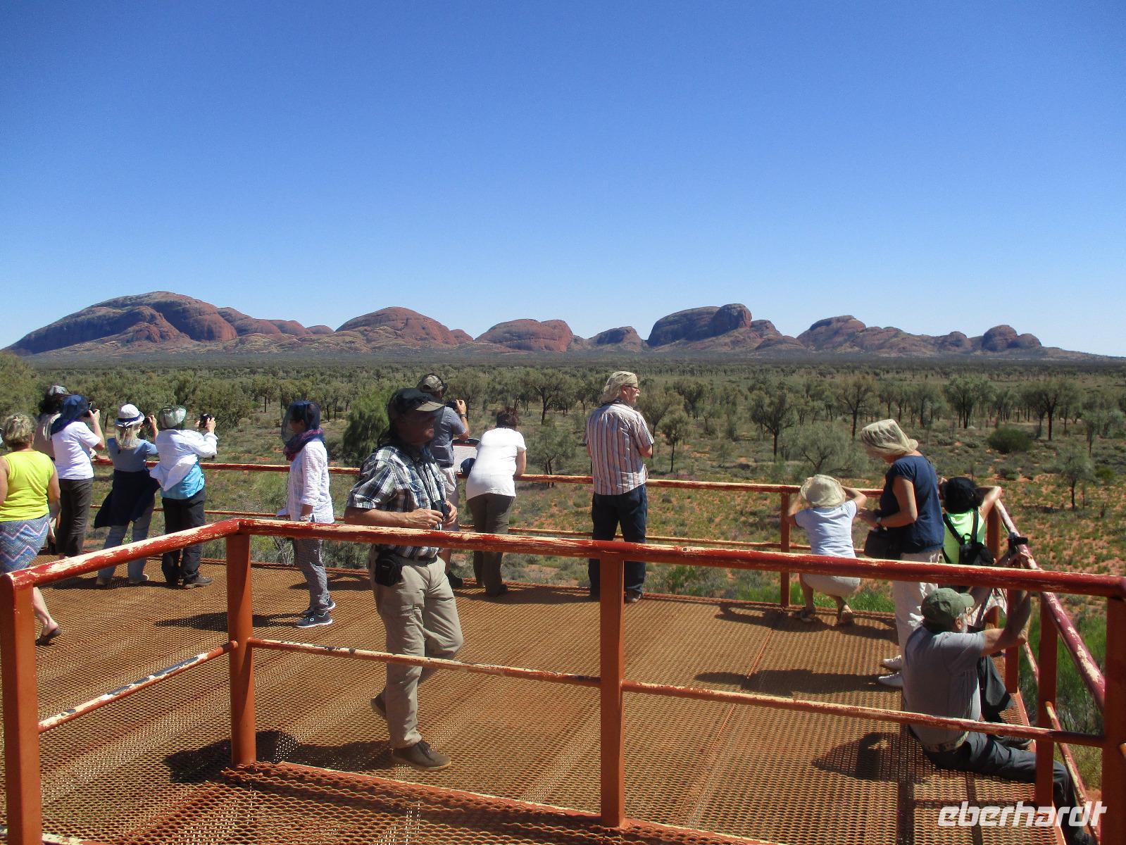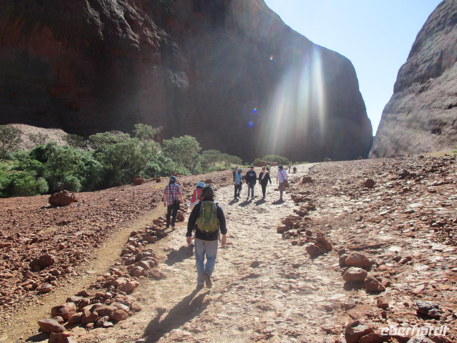 Nach dem Frühstück verließen wir Melbourne. Pünktlich landete unser Flieger in Alice Springs, wo wir schon von unserem Reiseleiter Marcel erwartet wurden. Unser Gepäck wurde verladen und los ging es zu einer kleinen Stadtrundfahrt durch Alice. Auf dem Anzac-Hill erklärte uns Marcel den Blick über die Stadt. Wir besuchten die historische Telegrafen-Station. Sie ist der eigentliche Grund für das Entstehen der Stadt. Bei einem Besuch der Flying Doctors erfuhren wir viel über die medizinische Versorgung der Menschen in den einsamen Gegenden des Outbacks. Wir bekamen dabei auch einen Eindruck von den teilweise schwierigen Lebensverhältnissen in der schier unendlichen Weite in den einsamen Gegenden. Farmer und Aboriginis leben oft so weit entfernt von jeglicher Zivilisation, dass nur per Flugzeug Hilfe organisiert werden kann. Ähnliche Probleme gibt es dabei mit der schulischen Versorgung der Kinder im Outback. Dafür gibt es die School of the air, die wir im Anschluss besuchen konnten. Hier lernen die Kinder über das Internet, Schulmaterialien werden per Post verschickt. Nach diesen interessanten Besuchen erreichten wir unser Hotel Lasseters für eine Nacht. Das Abendessen hatten wir im Overlander Steakhouse, das eine halbe Stunde Fußweg von unserem Hotel entfernt lag. Wir probierten in urigem Ambiente das Fleisch von Krokodil, Känguru, Büffel und Kamel.