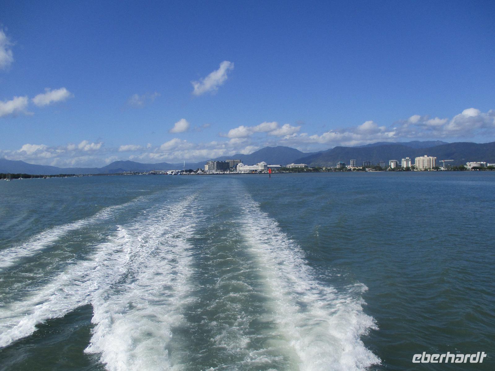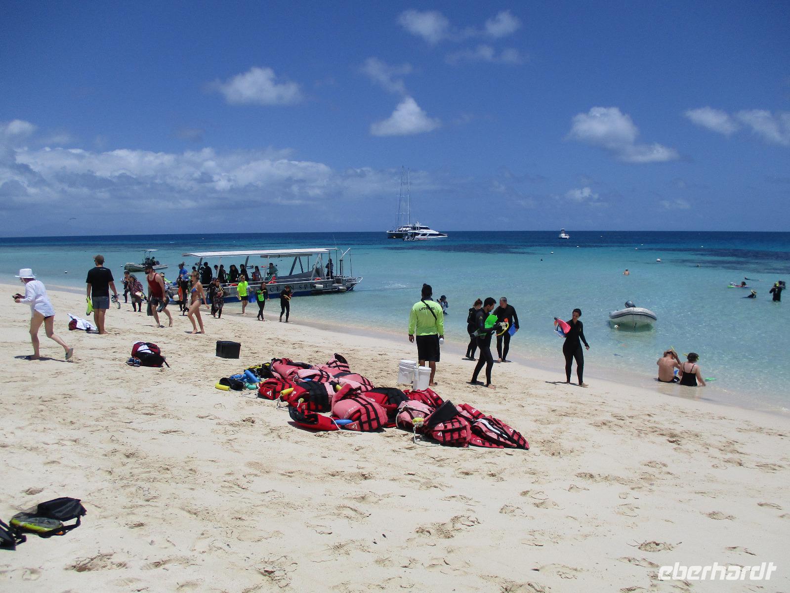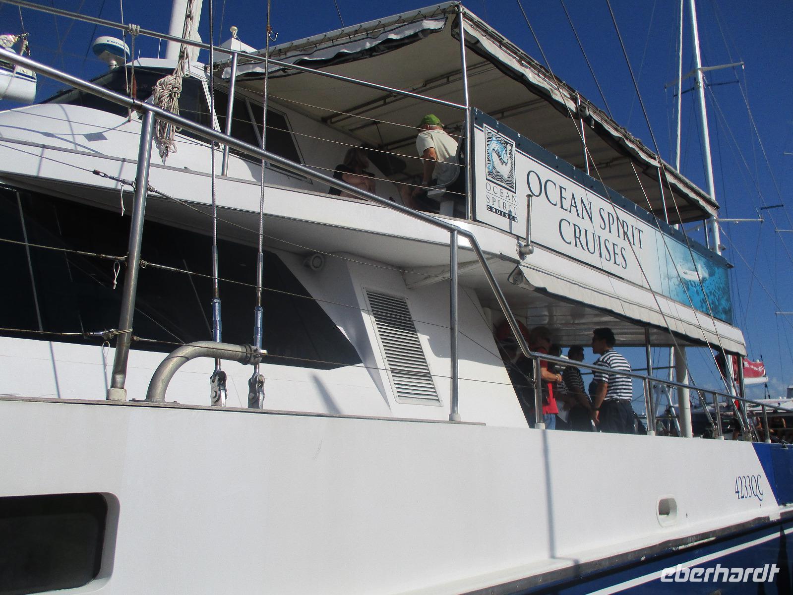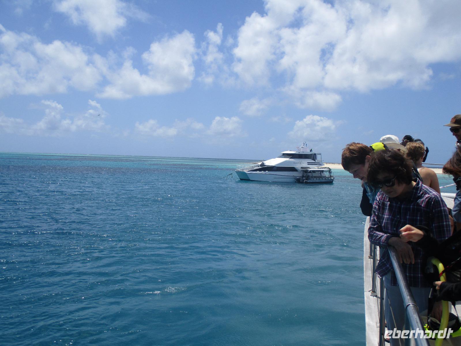 Bereits am frühen Morgen wurden wir abgeholt und mit einem Bus zum Hafen in Cairns gebracht. Wir bestiegen einen Katamaran namens „Ocean Spirit". Er brachte uns hinaus aufs Meer, denn heute wollten wir das berühmte Great Barrier Reef kennenlernen. Unterwegs gab es Kaffee und frische Muffins, dazu Erklärungen über das Leben im und am Riff. In der Nähe einer Sandinsel, auf der zahlreiche Vögel nisten, ging der Katamaran vor Anker. Nun hatten wir verschiedene Möglichkeiten, den Tag auf dem Wasser zu verbringen. Wir konnten uns zur Insel übersetzen lassen, dort schwimmen oder schnorcheln. Gegen die Sonne und eventuelle Quallen konnte man schwarze Gummianzüge ausleihen, wovon viele unserer Gäste Gebrauch gemacht haben. Auch Schnorchelausrüstung war vorhanden und wurde ausgiebig genutzt. Mittags konnten wir uns am Büffet auf dem Katamaran bedienen. Kurz danach stießen wir mit einem Glasbodenboot in See und bestaunten die Korallen und Fische von oben. Dabei erfuhren wir, dass auch hier die Natur bedroht ist vom Klimawandel und anderen schädlichen Einflüssen, so dass viele Korallen schon beschädigt oder abgestorben sind. Dennoch genossen wir die Stunden auf See und fuhren am Nachmittag zufrieden mit dem Katamaran zurück Richtung Cairns. Nach der Ankunft am Hafen wurden wir wieder mit einem Bus zurück zu unserem Hotel gebracht, wo uns wieder ein leckeres Abendessen erwartete.