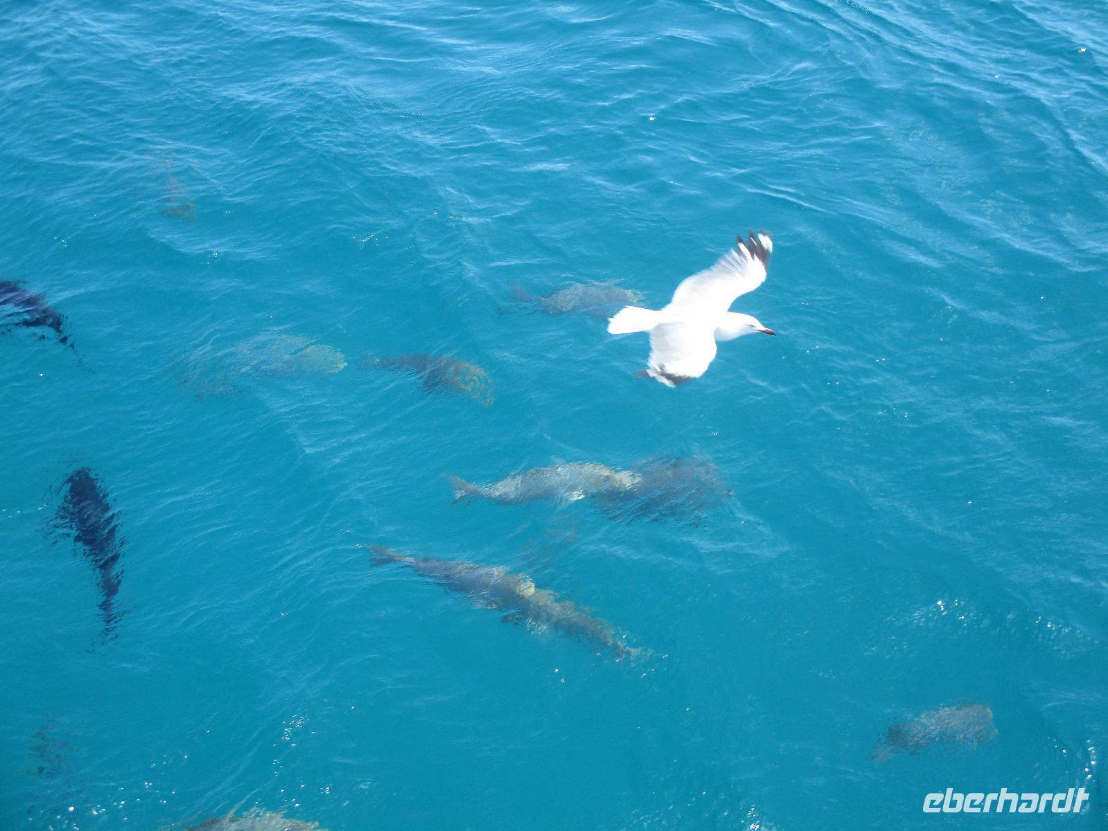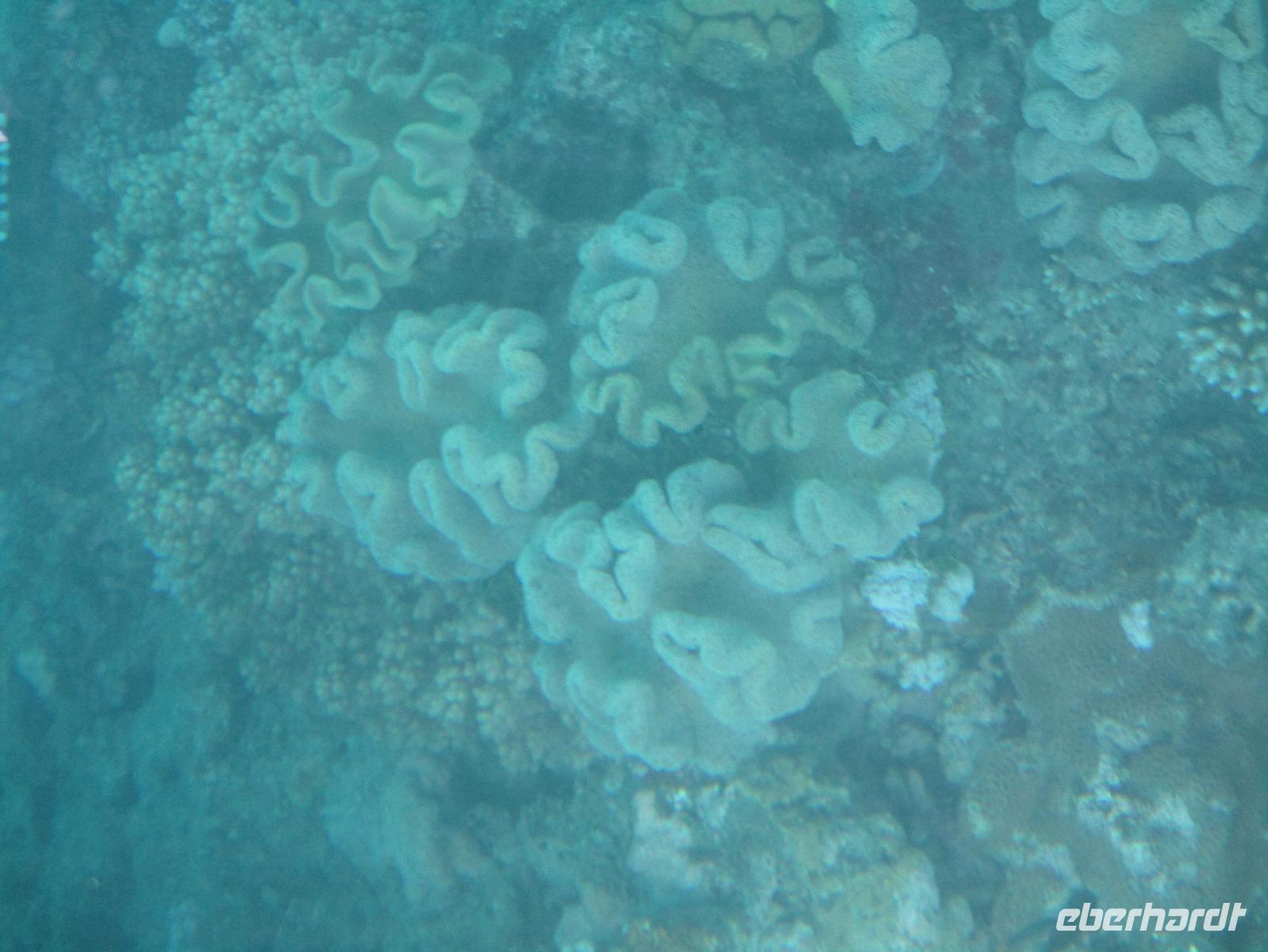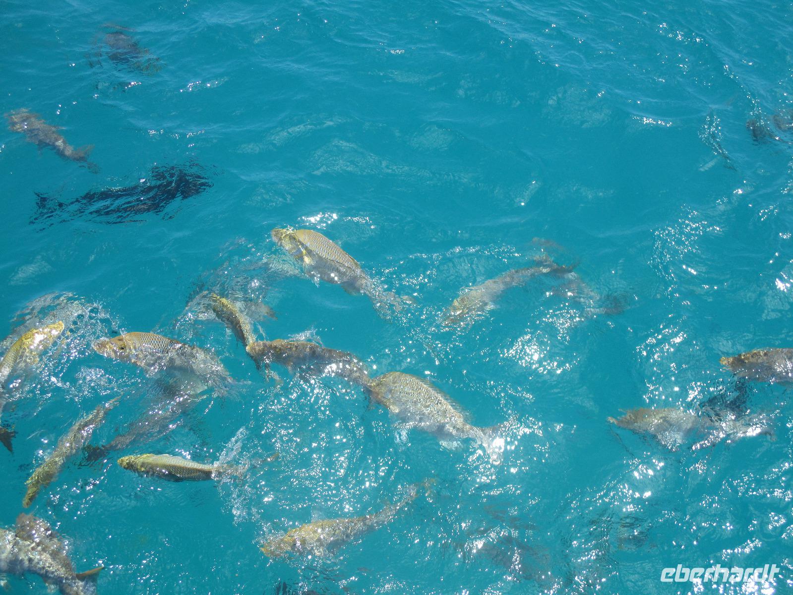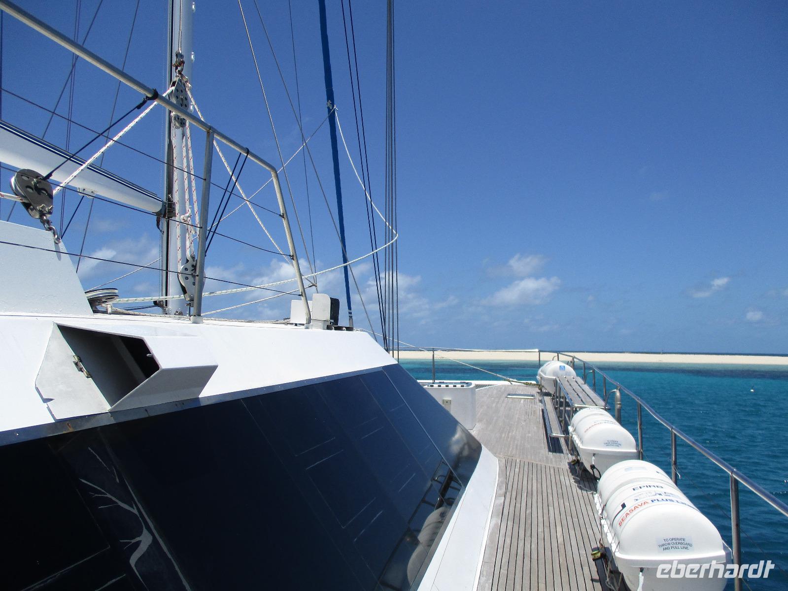 Bereits am frühen Morgen wurden wir abgeholt und mit einem Bus zum Hafen in Cairns gebracht. Wir bestiegen einen Katamaran namens „Ocean Spirit". Er brachte uns hinaus aufs Meer, denn heute wollten wir das berühmte Great Barrier Reef kennenlernen. Unterwegs gab es Kaffee und frische Muffins, dazu Erklärungen über das Leben im und am Riff. In der Nähe einer Sandinsel, auf der zahlreiche Vögel nisten, ging der Katamaran vor Anker. Nun hatten wir verschiedene Möglichkeiten, den Tag auf dem Wasser zu verbringen. Wir konnten uns zur Insel übersetzen lassen, dort schwimmen oder schnorcheln. Gegen die Sonne und eventuelle Quallen konnte man schwarze Gummianzüge ausleihen, wovon viele unserer Gäste Gebrauch gemacht haben. Auch Schnorchelausrüstung war vorhanden und wurde ausgiebig genutzt. Mittags konnten wir uns am Büffet auf dem Katamaran bedienen. Kurz danach stießen wir mit einem Glasbodenboot in See und bestaunten die Korallen und Fische von oben. Dabei erfuhren wir, dass auch hier die Natur bedroht ist vom Klimawandel und anderen schädlichen Einflüssen, so dass viele Korallen schon beschädigt oder abgestorben sind. Dennoch genossen wir die Stunden auf See und fuhren am Nachmittag zufrieden mit dem Katamaran zurück Richtung Cairns. Nach der Ankunft am Hafen wurden wir wieder mit einem Bus zurück zu unserem Hotel gebracht, wo uns wieder ein leckeres Abendessen erwartete.