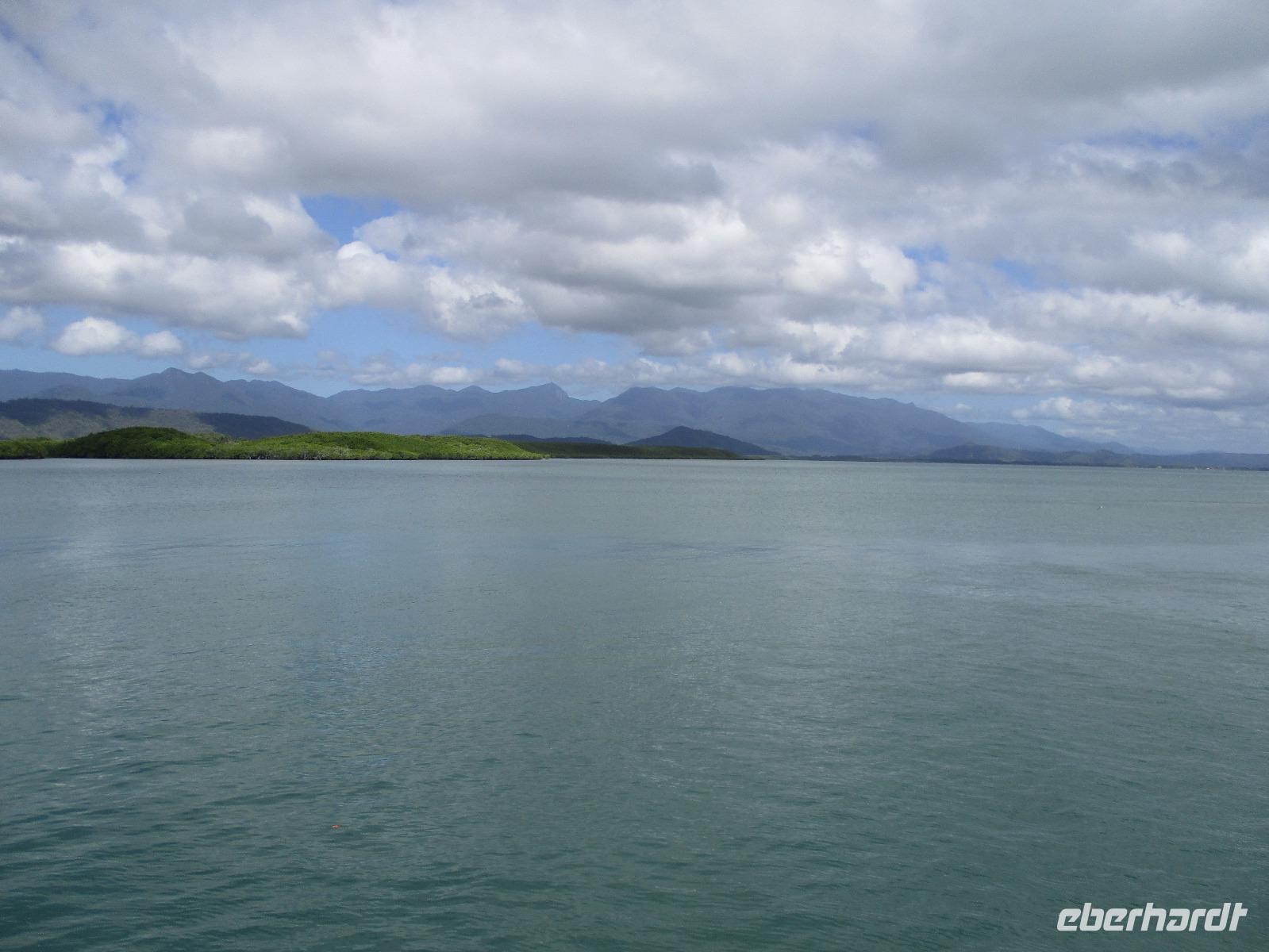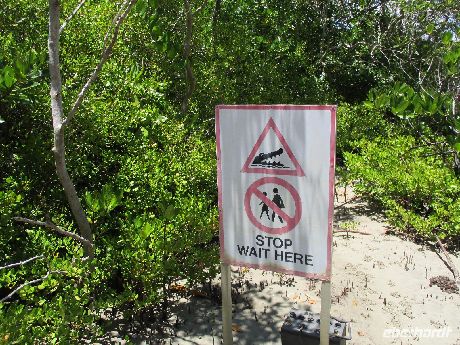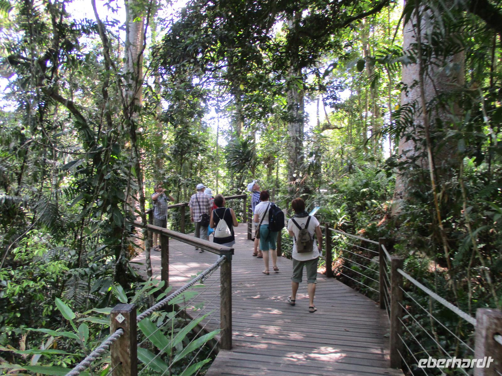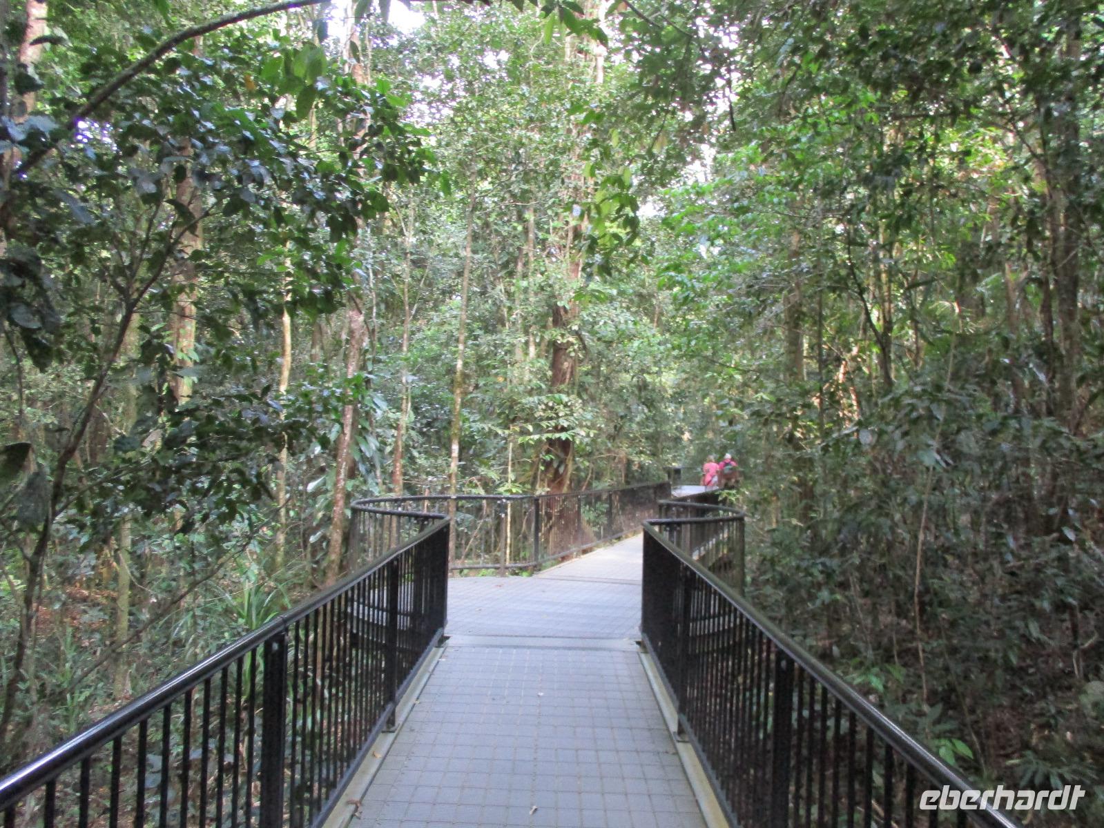 Heute holte uns Wolfgang ab, gleichzeitig Reiseleiter und Busfahrer für diesen Tag. Unser heutiges Ziel war der Daintree-Nationalpark. Auf der Fahrt dahin kamen wir große Teile der Strecke entlang der schönen und beeindruckenden Küste entlang. Wir sahen Felsen, Sandbuchten und schöne Ausblicke hinaus aufs Meer. In Port Douglas machten wir kurz Halt und suchten erste interessante Fotomotive mit Blick aufs Meer. Durch ausgedehnte Wälder führte uns unser weiterer Weg. Es gab zahlreiche Warnschilder, die die Autofahrer davor bewahren sollten, mit den dort lebenden Helmcassowaries zu kollidieren. Das ist einer der größten Laufvögel, dessen besonderes Kennzeichen ein blauer Helm auf dem Kopf ist. Scheinbar gibt es viele Unfälle mit diesen großen Tieren hier in der Gegend. An einem Strandcafé machten wir Halt. Wir konnten im herrlichen Sand des Strandes spazieren gehen oder uns gemütlich einen Kaffee mit Blick aufs Meer schmecken lassen. Aufpassen mussten wir trotzdem, denn Warnschilder informierten uns, dass es hier Krokodile gab und auch gefährliche Quallen. Wir ließen ein Bad im Meer daher ausfallen. Nach einem Schluck Kaffee ging es schon weiter. Eine Bootsfahrt im Mangrovenwald stand als nächstes auf unserem Plan. Wir waren auf der Suche nach den dort lebenden Salzwasserkrokodilen. Die Männchen können über vier Meter groß werden, Weibchen zwischen 3,5 und drei Metern. Nach einiger Suche entdeckten wir ein Krokodilweibchen, das im seichten Wasser am Ufer lauerte. Da es nicht aus dem Wasser kam, konnten wir es nicht in Gänze erkennen und auch die Fotos zeigen nur ein Stück des Tieres. Dennoch erfuhren wir viel Interessantes über die hier wachsenden verschiedenen Mangrovenarten. Nach der Bootsfahrt wurden wir in ein Restaurant mitten im Regenwald gebracht mit dem Namen „On the Turps", wo wir uns gegrilltes Steak oder Fisch schmecken ließen. Nach dem Mittagessen fuhren wir zur Mossman Gorge, wo wir auf einem schön gestalteten Pfad durch den Regenwald spazieren konnten. Riesige Farne und interessante Bäume konnten wir hier entdecken. Im Fluss badeten einige Leute und eine Hängebrücke lud zum schaukelnden Überqueren des Flusses ein. Einige wagten es sogar, im klaren Wasser des Gebirgsflusses baden zu gehen. Auch den heutigen Abend verbrachten wir beim Abendessen in unserem Hotel.