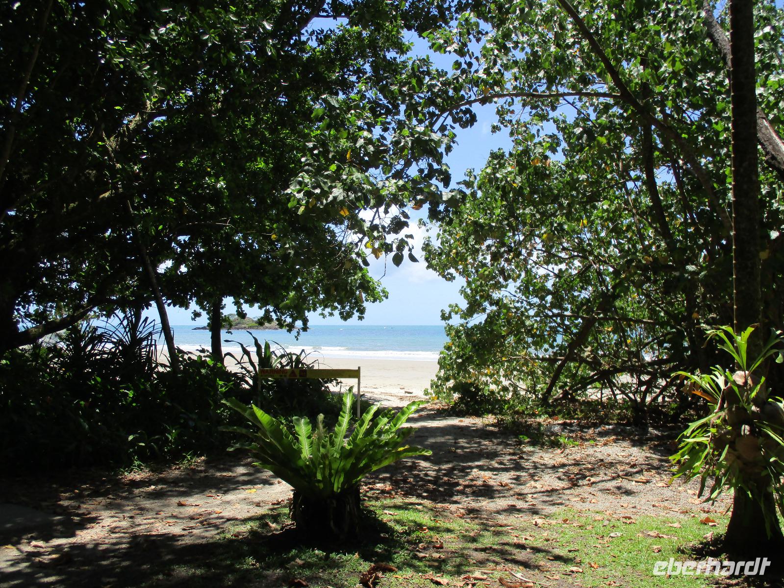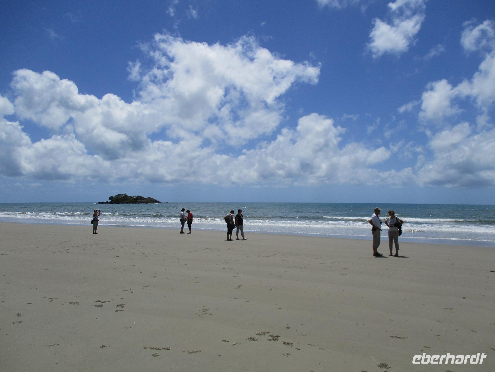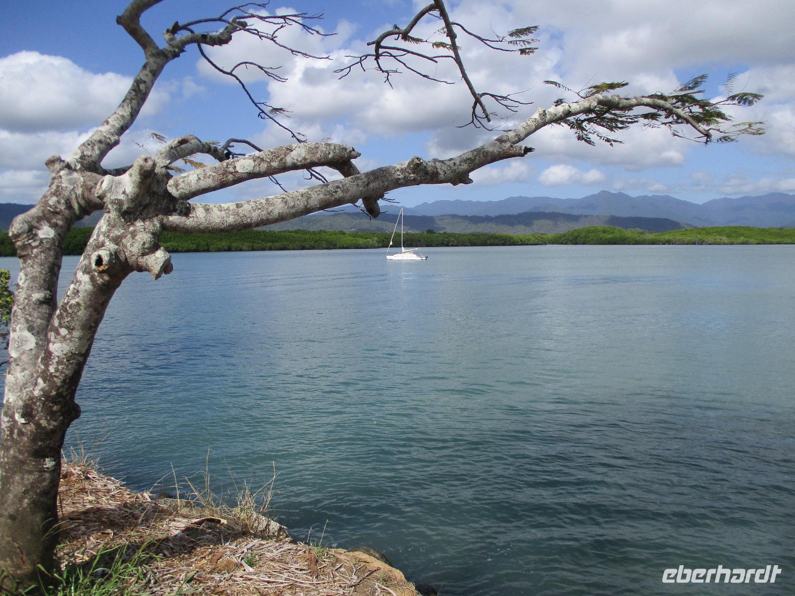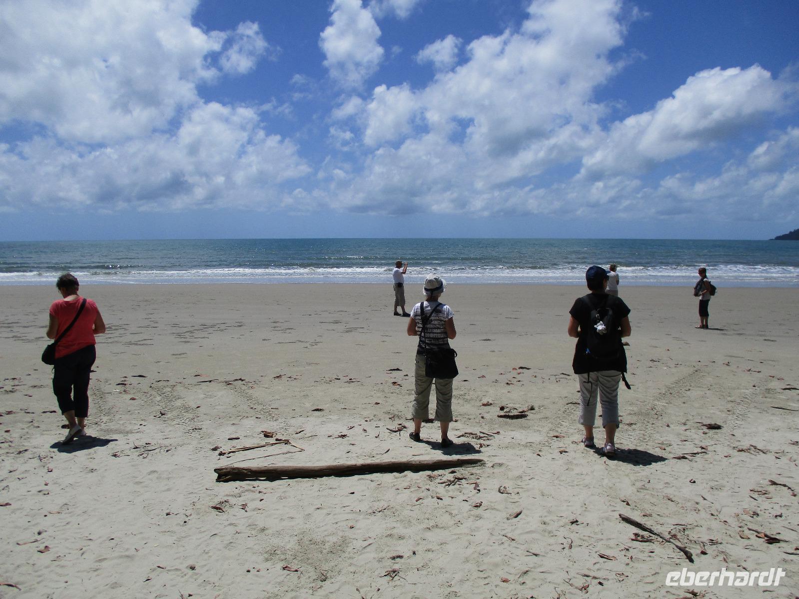 Heute holte uns Wolfgang ab, gleichzeitig Reiseleiter und Busfahrer für diesen Tag. Unser heutiges Ziel war der Daintree-Nationalpark. Auf der Fahrt dahin kamen wir große Teile der Strecke entlang der schönen und beeindruckenden Küste entlang. Wir sahen Felsen, Sandbuchten und schöne Ausblicke hinaus aufs Meer. In Port Douglas machten wir kurz Halt und suchten erste interessante Fotomotive mit Blick aufs Meer. Durch ausgedehnte Wälder führte uns unser weiterer Weg. Es gab zahlreiche Warnschilder, die die Autofahrer davor bewahren sollten, mit den dort lebenden Helmcassowaries zu kollidieren. Das ist einer der größten Laufvögel, dessen besonderes Kennzeichen ein blauer Helm auf dem Kopf ist. Scheinbar gibt es viele Unfälle mit diesen großen Tieren hier in der Gegend. An einem Strandcafé machten wir Halt. Wir konnten im herrlichen Sand des Strandes spazieren gehen oder uns gemütlich einen Kaffee mit Blick aufs Meer schmecken lassen. Aufpassen mussten wir trotzdem, denn Warnschilder informierten uns, dass es hier Krokodile gab und auch gefährliche Quallen. Wir ließen ein Bad im Meer daher ausfallen. Nach einem Schluck Kaffee ging es schon weiter. Eine Bootsfahrt im Mangrovenwald stand als nächstes auf unserem Plan. Wir waren auf der Suche nach den dort lebenden Salzwasserkrokodilen. Die Männchen können über vier Meter groß werden, Weibchen zwischen 3,5 und drei Metern. Nach einiger Suche entdeckten wir ein Krokodilweibchen, das im seichten Wasser am Ufer lauerte. Da es nicht aus dem Wasser kam, konnten wir es nicht in Gänze erkennen und auch die Fotos zeigen nur ein Stück des Tieres. Dennoch erfuhren wir viel Interessantes über die hier wachsenden verschiedenen Mangrovenarten. Nach der Bootsfahrt wurden wir in ein Restaurant mitten im Regenwald gebracht mit dem Namen „On the Turps", wo wir uns gegrilltes Steak oder Fisch schmecken ließen. Nach dem Mittagessen fuhren wir zur Mossman Gorge, wo wir auf einem schön gestalteten Pfad durch den Regenwald spazieren konnten. Riesige Farne und interessante Bäume konnten wir hier entdecken. Im Fluss badeten einige Leute und eine Hängebrücke lud zum schaukelnden Überqueren des Flusses ein. Einige wagten es sogar, im klaren Wasser des Gebirgsflusses baden zu gehen. Auch den heutigen Abend verbrachten wir beim Abendessen in unserem Hotel.