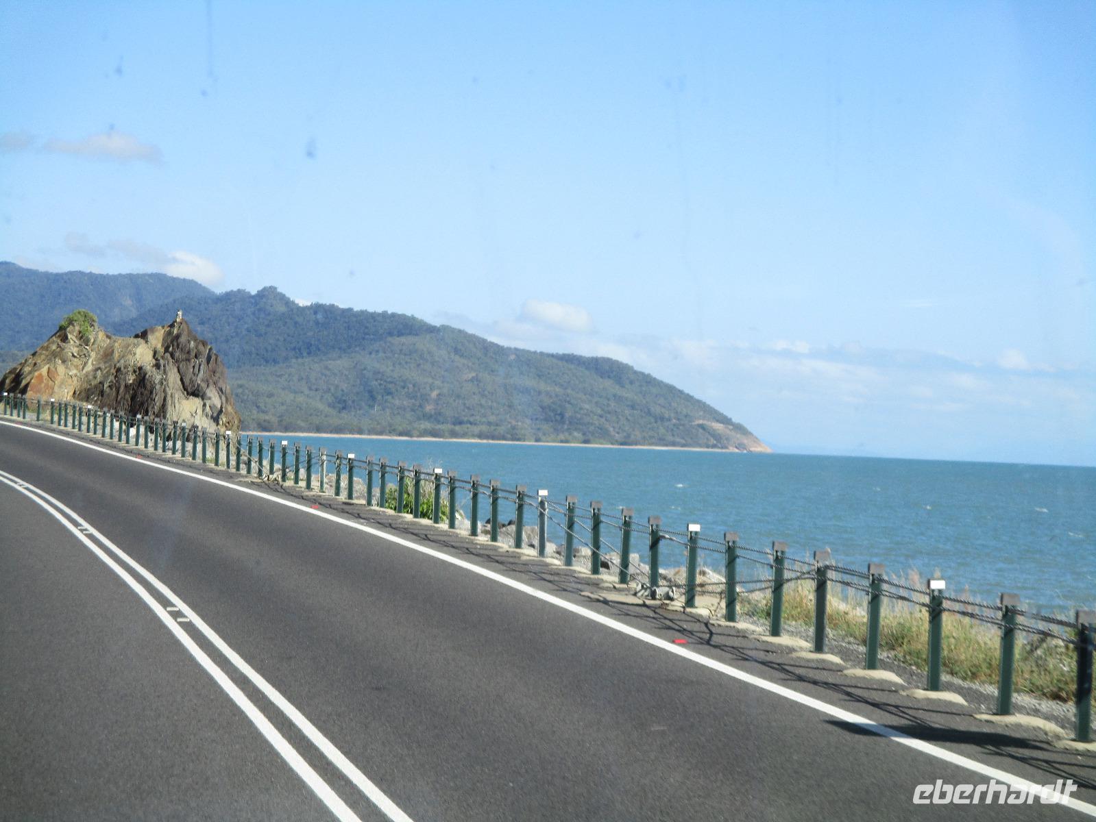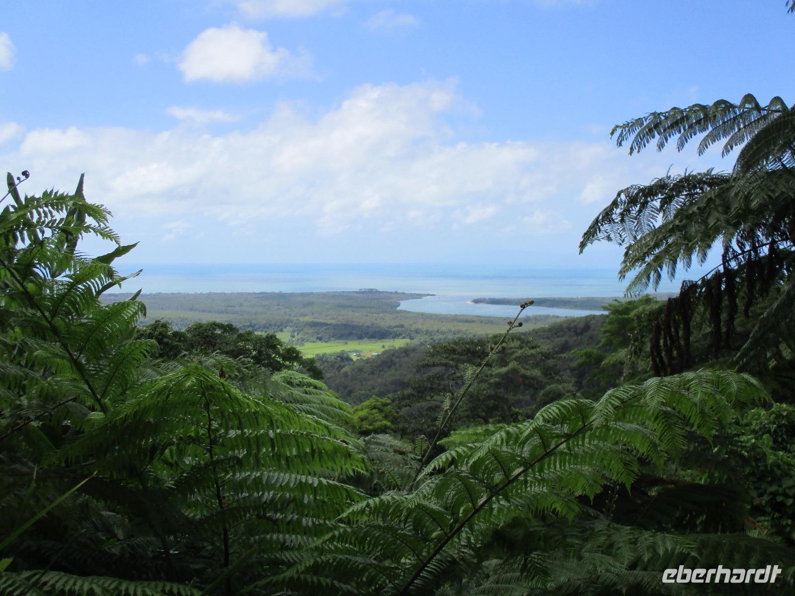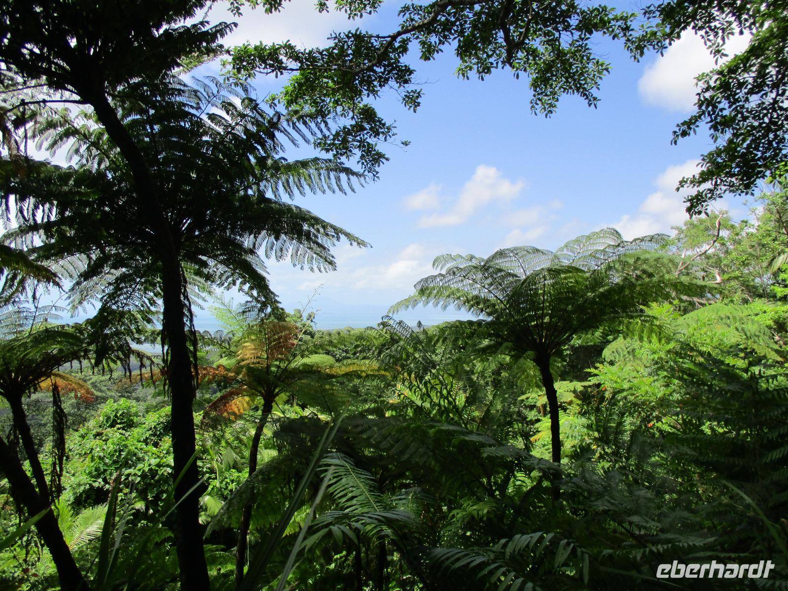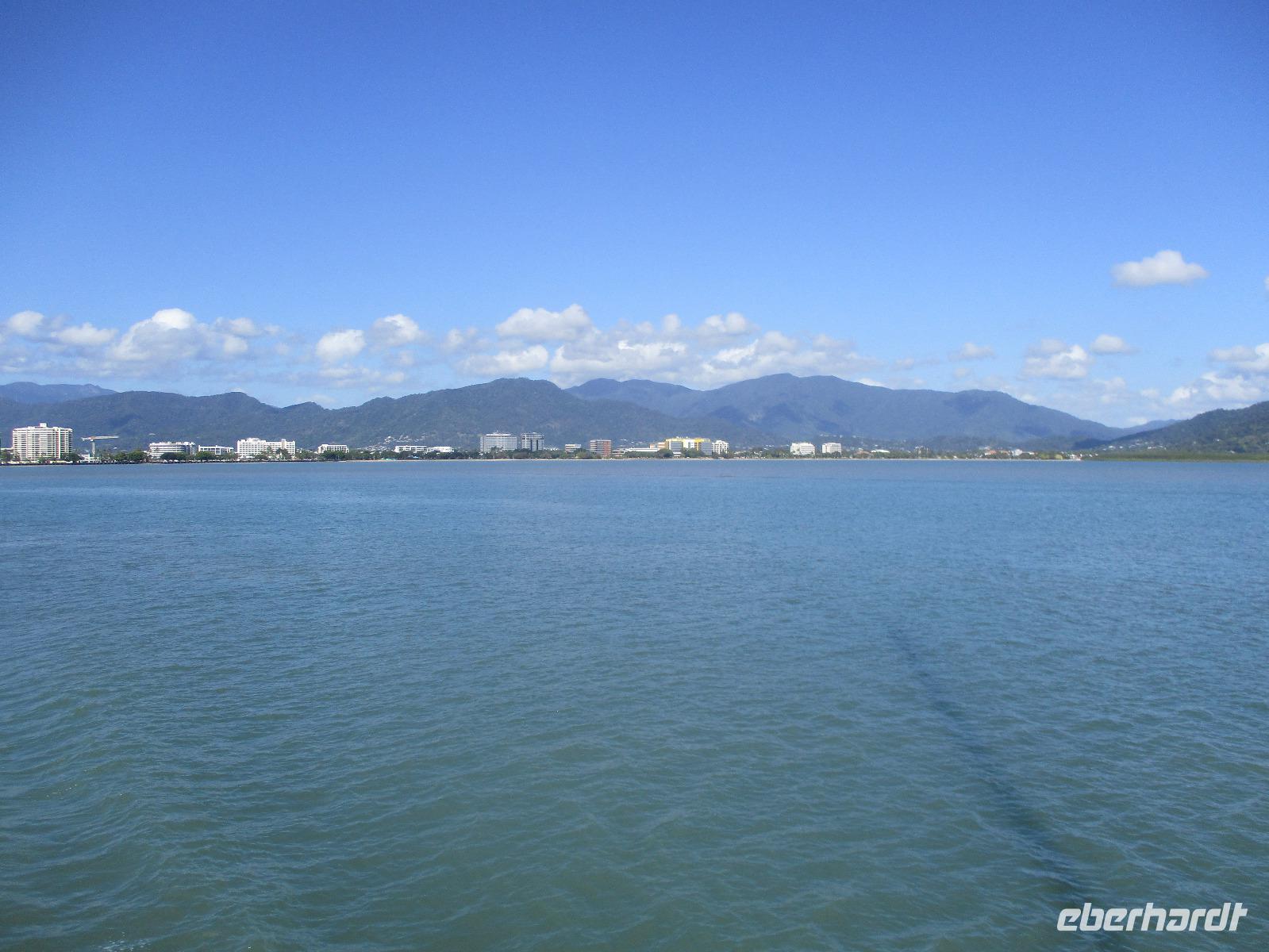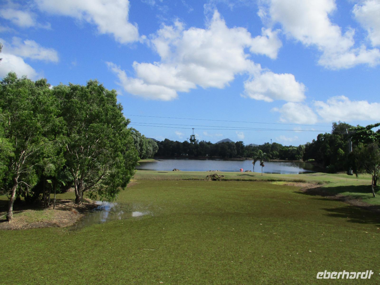Heute holte uns Wolfgang ab, gleichzeitig Reiseleiter und Busfahrer für diesen Tag. Unser heutiges Ziel war der Daintree-Nationalpark. Auf der Fahrt dahin kamen wir große Teile der Strecke entlang der schönen und beeindruckenden Küste entlang. Wir sahen Felsen, Sandbuchten und schöne Ausblicke hinaus aufs Meer. In Port Douglas machten wir kurz Halt und suchten erste interessante Fotomotive mit Blick aufs Meer. Durch ausgedehnte Wälder führte uns unser weiterer Weg. Es gab zahlreiche Warnschilder, die die Autofahrer davor bewahren sollten, mit den dort lebenden Helmcassowaries zu kollidieren. Das ist einer der größten Laufvögel, dessen besonderes Kennzeichen ein blauer Helm auf dem Kopf ist. Scheinbar gibt es viele Unfälle mit diesen großen Tieren hier in der Gegend. An einem Strandcafé machten wir Halt. Wir konnten im herrlichen Sand des Strandes spazieren gehen oder uns gemütlich einen Kaffee mit Blick aufs Meer schmecken lassen. Aufpassen mussten wir trotzdem, denn Warnschilder informierten uns, dass es hier Krokodile gab und auch gefährliche Quallen. Wir ließen ein Bad im Meer daher ausfallen. Nach einem Schluck Kaffee ging es schon weiter. Eine Bootsfahrt im Mangrovenwald stand als nächstes auf unserem Plan. Wir waren auf der Suche nach den dort lebenden Salzwasserkrokodilen. Die Männchen können über vier Meter groß werden, Weibchen zwischen 3,5 und drei Metern. Nach einiger Suche entdeckten wir ein Krokodilweibchen, das im seichten Wasser am Ufer lauerte. Da es nicht aus dem Wasser kam, konnten wir es nicht in Gänze erkennen und auch die Fotos zeigen nur ein Stück des Tieres. Dennoch erfuhren wir viel Interessantes über die hier wachsenden verschiedenen Mangrovenarten. Nach der Bootsfahrt wurden wir in ein Restaurant mitten im Regenwald gebracht mit dem Namen „On the Turps", wo wir uns gegrilltes Steak oder Fisch schmecken ließen. Nach dem Mittagessen fuhren wir zur Mossman Gorge, wo wir auf einem schön gestalteten Pfad durch den Regenwald spazieren konnten. Riesige Farne und interessante Bäume konnten wir hier entdecken. Im Fluss badeten einige Leute und eine Hängebrücke lud zum schaukelnden Überqueren des Flusses ein. Einige wagten es sogar, im klaren Wasser des Gebirgsflusses baden zu gehen. Auch den heutigen Abend verbrachten wir beim Abendessen in unserem Hotel.