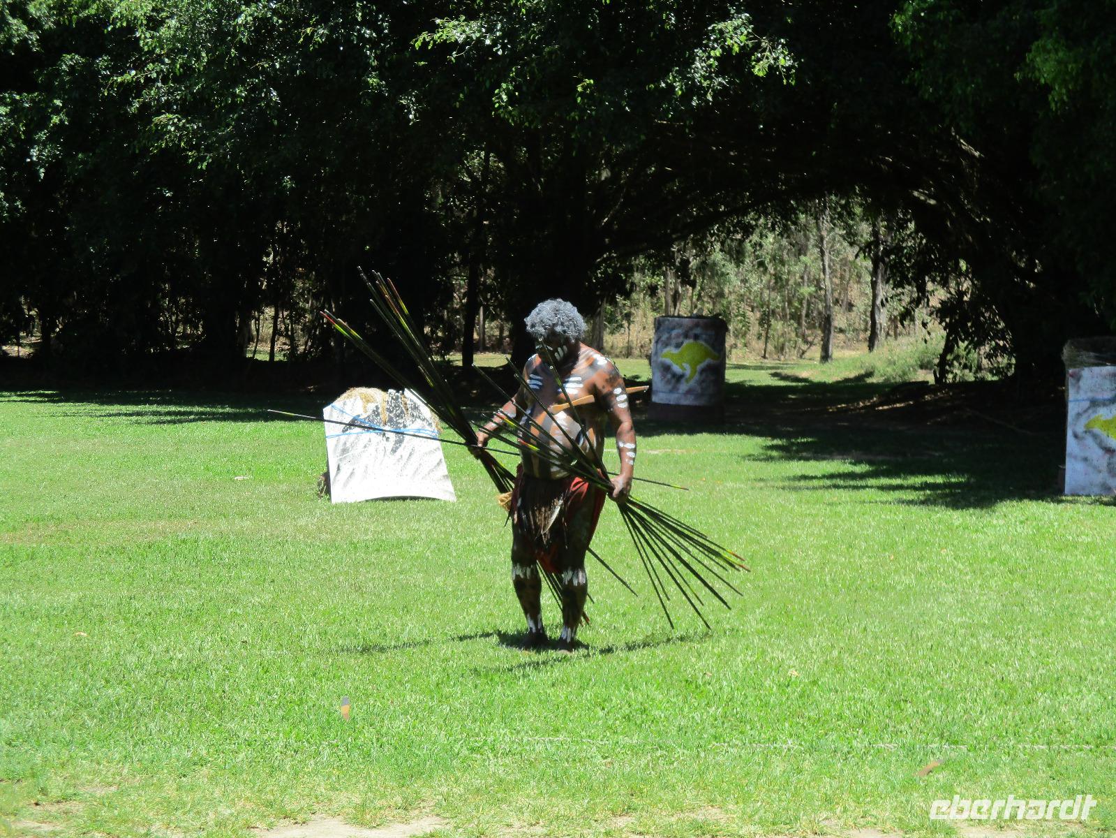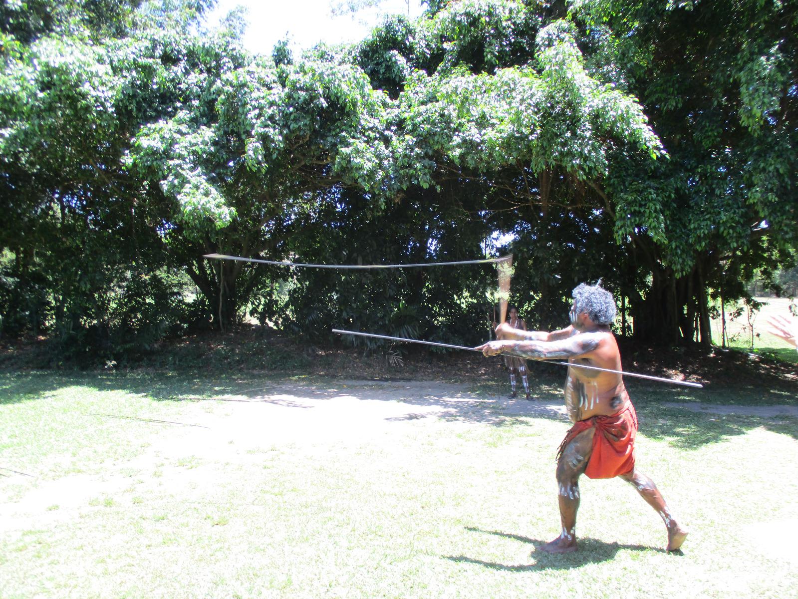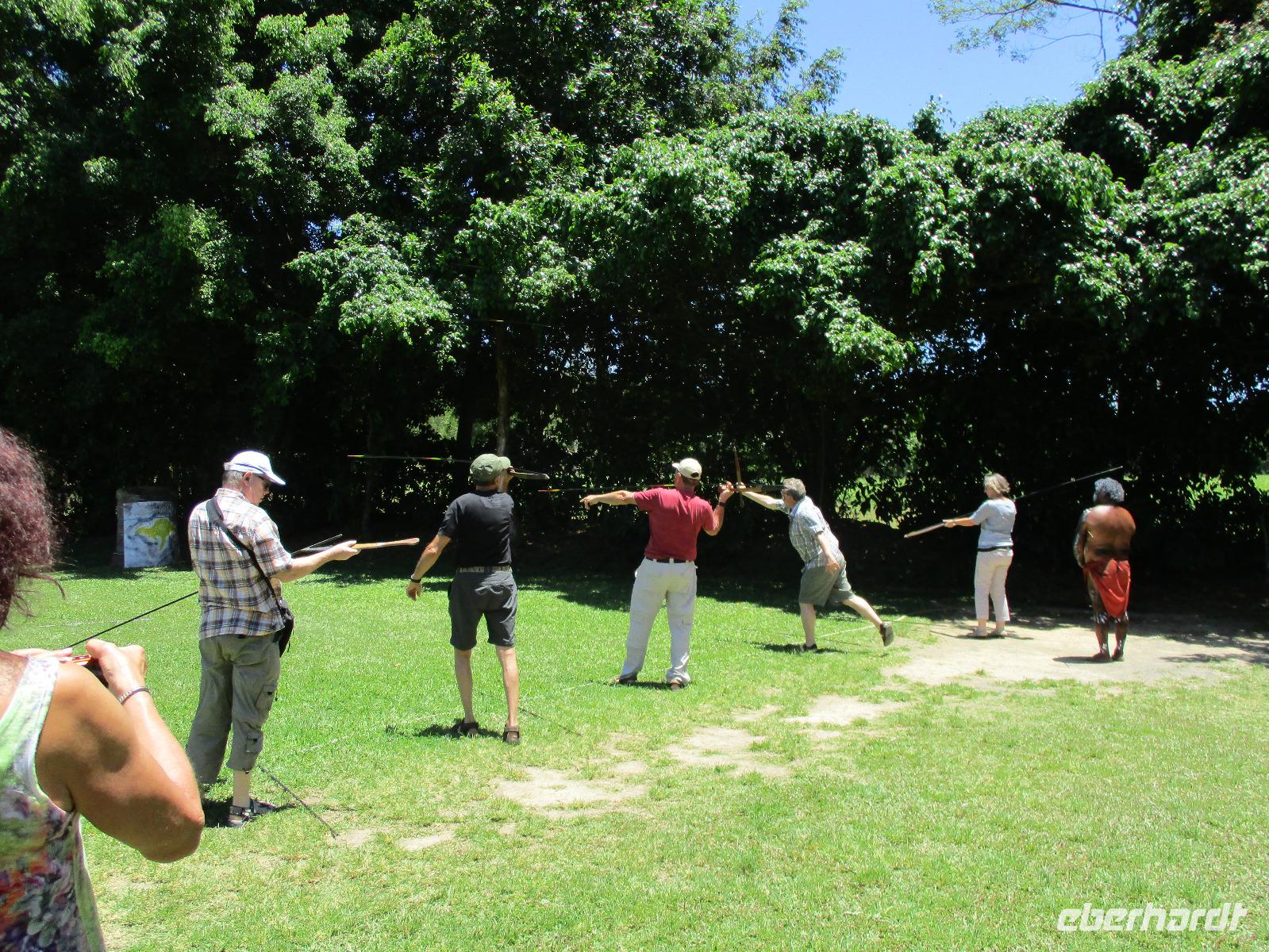 Wir begannen unseren Tag im Aborigini-Center, wo uns unser Aborigini-Führer für diesen Vormittag schon in traditioneller Bemalung erwartete. Er hieß Gurrangga, was so viel heißt wie „lachender Hans" und einen einheimischen Vogel meint. Gurrangga zeigte uns vieles im Center, erklärte uns Pflanzen und Nüsse und wie die Ureinwohner sie benutzten, führte uns sein Didgeridoo vor, mit dem er für uns ungewohnte Laute erzeugte und damit auch das Verhalten von Tieren nachahmen konnte. Wir sahen eine Filmshow, die uns die Entstehung des Lebens in der Vorstellung der Ureinwohner näher brachte. Im Theater sangen, tanzten und musizierten einige Aborigini für uns. Bevor wir uns verabschiedeten, durften wir selber noch Bumerang und Speere werfen. Wir stellten uns gar nicht so ungeschickt dabei an. Im Anschluss an die Erfahrungen im Aborigini-Center nahmen wir die Seilbahn Skyrail und fuhren in einer Gondel sitzend hoch über dem Regenwald. Die Bäume unter uns bildeten ein geschlossenes Dach, wobei jede Pflanze hier versucht, etwas vom Sonnenlicht abzubekommen. Ein leuchtend blauer Schmetterling tanzte über den Wipfeln. An zwei Stationen verließen wir die Seilbahn und spazierten auf Holzwegen durch den Regenwald. Beeindruckende Farne, Palmen und riesige Bäume konnten hier entdeckt werden. Am Ende der Seilbahnfahrt erreichten wir den kleinen Ort Kuranda, wo zahlreiche Touristen unterwegs sind. Souvenirs werden im ganzen Ort angeboten, wir hatten Gelegenheit, dort unsere Mittagspause zu verbringen, eine Kleinigkeit zu essen und Andenken einzukaufen. Opale sind hier ein beliebtes Mitbringsel. Die Gegend ist für seine schönen Opale bekannt. Zurück ging es mit der historischen Eisenbahn, die uns gemütlich an beeindruckenden Tälern und Wasserfällen zurück in Richtung Cairns brachte. Am Bahnhof Freshwater erwartete uns schon unser Bus, der uns am frühen Abend zurück zu unserem Hotel in Cairns brachte. Wir genossen ein gutes Abendessen und beschlossen den Abend im Hotel oder bei einem Bummel entlang der Promenade.
