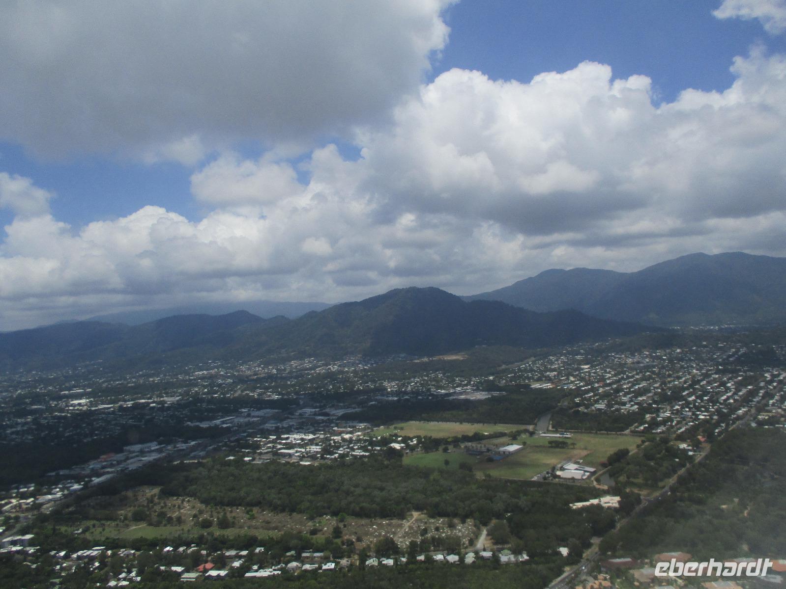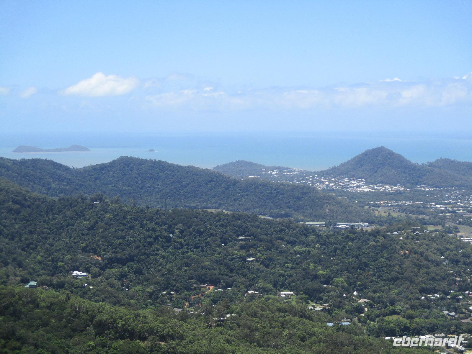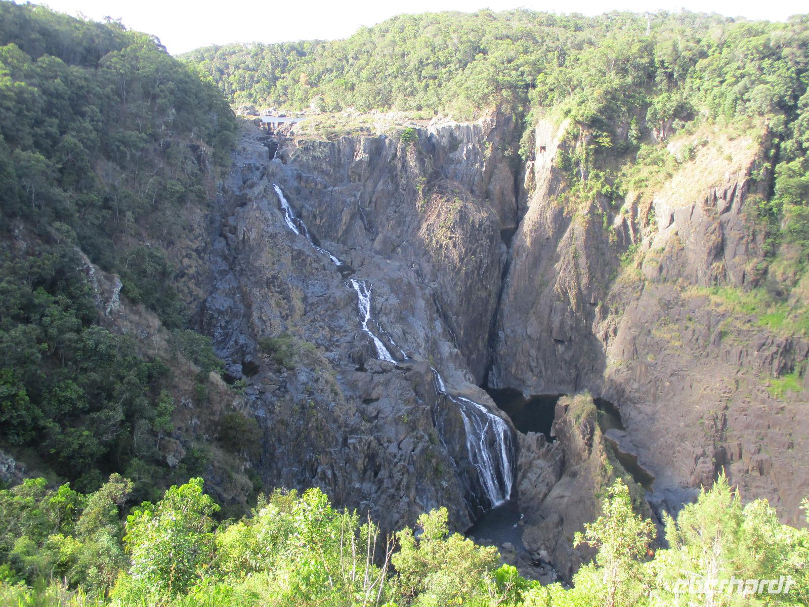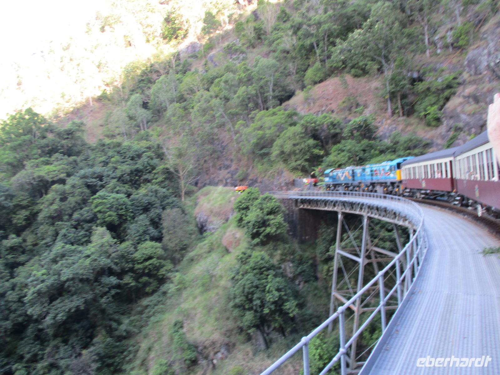 Wir begannen unseren Tag im Aborigini-Center, wo uns unser Aborigini-Führer für diesen Vormittag schon in traditioneller Bemalung erwartete. Er hieß Gurrangga, was so viel heißt wie „lachender Hans" und einen einheimischen Vogel meint. Gurrangga zeigte uns vieles im Center, erklärte uns Pflanzen und Nüsse und wie die Ureinwohner sie benutzten, führte uns sein Didgeridoo vor, mit dem er für uns ungewohnte Laute erzeugte und damit auch das Verhalten von Tieren nachahmen konnte. Wir sahen eine Filmshow, die uns die Entstehung des Lebens in der Vorstellung der Ureinwohner näher brachte. Im Theater sangen, tanzten und musizierten einige Aborigini für uns. Bevor wir uns verabschiedeten, durften wir selber noch Bumerang und Speere werfen. Wir stellten uns gar nicht so ungeschickt dabei an. Im Anschluss an die Erfahrungen im Aborigini-Center nahmen wir die Seilbahn Skyrail und fuhren in einer Gondel sitzend hoch über dem Regenwald. Die Bäume unter uns bildeten ein geschlossenes Dach, wobei jede Pflanze hier versucht, etwas vom Sonnenlicht abzubekommen. Ein leuchtend blauer Schmetterling tanzte über den Wipfeln. An zwei Stationen verließen wir die Seilbahn und spazierten auf Holzwegen durch den Regenwald. Beeindruckende Farne, Palmen und riesige Bäume konnten hier entdeckt werden. Am Ende der Seilbahnfahrt erreichten wir den kleinen Ort Kuranda, wo zahlreiche Touristen unterwegs sind. Souvenirs werden im ganzen Ort angeboten, wir hatten Gelegenheit, dort unsere Mittagspause zu verbringen, eine Kleinigkeit zu essen und Andenken einzukaufen. Opale sind hier ein beliebtes Mitbringsel. Die Gegend ist für seine schönen Opale bekannt. Zurück ging es mit der historischen Eisenbahn, die uns gemütlich an beeindruckenden Tälern und Wasserfällen zurück in Richtung Cairns brachte. Am Bahnhof Freshwater erwartete uns schon unser Bus, der uns am frühen Abend zurück zu unserem Hotel in Cairns brachte. Wir genossen ein gutes Abendessen und beschlossen den Abend im Hotel oder bei einem Bummel entlang der Promenade.