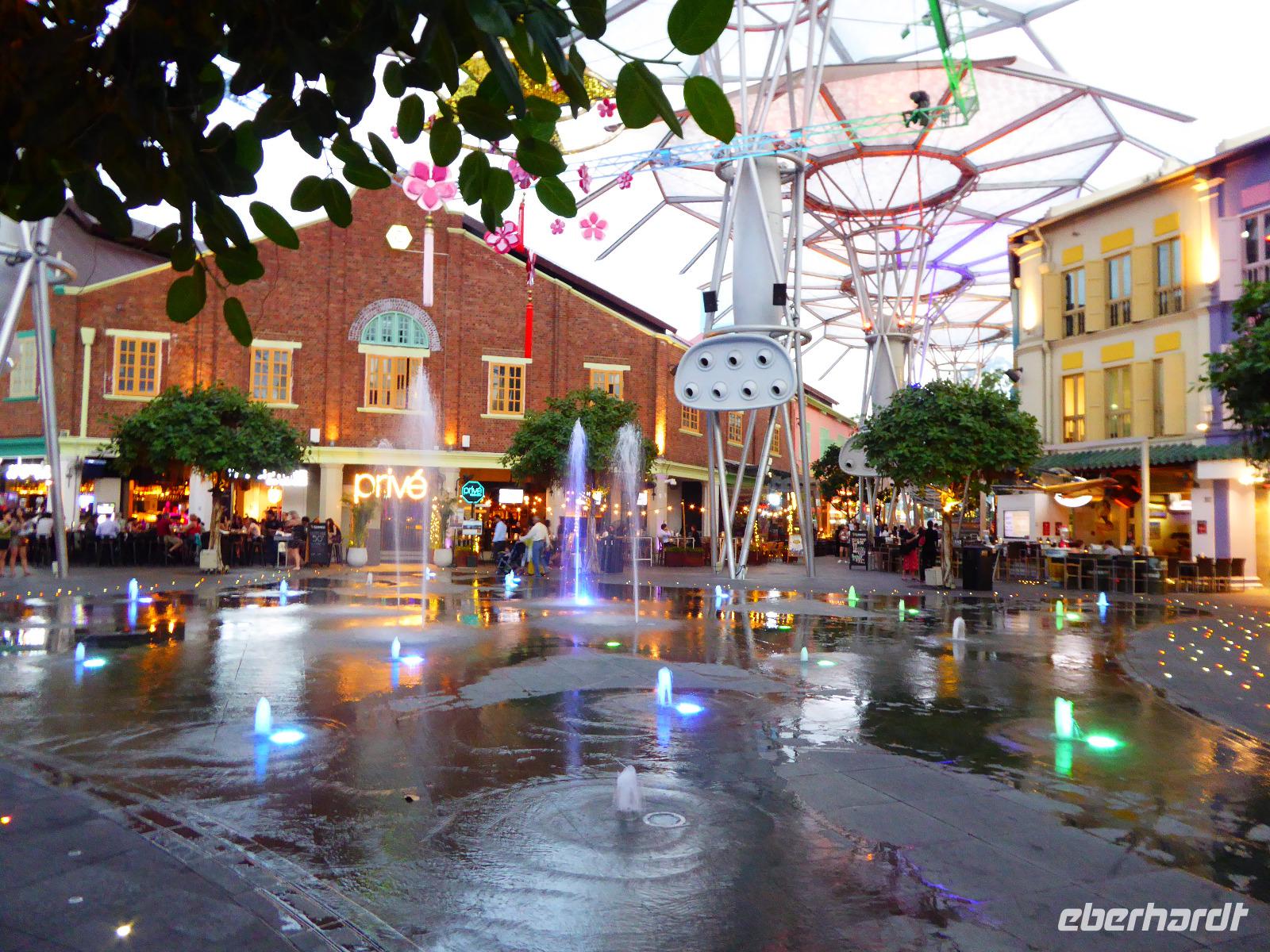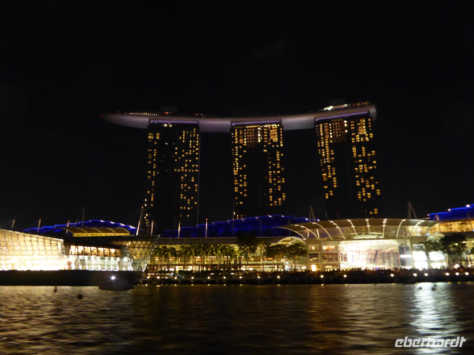 Komisch, wir sind abends losgeflogen, über Nacht unterwegs gewesen und schon ist es wieder Abend - na sowas, wo ist denn der Tag geblieben? Wir haben sieben Stunden Zeitverschiebung, so erklärt sich das Ganze. Martine, unsere örtliche Reiseleiterin, wartet schon auf uns. Wir aber müssen erst einmal die Einreisekarten ausfüllen, die Koffer holen und was sonst noch so zu erledigen ist. Endlich haben wir es geschafft. Wir fahren zum Hotel Park Hotel Clarke Quay und checken dort ein. Nach einer knappen halben Stunde treffen wir uns schon wieder an der Rezeption und starten unseren Abendspaziergang. Ziel ist die Bootsanlegestelle, denn wir wollen mit einer Dschunke über den Singapur-River fahren. Die nächtliche Skyline von Singapur ist beeindruckend. Überall ragen illuminierte Wolkenkratzen in den dunklen Abendhimmel. Gespannt warten wir auf den Anblick des Marina Bay Sands Hotels. Wir werden nicht enttäuscht. Die Bootsfahrt ist auch so angelegt, dass jeder genügend Zeit und Raum zum Fotografieren hat. Nach einer guten Stunde ist die Fahrt vorbei. Martine verabschiedet sich und wir kehren auf dem Rückweg noch in eine gemütliche Bar ein. Bei Burger und Guinness lassen wir den Tag ausklingen.