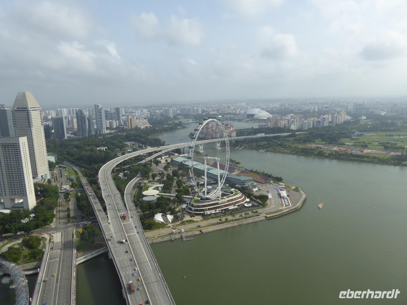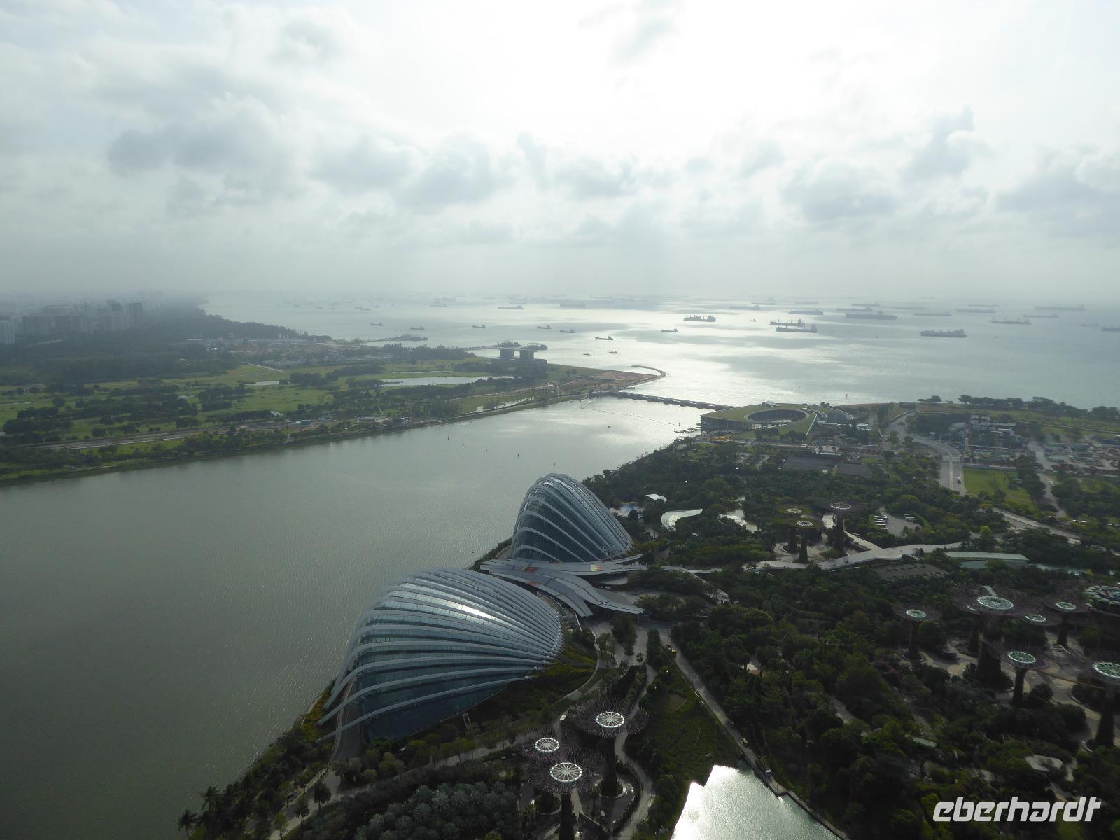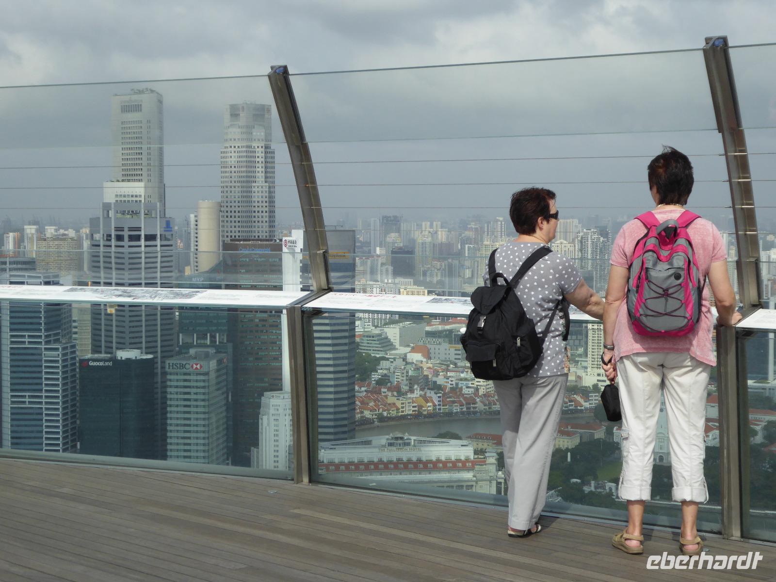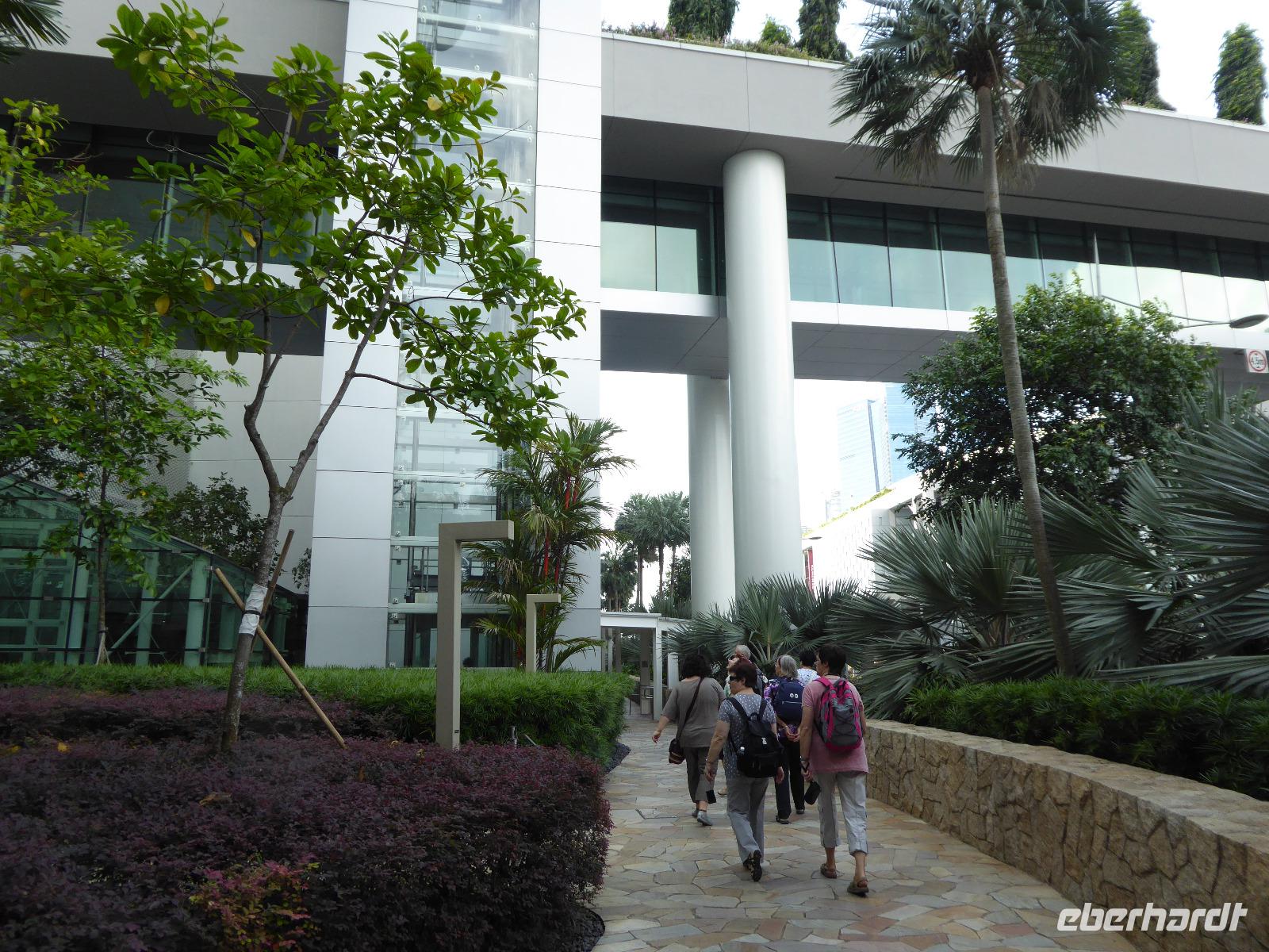 Der Vormittag steht zur freien Verfügung. Wir haben beschlossen, diesen gemeinsam zu verbringen. Aufgeteilt auf vier Taxis fahren wir zum Marina Bay Sands Resort. Heute wollen wir auf den Dachgarten fahren und von dort die Aussicht über die Stadt genießen. Wir sind ein bisschen zu früh, die Aussichtsplattform öffnet erst halb zehn. So aber sind wir die Ersten und können ohne großes Gedränge auf dem Dach spazieren gehen. Nach einer Stunde treffen wir uns im Foyer des Hotels und gehen gemeinsam zu den „Gardens by the Bay". Schon der Spaziergang zu den Gewächshäusern ist ein Abenteuer. Man kommt sich ein bisschen vor, wie Alice im Wunderland. Die gesamte Anlage ist ca. 100 Hektar groß. Im Bay South Garden befinden sich zwei gläserne Gewächshäuser - der Flower Dome und der Cloud Forrest (Blumenhaus und Nebelwald), in denen Pflanzen aus verschiedenen Klimazonen bewundert werden können. Auf einem 35 Meter hohen Turm, der wie ein Pflanzenberg aussieht, wachsen Orchideen, Bromelien und Flamingoblumen. Nachdem wir beide Gewächshäuser besichtigt haben, laufen wir zurück zum Hotel und besteigen dort zwei Großraum-Taxis. Dass wir uns dabei selbst übers Ohr hauen, bemerken wir erst, als wir bezahlen müssen. Statt 4x 20 Singapur Dollar müssen wir jetzt 2 x 50 Singapur Dollar bezahlen, da hilft es auch nicht, dass wir vorher nicht gefragt haben. Nun ja, auf die Masse gesehen, ist es jetzt kein Drama, aber trotzdem nicht schön. Wir sind pünktlich zurück am Parkhotel und nach einer kurzen Verschnaufpause laden wir unsere Koffer in den Bus. Jetzt unternimmt Martine mit uns eine Stadtrundfahrt, auf der wir noch einmal das Bankenviertel mit seinen Wolkenkratzern bei Tage bewundern, einen Tempel in China-Town besuchen und es sogar noch schaffen, Ansichtskarten zu schreiben. Anschließend geht es zum Flughafen. Es bleibt Zeit, den Umsatz der vielen Geschäfte zu stärken oder es sich in einem der vielen Restaurants gemütlich zu machen.