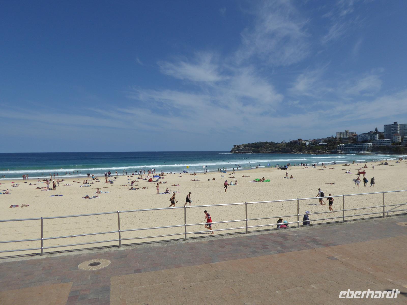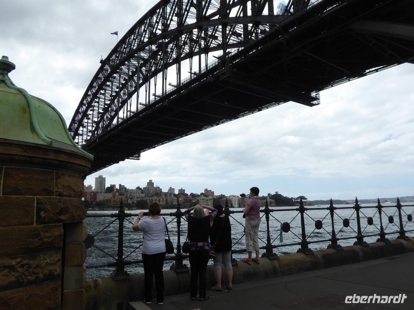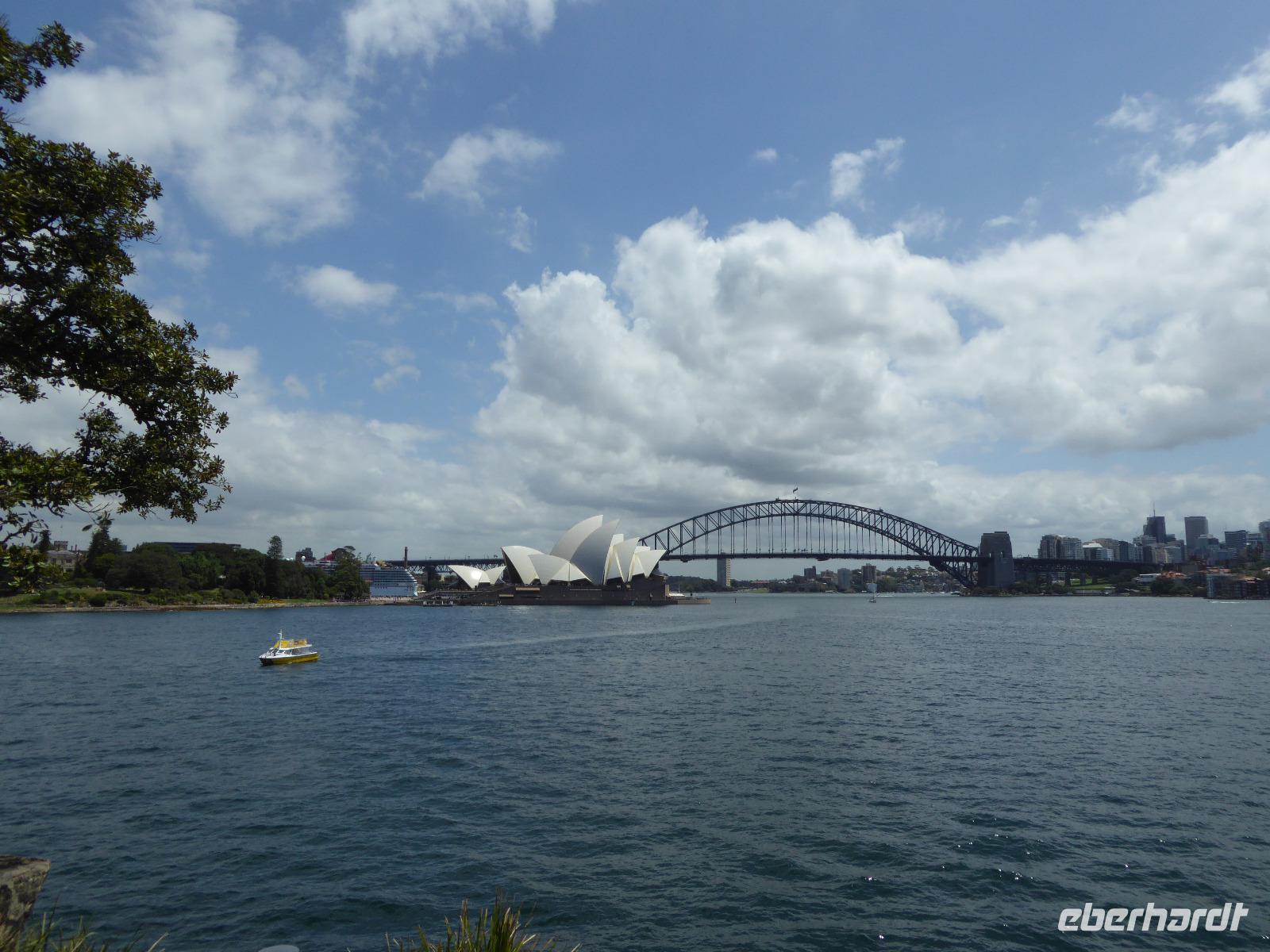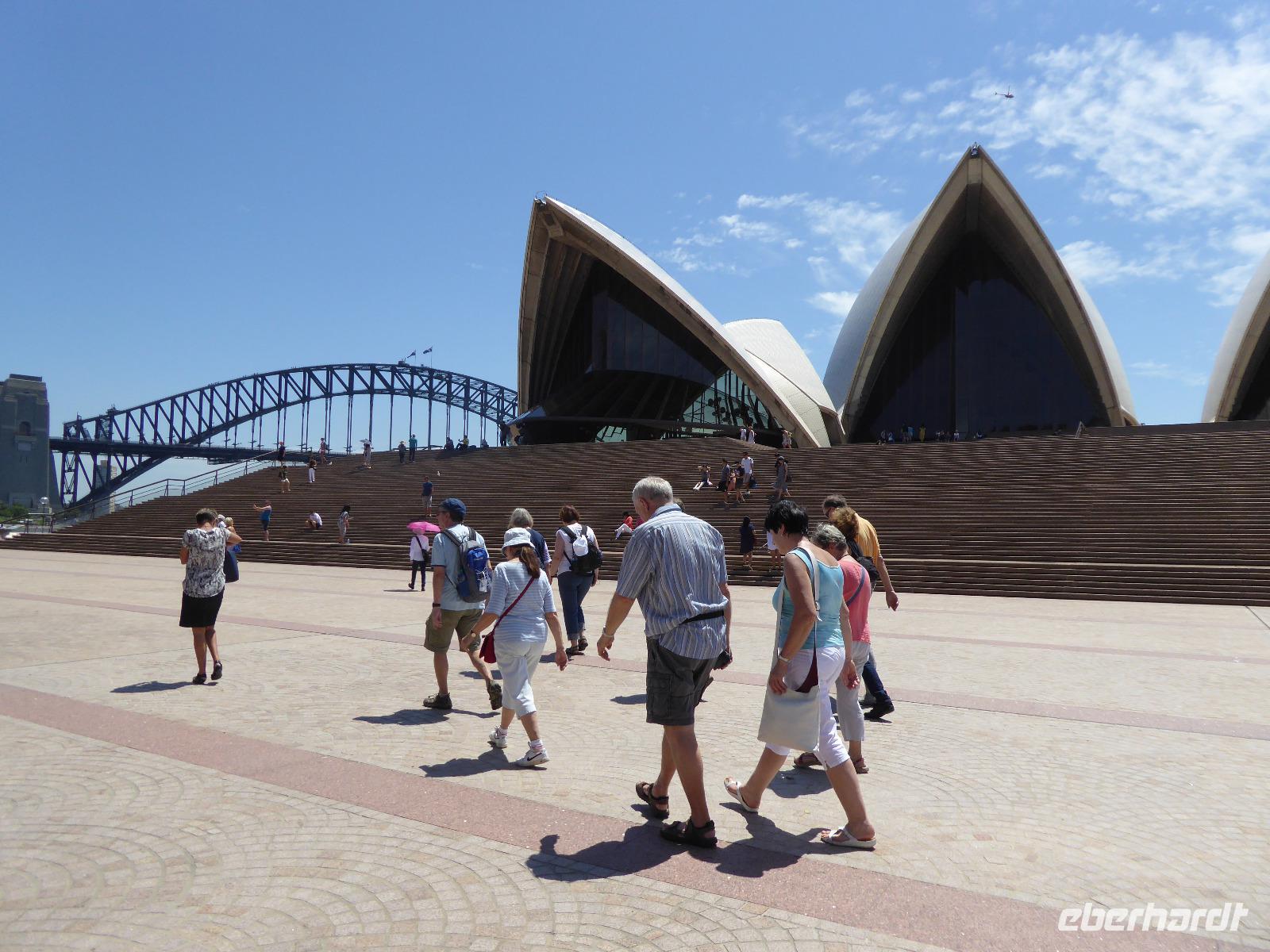 Wir erreichen Australien am frühen Morgen, fahren zum Hotel, checken ein und frühstücken. Nun bleibt noch etwas Zeit, um sich frisch zu machen, unser Programm startet um 12 Uhr. Während der orientierenden Stadtrundfahrt sitzt uns noch die Zeitverschiebung in den Knochen und so verpassen wir die eine oder andere Information, da uns einfach ab und zu die Augen zu fallen. Zum Fotostopp sind alle wieder fit. Wir halten an der berühmten Harbour Bridge und an anderen Aussichtspunkten. Am Bondi Beach legen wir unsere Mittagspause ein. Die Sonne lacht und der Himmel ist blau. Was kann es schöneres geben?