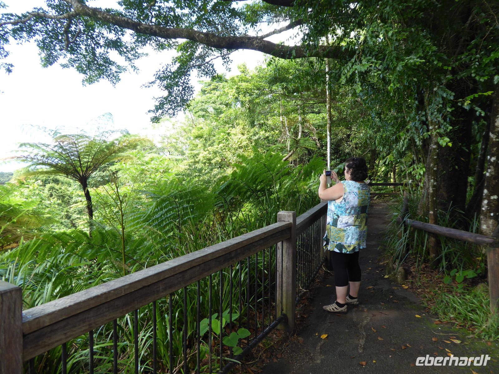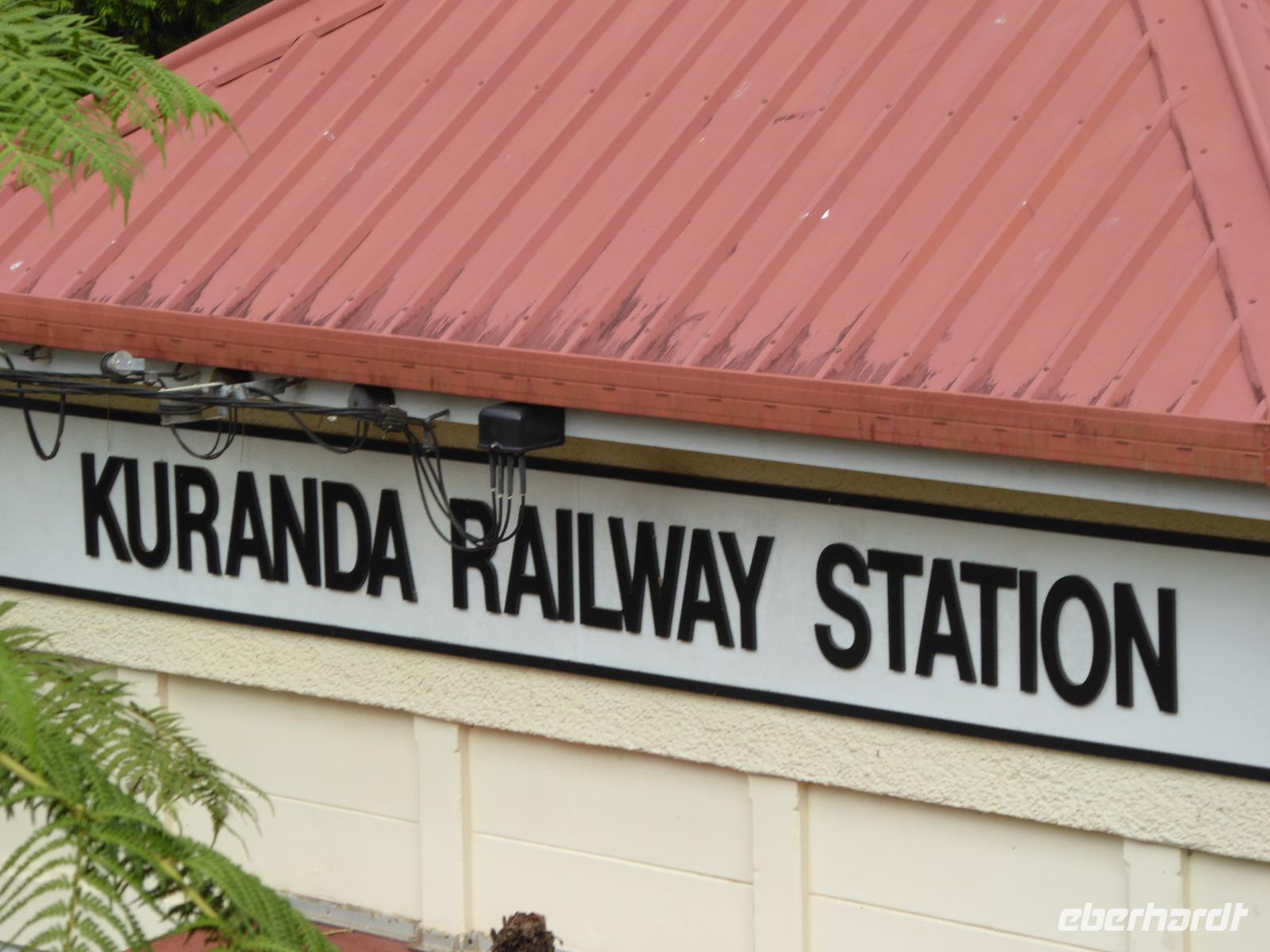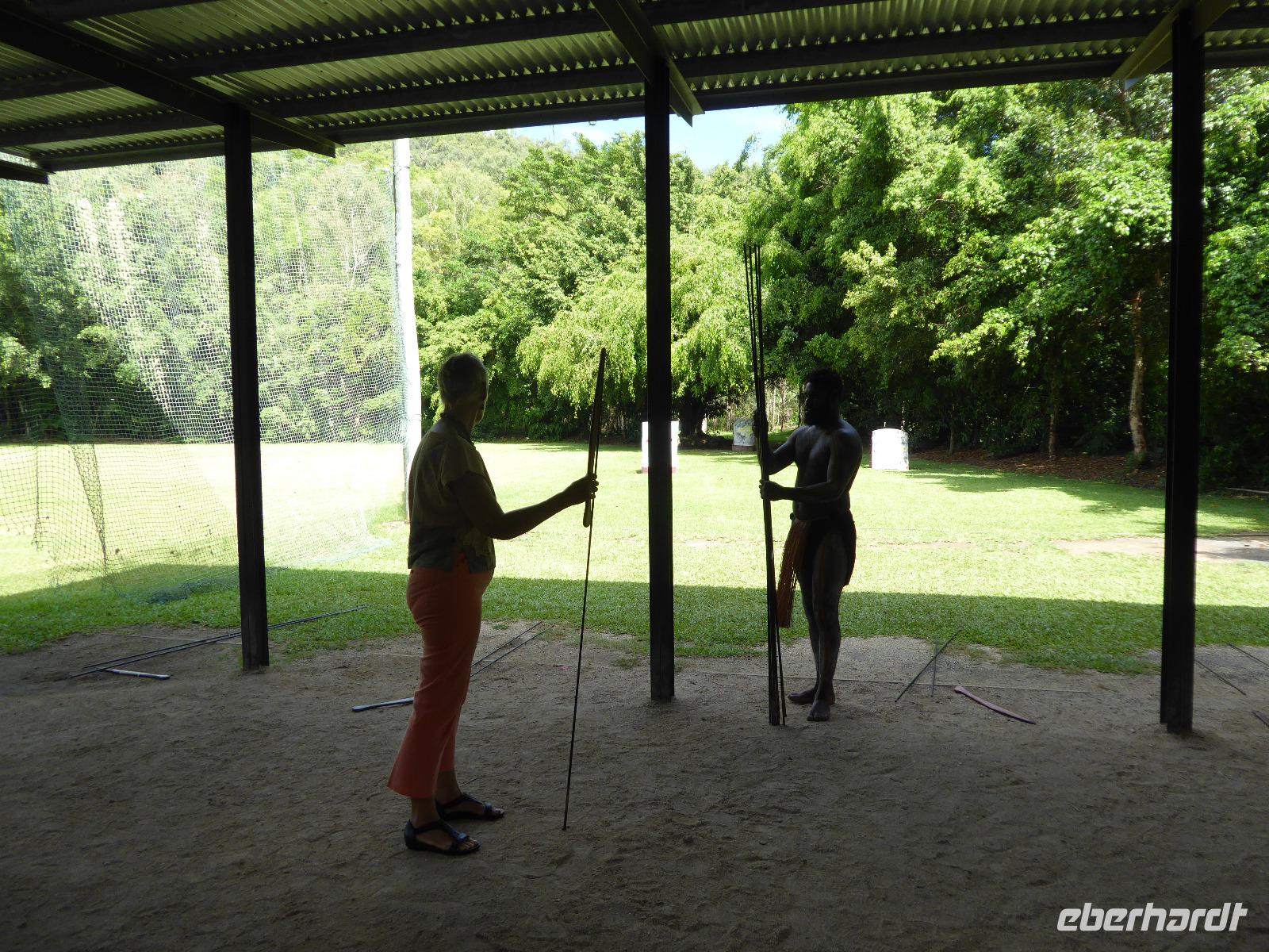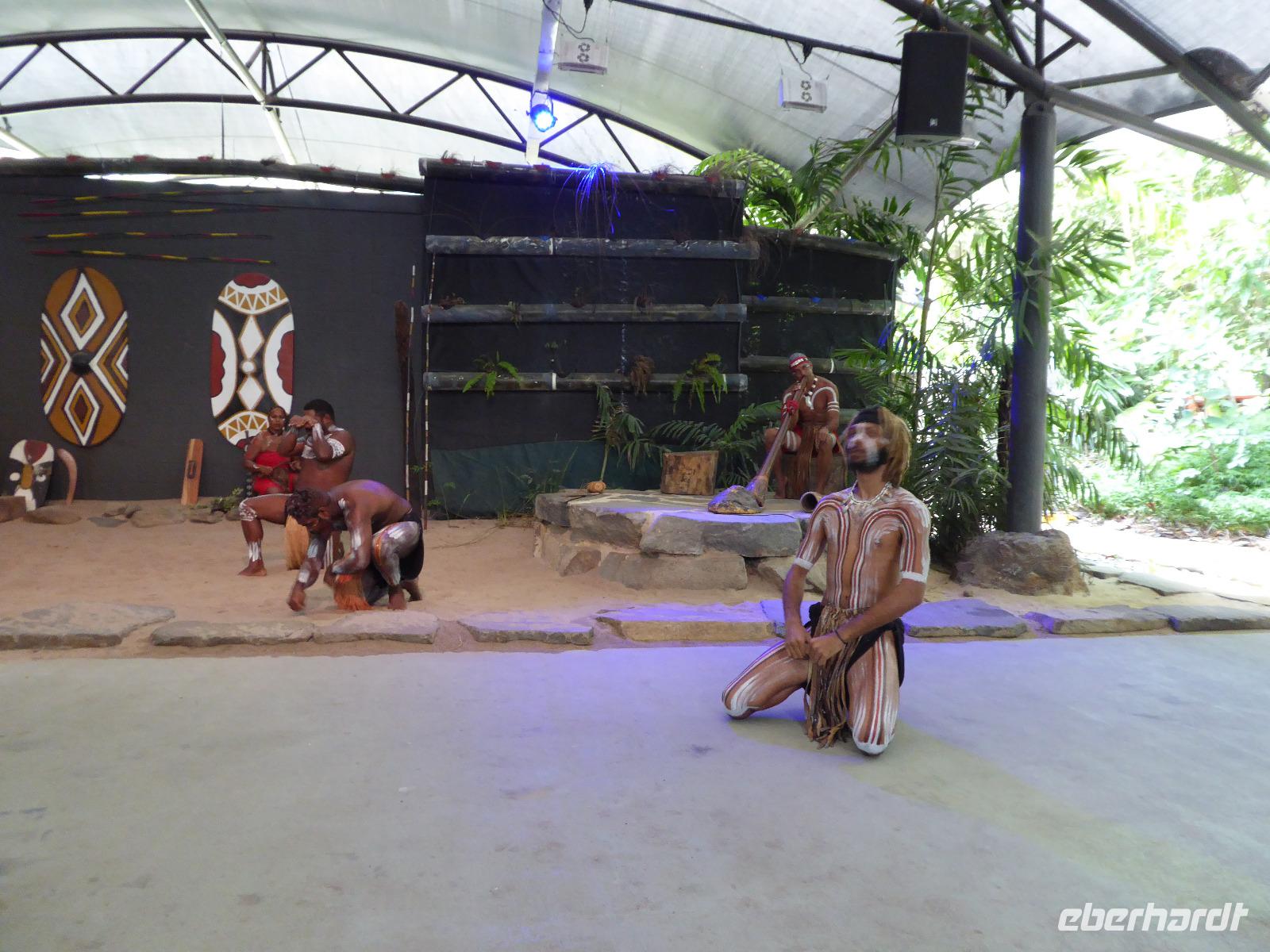 Simone holt uns um 8.30 Uhr mit dem Bus vom Hotel ab. Wir fahren zum Tjapukai Culture Park. Im Eingangsbereich befindet sich eine Ausstellung mit Werken verschiedener Aborigini-Künstler. Darüber hinaus sind hier mehrere Aboriginis unterwegs, die sich freundlich und geduldig für Fotos zur Verfügung stellen. Außer uns sind noch andere Gruppen hier zu Gast. Jede bekommt ihren eigenen Aborigini-Guide. In einem Saal zeigt uns unser Guide, wie die Aboriginis mit Schild und Speer umgehen. Und er erklärt uns an einem großen Gemälde die Entstehung der Welt aus Aborigini-Sicht. Dann werden unsere Gesichter mit Naturfarben bemalt. Wieder und wieder werden wir dazu aufgefordert, Fotos zu machen, was wir natürlich begeistert nutzen. Nun bekommen wir die Gelegenheit, uns im Speerwurf zu probieren. Das ist gar nicht so leicht. Aber unser Guide zeigt es uns geduldig. Bei der nächsten Vorstellung dürfen wir weder filmen noch fotografieren. In einer Ton- und Lichtshow wird noch einmal die Entstehung der Erde dargestellt. Zwei Aborigines führen durch die Show. Nun heißt es wieder: praktische Übung für uns. Wir begeben uns zum Bumerang-Platz. Nachdem uns die Aboriginis die Technik erklärt haben, können wir es selbst ausprobieren. Manchem gelingt es sogar, den Bumerang so zu werfen, dass er wieder am Ausgangspunkt ankommt. Den krönenden Abschluss des Besuches im Kulturzentrum bildet eine Theatershow, bei der auf dem Digeridoo geblasen wird und Geschichten der Aborigines dargestellt werden. Zum Schluss singt das komplette Theater gemeinsam ein Aborigini-Lied und die Gäste aus der ersten Reihe dürfen dazu tanzen. Was für ein Spaß. Jetzt fahren wir mit der Sky-Rail nach Kuranda. In Gondeln, die bis zu sechs Personen fassen, gleiten wir gemütlich über den Regenwald. Unterwegs legen wir zwei Stopps ein. Am Red Peak führt ein Weg durch das grüne Dickicht. Am zweiten Stopp erwartet uns der Ausblick auf die Wasserfälle. In Kuranda angekommen, weist uns Simone den Weg ins Stadtzentrum und wieder zurück zum Bahnhof. Jeder kann hier seinen eigenen Interessen nachgehen - Kunstgalerien besuchen, Souvenirs einkaufen, deutsche Bratwurst essen und/oder den Koala-Park besuchen. Hauptsache, es sind alle pünktlich am Zug. Anderthalb Stunden fahren wir mit dem historischen Zug durch die großartige Landschaft. Am einzigen Fotostopp regnet es gerade aus Kannen.