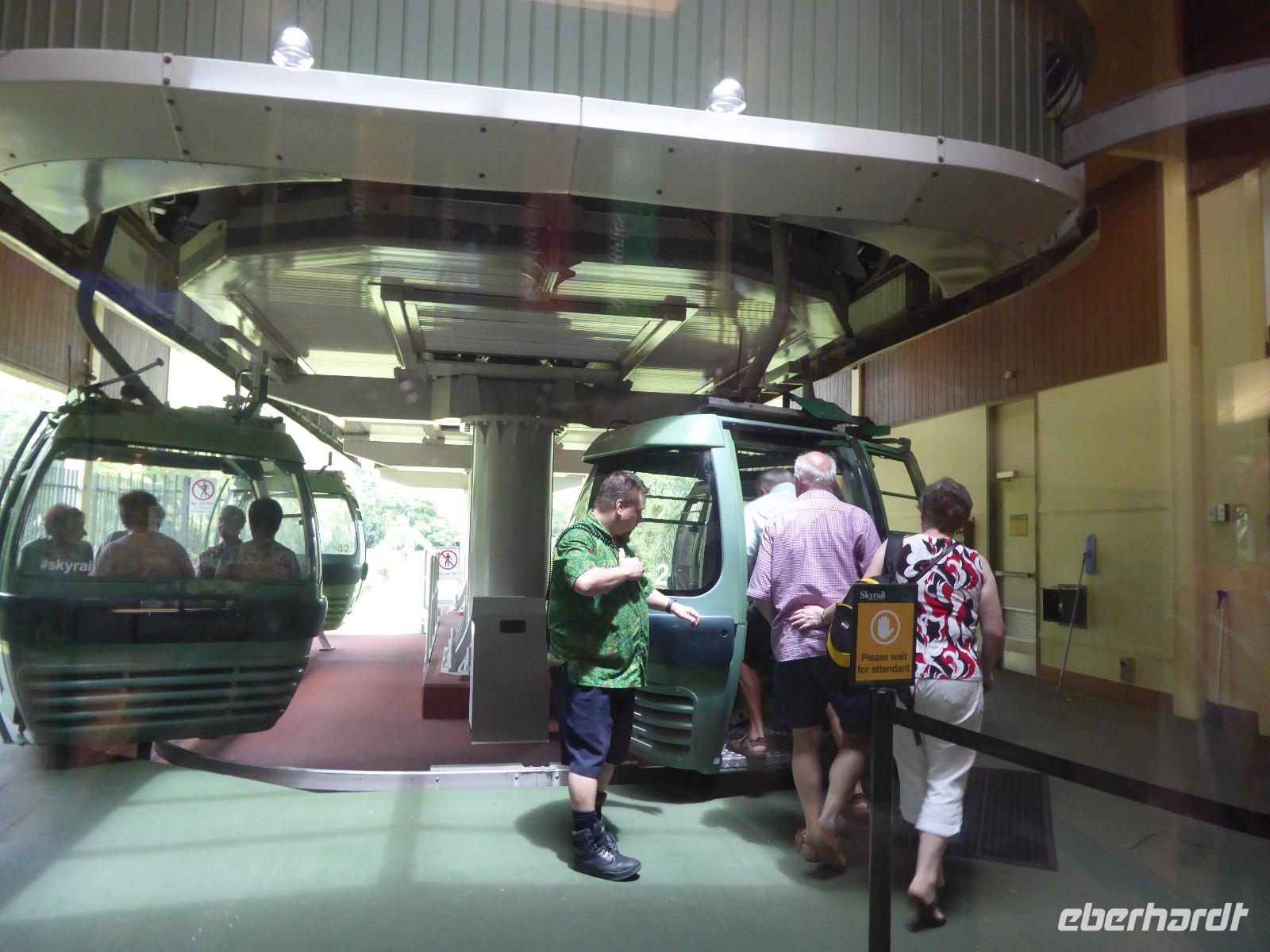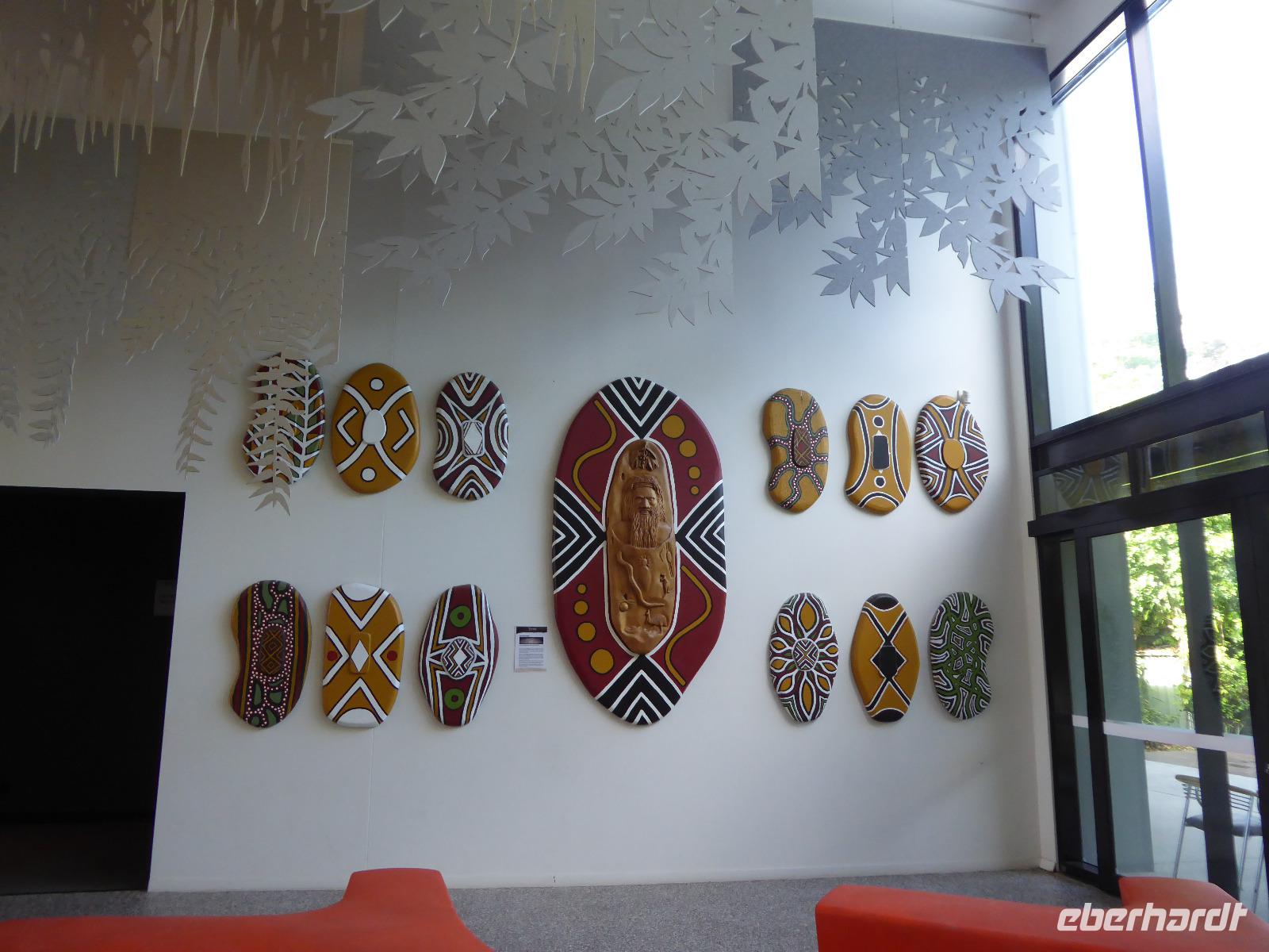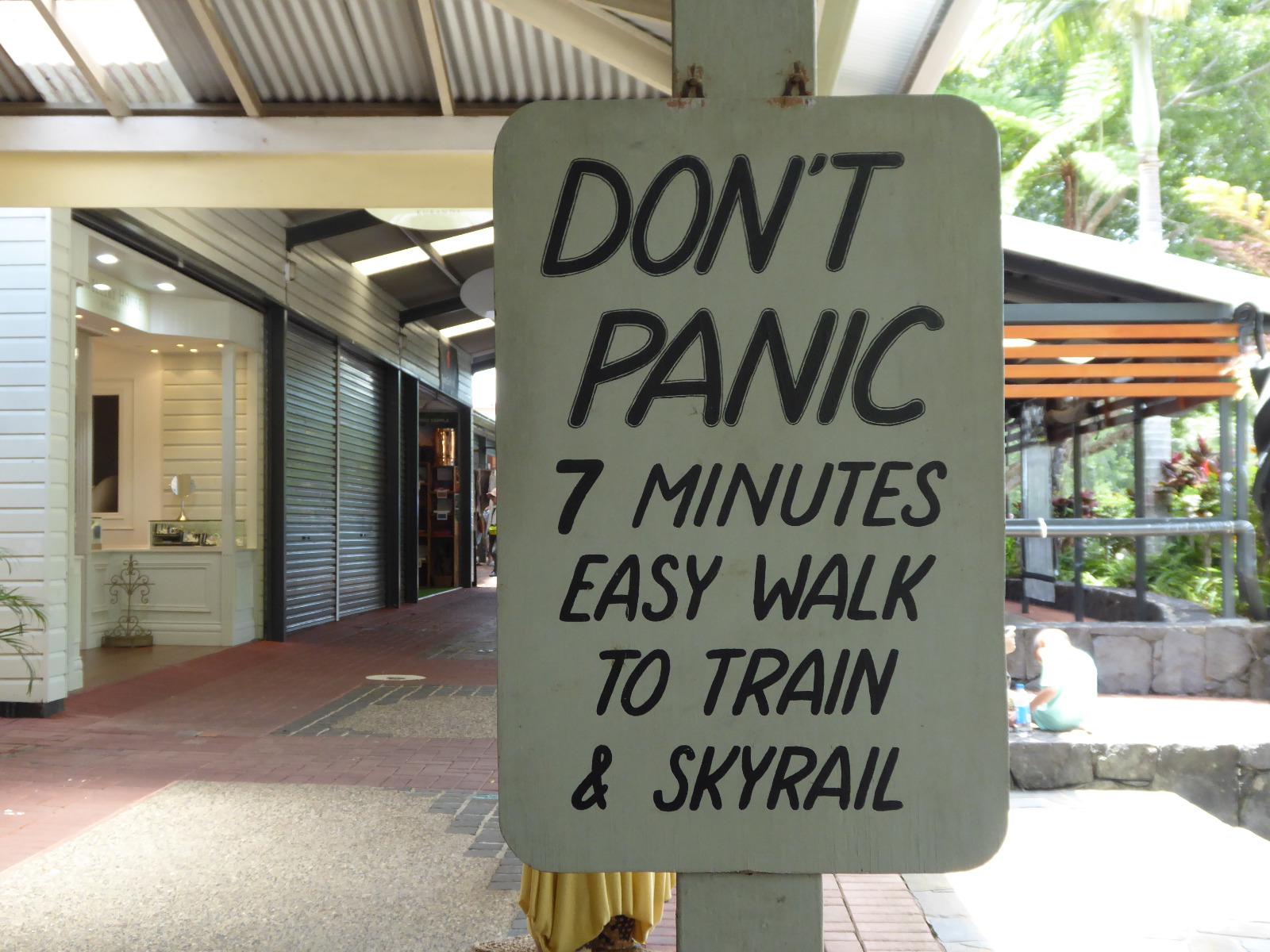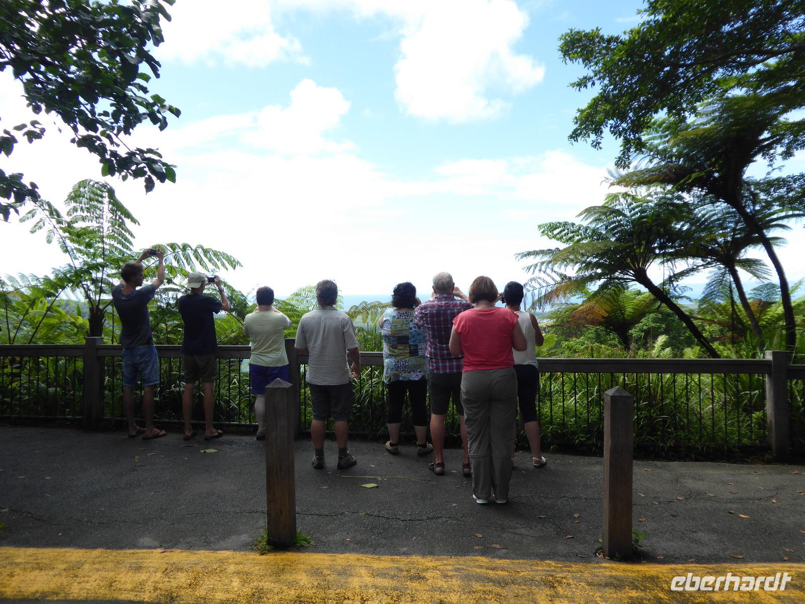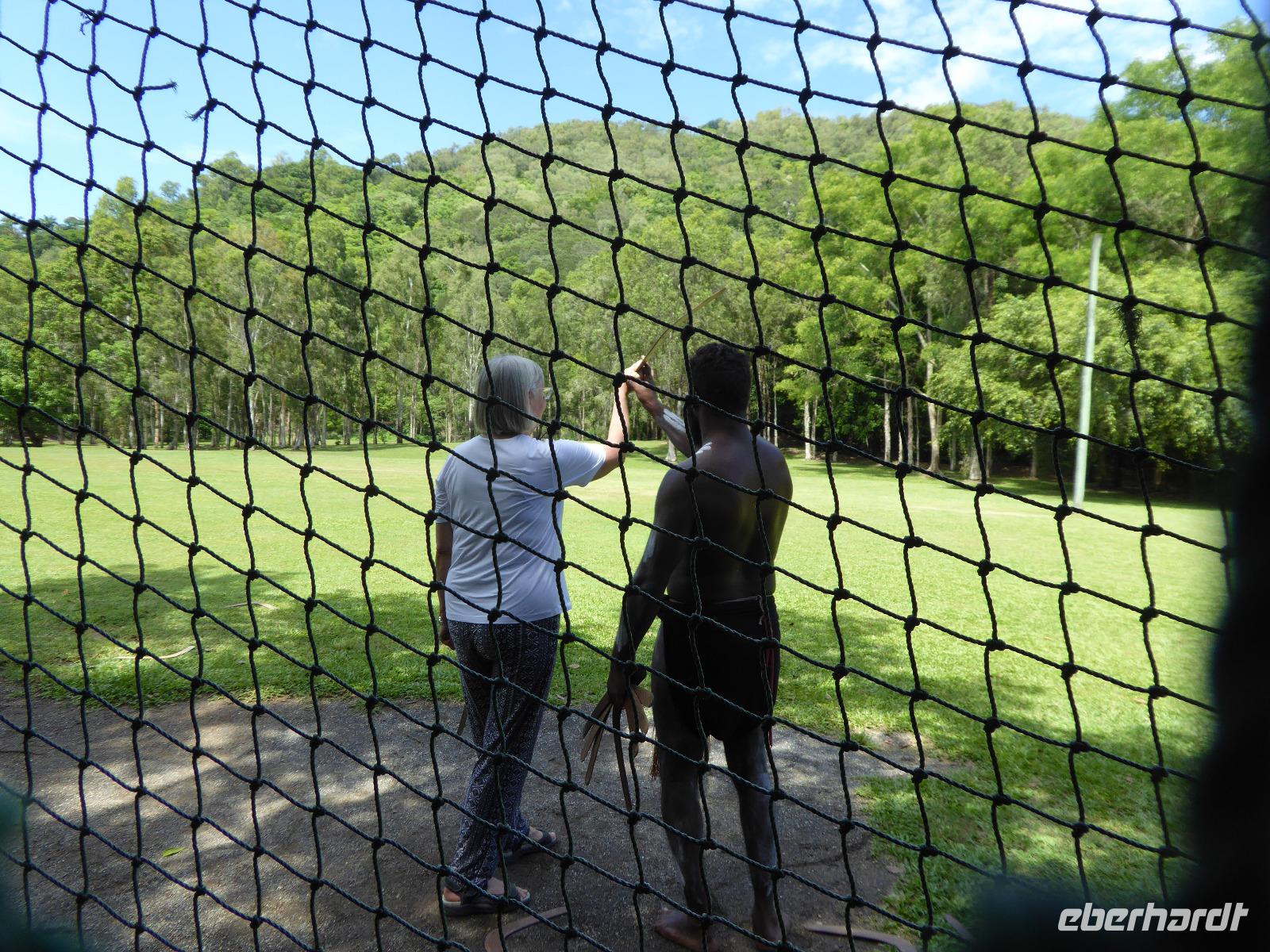 Simone holt uns um 8.30 Uhr mit dem Bus vom Hotel ab. Wir fahren zum Tjapukai Culture Park. Im Eingangsbereich befindet sich eine Ausstellung mit Werken verschiedener Aborigini-Künstler. Darüber hinaus sind hier mehrere Aboriginis unterwegs, die sich freundlich und geduldig für Fotos zur Verfügung stellen. Außer uns sind noch andere Gruppen hier zu Gast. Jede bekommt ihren eigenen Aborigini-Guide. In einem Saal zeigt uns unser Guide, wie die Aboriginis mit Schild und Speer umgehen. Und er erklärt uns an einem großen Gemälde die Entstehung der Welt aus Aborigini-Sicht. Dann werden unsere Gesichter mit Naturfarben bemalt. Wieder und wieder werden wir dazu aufgefordert, Fotos zu machen, was wir natürlich begeistert nutzen. Nun bekommen wir die Gelegenheit, uns im Speerwurf zu probieren. Das ist gar nicht so leicht. Aber unser Guide zeigt es uns geduldig. Bei der nächsten Vorstellung dürfen wir weder filmen noch fotografieren. In einer Ton- und Lichtshow wird noch einmal die Entstehung der Erde dargestellt. Zwei Aborigines führen durch die Show. Nun heißt es wieder: praktische Übung für uns. Wir begeben uns zum Bumerang-Platz. Nachdem uns die Aboriginis die Technik erklärt haben, können wir es selbst ausprobieren. Manchem gelingt es sogar, den Bumerang so zu werfen, dass er wieder am Ausgangspunkt ankommt. Den krönenden Abschluss des Besuches im Kulturzentrum bildet eine Theatershow, bei der auf dem Digeridoo geblasen wird und Geschichten der Aborigines dargestellt werden. Zum Schluss singt das komplette Theater gemeinsam ein Aborigini-Lied und die Gäste aus der ersten Reihe dürfen dazu tanzen. Was für ein Spaß. Jetzt fahren wir mit der Sky-Rail nach Kuranda. In Gondeln, die bis zu sechs Personen fassen, gleiten wir gemütlich über den Regenwald. Unterwegs legen wir zwei Stopps ein. Am Red Peak führt ein Weg durch das grüne Dickicht. Am zweiten Stopp erwartet uns der Ausblick auf die Wasserfälle. In Kuranda angekommen, weist uns Simone den Weg ins Stadtzentrum und wieder zurück zum Bahnhof. Jeder kann hier seinen eigenen Interessen nachgehen - Kunstgalerien besuchen, Souvenirs einkaufen, deutsche Bratwurst essen und/oder den Koala-Park besuchen. Hauptsache, es sind alle pünktlich am Zug. Anderthalb Stunden fahren wir mit dem historischen Zug durch die großartige Landschaft. Am einzigen Fotostopp regnet es gerade aus Kannen.