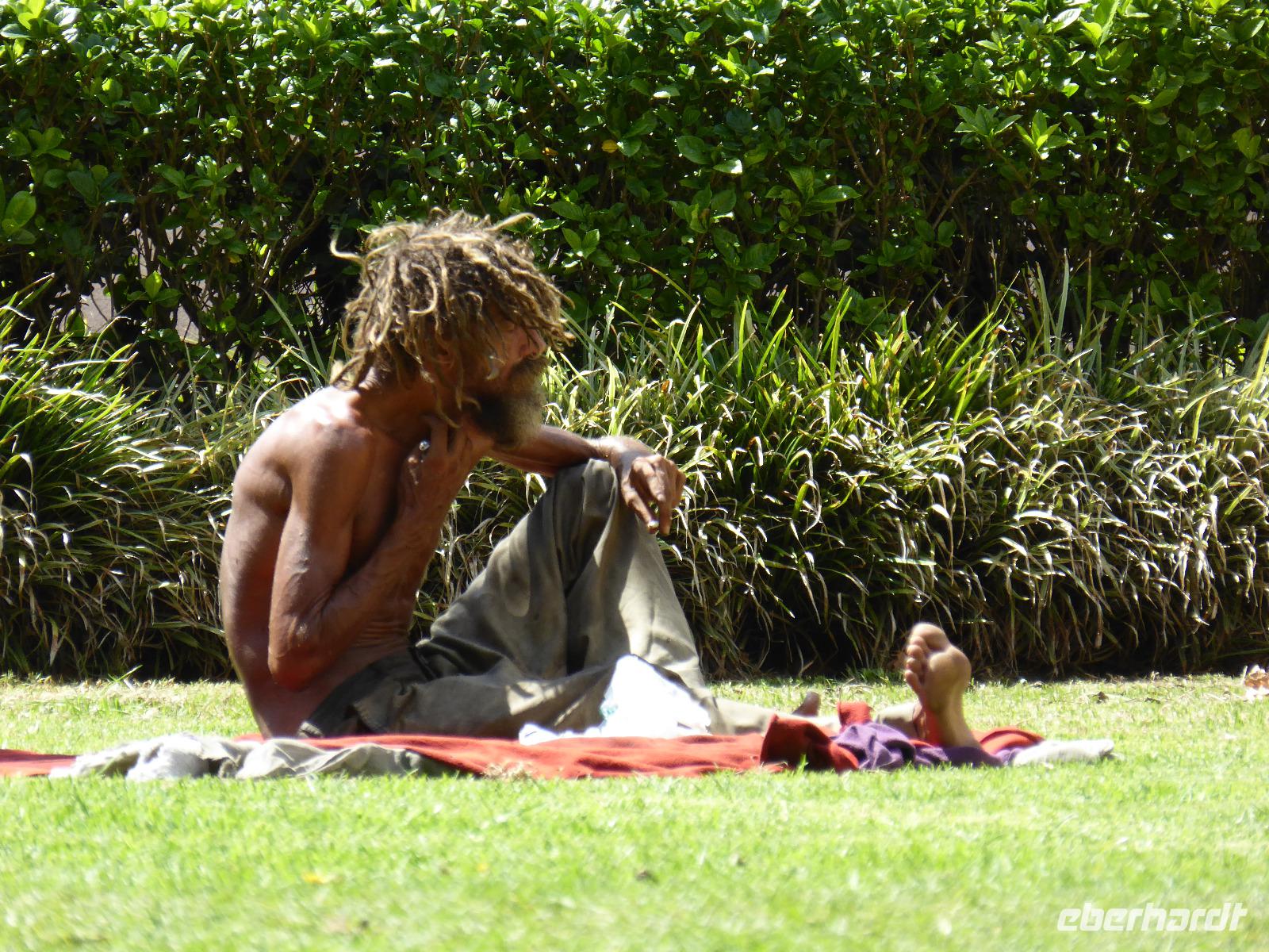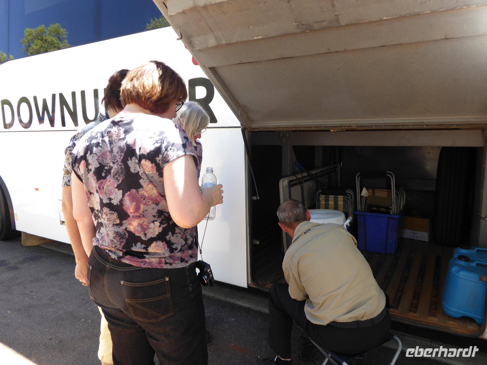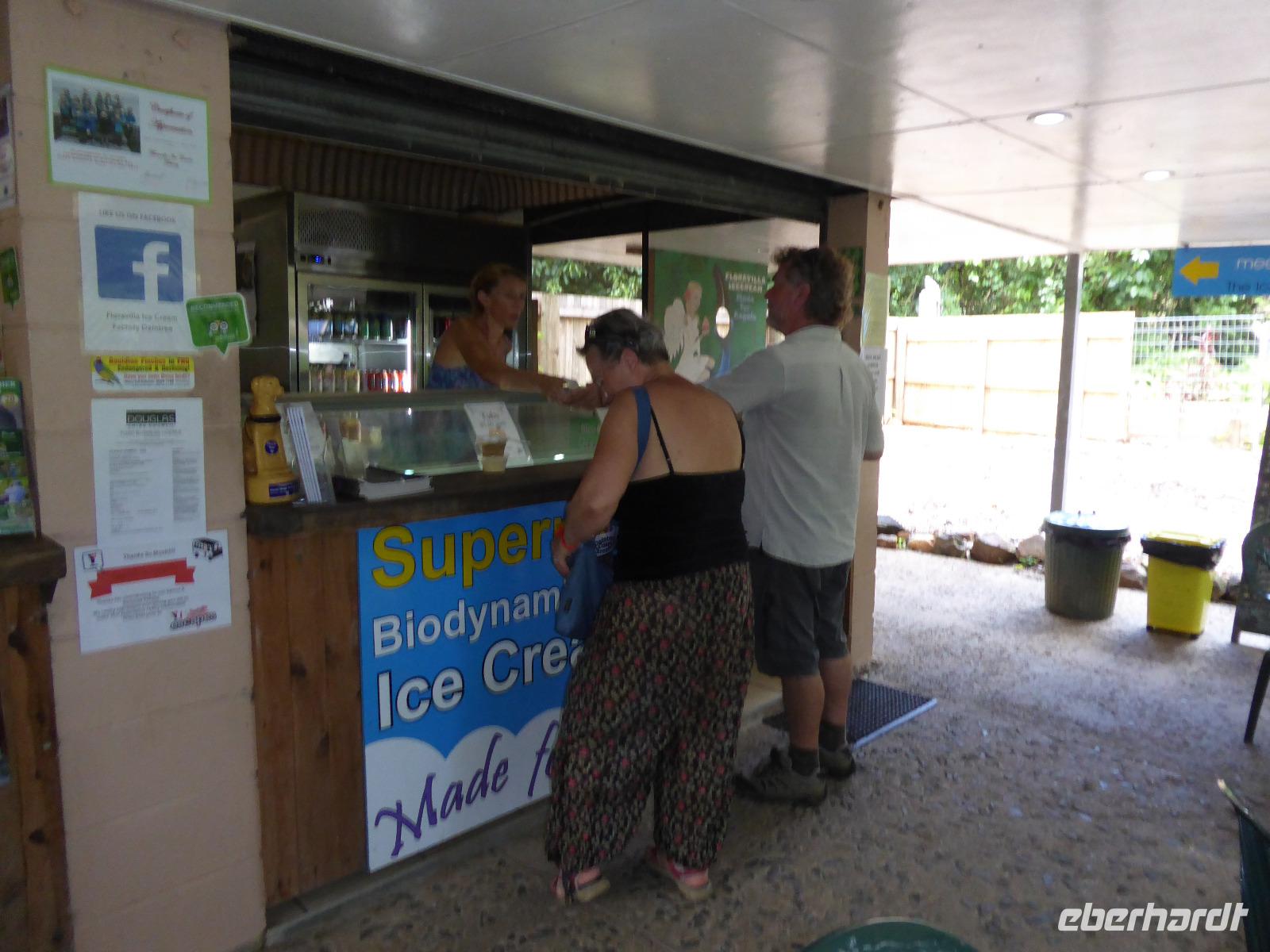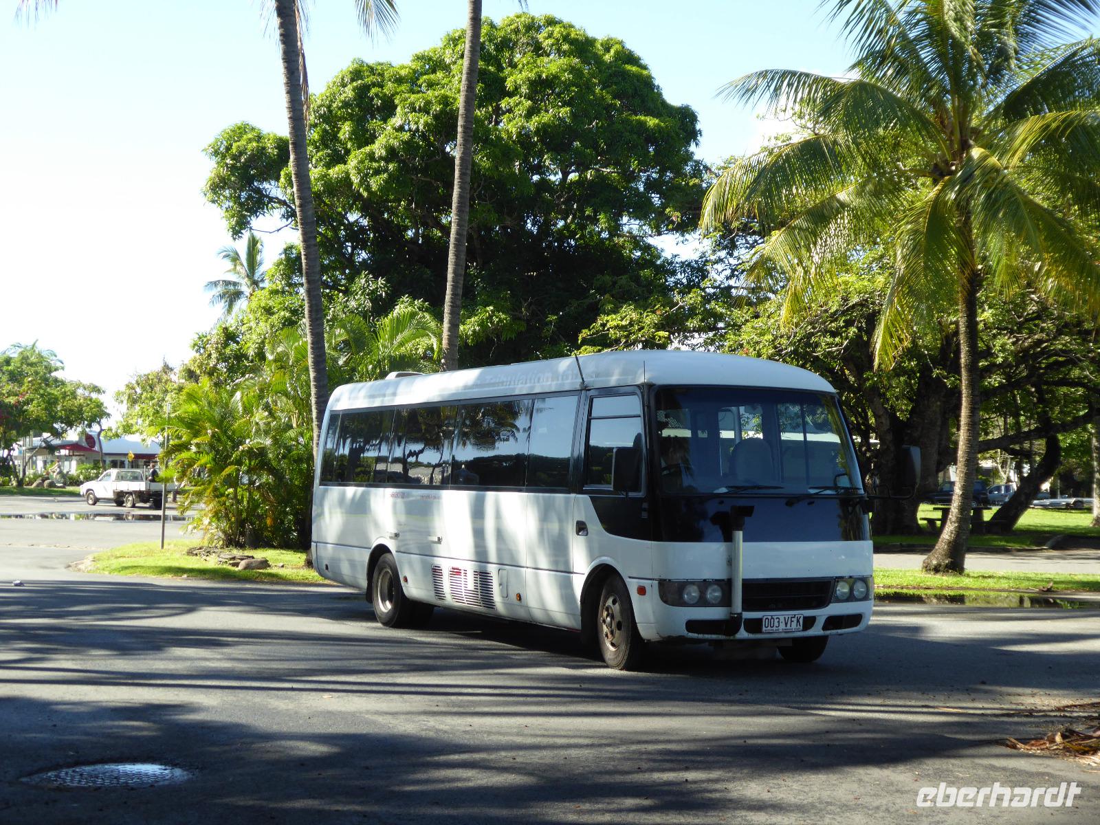 Simone holt uns um 8.30 Uhr mit dem Bus vom Hotel ab. Wir fahren zum Tjapukai Culture Park. Im Eingangsbereich befindet sich eine Ausstellung mit Werken verschiedener Aborigini-Künstler. Darüber hinaus sind hier mehrere Aboriginis unterwegs, die sich freundlich und geduldig für Fotos zur Verfügung stellen. Außer uns sind noch andere Gruppen hier zu Gast. Jede bekommt ihren eigenen Aborigini-Guide. In einem Saal zeigt uns unser Guide, wie die Aboriginis mit Schild und Speer umgehen. Und er erklärt uns an einem großen Gemälde die Entstehung der Welt aus Aborigini-Sicht. Dann werden unsere Gesichter mit Naturfarben bemalt. Wieder und wieder werden wir dazu aufgefordert, Fotos zu machen, was wir natürlich begeistert nutzen. Nun bekommen wir die Gelegenheit, uns im Speerwurf zu probieren. Das ist gar nicht so leicht. Aber unser Guide zeigt es uns geduldig. Bei der nächsten Vorstellung dürfen wir weder filmen noch fotografieren. In einer Ton- und Lichtshow wird noch einmal die Entstehung der Erde dargestellt. Zwei Aborigines führen durch die Show. Nun heißt es wieder: praktische Übung für uns. Wir begeben uns zum Bumerang-Platz. Nachdem uns die Aboriginis die Technik erklärt haben, können wir es selbst ausprobieren. Manchem gelingt es sogar, den Bumerang so zu werfen, dass er wieder am Ausgangspunkt ankommt. Den krönenden Abschluss des Besuches im Kulturzentrum bildet eine Theatershow, bei der auf dem Digeridoo geblasen wird und Geschichten der Aborigines dargestellt werden. Zum Schluss singt das komplette Theater gemeinsam ein Aborigini-Lied und die Gäste aus der ersten Reihe dürfen dazu tanzen. Was für ein Spaß. Jetzt fahren wir mit der Sky-Rail nach Kuranda. In Gondeln, die bis zu sechs Personen fassen, gleiten wir gemütlich über den Regenwald. Unterwegs legen wir zwei Stopps ein. Am Red Peak führt ein Weg durch das grüne Dickicht. Am zweiten Stopp erwartet uns der Ausblick auf die Wasserfälle. In Kuranda angekommen, weist uns Simone den Weg ins Stadtzentrum und wieder zurück zum Bahnhof. Jeder kann hier seinen eigenen Interessen nachgehen - Kunstgalerien besuchen, Souvenirs einkaufen, deutsche Bratwurst essen und/oder den Koala-Park besuchen. Hauptsache, es sind alle pünktlich am Zug. Anderthalb Stunden fahren wir mit dem historischen Zug durch die großartige Landschaft. Am einzigen Fotostopp regnet es gerade aus Kannen.