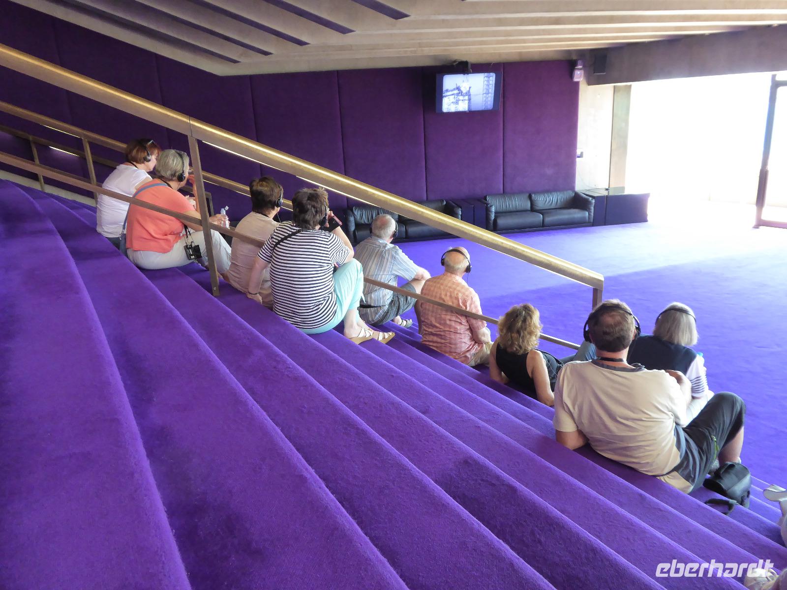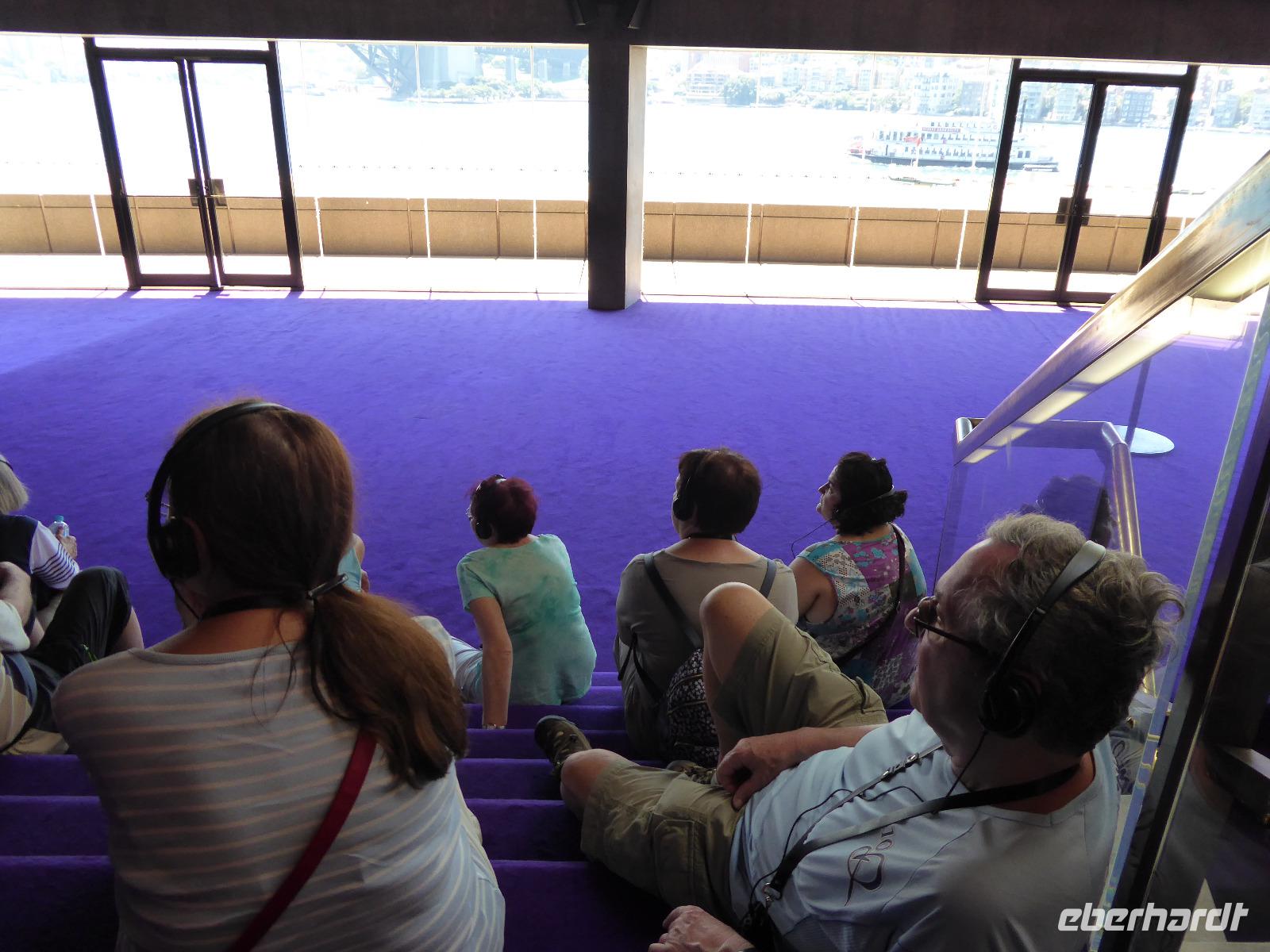 Der Vormittag steht zur freien Verfügung. Genutzt wird er u.a. um Geld und notwendige Kleinigkeiten zu besorgen. Dazu gehören u.a. ein Kamm, Taschentücher und Adapter. Außerdem steht der Besuch des Queen Elisabeth Shopping Centers auf der Wunschliste. Irgendwie scheint dieses Gebäude aus einer anderen Zeit übrig geblieben zu sein, tatsächlich wurde es Mitte des 19. Jahrhunderts gebaut. Mitten zwischen gläsernen Wolkenkratzern steht dieses prunkvolle viktorianische Gebäude. Auch der Innenbereich erinnert an die gute alte Zeit. Überall Säulen, Kuppelchen, eine schmale Wendeltreppe, Gold und Glas. Teure Läden, an deren Fenstern wir uns die Nase platt drücken können. Zwei große mechanische Uhren zeigen Geschichten aus dem englischen Königreich. Wundervoll! Der kurze Spaziergang zum Opernhaus führt uns unter anderem durch den Botanischen Garten, was vielleicht ganz schön wäre, wenn die Sonne nicht so brennen und die Ulli nicht so rennen würde. Doch bald ist es geschafft, wir erreichen die Oper. Hier werden wir von Ulli an einen interne Gästeführerin übergeben, die uns durch das beeindruckende Opernhaus führt und uns die spannende Geschichte des Hauses erzählt. 1957 hatte der dänische Architekt Jorn Utzorn sich mit einem groben Entwurf an einem Wettbewerb zur Gestaltung der Oper beteiligt und diesen gewonnen. Trotzdem wurde er nicht glücklich damit. Die ursprünglich veranlagten 3,5 Millionen Pfund Investition stiegen auf 50 Millionen und der Bau dauerte acht Jahre länger als geplant. Nachdem Utzorn von der Regierung die Gelder gesperrt worden waren, verließ er Australien im Zorn und erlebte die Fertigstellung seines Gebäudes nur aus der Ferne. Heute ist die Oper das Wahrzeichen von Sydney und eines der größten Kulturzentren der Welt. Nach der Besichtigung heißt es wieder, Füße in die Hand und schnell zum Hafen. Dieses Mal betrachten wir die Stadt von Wasserseite aus. Es gibt Kaffee, Tee und Plätzchen und Fotos satt. Im Anschluss ist noch Zeit für eigene Unternehmungen. Der von Ulli empfohlene Pub auf einem Dach ist toll aber voll. Und so landen wir im Hofbräuhaus. Was solls, das Bier schmeckt hier auch. Zum Abendessen kehren wir in Nicks Seafood Restaurant, dass sich direkt am Hafen befindet, ein.