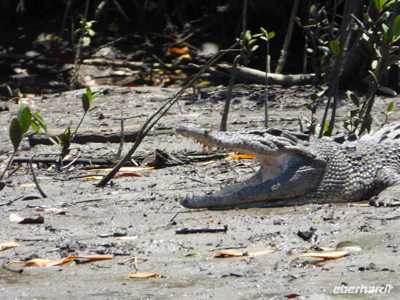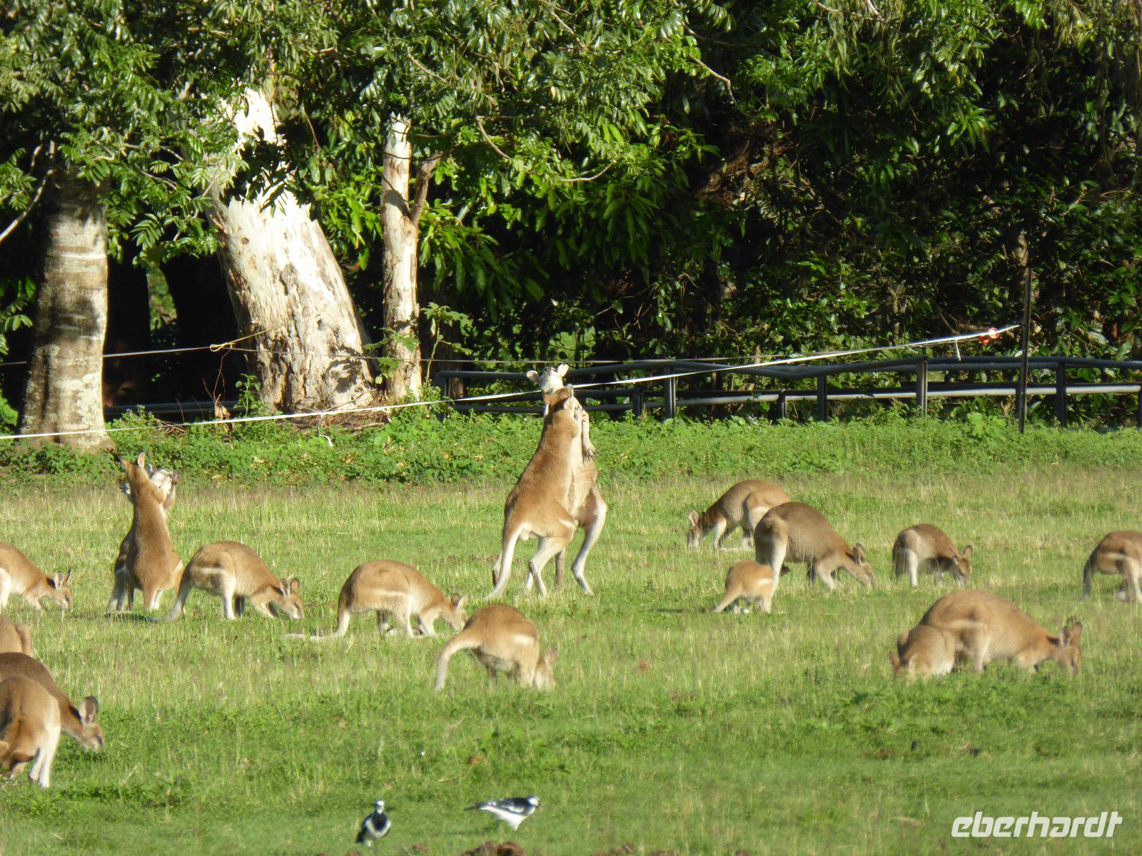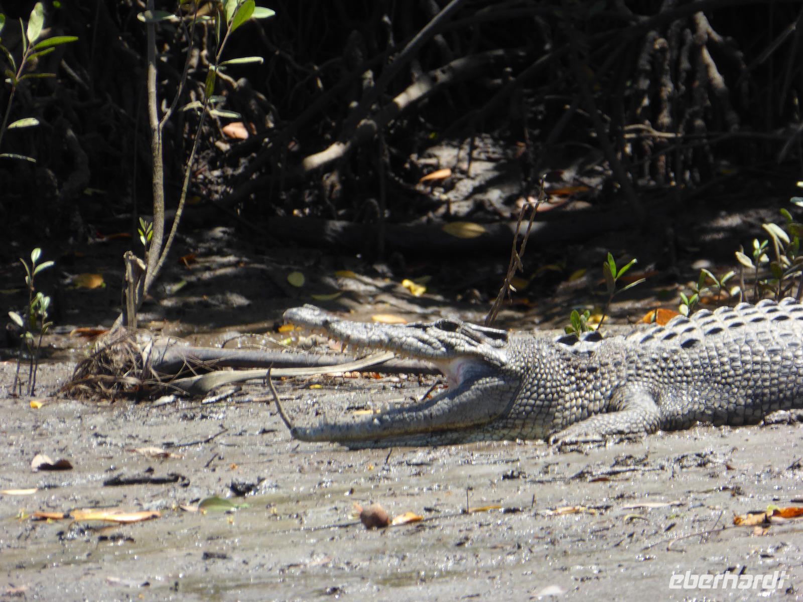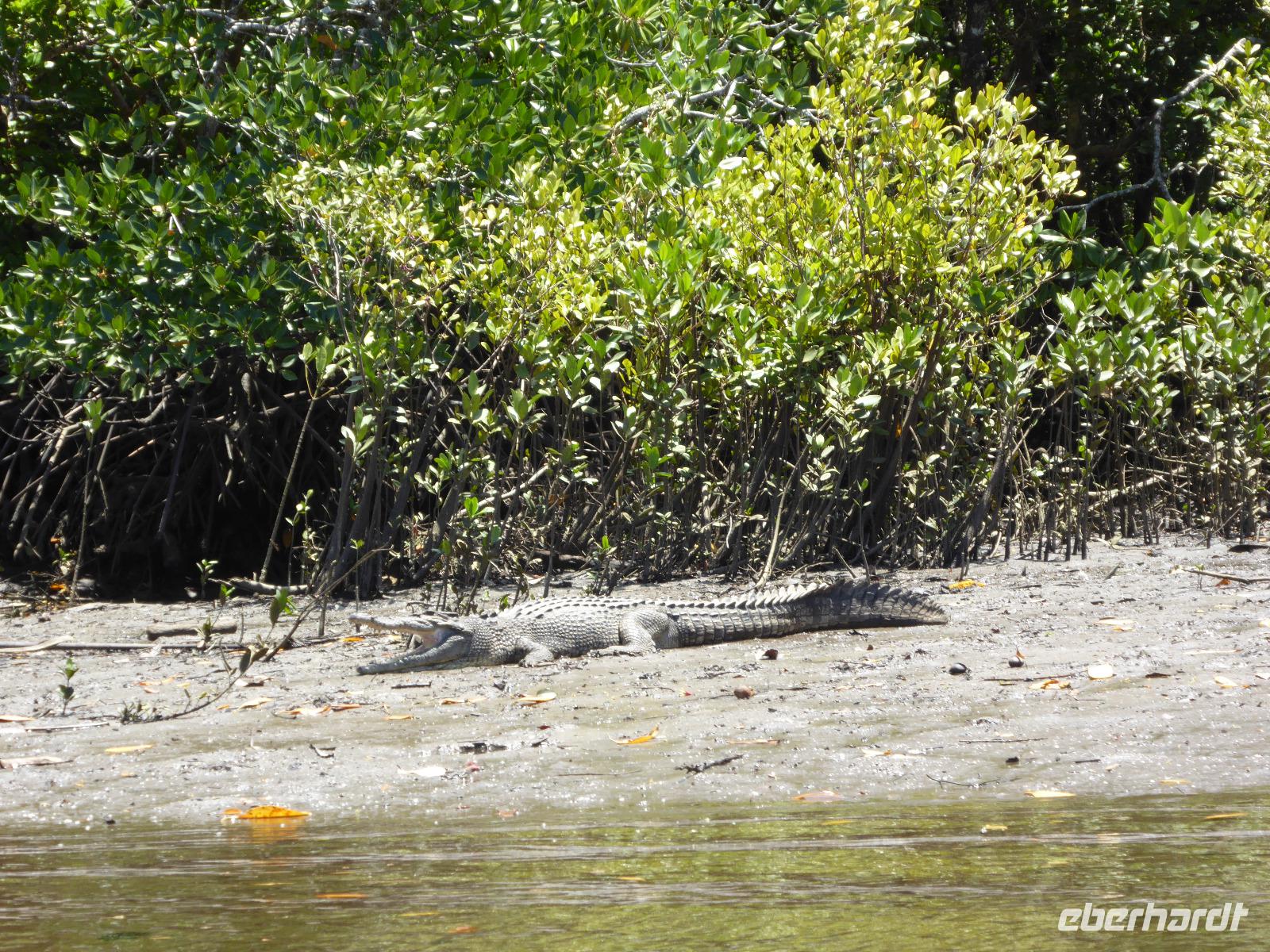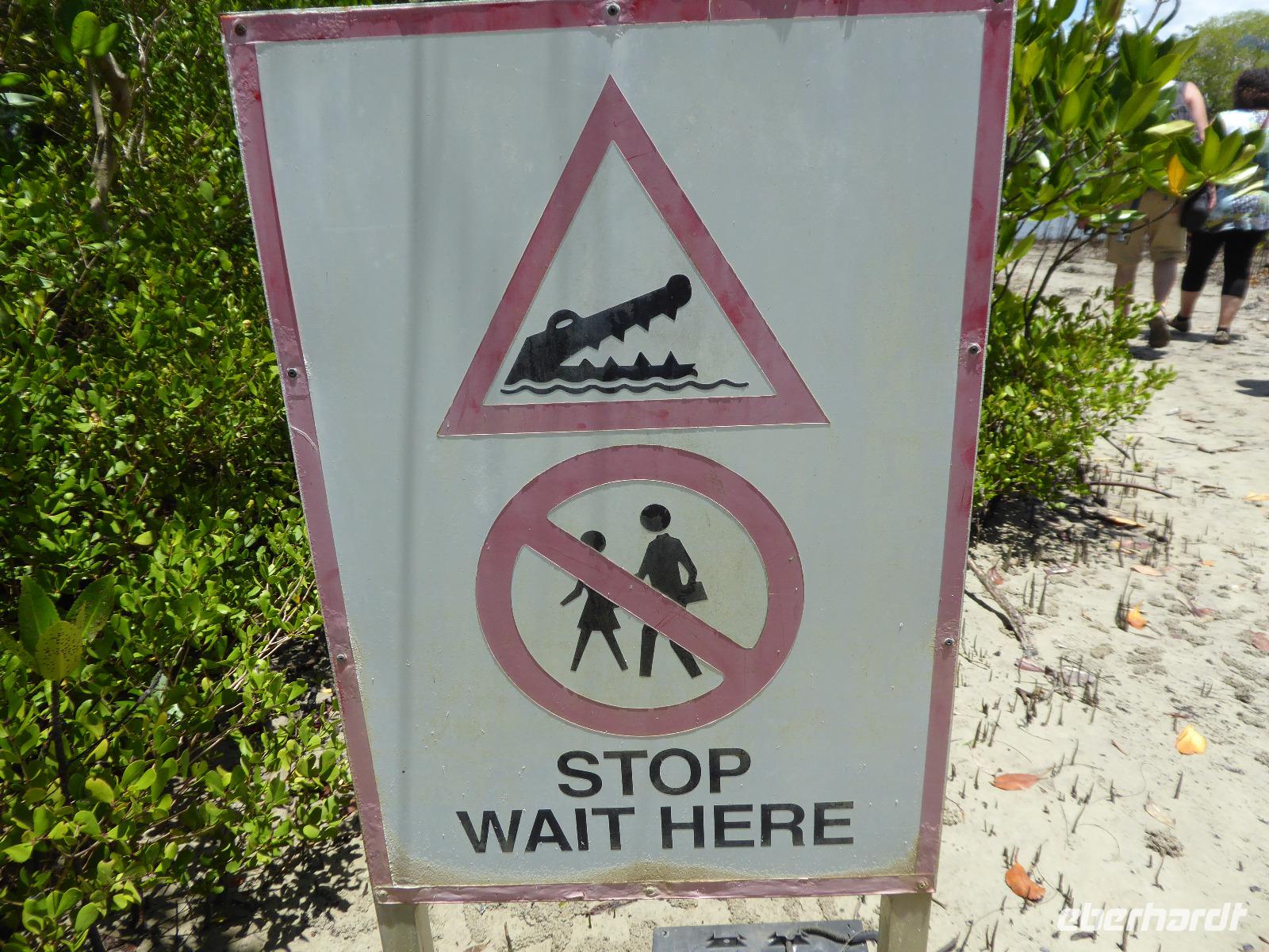 Heute heißt es, Badesachen einpacken, denn am Nachmittag treffen wir auf eine Badestelle mitten im australischen Regenwald, wo eventuell die Möglichkeit besteht, ins kühle Nass zu springen. Wir starten bereits um halb acht, denn wir haben einen weiten Weg vor uns. Unser Guide Wolfgang ist heute auch unser Fahrer. Er lebt bereits seit 1989 in Australien und hat hier einiges von der Entwicklung des Landes sowie des Tourismus mitbekommen. Wir fahren zunächst auf dem Highway Nr. 1 , bevor wir Richtung Daintree Nationalpark abbiegen. Nun führt uns der Weg entlang einer der schönsten Straßen in Queensland. Links von uns reicht der Regenwald bis an die Straße und rechts von uns ist das Meer. Traumhafte Aussichten für die, die sich gerade nicht in den schönsten Träumen befinden. Die Müdigkeit nagt immer wieder an uns. Vorbei geht es an großen Zuckerrohrplantagen, über die Wolfgang viel zu berichten weiß. In Port Douglas legen wir einen ersten Stopp ein, zum Füße vertreten, fotografieren und zum Besuch der kleinen Kirche. Anstelle eines Altars gibt es hier ein großes Fenster mit Blick auf das Meer und den Strand. Gute zwei Stunden sind wir unterwegs, bis wir den Daintree River erreichen. Mit einer kleinen Fähre überqueren wir den Fluss. Ein Schild warnt davor, im Fluss zu baden - hier gibt es Krokodile. Am Walu Wugirriga halten wir zum nächsten Fotostopp. Wir sind jetzt mitten im australischen Regenwald - einem der ältesten Wälder der Welt. Tropische Bäume und riesige Farne zeigen sich im satten Grün. Eine Spinne hat ihr Netz gewoben und ein Grashüpfer macht es sich gemütlich. Der gefürchtete Helmkasuar zeigt sich jedoch nicht. Nur Schilder am Straßenrand lassen darauf schließen, dass sich dieser Vogel hier in der Gegend aufhält. Auch vor Quallen wird gewarnt. Zurzeit sollten wir hier lieber nicht im Meer baden, denn hier treiben bissige Würfelquallen ihr Unwesen, eine Begegnung mit diesen, ist auf jeden Fall schmerzhaft, im schlimmsten Fall sogar tödlich. So genießen wir den traumhaften Strand am türkisblauen Meer bei einem Spaziergang und ohne ins Wasser zu gehen. Die gesammelten Muscheln werden fotografiert und dann an Ort und Stelle gelassen. Im Daintree Flavours Bistro nehmen wir unser Mittagessen ein. Wolfgang hat uns im Bus eine Speisekarte gegeben und wir konnten unter verschiedenen Fleischgerichten, Salaten oder Nudeln wählen. Das Essen ist bereits fertig als wir kommen und wir lassen es uns schmecken. Jetzt geht es zur Krokodilfahrt auf dem Daintree River. Unser Boot durchquert eine traumhafte Flusslandschaft. An den Ufern wachsen Mangroven und andere Regenwaldbäume. Der Himmel ist wieder strahlend blau mit kleinen Schäfchenwolken geschmückt. Und da ist es auch schon - das erste Krokodil. Ein kleines, dass kaum zu sehen ist, da seine Farbe so grau ist wie die Steine, auf denen es sich gemütlich gemacht hat. Wir fahren weiter und halten Ausschau nach Krokodilen. Am Wendepunkt dann die Überraschung, hier ist ein wirklich großes Krokodil zu bewundern, mindestens drei Meter lang. Zugegebener Weise sieht es ein bisschen drapiert aus, aber es öffnet und schließt das Maul, was der Beweis ist, dass es echt ist. Und - nein - Wolfgang hatte keine Fernbedienung in der Tasche, mit der er das gesteuert hat. Nun geht es zurück, aber scharfe Augen entdecken noch ein weiteres Krokodilchen im Wasser schwimmend. Naja, drei Stück, das ist doch gar nicht so eine schlechte Ausbeute. Im Anschluss gehen wir bei Angela vorbei, die in der Floravilla bio-dynamisches Eis herstellt. Über fünfzig Sorten hat sie im Angebot. Ich wähle die Urwaldvariante Daintree Rainforrest und finde beim Essen ein paar echte Blättchen im Eis. Lecker ist es allemal. Wir besuchen das Mossman Gorge Visitor Center. Ein Aborigini, der im Visitor Center arbeitet, zeigt uns, wie aus Regenwaldpflanzen Seife gemacht wird, wie Naturfarben entstehen und zeigt uns Speere und Schilder seiner Aborigini-Gruppe. Wir verlassen ihn und fahren mit einem Shuttlebus ca. 2,5 Kilometer bis zur Mossmanschlucht. Ein paar Stege führen durch den Regenwald bis hinunter an den Fluss. Hier sind schon einige junge Leute, die sich köstlich im Wasser amüsieren. In unserer Gruppe hält sich die Badelust in Grenzen und so schauen die meisten dem Treiben nur zu. Eine dreiviertel Stunde später sitzen wir wieder im Shuttlebus und fahren zurück. Der obligatorische Souvenirshop wird besucht, dann machen wir uns auf den Rückweg. Wir halten unterwegs an einem traumhaften Aussichtspunkt und an einer Wiese, auf der sich viele freilebende Kängurus tummeln. Ein erlebnisreicher Tag neigt sich dem Ende zu. Zum Abschluss gibt es ein köstliches Buffet im Hotel, bevor wir unsere Koffer packen, denn morgen verlassen wir Australien.