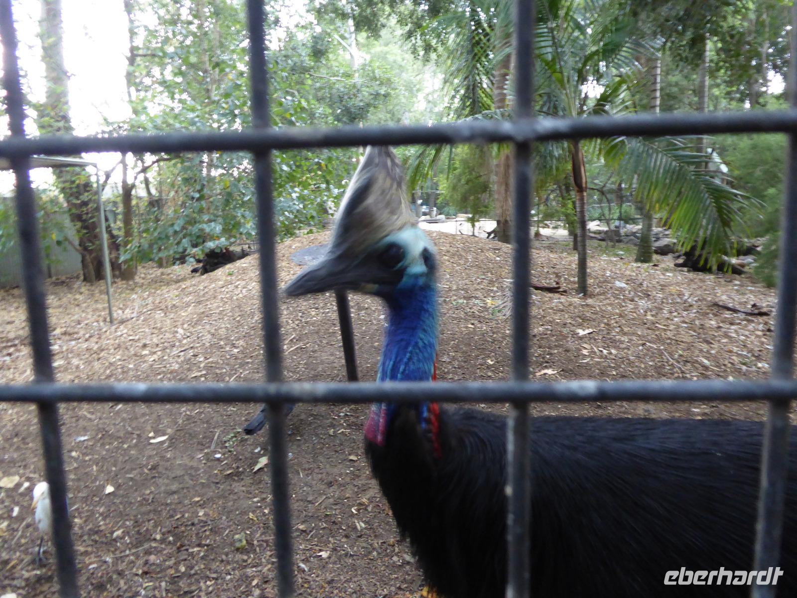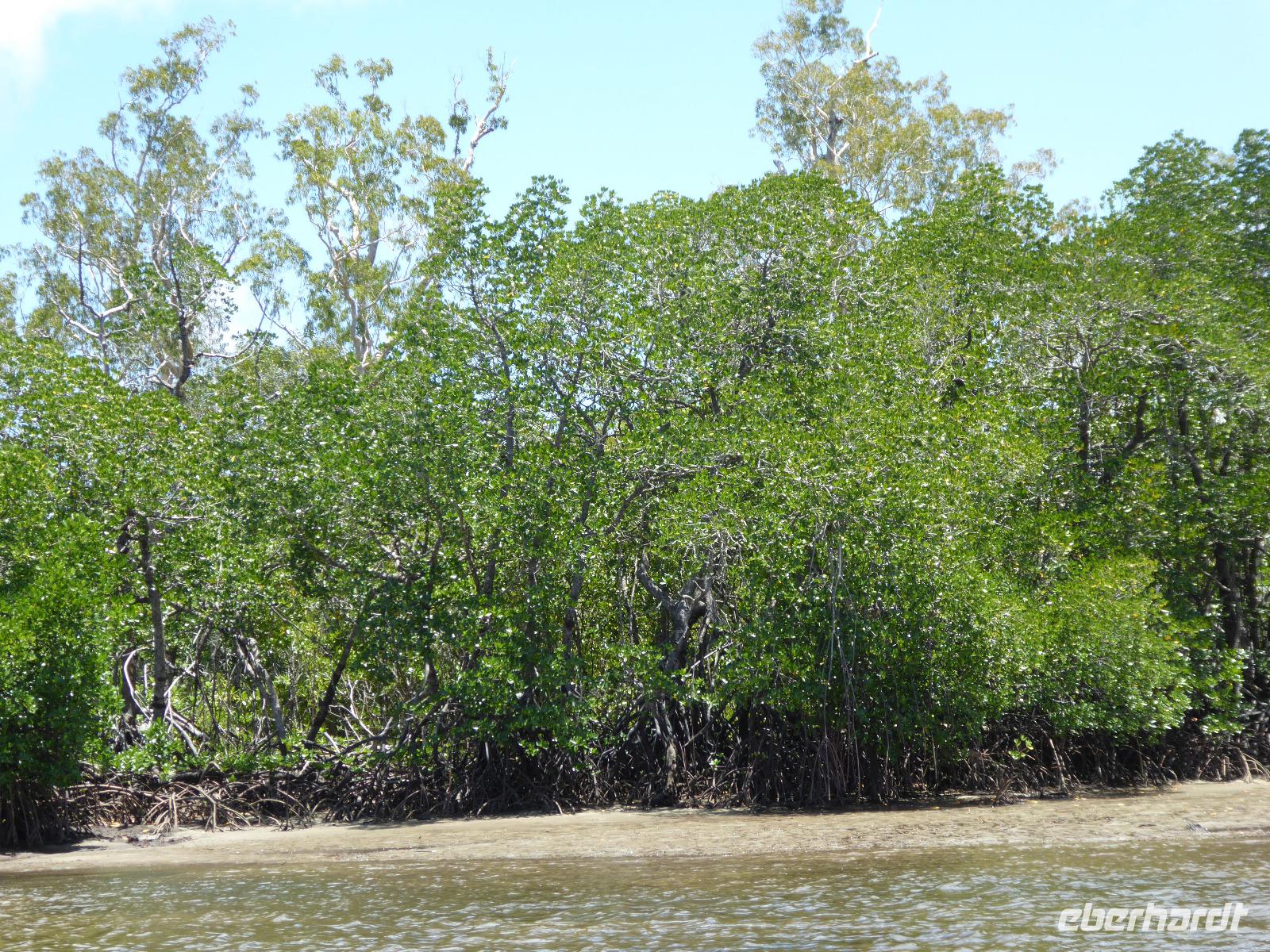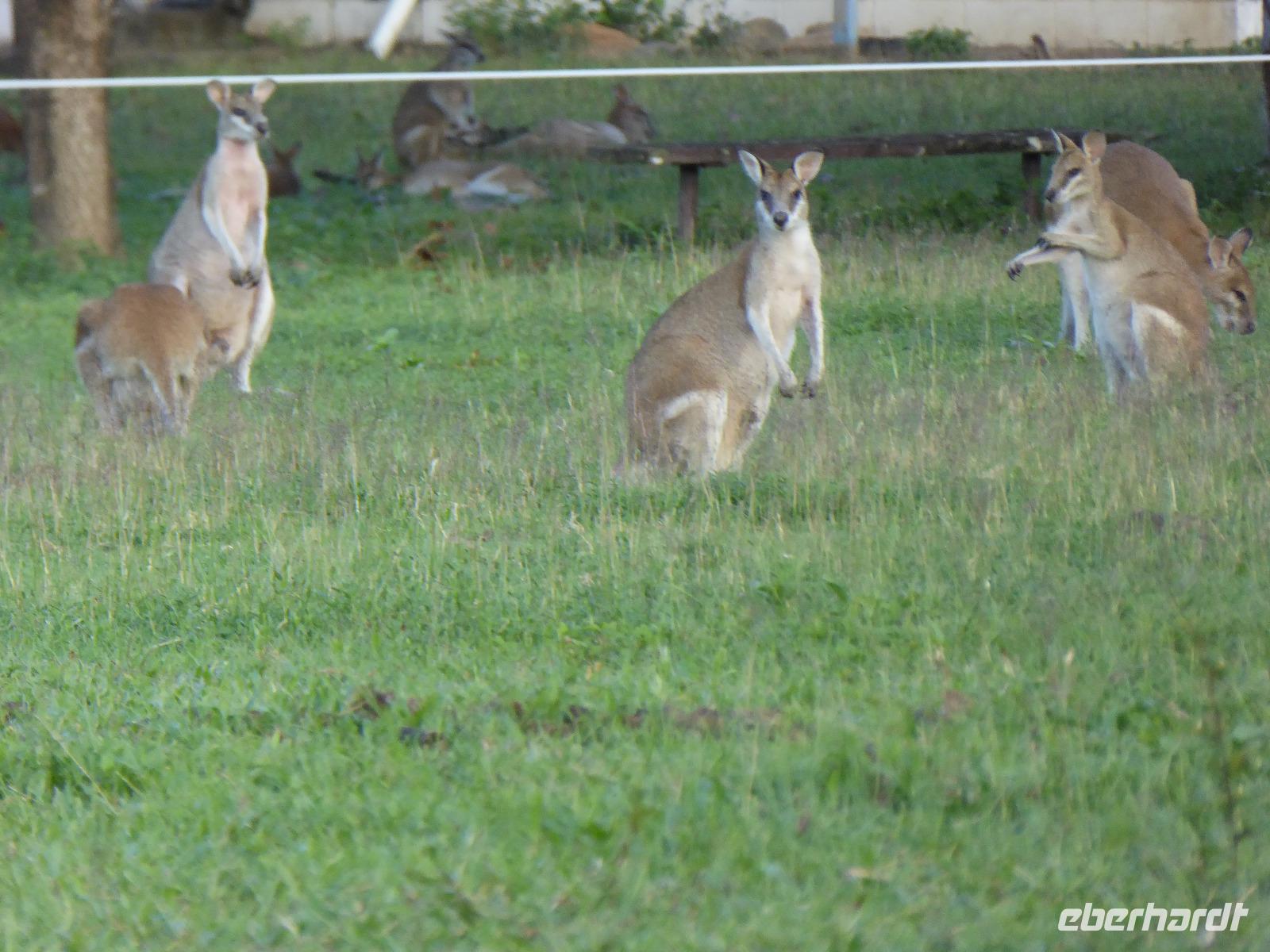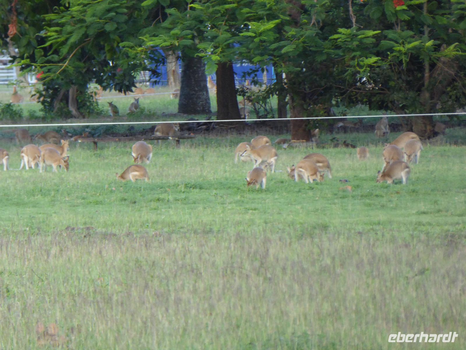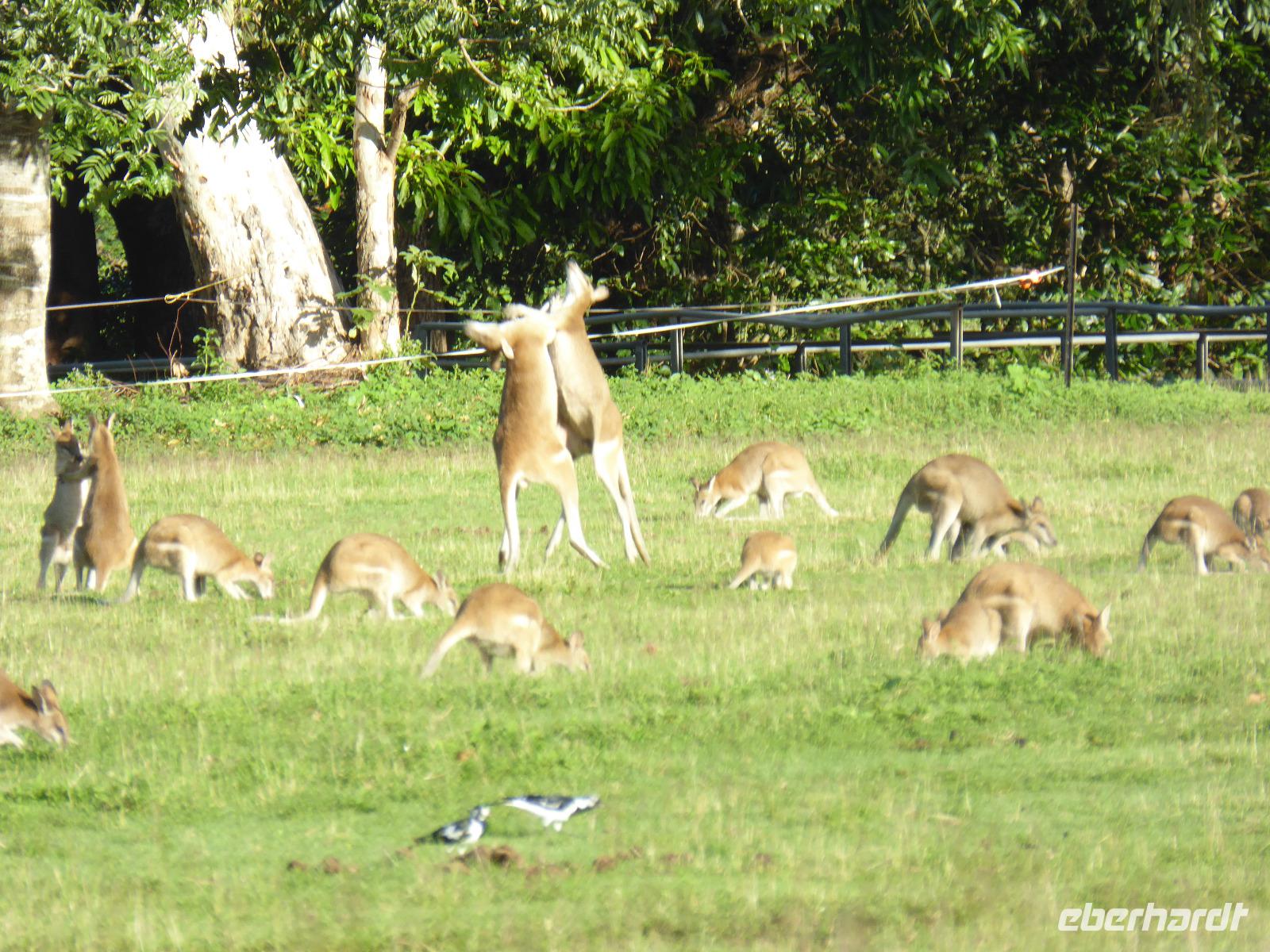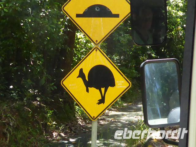 Heute heißt es, Badesachen einpacken, denn am Nachmittag treffen wir auf eine Badestelle mitten im australischen Regenwald, wo eventuell die Möglichkeit besteht, ins kühle Nass zu springen. Wir starten bereits um halb acht, denn wir haben einen weiten Weg vor uns. Unser Guide Wolfgang ist heute auch unser Fahrer. Er lebt bereits seit 1989 in Australien und hat hier einiges von der Entwicklung des Landes sowie des Tourismus mitbekommen. Wir fahren zunächst auf dem Highway Nr. 1 , bevor wir Richtung Daintree Nationalpark abbiegen. Nun führt uns der Weg entlang einer der schönsten Straßen in Queensland. Links von uns reicht der Regenwald bis an die Straße und rechts von uns ist das Meer. Traumhafte Aussichten für die, die sich gerade nicht in den schönsten Träumen befinden. Die Müdigkeit nagt immer wieder an uns. Vorbei geht es an großen Zuckerrohrplantagen, über die Wolfgang viel zu berichten weiß. In Port Douglas legen wir einen ersten Stopp ein, zum Füße vertreten, fotografieren und zum Besuch der kleinen Kirche. Anstelle eines Altars gibt es hier ein großes Fenster mit Blick auf das Meer und den Strand. Gute zwei Stunden sind wir unterwegs, bis wir den Daintree River erreichen. Mit einer kleinen Fähre überqueren wir den Fluss. Ein Schild warnt davor, im Fluss zu baden - hier gibt es Krokodile. Am Walu Wugirriga halten wir zum nächsten Fotostopp. Wir sind jetzt mitten im australischen Regenwald - einem der ältesten Wälder der Welt. Tropische Bäume und riesige Farne zeigen sich im satten Grün. Eine Spinne hat ihr Netz gewoben und ein Grashüpfer macht es sich gemütlich. Der gefürchtete Helmkasuar zeigt sich jedoch nicht. Nur Schilder am Straßenrand lassen darauf schließen, dass sich dieser Vogel hier in der Gegend aufhält. Auch vor Quallen wird gewarnt. Zurzeit sollten wir hier lieber nicht im Meer baden, denn hier treiben bissige Würfelquallen ihr Unwesen, eine Begegnung mit diesen, ist auf jeden Fall schmerzhaft, im schlimmsten Fall sogar tödlich. So genießen wir den traumhaften Strand am türkisblauen Meer bei einem Spaziergang und ohne ins Wasser zu gehen. Die gesammelten Muscheln werden fotografiert und dann an Ort und Stelle gelassen. Im Daintree Flavours Bistro nehmen wir unser Mittagessen ein. Wolfgang hat uns im Bus eine Speisekarte gegeben und wir konnten unter verschiedenen Fleischgerichten, Salaten oder Nudeln wählen. Das Essen ist bereits fertig als wir kommen und wir lassen es uns schmecken. Jetzt geht es zur Krokodilfahrt auf dem Daintree River. Unser Boot durchquert eine traumhafte Flusslandschaft. An den Ufern wachsen Mangroven und andere Regenwaldbäume. Der Himmel ist wieder strahlend blau mit kleinen Schäfchenwolken geschmückt. Und da ist es auch schon - das erste Krokodil. Ein kleines, dass kaum zu sehen ist, da seine Farbe so grau ist wie die Steine, auf denen es sich gemütlich gemacht hat. Wir fahren weiter und halten Ausschau nach Krokodilen. Am Wendepunkt dann die Überraschung, hier ist ein wirklich großes Krokodil zu bewundern, mindestens drei Meter lang. Zugegebener Weise sieht es ein bisschen drapiert aus, aber es öffnet und schließt das Maul, was der Beweis ist, dass es echt ist. Und - nein - Wolfgang hatte keine Fernbedienung in der Tasche, mit der er das gesteuert hat. Nun geht es zurück, aber scharfe Augen entdecken noch ein weiteres Krokodilchen im Wasser schwimmend. Naja, drei Stück, das ist doch gar nicht so eine schlechte Ausbeute. Im Anschluss gehen wir bei Angela vorbei, die in der Floravilla bio-dynamisches Eis herstellt. Über fünfzig Sorten hat sie im Angebot. Ich wähle die Urwaldvariante Daintree Rainforrest und finde beim Essen ein paar echte Blättchen im Eis. Lecker ist es allemal. Wir besuchen das Mossman Gorge Visitor Center. Ein Aborigini, der im Visitor Center arbeitet, zeigt uns, wie aus Regenwaldpflanzen Seife gemacht wird, wie Naturfarben entstehen und zeigt uns Speere und Schilder seiner Aborigini-Gruppe. Wir verlassen ihn und fahren mit einem Shuttlebus ca. 2,5 Kilometer bis zur Mossmanschlucht. Ein paar Stege führen durch den Regenwald bis hinunter an den Fluss. Hier sind schon einige junge Leute, die sich köstlich im Wasser amüsieren. In unserer Gruppe hält sich die Badelust in Grenzen und so schauen die meisten dem Treiben nur zu. Eine dreiviertel Stunde später sitzen wir wieder im Shuttlebus und fahren zurück. Der obligatorische Souvenirshop wird besucht, dann machen wir uns auf den Rückweg. Wir halten unterwegs an einem traumhaften Aussichtspunkt und an einer Wiese, auf der sich viele freilebende Kängurus tummeln. Ein erlebnisreicher Tag neigt sich dem Ende zu. Zum Abschluss gibt es ein köstliches Buffet im Hotel, bevor wir unsere Koffer packen, denn morgen verlassen wir Australien.