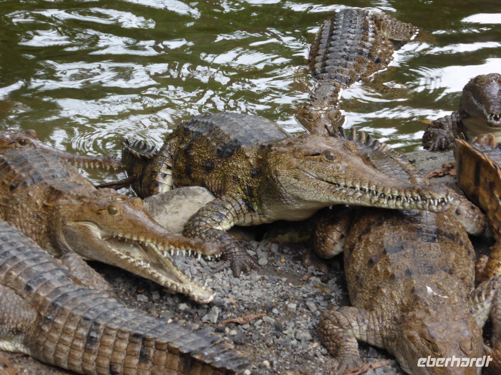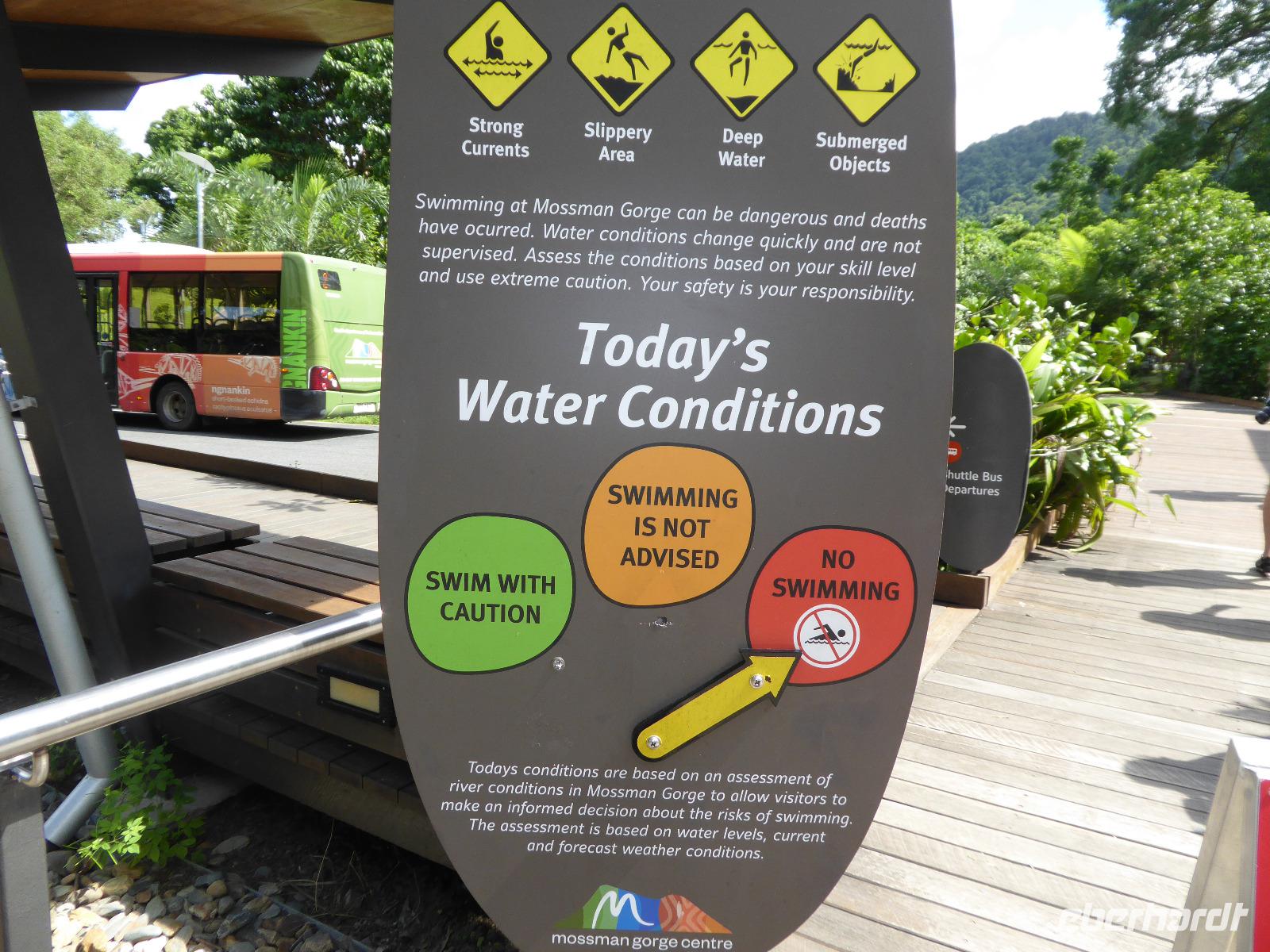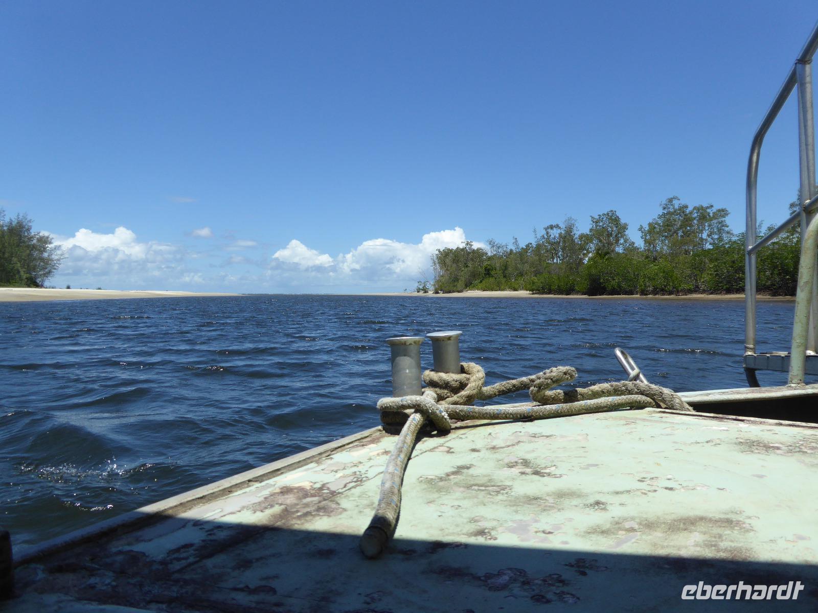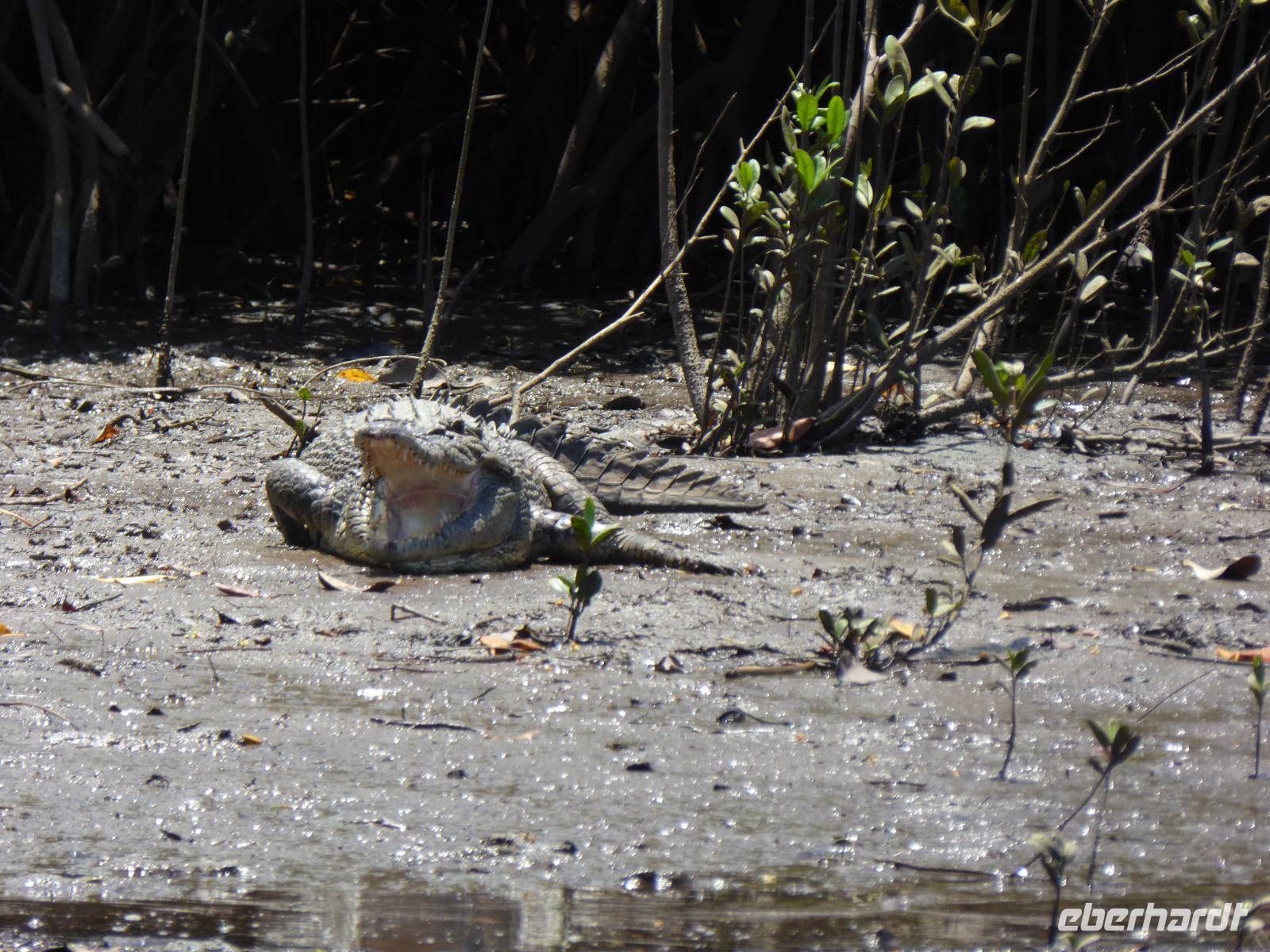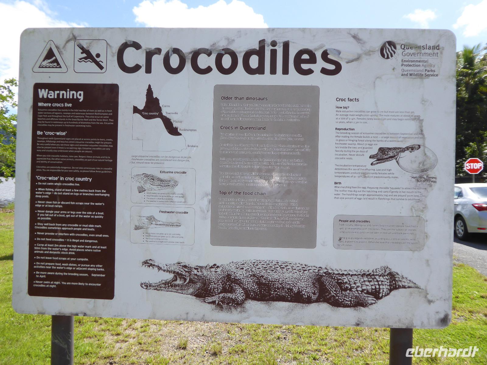 Heute heißt es, Badesachen einpacken, denn am Nachmittag treffen wir auf eine Badestelle mitten im australischen Regenwald, wo eventuell die Möglichkeit besteht, ins kühle Nass zu springen. Wir starten bereits um halb acht, denn wir haben einen weiten Weg vor uns. Unser Guide Wolfgang ist heute auch unser Fahrer. Er lebt bereits seit 1989 in Australien und hat hier einiges von der Entwicklung des Landes sowie des Tourismus mitbekommen. Wir fahren zunächst auf dem Highway Nr. 1 , bevor wir Richtung Daintree Nationalpark abbiegen. Nun führt uns der Weg entlang einer der schönsten Straßen in Queensland. Links von uns reicht der Regenwald bis an die Straße und rechts von uns ist das Meer. Traumhafte Aussichten für die, die sich gerade nicht in den schönsten Träumen befinden. Die Müdigkeit nagt immer wieder an uns. Vorbei geht es an großen Zuckerrohrplantagen, über die Wolfgang viel zu berichten weiß. In Port Douglas legen wir einen ersten Stopp ein, zum Füße vertreten, fotografieren und zum Besuch der kleinen Kirche. Anstelle eines Altars gibt es hier ein großes Fenster mit Blick auf das Meer und den Strand. Gute zwei Stunden sind wir unterwegs, bis wir den Daintree River erreichen. Mit einer kleinen Fähre überqueren wir den Fluss. Ein Schild warnt davor, im Fluss zu baden - hier gibt es Krokodile. Am Walu Wugirriga halten wir zum nächsten Fotostopp. Wir sind jetzt mitten im australischen Regenwald - einem der ältesten Wälder der Welt. Tropische Bäume und riesige Farne zeigen sich im satten Grün. Eine Spinne hat ihr Netz gewoben und ein Grashüpfer macht es sich gemütlich. Der gefürchtete Helmkasuar zeigt sich jedoch nicht. Nur Schilder am Straßenrand lassen darauf schließen, dass sich dieser Vogel hier in der Gegend aufhält. Auch vor Quallen wird gewarnt. Zurzeit sollten wir hier lieber nicht im Meer baden, denn hier treiben bissige Würfelquallen ihr Unwesen, eine Begegnung mit diesen, ist auf jeden Fall schmerzhaft, im schlimmsten Fall sogar tödlich. So genießen wir den traumhaften Strand am türkisblauen Meer bei einem Spaziergang und ohne ins Wasser zu gehen. Die gesammelten Muscheln werden fotografiert und dann an Ort und Stelle gelassen. Im Daintree Flavours Bistro nehmen wir unser Mittagessen ein. Wolfgang hat uns im Bus eine Speisekarte gegeben und wir konnten unter verschiedenen Fleischgerichten, Salaten oder Nudeln wählen. Das Essen ist bereits fertig als wir kommen und wir lassen es uns schmecken. Jetzt geht es zur Krokodilfahrt auf dem Daintree River. Unser Boot durchquert eine traumhafte Flusslandschaft. An den Ufern wachsen Mangroven und andere Regenwaldbäume. Der Himmel ist wieder strahlend blau mit kleinen Schäfchenwolken geschmückt. Und da ist es auch schon - das erste Krokodil. Ein kleines, dass kaum zu sehen ist, da seine Farbe so grau ist wie die Steine, auf denen es sich gemütlich gemacht hat. Wir fahren weiter und halten Ausschau nach Krokodilen. Am Wendepunkt dann die Überraschung, hier ist ein wirklich großes Krokodil zu bewundern, mindestens drei Meter lang. Zugegebener Weise sieht es ein bisschen drapiert aus, aber es öffnet und schließt das Maul, was der Beweis ist, dass es echt ist. Und - nein - Wolfgang hatte keine Fernbedienung in der Tasche, mit der er das gesteuert hat. Nun geht es zurück, aber scharfe Augen entdecken noch ein weiteres Krokodilchen im Wasser schwimmend. Naja, drei Stück, das ist doch gar nicht so eine schlechte Ausbeute. Im Anschluss gehen wir bei Angela vorbei, die in der Floravilla bio-dynamisches Eis herstellt. Über fünfzig Sorten hat sie im Angebot. Ich wähle die Urwaldvariante Daintree Rainforrest und finde beim Essen ein paar echte Blättchen im Eis. Lecker ist es allemal. Wir besuchen das Mossman Gorge Visitor Center. Ein Aborigini, der im Visitor Center arbeitet, zeigt uns, wie aus Regenwaldpflanzen Seife gemacht wird, wie Naturfarben entstehen und zeigt uns Speere und Schilder seiner Aborigini-Gruppe. Wir verlassen ihn und fahren mit einem Shuttlebus ca. 2,5 Kilometer bis zur Mossmanschlucht. Ein paar Stege führen durch den Regenwald bis hinunter an den Fluss. Hier sind schon einige junge Leute, die sich köstlich im Wasser amüsieren. In unserer Gruppe hält sich die Badelust in Grenzen und so schauen die meisten dem Treiben nur zu. Eine dreiviertel Stunde später sitzen wir wieder im Shuttlebus und fahren zurück. Der obligatorische Souvenirshop wird besucht, dann machen wir uns auf den Rückweg. Wir halten unterwegs an einem traumhaften Aussichtspunkt und an einer Wiese, auf der sich viele freilebende Kängurus tummeln. Ein erlebnisreicher Tag neigt sich dem Ende zu. Zum Abschluss gibt es ein köstliches Buffet im Hotel, bevor wir unsere Koffer packen, denn morgen verlassen wir Australien.