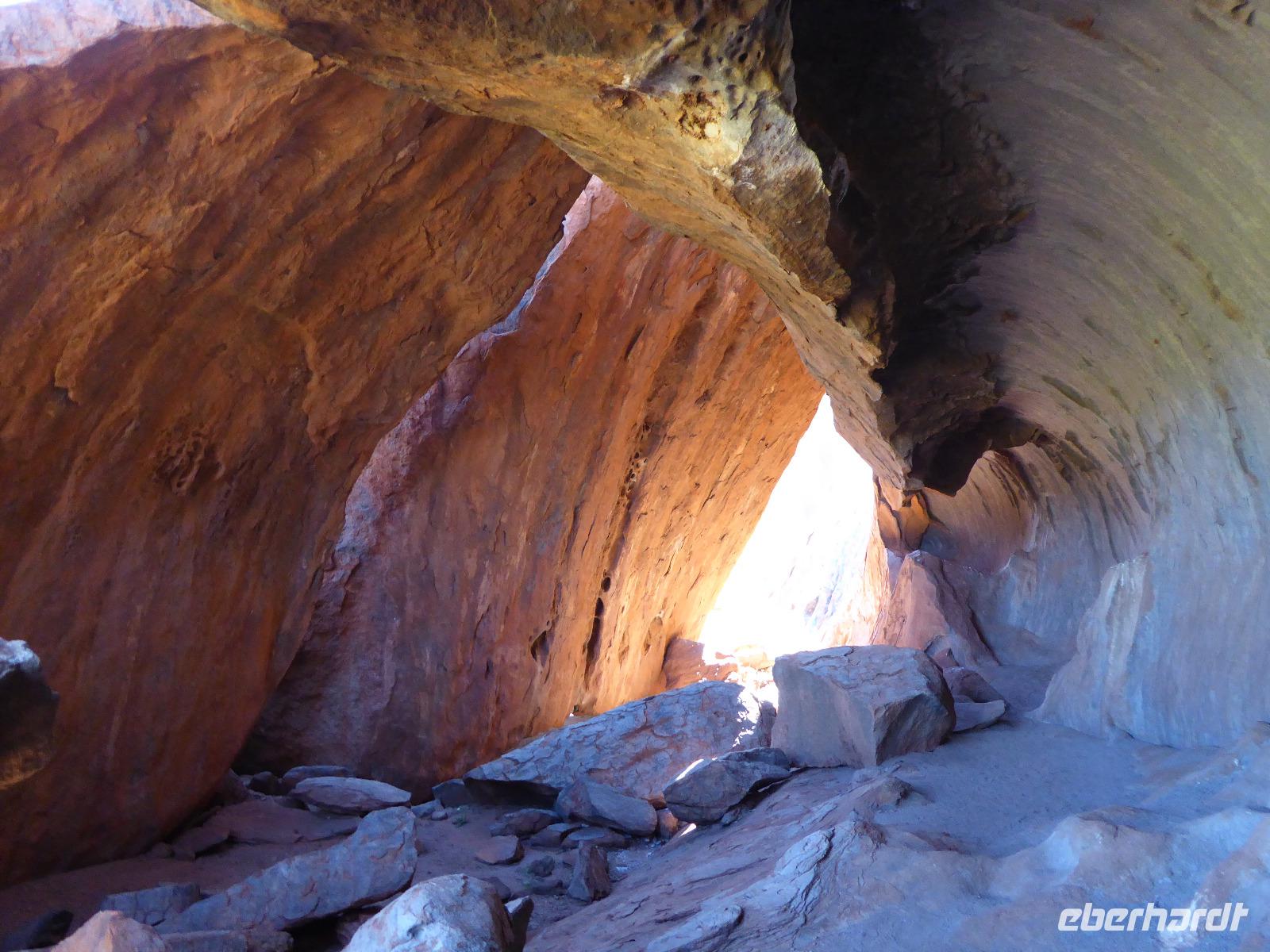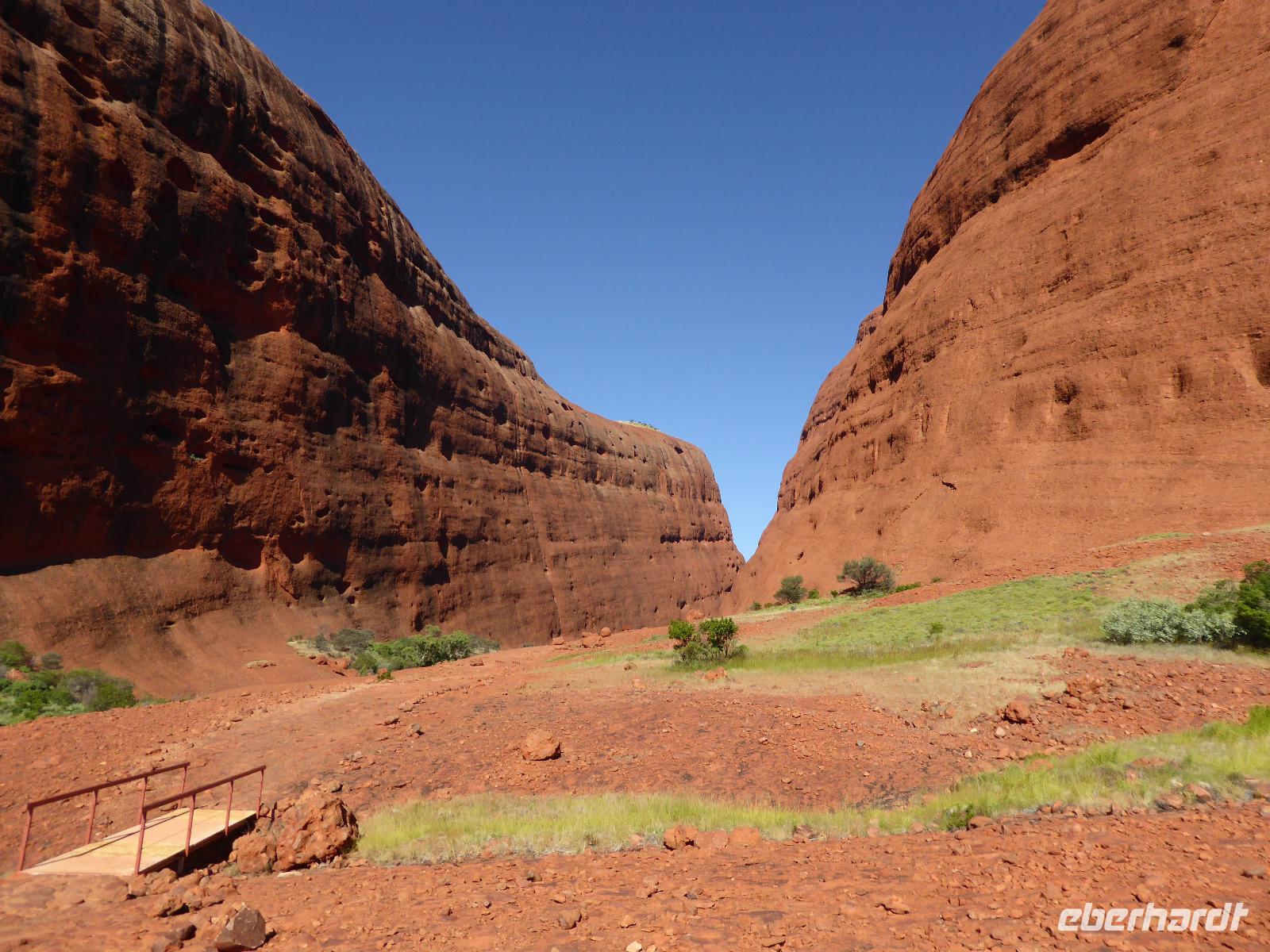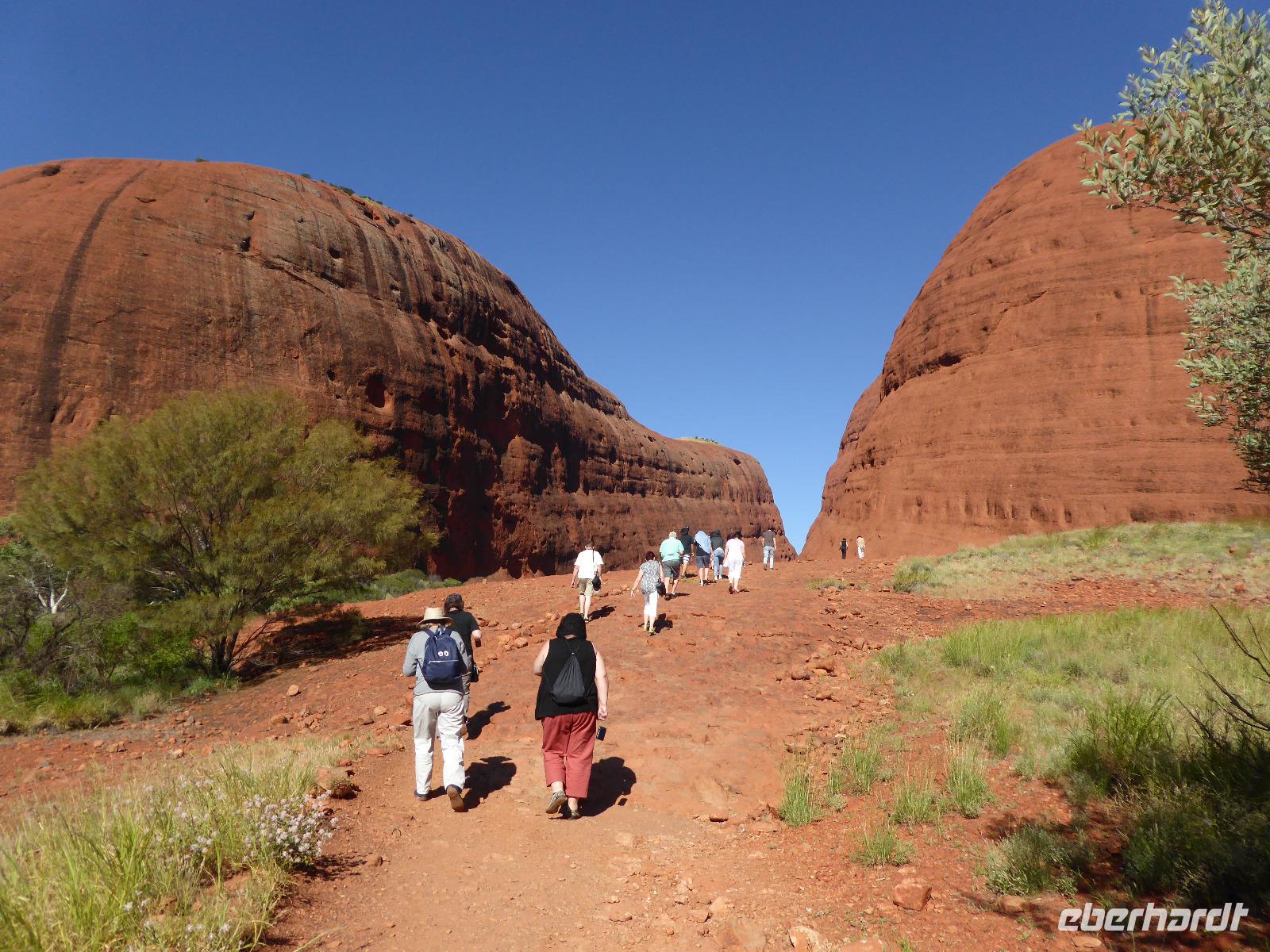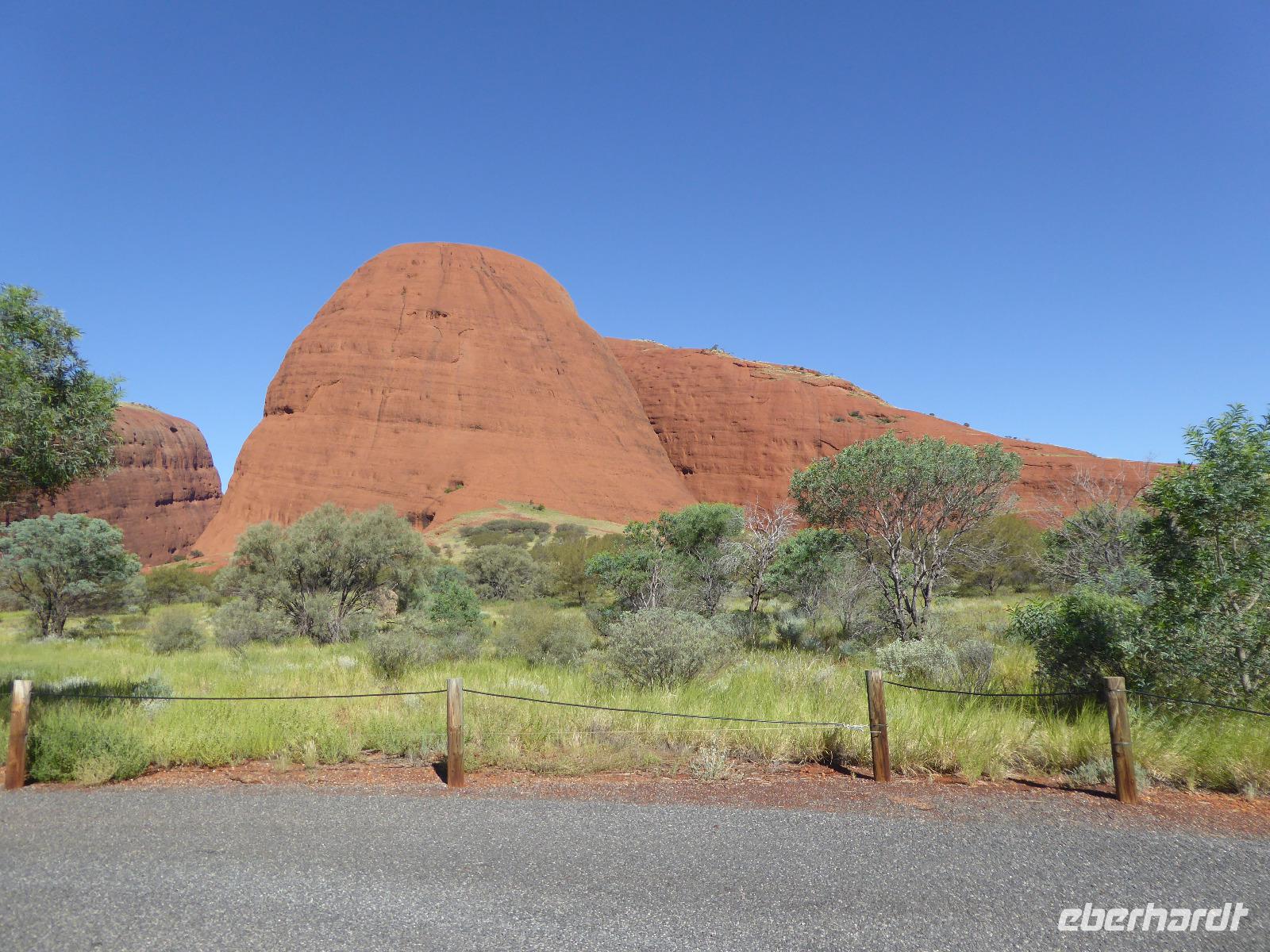 Nach einem frühen Frühstück fliegen wir von Sydney nach Alice Springs. Dort haben wir noch etwas Zeit, um durch die Stadt zu bummeln und einen Kaffee zu trinken. Unsere erste Begegnung mit den Aborigines erfolgt ebenfalls hier. Sie lungern herum, schreien sich gegenseitig an und zeigen uns ihre dunkelste Seite. Uns führt der Weg zunächst zu den Flying Doctors. Es ist noch nicht sehr lange her, da führten Erkrankungen oder Unfälle im Outback schlimmstenfalls zum Tod. Denn an medizinische Versorgung war weit und breit nicht zu denken. Erst mit der Erfindung des Flugzeugs und der elektronischen Verständigung zwischen Flugzeug und Boden, ergab sich die Möglichkeit, eine flächendeckende medizinische Versorgung aufzubauen. In einer kleinen Kinovorführung erfahren wir die Geschichte der Flying Doctors. Im anschließenden Museum ist ein Flugzeug, das einst unterwegs war, zu sehen. Wir können sogar hineinsteigen und uns das Cockpit und den, mit einer Trage ausgestatteten, Innenraum ansehen. Auch der Pedalgenerator, mit dem die Verständigung erfolgte, ist zu besichtigen. Unser nächstes Ziel ist die Telegrafenstation, die von 1885 bis 1905 in Betrieb war und als besterhaltene Telegrafenstation der Gegend gilt. Von hier aus wurden Nachrichten über das ganze Land weitergeleitet. Die oberste Aufsicht der Station hatte der Stationsleiter. Er war nicht nur für die Poststation verantwortlich, sondern auch für die Aborigines der Region. Er diente als Richter, Notarzt und verkaufte auch Lebensmittel. Wir sehen, wie die Familie hier gelebt und gearbeitet hat. Die Ausstattung der Räume ist sehr bescheiden. Schließlich musste alles, was sich hier befand, über 500 Kilometer mit dem Kamel hertransportiert werden. Das Telegrafenamt war das Herz der Station. 24 Stunden am Tag wurden hier Morsezeichen empfangen und weitergeleitet. Alles sehr interessant, dennoch werden wir abgelenkt. Unter einem Baum haben es sich nämlich zwei Kängurus gemütlich gemacht, die nun unsere ganze Aufmerksamkeit auf sich ziehen. Nachdem wir uns satt fotografiert haben, fahren wir weiter zur School oft the Air. Wir erfahren, wie es den Australiern gelungen ist, den Unterricht für Kinder in abgelegenen Gebieten zu organisieren. Wurden früher Schulbücher und Aufgaben per Post hin- und her geschickt, ist es heute über das Internet viel einfacher, Schüler in eine virtuelle Klasse zu bringen und zu unterrichten. Unsere letzte Station für heute ist der Anzac Hill. Hier befindet sich ein Denkmal für im Krieg gefallene Soldaten. Außerdem hat man eine schöne Aussicht auf Alice Springs. Auf dem Rückweg zum Hotel zeigt uns Eva, wo sich das Restaurant Overlander Steakhouse befindet, in dem wir heute zu Abend essen. Die Aussicht dorthin zu Fuß zu gehen, behagt uns gar nicht und wir beschließen mit dem Taxi zu fahren. Leichter gedacht als getan. Unser 13-Personen Taxi, das der freundliche Rezeptionist bestellt hat, kommt nicht. Nachdem es zehn Minuten über die Zeit ist, ruft der Kollege nochmal in der Zentrale an und es stellt sich heraus, das Taxi fährt heute gar nicht. Nur das zusätzliche Taxi ist bereits da und wir schicken die Wiener schon mal vor zum Restaurant. Jetzt sollen zwei 7-Mann Taxis kommen. Es dauert eine Weile, aber dann kommt tatsächlich eins. Also die Nächsten weg. Warten, warten, warten. Ein weiteres großes Taxi kommt. Die Fahrerin springt heraus, umarmt ein vor dem Hotel wartendes Mädchen, beide steigen wieder ein und fahren davon. Uns schwant schon böses. Das wird doch wohl nicht unser Taxi gewesen sein? Ein normales Taxi kommt. Wurde bestellt für eine Person. Tatsache. Das Mädchen hat das falsche Taxi genommen. Egal, nun steigen wieder ein paar Gäste von uns ein und nur Antje und ich bleiben übrig. Ein Pizzafahrer taucht auf. Ob er uns denn mitnehmen würde? Wir haben ihn fast überredet, da taucht noch ein Taxi auf. Und so gelingt es uns, dass tatsächlich alle zusammen zu Abend essen können.