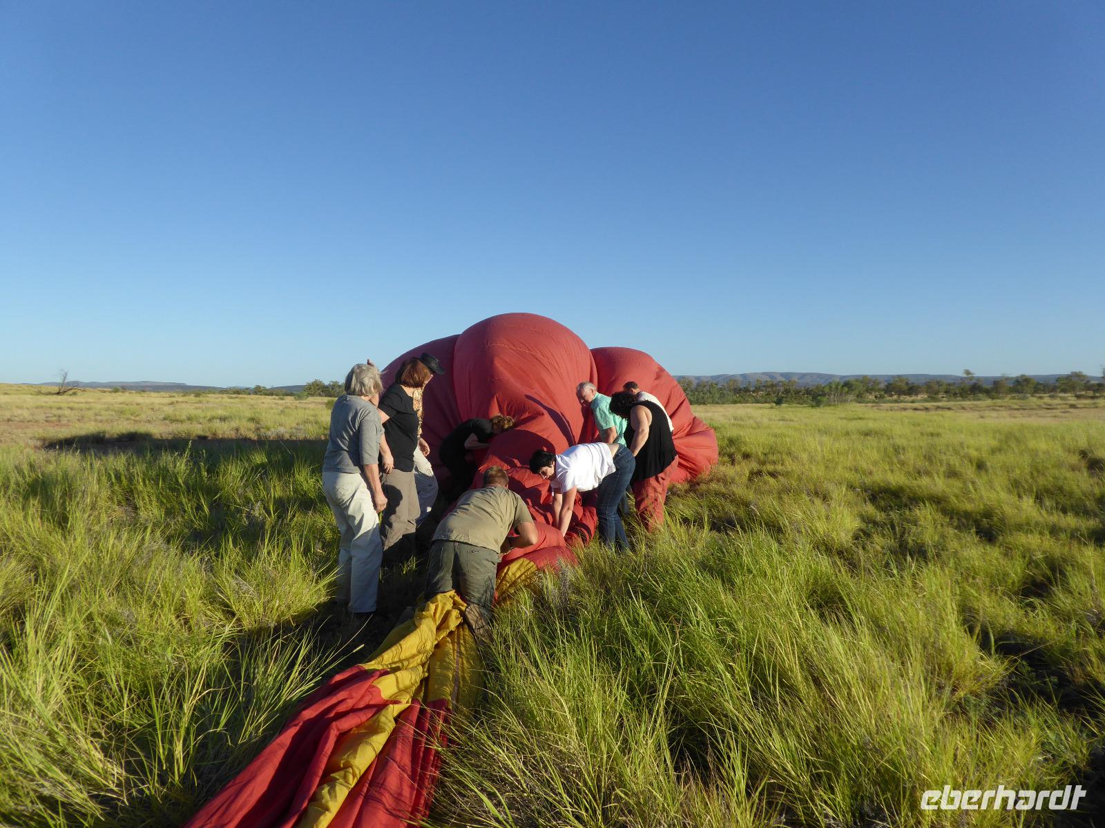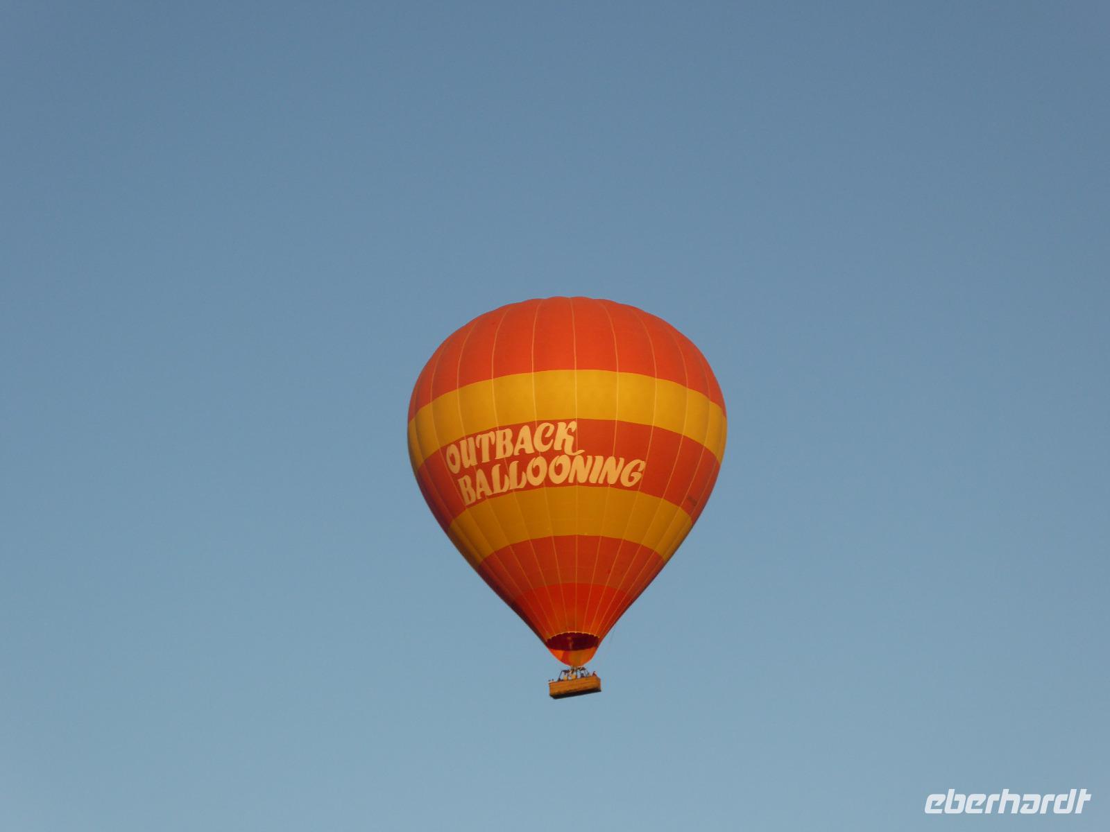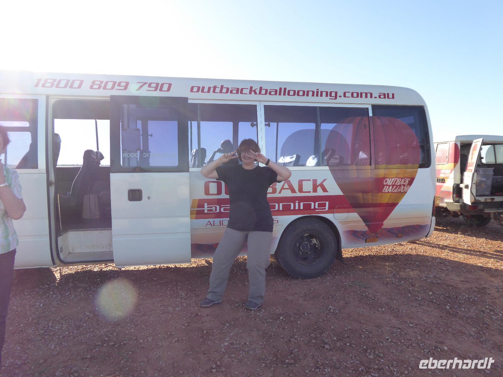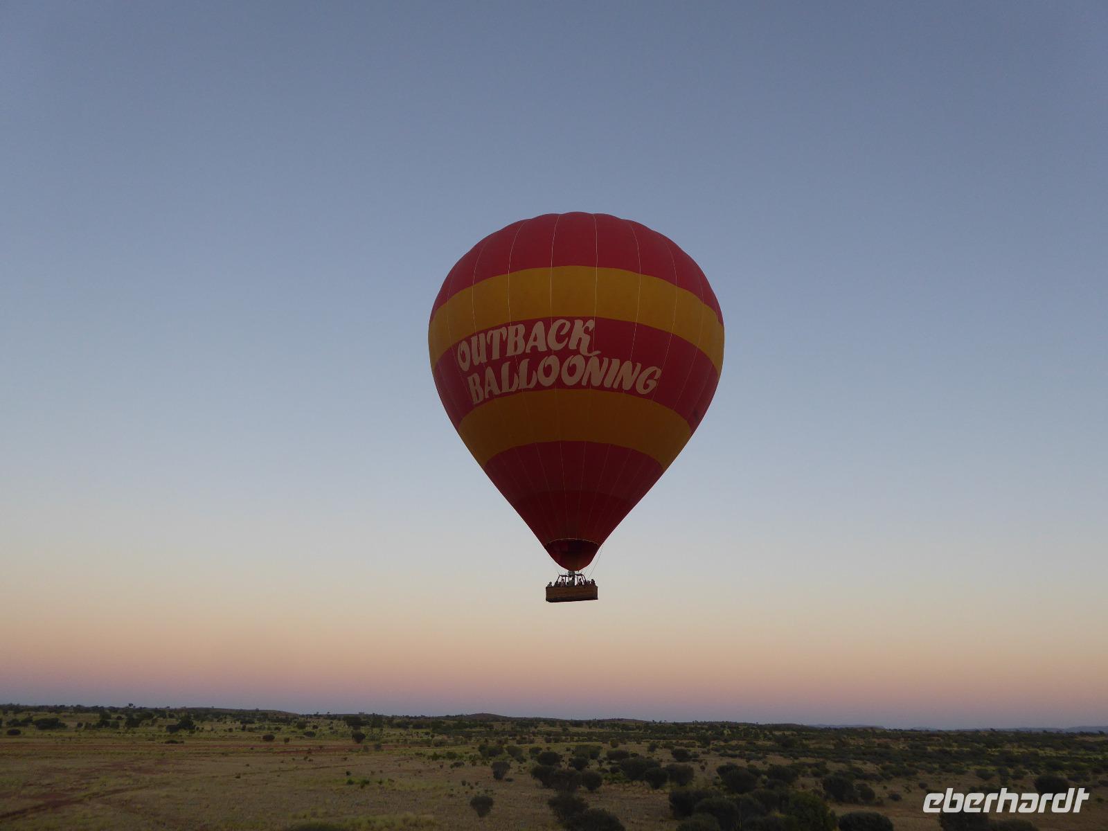 Es ist noch stockdunkel als wir uns an der Rezeption treffen und auf den Shuttle zur Ballonfahrt warten. 4.45 Uhr hält ein kleiner Bus der Firma Outbackballooning vor dem Hotel. Wir fahren durch die sternenklare Nacht dem Sonnenaufgang entgegen. Nach kurzer Fahrt ruft unser Guide „Seid ihr bereit fürs Outback"? Das erste Yeah! Kommt noch ein bisschen zaghaft, dann hellt sich die Stimmung auf und das Adrenalin schießt langsam in unsere Adern. Der Bus verlässt die asphaltierte Straße und die Fahrt geht weiter über Stock und Stein. Kaum ist noch etwas zu sehen, der rote Staub verschluckt die Aussicht. Nach einer Stunde halten wir an. Jetzt wird es sich entscheiden, können wir fliegen oder nicht? Wir sind abhängig vom Wind und Sicherheit geht vor. Es kann also immer noch sein, dass wir ins Hotel zurückfahren müssen. Unser Guide erklärt uns derweil in aller Ruhe den Sternenhimmel. Hier das Kreuz des Südens, da was anderes Interessantes... Dann die Erlösung, ein Aufstiegsplatz ist gefunden, wir werden fliegen. Noch geht es weiter mit dem Bus. Unser Guide erklärt uns, dass wir bei Ankunft ganz schnell sein müssen. Fünf rechts, fünf links und rein in den Ballon. Aber erstens kommt es anderes und zweitens als man denkt. Als wir am Startplatz ankommen ist unser Ballon noch eine leere Hülle und wird gerade erst aufgeblasen. Ein kleiner Ventilator bemüht sich redlich, Luft in den riesigen Ballon zu bekommen. Ab und zu gibt's noch etwas Feuer dazu und nach und nach bildet sich ein wunderschöner rot-gelber Ballon. Endlich heißt es Einsteigen bitte und die Fahrt beginnt. Wir schweben mit unserem Ballon über das grüne Outback. In den letzten Monaten hat es hier so viel geregnet, dass tatsächlich alle grün ist. Zusammen mit uns ist ein zweiter Ballon unterwegs und die Piloten stimmen sich ab, so dass mal der eine und mal der andere Ballon oben bzw. fast unten schwebt. Von uns aus hätte die Fahrt auch noch weiter gehen können, doch schon bald landen wir wieder. Mit vereinten Kräften wird der Ballon zusammengelegt und der Korb auf den Lkw geladen. Dann werden die Sektflaschen geköpft. Die Stimmung steigt. Adrenalin und Sekt - das macht fröhlich. Wir naschen Cracker und Käse und öffnen eine Flasche nach der anderen. Was für ein Spaß. Zum Abschluss bekommt jeder ein Zertifikat zur Erinnerung, dann bringt uns unser Pilot mit dem Bus zum Treffpunkt mit dem Rest der Gruppe. Unsere Mitreisenden haben freundlicherweise unsere Koffer mit eingeladen und nun beginnt unsere Fahrt durch das Outback. An den Olgas brennt die Luft. Die Sonne scheint unbarmherzig, der Himmel ist strahlend blau, kein Wölkchen am Himmel. Das hält uns aber nicht davon ab, die Felsformationen von Nahem zu betrachten. Am Abend fahren wir zum Ayers Rock. Hier ist bereits ein Plätzchen für uns reserviert, der Sekt ist gekühlt und der Tisch gedeckt. Es dauert noch eine Weile, bevor die Sonne daran denkt, unter zu gehen. So haben wir Zeit für unser Gruppenfoto und um auf den schönen Tag anzustoßen. Bald aber schon beginnt der Berg in verschiedenen Farben zu leuchten. Die Sonne versinkt und wir bleiben mit unseren Fotoapparaten verzückt zurück. Zurück im Hotel erwartet uns heute ein BBQ, was bedeutet, wir müssen uns unser Abendessen selbst zu bereiten. Auf dem Grill. Was mehr oder weniger erfolgreich gelingt.