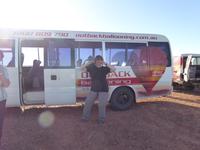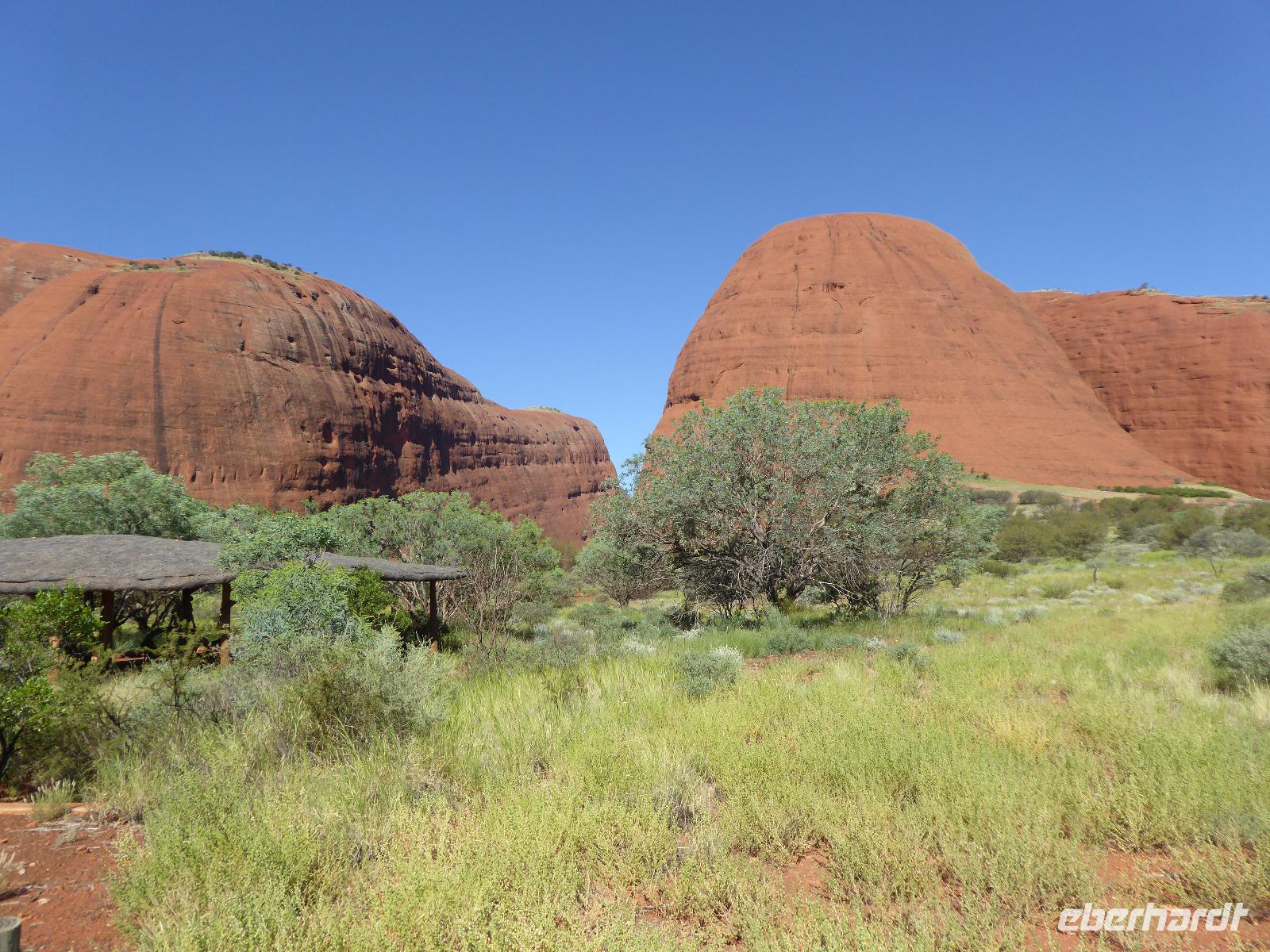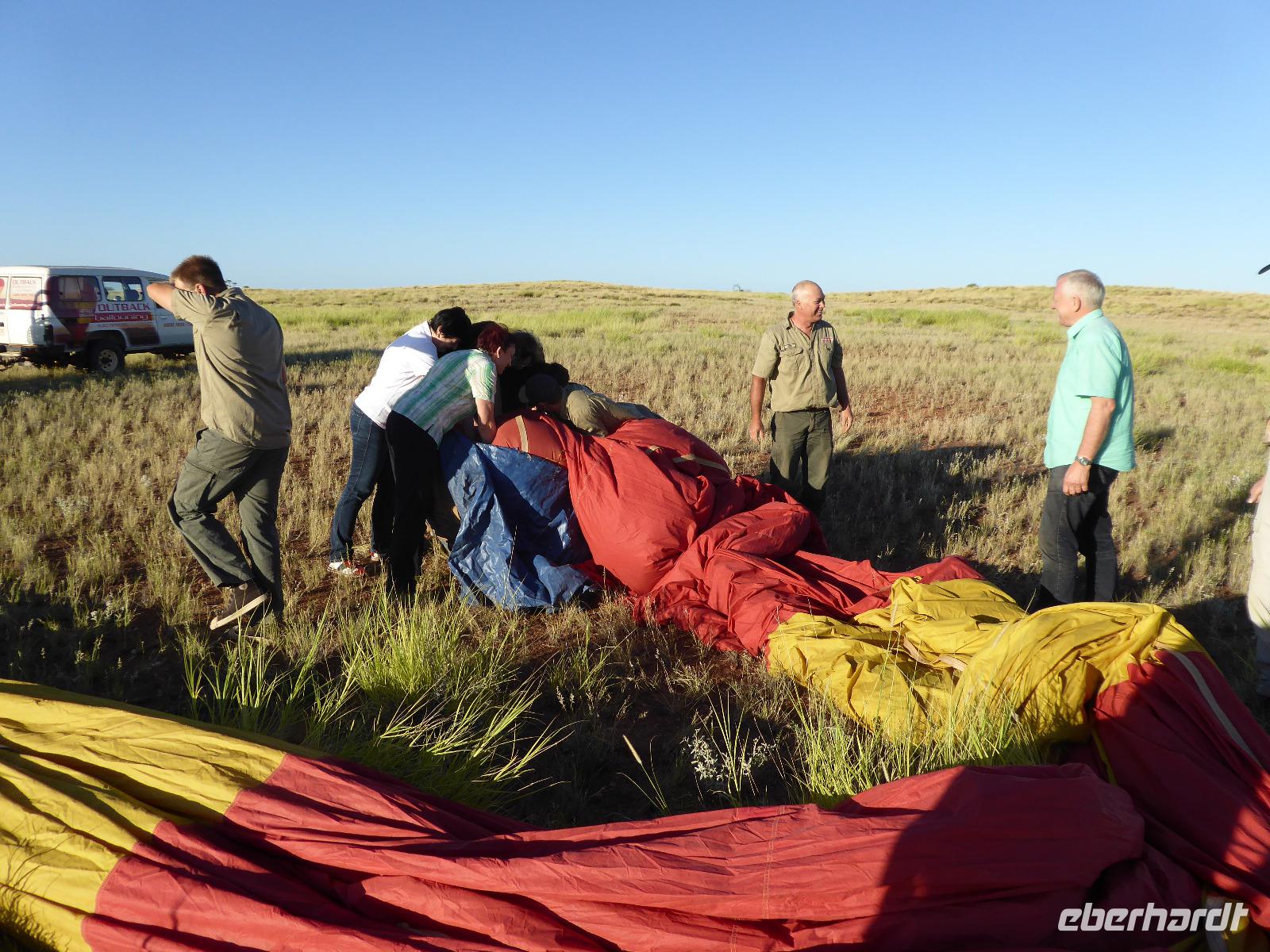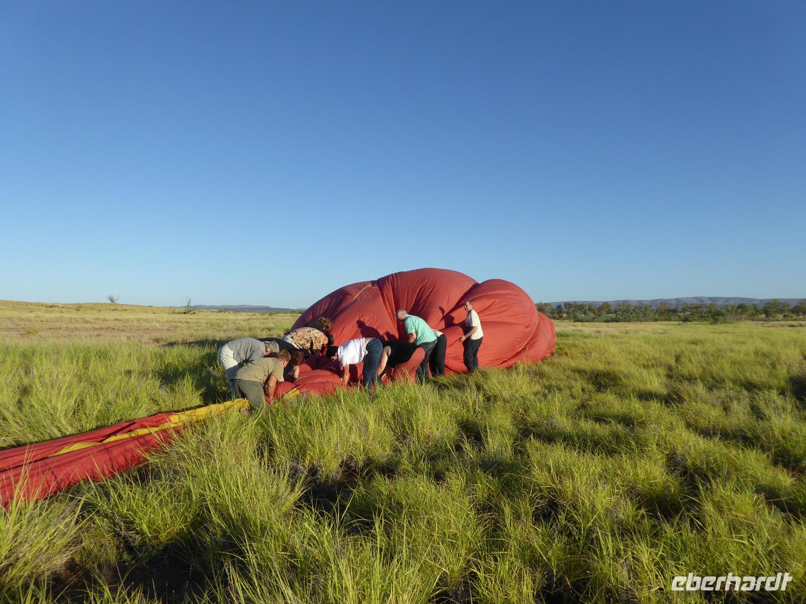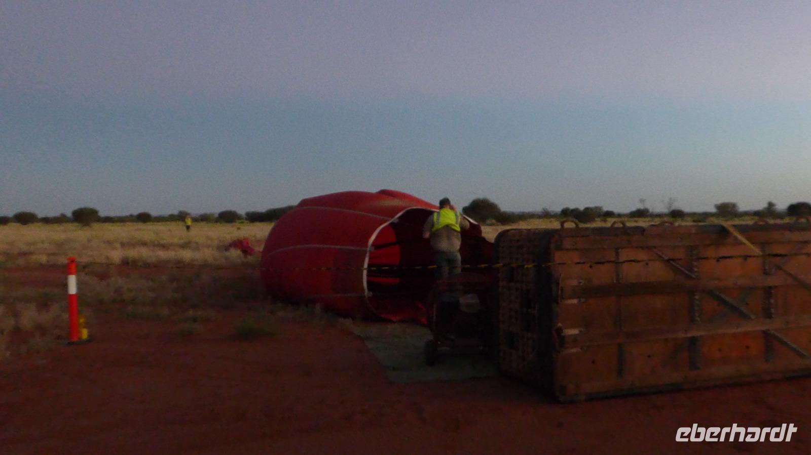 Es ist noch stockdunkel als wir uns an der Rezeption treffen und auf den Shuttle zur Ballonfahrt warten. 4.45 Uhr hält ein kleiner Bus der Firma Outbackballooning vor dem Hotel. Wir fahren durch die sternenklare Nacht dem Sonnenaufgang entgegen. Nach kurzer Fahrt ruft unser Guide „Seid ihr bereit fürs Outback"? Das erste Yeah! Kommt noch ein bisschen zaghaft, dann hellt sich die Stimmung auf und das Adrenalin schießt langsam in unsere Adern. Der Bus verlässt die asphaltierte Straße und die Fahrt geht weiter über Stock und Stein. Kaum ist noch etwas zu sehen, der rote Staub verschluckt die Aussicht. Nach einer Stunde halten wir an. Jetzt wird es sich entscheiden, können wir fliegen oder nicht? Wir sind abhängig vom Wind und Sicherheit geht vor. Es kann also immer noch sein, dass wir ins Hotel zurückfahren müssen. Unser Guide erklärt uns derweil in aller Ruhe den Sternenhimmel. Hier das Kreuz des Südens, da was anderes Interessantes... Dann die Erlösung, ein Aufstiegsplatz ist gefunden, wir werden fliegen. Noch geht es weiter mit dem Bus. Unser Guide erklärt uns, dass wir bei Ankunft ganz schnell sein müssen. Fünf rechts, fünf links und rein in den Ballon. Aber erstens kommt es anderes und zweitens als man denkt. Als wir am Startplatz ankommen ist unser Ballon noch eine leere Hülle und wird gerade erst aufgeblasen. Ein kleiner Ventilator bemüht sich redlich, Luft in den riesigen Ballon zu bekommen. Ab und zu gibt's noch etwas Feuer dazu und nach und nach bildet sich ein wunderschöner rot-gelber Ballon. Endlich heißt es Einsteigen bitte und die Fahrt beginnt. Wir schweben mit unserem Ballon über das grüne Outback. In den letzten Monaten hat es hier so viel geregnet, dass tatsächlich alle grün ist. Zusammen mit uns ist ein zweiter Ballon unterwegs und die Piloten stimmen sich ab, so dass mal der eine und mal der andere Ballon oben bzw. fast unten schwebt. Von uns aus hätte die Fahrt auch noch weiter gehen können, doch schon bald landen wir wieder. Mit vereinten Kräften wird der Ballon zusammengelegt und der Korb auf den Lkw geladen. Dann werden die Sektflaschen geköpft. Die Stimmung steigt. Adrenalin und Sekt - das macht fröhlich. Wir naschen Cracker und Käse und öffnen eine Flasche nach der anderen. Was für ein Spaß. Zum Abschluss bekommt jeder ein Zertifikat zur Erinnerung, dann bringt uns unser Pilot mit dem Bus zum Treffpunkt mit dem Rest der Gruppe. Unsere Mitreisenden haben freundlicherweise unsere Koffer mit eingeladen und nun beginnt unsere Fahrt durch das Outback. An den Olgas brennt die Luft. Die Sonne scheint unbarmherzig, der Himmel ist strahlend blau, kein Wölkchen am Himmel. Das hält uns aber nicht davon ab, die Felsformationen von Nahem zu betrachten. Am Abend fahren wir zum Ayers Rock. Hier ist bereits ein Plätzchen für uns reserviert, der Sekt ist gekühlt und der Tisch gedeckt. Es dauert noch eine Weile, bevor die Sonne daran denkt, unter zu gehen. So haben wir Zeit für unser Gruppenfoto und um auf den schönen Tag anzustoßen. Bald aber schon beginnt der Berg in verschiedenen Farben zu leuchten. Die Sonne versinkt und wir bleiben mit unseren Fotoapparaten verzückt zurück. Zurück im Hotel erwartet uns heute ein BBQ, was bedeutet, wir müssen uns unser Abendessen selbst zu bereiten. Auf dem Grill. Was mehr oder weniger erfolgreich gelingt.
