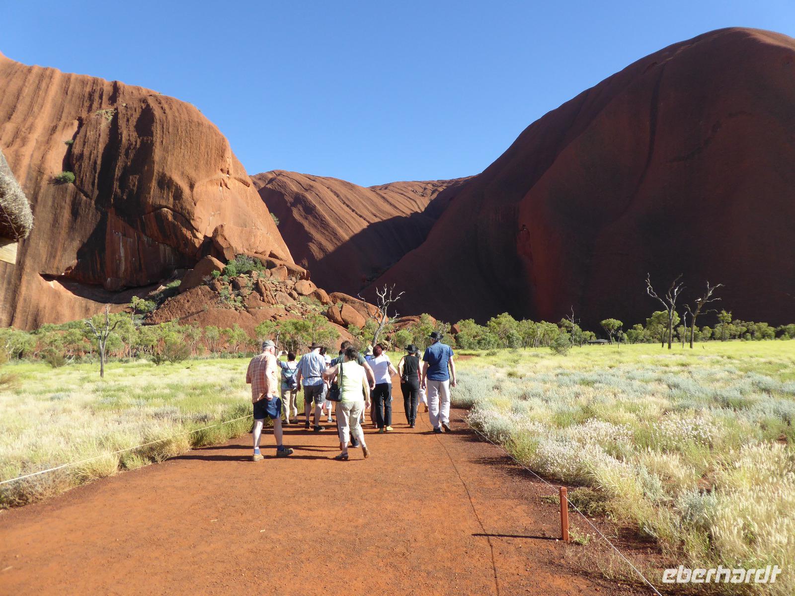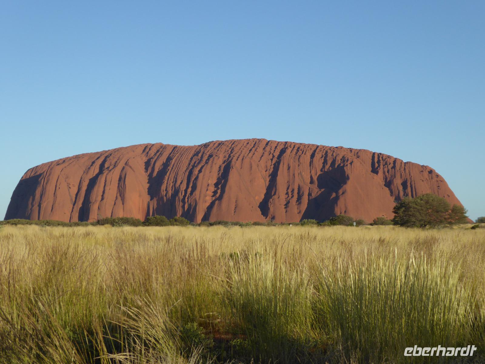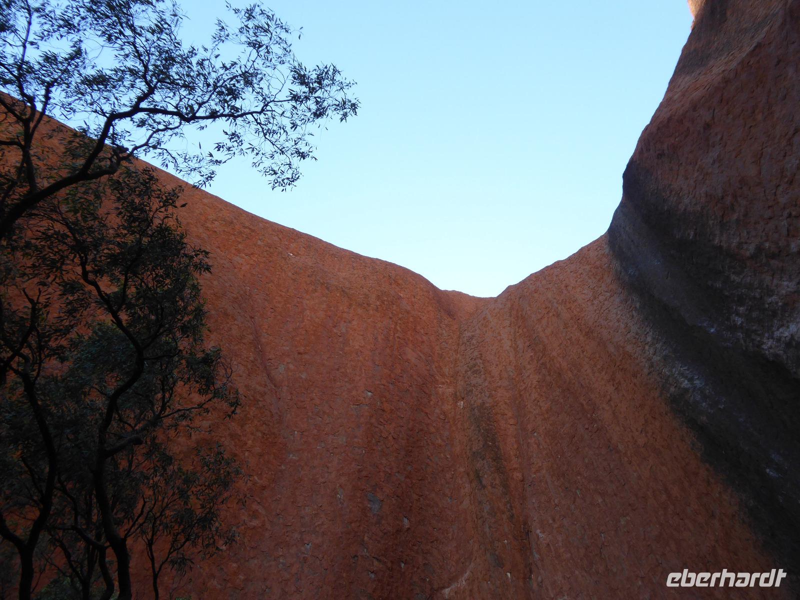 Sehr früh geht es heute los, denn wir wollen den Sonnenaufgang am Ayers Rock bestaunen. 5.30 Uhr besteigen wir den Bus. Wir benötigen fast eine Stunde, um den Aussichtspunkt zu erreichen. Es gibt eine Plattform mit mehreren Etagen, allerdings sind die vermeintlich besten Plätze schon besetzt, denn einige Gruppen waren schneller als wir. Dennoch geht die Sonne für alle auf und lässt den Ayers Rock in leuchtendem Rot erglühen. Nach dem Spektakel fahren wir in ein Aborigini Kulturzentrum, wo wir unser Frühstück einnehmen. Hier ist alles verboten - fotografieren, filmen... Nur teure Kunst kaufen, das darf man. Gut gesättigt begeben wir uns auf einen Spaziergang. Heute kommen wir direkt an das rote Ungetüm heran. Zum Sehen und anfassen. Wir betrachten die verschiedenen Formationen des Berges, finden auch ein paar Felszeichnungen und lauschen den Geschichten der Regenbogenschlange. Am Ende des Spaziergangs sehen wir auch die Kette, die befestigt wurde, damit Leute, die den Ayers Rock besteigen wollen, sich daran festhalten können. Generell wird aber eher davon abgeraten, sich auf diesen Weg zu machen, zum Einen, weil es sehr gefährlich ist und zum anderen, weil der Berg den Aboriginis heilig ist. Hier sollen die Geistwesen wohnen, die die Erde erschaffen haben. Und denen wollen wir doch nicht auf dem Kopf rumtrampeln oder? Am Nachmittag verabschieden wir uns von Eva, wir fahren zum Flughafen und fliegen nach Sydney. Hier werden wir wieder von Ulli erwartet. Da unser Flug mehr als eine Stunde Verspätung haben, fahren wir gleich zum Restaurant am Hafen, wo es (mal wieder) ein leckeres Steak gibt.