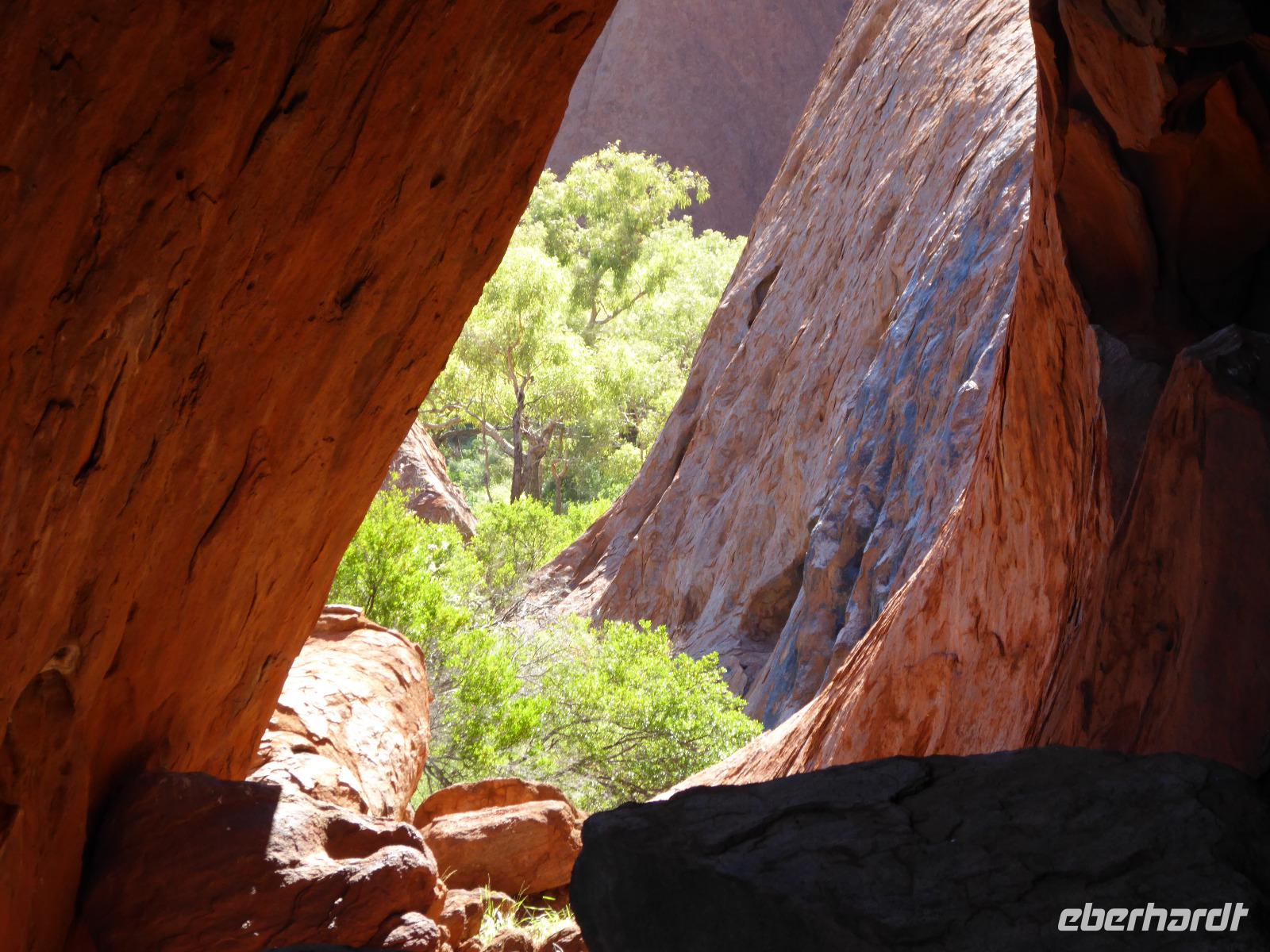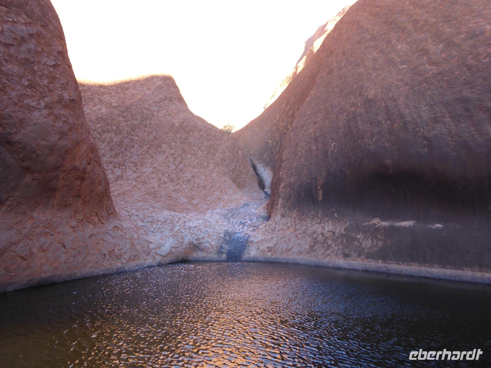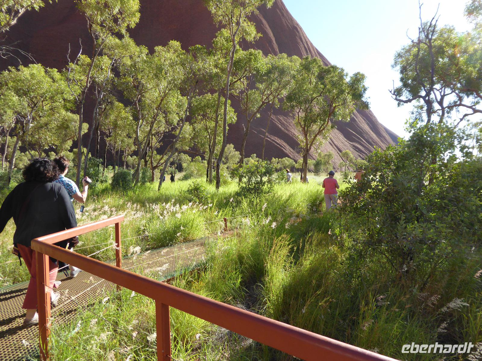 Sehr früh geht es heute los, denn wir wollen den Sonnenaufgang am Ayers Rock bestaunen. 5.30 Uhr besteigen wir den Bus. Wir benötigen fast eine Stunde, um den Aussichtspunkt zu erreichen. Es gibt eine Plattform mit mehreren Etagen, allerdings sind die vermeintlich besten Plätze schon besetzt, denn einige Gruppen waren schneller als wir. Dennoch geht die Sonne für alle auf und lässt den Ayers Rock in leuchtendem Rot erglühen. Nach dem Spektakel fahren wir in ein Aborigini Kulturzentrum, wo wir unser Frühstück einnehmen. Hier ist alles verboten - fotografieren, filmen... Nur teure Kunst kaufen, das darf man. Gut gesättigt begeben wir uns auf einen Spaziergang. Heute kommen wir direkt an das rote Ungetüm heran. Zum Sehen und anfassen. Wir betrachten die verschiedenen Formationen des Berges, finden auch ein paar Felszeichnungen und lauschen den Geschichten der Regenbogenschlange. Am Ende des Spaziergangs sehen wir auch die Kette, die befestigt wurde, damit Leute, die den Ayers Rock besteigen wollen, sich daran festhalten können. Generell wird aber eher davon abgeraten, sich auf diesen Weg zu machen, zum Einen, weil es sehr gefährlich ist und zum anderen, weil der Berg den Aboriginis heilig ist. Hier sollen die Geistwesen wohnen, die die Erde erschaffen haben. Und denen wollen wir doch nicht auf dem Kopf rumtrampeln oder? Am Nachmittag verabschieden wir uns von Eva, wir fahren zum Flughafen und fliegen nach Sydney. Hier werden wir wieder von Ulli erwartet. Da unser Flug mehr als eine Stunde Verspätung haben, fahren wir gleich zum Restaurant am Hafen, wo es (mal wieder) ein leckeres Steak gibt.