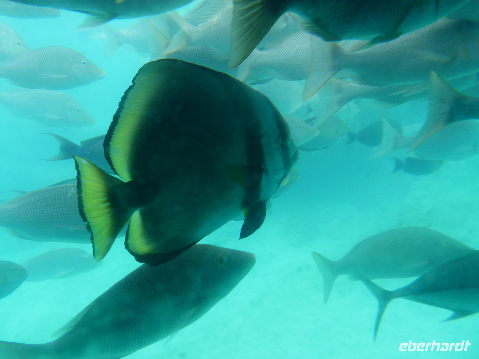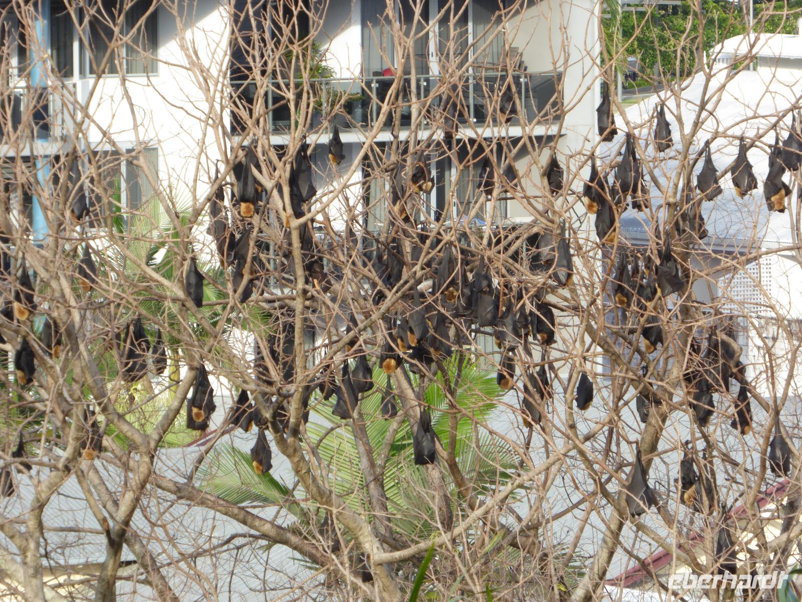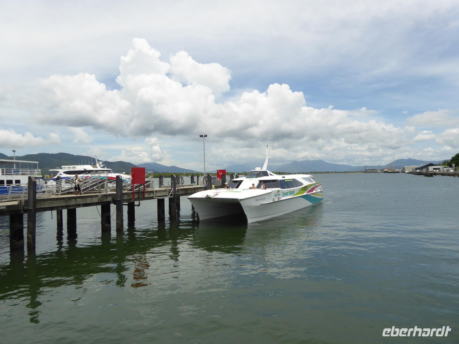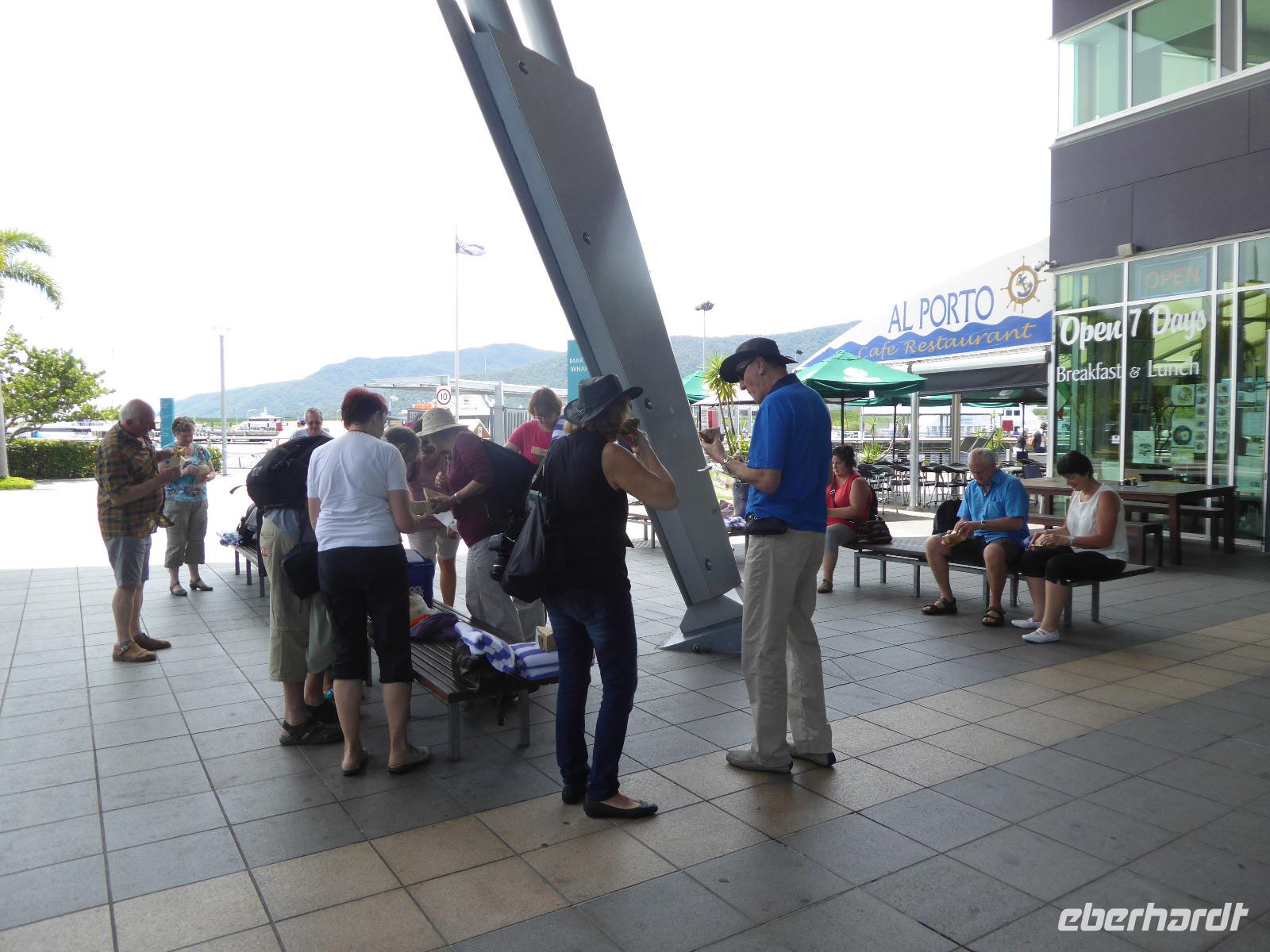 Am Vormittag fliegen wir von Sydney nach Cairns. Da wir sehr früh los müssen, hat uns das Hotel freundlicherweise Lunchpakete gepackt. Der Inhalt ist allerdings übersichtlich. Zum Glück hat Simone, unsere örtliche Reiseleiterin für die nächsten zwei Tage Stüllchen organisiert, kalte Getränke sowie Obst und etwas zum Naschen. Da Ganze verzehren wir am Hafen von Cairns, wo wir auf den Katamaran warten, der uns nach Green Island bringen soll. Auf der Insel angekommen, haben wir kurz Zeit, uns zu orientieren, bevor wir erst mit dem Unterseeboot und dann mit dem Glasbodenboot fahren. Das Glück ist uns hold und wir sehen außer bunten Korallen und Fischen auch mehrere Schildkröten. Im Foto lässt sich das allerdings nicht einfangen, dafür sind die Scheiben zu blind. Nach den Bootsfahrten bleibt Zeit zum Baden im Meer oder Swimmingpool, zum Eis essen oder Kaffee trinken. Gemütlich geht es mit dem Katamaran zurück nach Cairns und mit dem Bus ins Hotel. Hier haben schon Zauberhände unsere Koffer auf die Zimmer verteilt und wir können den Abend genießen.
