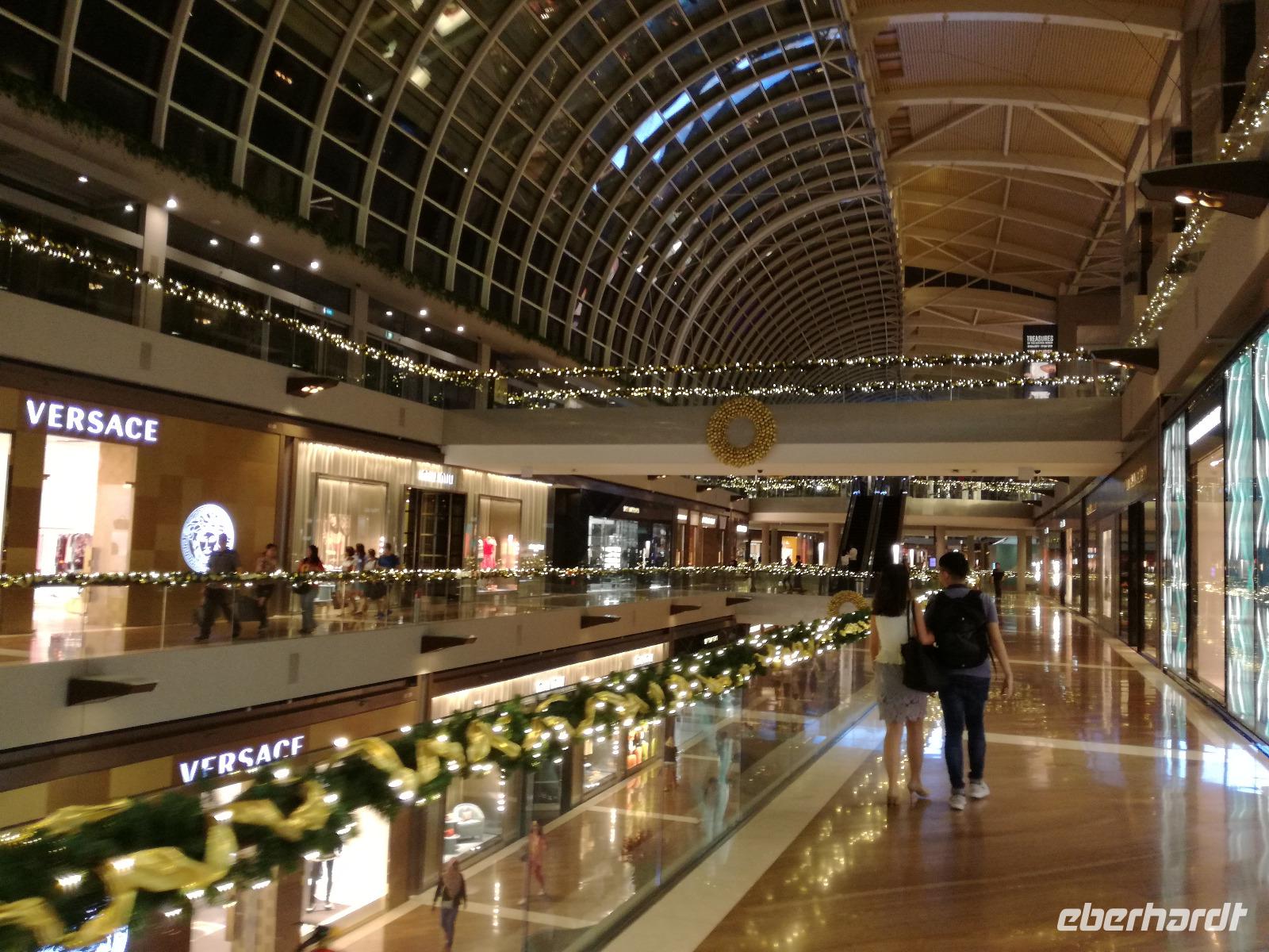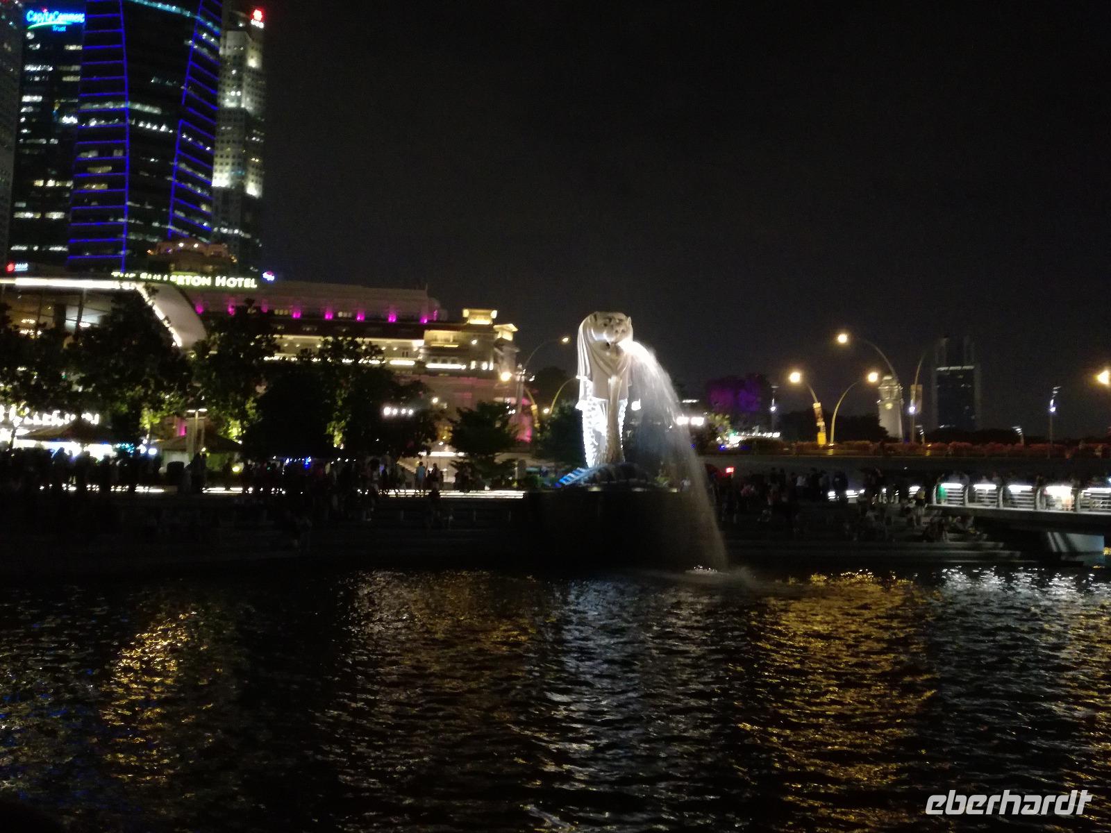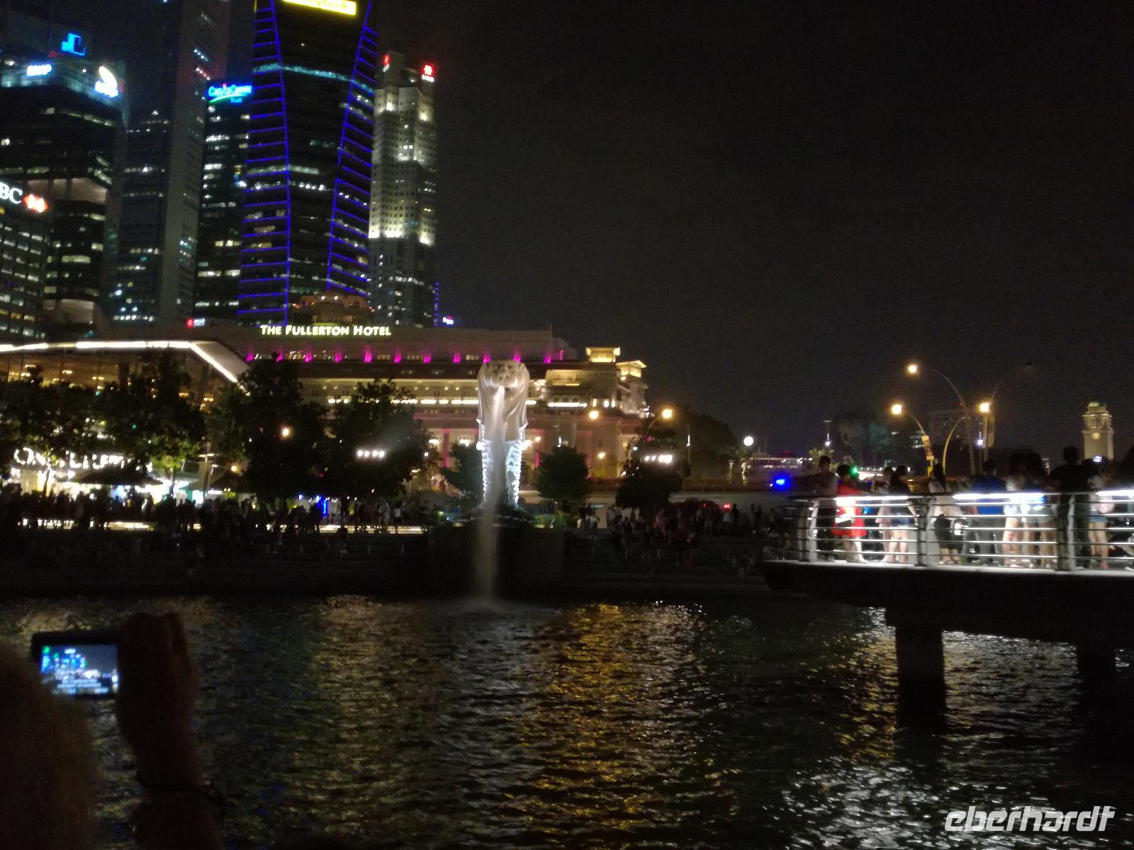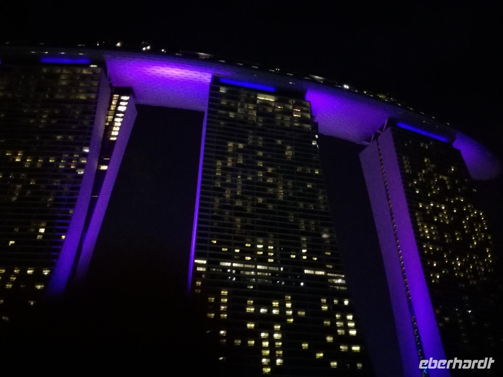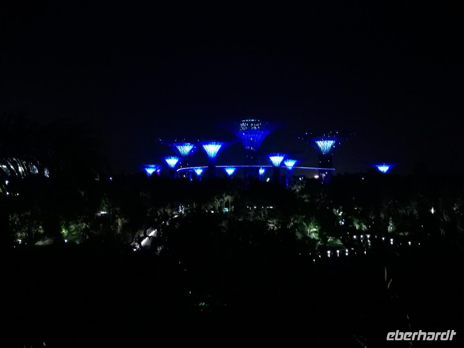 Nach einer kleinen Verschnaufpause geht es auch schon los. Es ist bereits dunkel draußen und wir nehmen ein kleines Boot vom Clarke Quay aus für einen abendliche Cruise auf dem Singapur River. Vorbei am Wahrzeichen von Singapur, dem Merlion, steigen wir dann bei der Shoppingmall vom Marina Bay Sands Hotel aus. Um unsere Energie wieder etwas aufzuladen gehen wir in der Mall etwas essen und danach dann hinüber ins Hotel. Von hier aus gibt es einen kleinen Steg, von dem man die Supertrees des neuen botanischen Gartens sehen kann, sie strahlen heute Nacht in blau :)