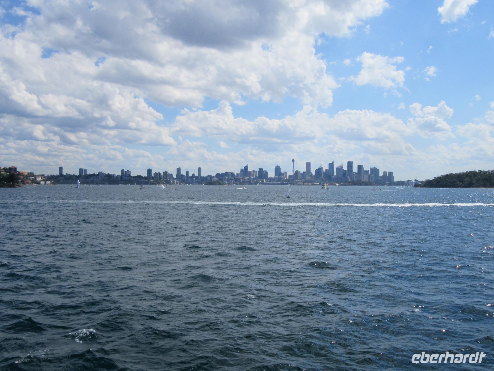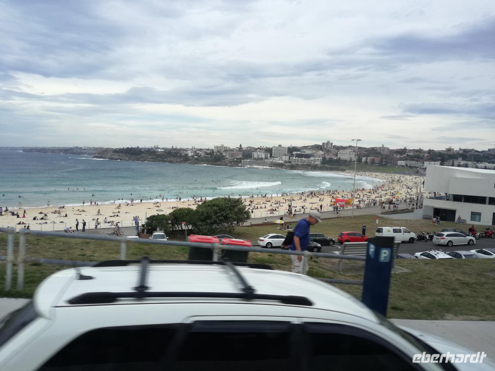 Wir sind endlich angekommen. Am Flughafen in Sydney werden wir von Ulrike (Ulli ?) in Empfang genommen und herzlich begrüßt. Auch Sydney empfängt uns mit sommerlichen Temperaturen und strahlend blauem Himmel. Wir fahren erst einmal ins Hotel und während sich die einen etwas vom Flug erholen können, kommt auch unsere „zweite Hälfte" der Reisegruppe von Neuseeland in Sydney an. Um die Mittagszeit treffen wir uns dann alle ausgeruht für die Stadtrundfahrt wieder. Ulli und Max zeigen uns dann Sydney von fast allen Seiten. Wir fahren durch Chinatown, vorbei an Darling Harbour mit dem Aquarium schließlich halten wir unterhalb der Harbour Brücke für einen Fotostopp. Danach fahren wir durch den alten Stadtteil „The Rocks" und setzen unseren Weg weiter über die Brücke fort, um von der anderen Seite aus einen tollen Ausblick auf die Skyline, das Opernhaus und die Harbour Brücke zu genießen. Auf dem Weg zum Bondi Beach durchfahren wir die Stadtteile Kings Cross und Paddington. Entlang der Küstenstraße, die sich durch zahlreiche Buchten schlängelt an denen sich die Strandhäuser und Villen mit Meerblick aneinander reihen, fahren wir zum Bondi Beach. Von einem Aussichtspunkt aus am Gap Park werfen wir einen Blick auf die Steilküste und wir sehen auch North Head, die andere Seite der Bucht. Weit draußen auf dem Ozean sehen wir sogar Boote die eine Walsafari unternehmen, die Fontänen in der Ferne zeigen, dass die Passagiere heute großes Glück haben. Am Bondi Beach angekommen merkt man, dass dieser Strand sehr beliebt ist und am Wochenende auch sehr gern von den Australiern genutzt wird. Hier tummelt sich Jung und Alt, Sonnenanbeter, Surfer und Kaffeegenießer, Einheimische und Touristen. Auch wir gönnen uns hier eine kleine Pause bevor wir wieder zum Hotel zurück fahren. Am heutogen Abend erwartet uns noch ein Abendessen im Hotel und danach ist dann auch schon fast jeder relativ schnell auf den Zimmern verschwunden.