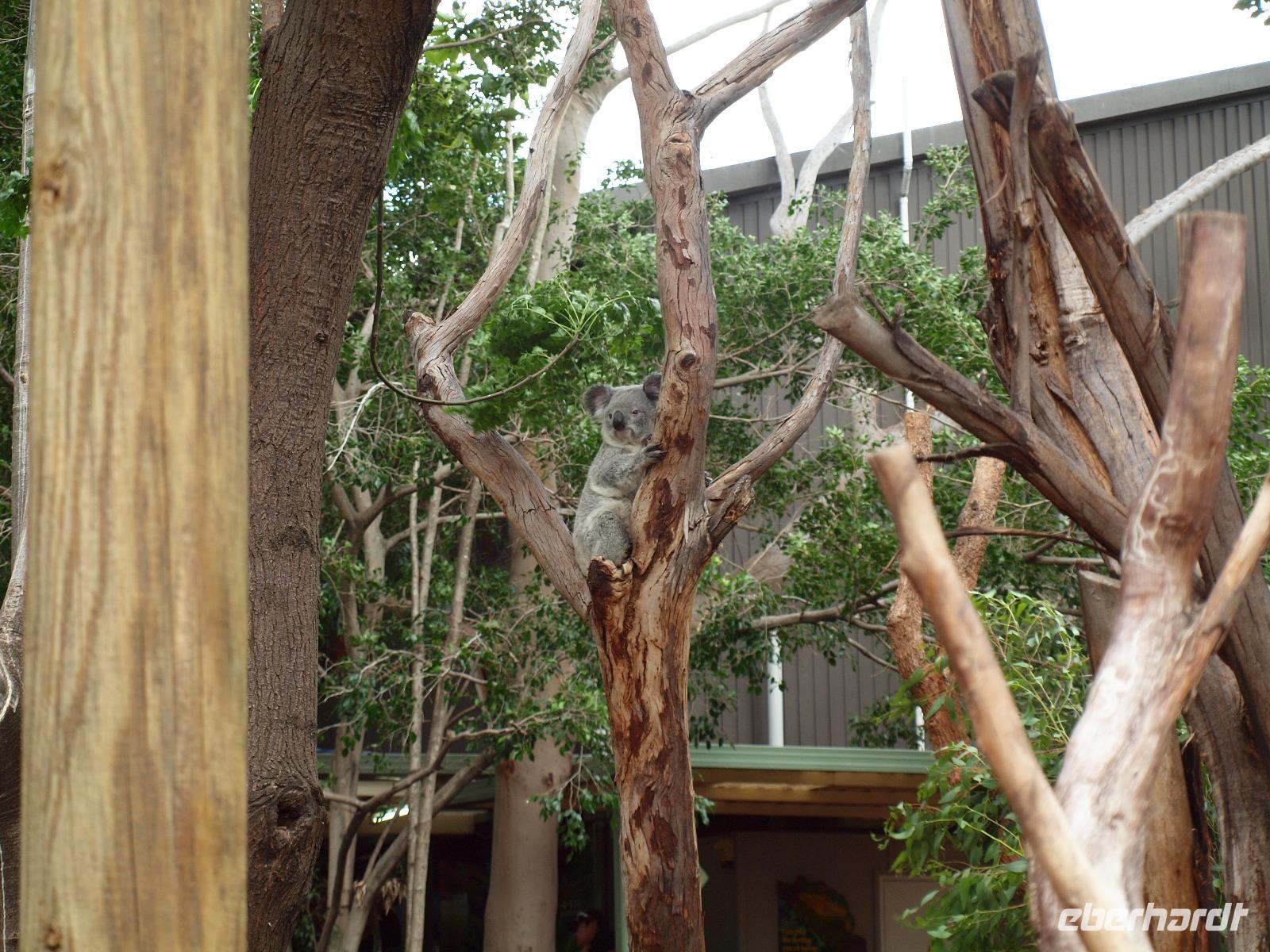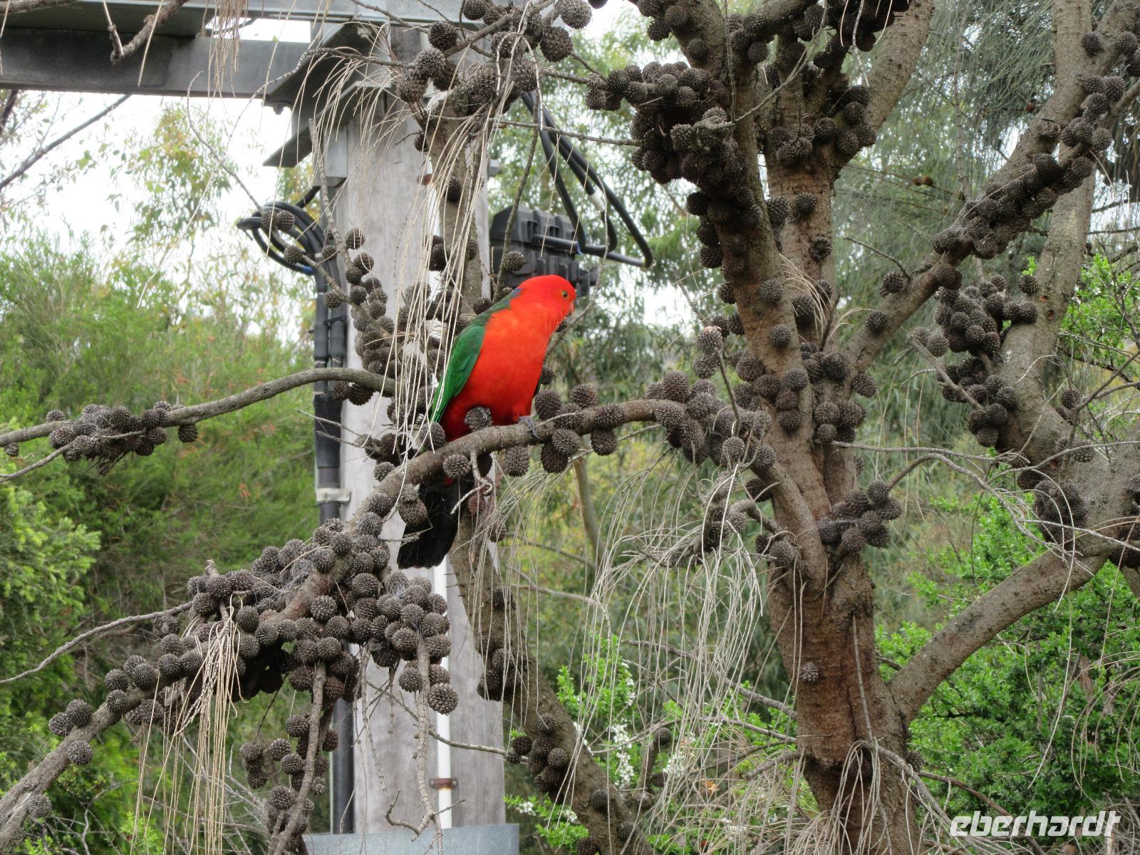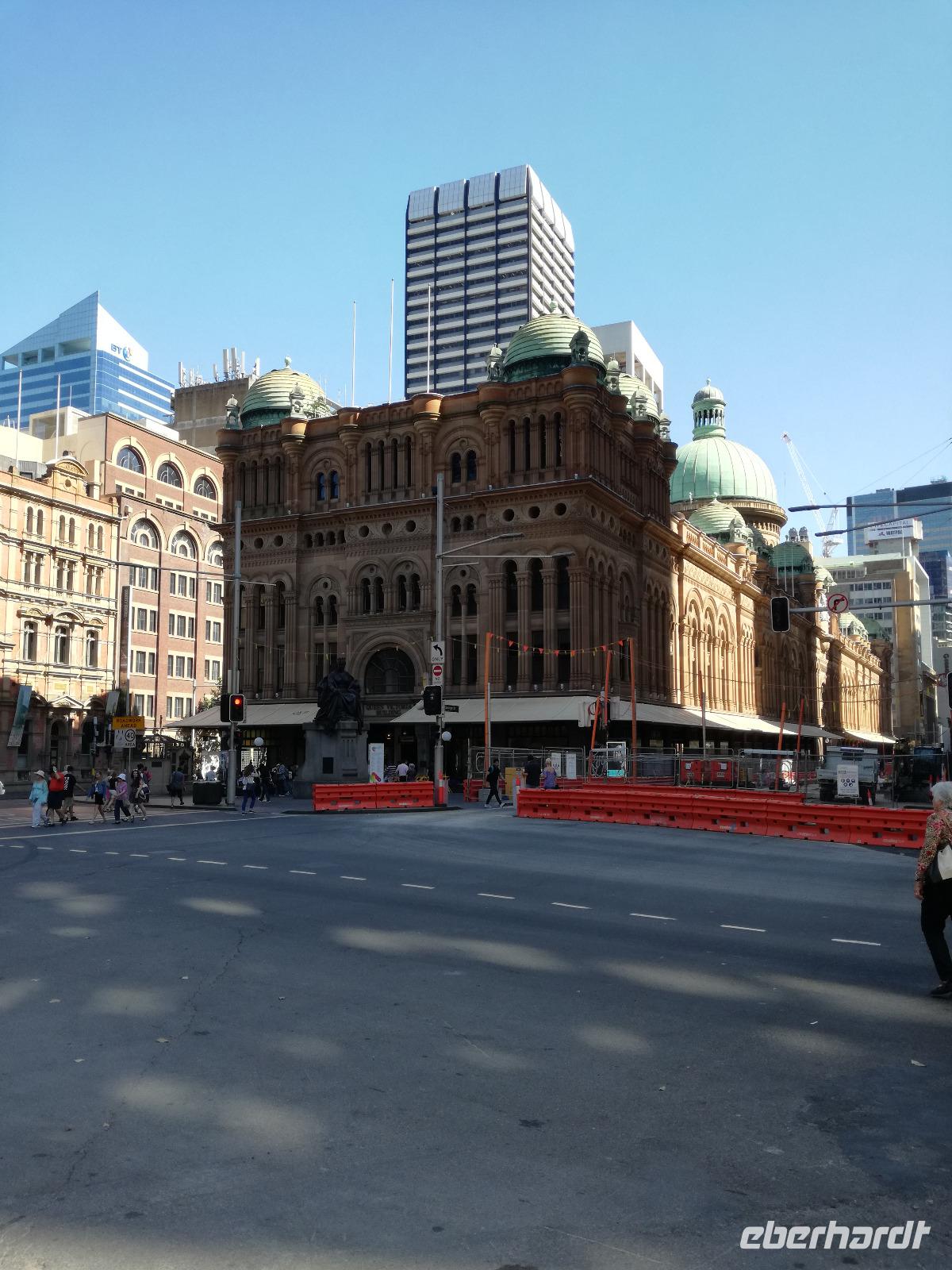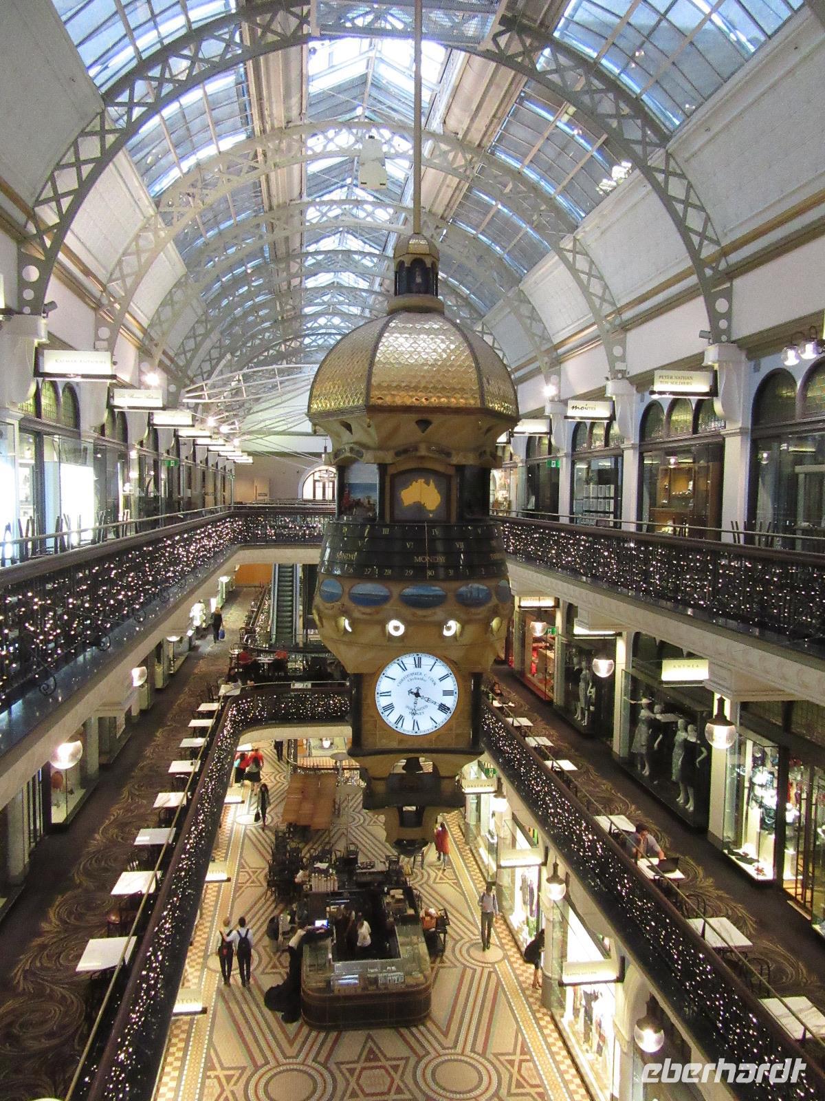 Eine Traumzeitlegende der Aborigines erzählt uns was mit den Schwestern passiert ist... "Ihre Namen sind Meehni (922 m), Wimlah (918 m) und Gunnedoo (906 m). Die drei lebten mit ihrem Vater, Tyawan, einem Zauberdoktor, in der Gegend. Nahebei wohnte auch der Bunyip, vor dem sie Angst hatten. Eines Tages, als der Vater ins Tal ging und seine Töchter auf den höchsten Punkt der Klippen gebracht hatte um sie in Sicherheit zu wissen, erschrak Meehni, als sie einen Tausendfüßler erblickte. Sie warf einen Stein nach ihm, der aber über die Klippen rollte. Bunyip wachte dadurch auf und war verärgert; als er die Schwestern erblickte, ging er wütend auf sie los. Tyawan sah das vom Tal aus und nahm seinen Zauberknochen und verwandelte die drei nahe beieinander stehenden Schwestern in drei Felstürme, um sie zu schützen. Der Bunyip wandte sich nun gegen Tyawan, der sich aber selber in einen Leierschwanz verwandelte und davonflog. Dabei verlor er leider seinen Zauberknochen, den er auch heute noch sucht und die drei Schwestern warten und hoffen, dass er ihn bald findet." Nach dem Mittagessen verlassen wir die blauen Berge, legen noch einen kleinen Stadtbummel in Leura. Das Städtchen ist geprägt von Kunstgalerien, Cafés und Restaurants und kleinen Boutiquen. Besonders berühmt ist hier der Candy Store, ein Bonbonladen in dem sich tausende Süßigkeiten in den Regalen türmen, die das Herz begehren könnte. Weiter geht es und ein Besuch im Featherdale Wildlife Park steht auf dem Programm. Hier sehen wir Kängurus, Koalas, Dingos und den gefährlichen Kasuar. Nach dem Besuch heißt es dann auch schon Abschied nehmen, das war unser letzter Tag in Sydney und auch mit Ulli. Zurück im Hotel verbringen wir den Abend in Eigenregie. Bei einem abendlichen Spaziergang zieht es uns noch zum Queen Victoria Gebäude. Irgendwie scheint dieses Gebäude aus einer anderen Zeit übrig geblieben zu sein, tatsächlich wurde es Mitte des 19. Jahrhunderts gebaut. Mitten zwischen gläsernen Wolkenkratzern steht dieses prunkvolle viktorianische Gebäude. Auch der Innenbereich erinnert an die gute alte Zeit. Überall Säulen, Kuppelchen, eine schmale Wendeltreppe, Gold und Glas. Zwei große mechanische Uhren zeigen Geschichten aus dem englischen Königreich. Einfach Wundervoll! Bei einem zweiten Anlauf für die Obar müssen wir widerwillig den Plan ändern und kehren schließlich in eines der Restaurants ein und lassen den letzten Abend dann bei einem Spaziergang zurück zum Hotel ausklingen.