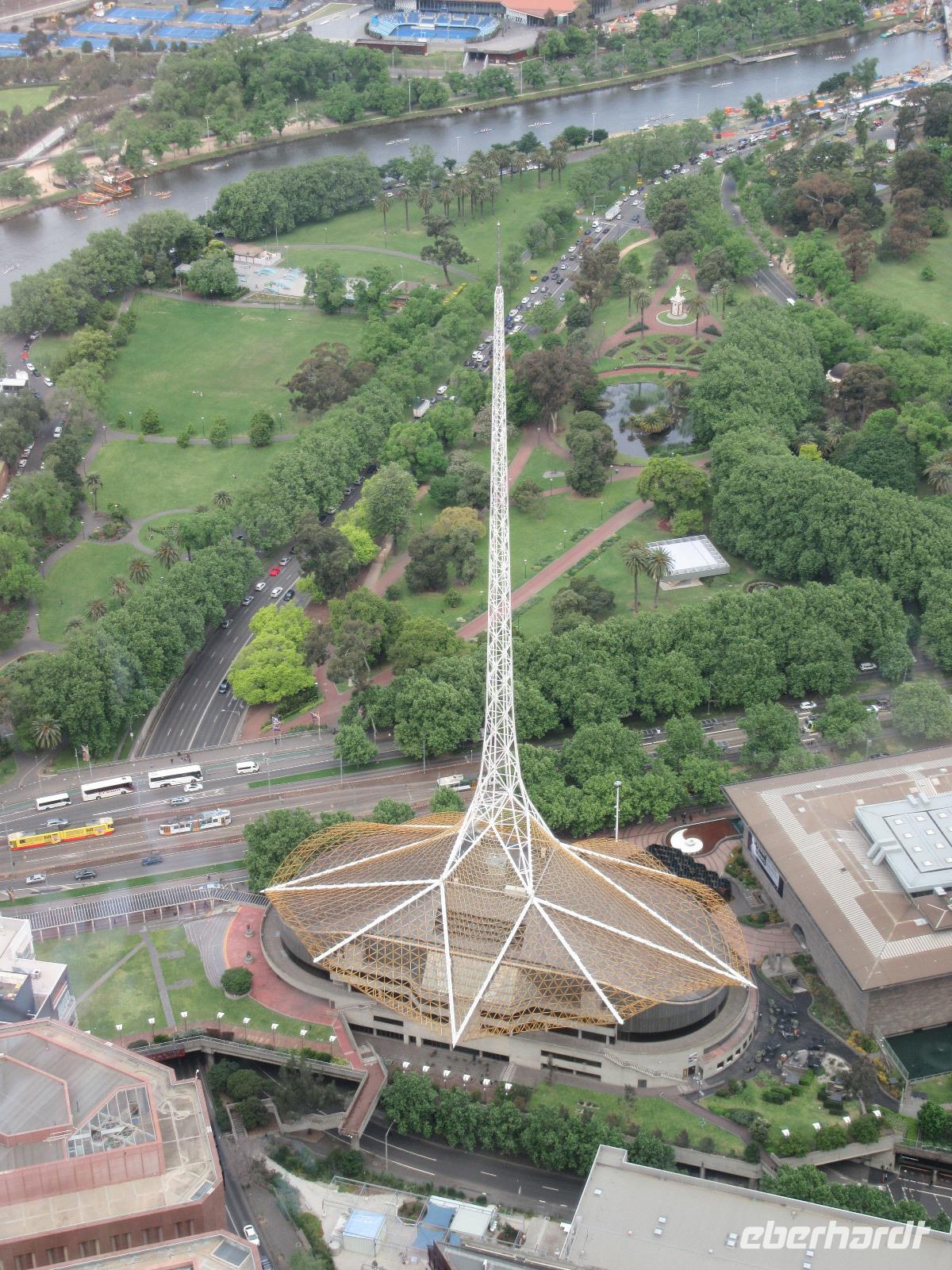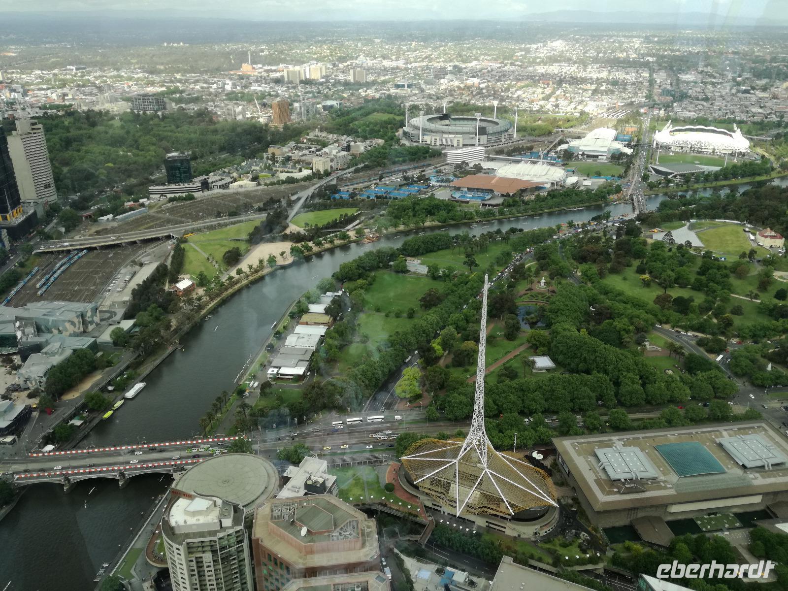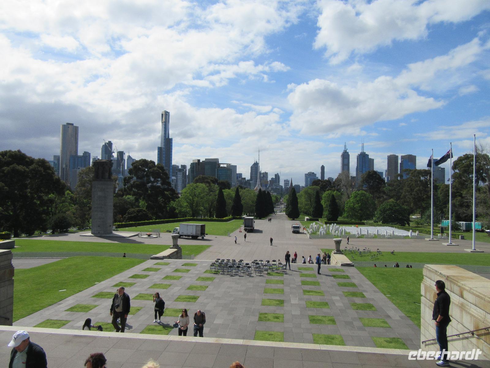 Schon sehr früh werden wir von unserem Fahrer abgeholt und zum Flughafen gebracht. Am Flughafen checken wir dann gemeinsam ein und bereiten uns auf den kurzen Flug nach Melbourne vor. In Melbourne angekommen werden wir von Kirstin, unserer Reiseleiterin für die nächsten zwei Tage, in Empfang genommen. Mit Sack und Pack starten wir dann auch direkt mit unserer Stadtrundfahrt. Erster Stopp ist der Victoria Markt. Hier versammeln sich den ganzen Tag über Händler und verkaufen frisches Obst und Gemüse, Fleisch, Fisch und Spezialitäten aus dem Ausland, sogar einen deutschen Stand finden wir hier. Frisch gestärkt, bei den Leckereien kann man ja gar nicht anders, als zu probieren, fahren wir weiter. Melbourne ist die zweitgrößte Stadt in Australien und zählt zu den lebenswertesten Städten der Welt. Im Vergleich zu Sydney ist es hier etwas „luftiger" zwischen den Straßen. Kreativ, aufregend, multikulti - genau so wird Melbourne beschrieben und wir wollen uns nun davon überzeugen lassen. Wir fahren durch die Straßen des Zentrums, des CBDs, hier sind einige Banken, Büros, Shoppingmalls und Restaurants zu finden. Etwas außerhalb des Stadtzentrums sieht man noch die alten, teils bereits restaurierten Terrassenhäuser. Als nächstes halten wir vor dem Royal Exhibition Gebäude. Es ist ein Ausstellungsgebäude in den Carlton Gardens, neben dem Melbourne Museum und dient u.a. für Ausstellungen und Zwischen 1901 und 1928 tagte das Parlament Victorias ebenfalls hinter diesen Mauern. Nächster Halt ist die St. Patricks Kathedrale in der wir sogar eine kleine Kostprobe des Orgelspiels zu hören bekommen. Direkt neben der kleinen Kathedrale befindet sich der Fitzroy Garten, dieser ist bekannt für Cooks Cottage. Das Haus von Cooks Eltern ist das einzige im 18. Jahrhundert erbaute Gebäude in Melbourne, wurde jedoch ursprünglich in Yorkshire (England) erbaut. 1933 wurde es abgebaut und nach Australien transportiert. Viele Menschen erinnert es heute an den Entdecker der australischen Ostküste, James Cook, der Melbourne und Victoria allerdings nie betreten hat auch das Haus hat nie ihm, sondern seinen Eltern gehört. Der Weg führt uns weiter an einigen Stadien des Olympiaparks vorbei. Wieder im Stadtzentrum steigen wir am Forum aus und machen einen kleinen Spaziergang. Dabei sehen wir u.a. die St. Pauls Cathedrale und überqueren den Yarra Fluss. Von der Brücke aus sieht man sogar noch einmal das Cricket Stadion. Wir steigen noch einmal in den Bus ein um zu einem weiteren und den damit letzten Punkt auf unserer Liste zu fahren. Die botanischen Gärten sind unser Ziel, auch gibt es wieder ein ANZAC Denkmal, dieses bietet uns einen tollen Blick auf die Skyline Melbournes. Kirstin bringt uns noch mit ins Hotel, welches in direkter Nachbarschaft zum höchsten Gebäude Melbournes liegt, dem Eureka Tower.
