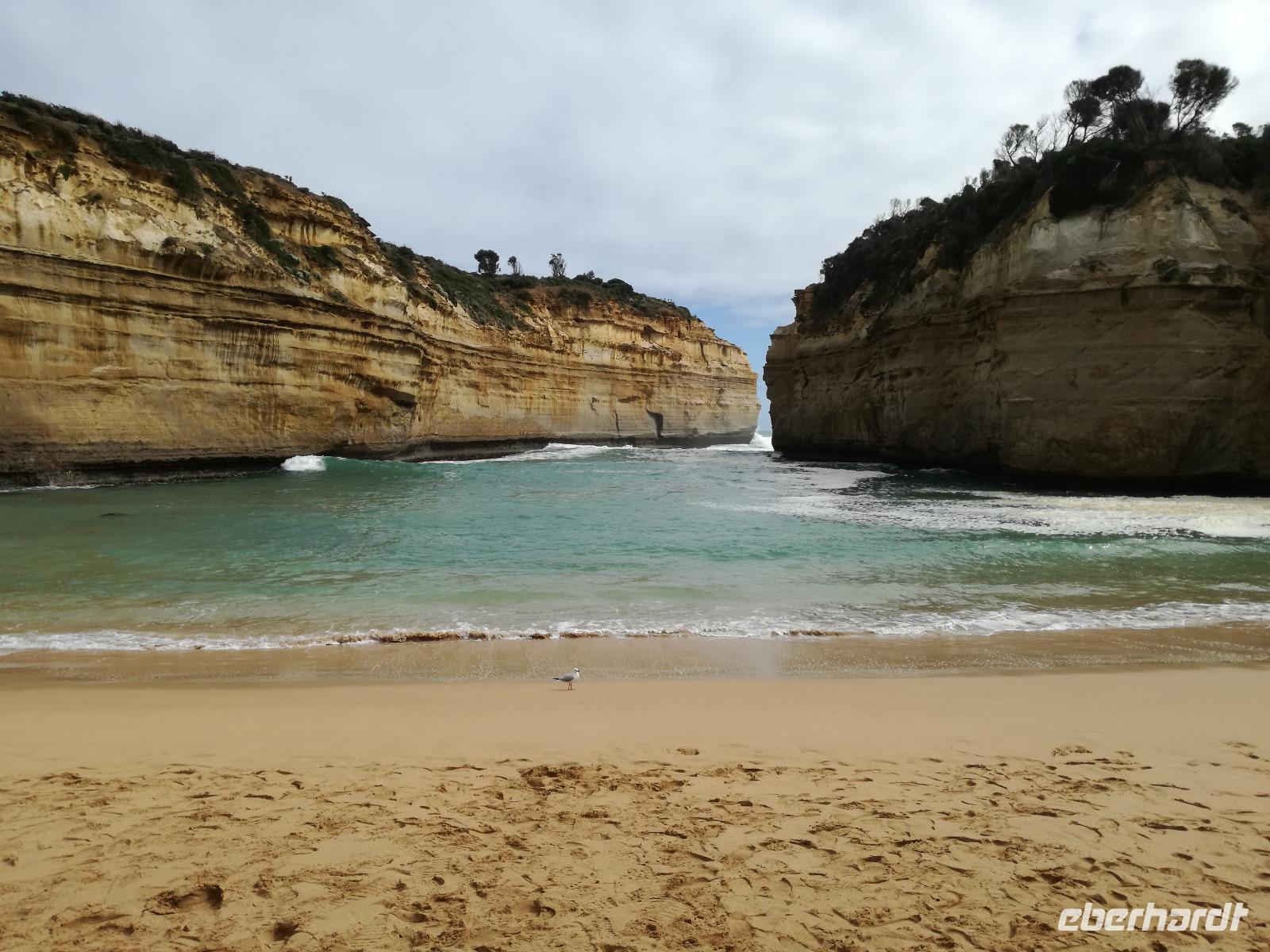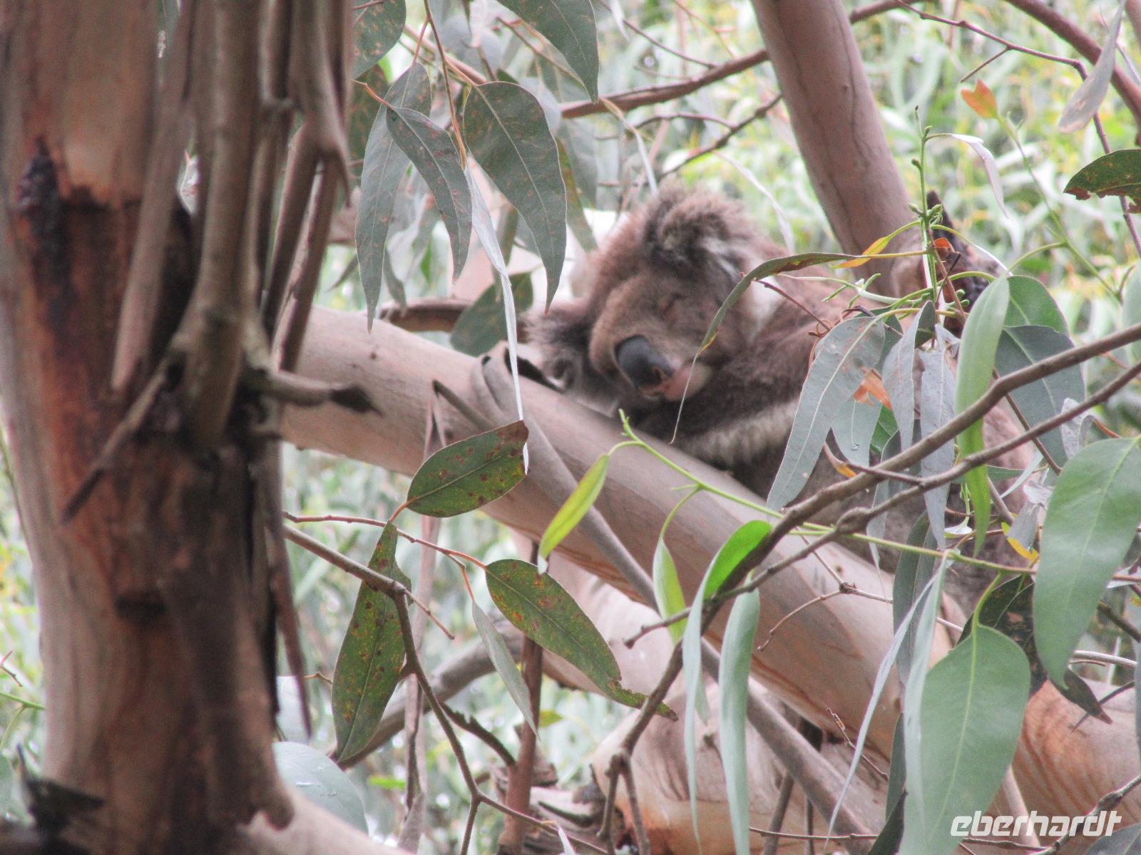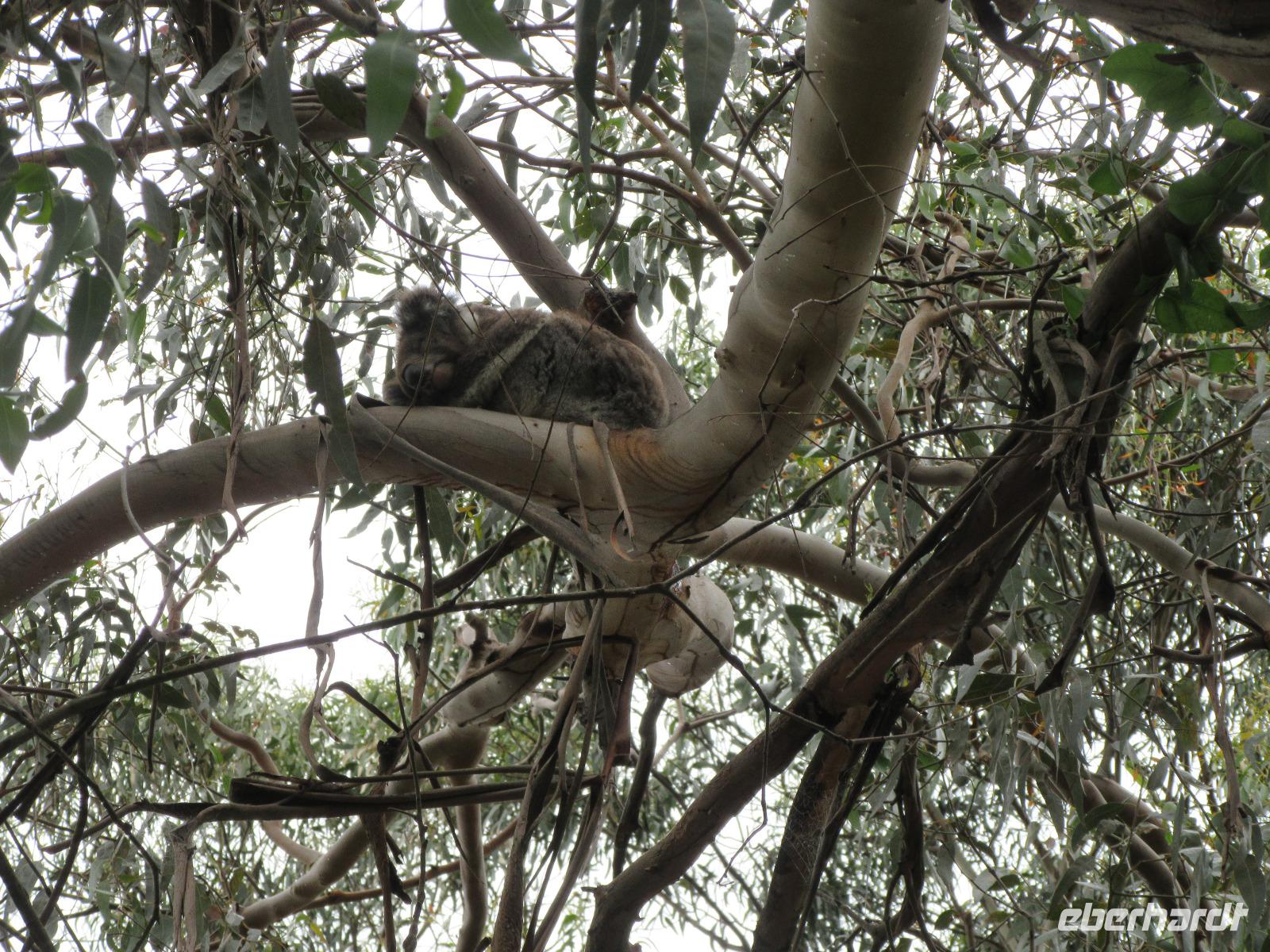 Ein langer, aber auch vielseitiger Tag steht uns heute bevor. Wir beginnen unseren Tagesausflug mit Sonnenschein und guter Laune in Richtung Südwesten. Vorbei an Werribee und Geelong, zwei relativ großen Vororten von Melbourne, erreichen wir Torquay. Nach einer kurzen Pause geht es direkt weiter entlang der Küste. Immer wieder sehen wir große Buchten, lange Sandstrände, das Farbenspiel des Wassers ist wundervoll. Ab und an werden wir von Regenwolken begleitet, vor allem aber immer genau dann, wenn wir für einen Fotostopp anhalten wollen. Aber wir sind ja nicht aus Zucker, richtig? Bevor wir Apollo Bay erreichen, halten wir an einem Campingplatz und werden von bunten Papageien ganz schön auf Trapp gehalten, die flauschigen Koalas scheint das nicht aus der Ruhe zu bringen, im Gegenteil, nicht mal eine Horde Touristen scheint den Schlaf der Tierchen zu stören, hier muss es gutes Eukalyptus geben ;-).