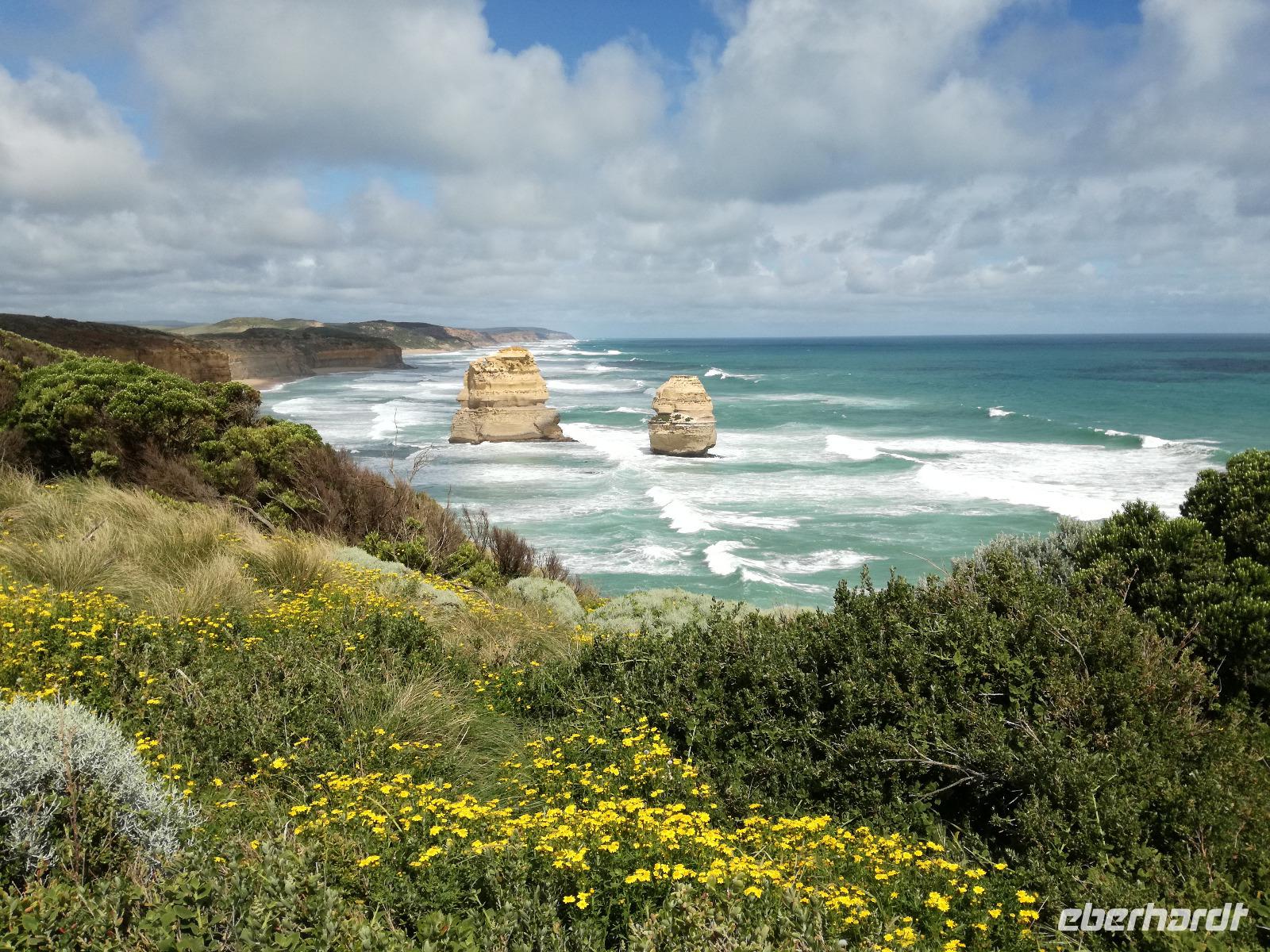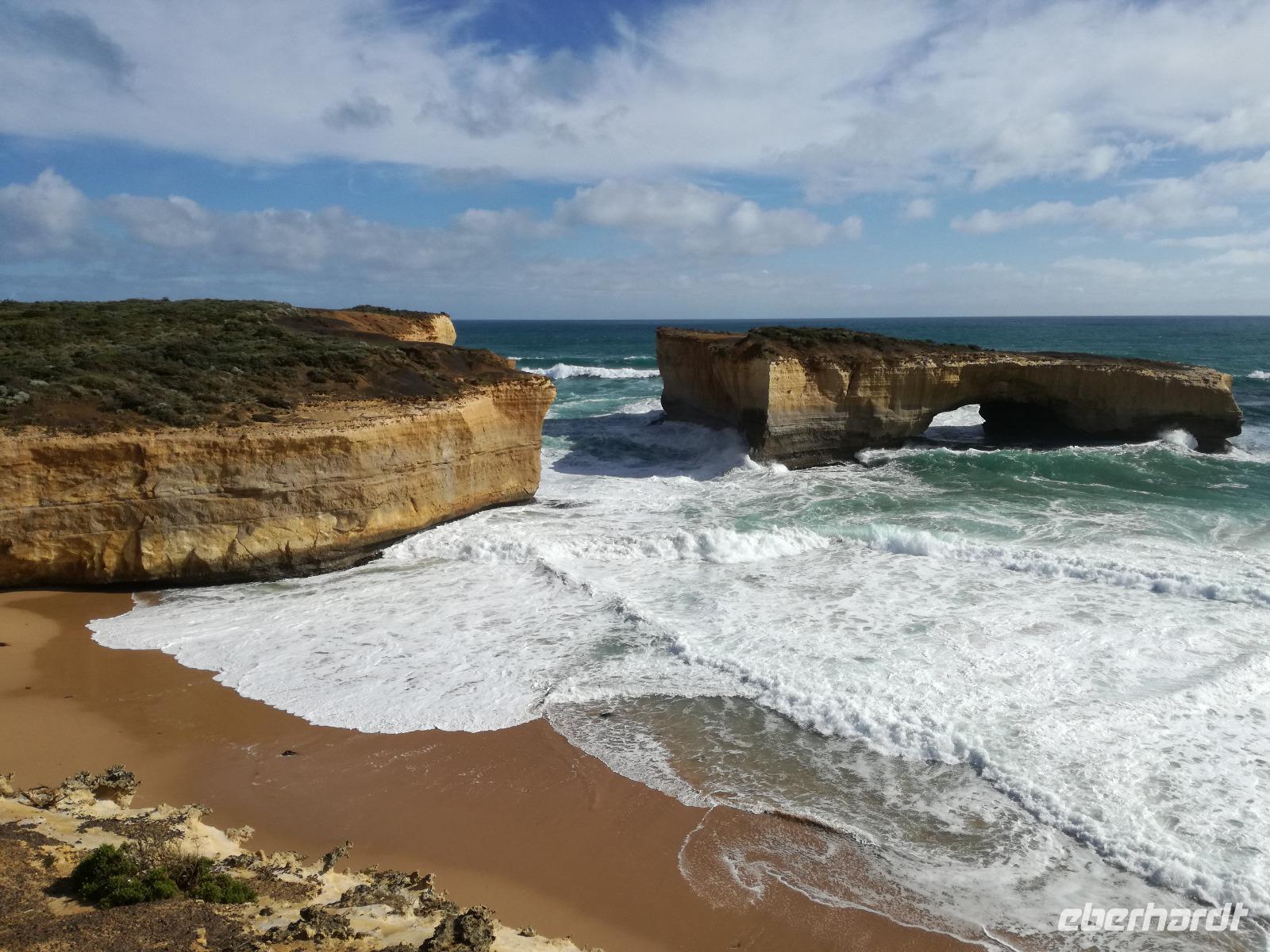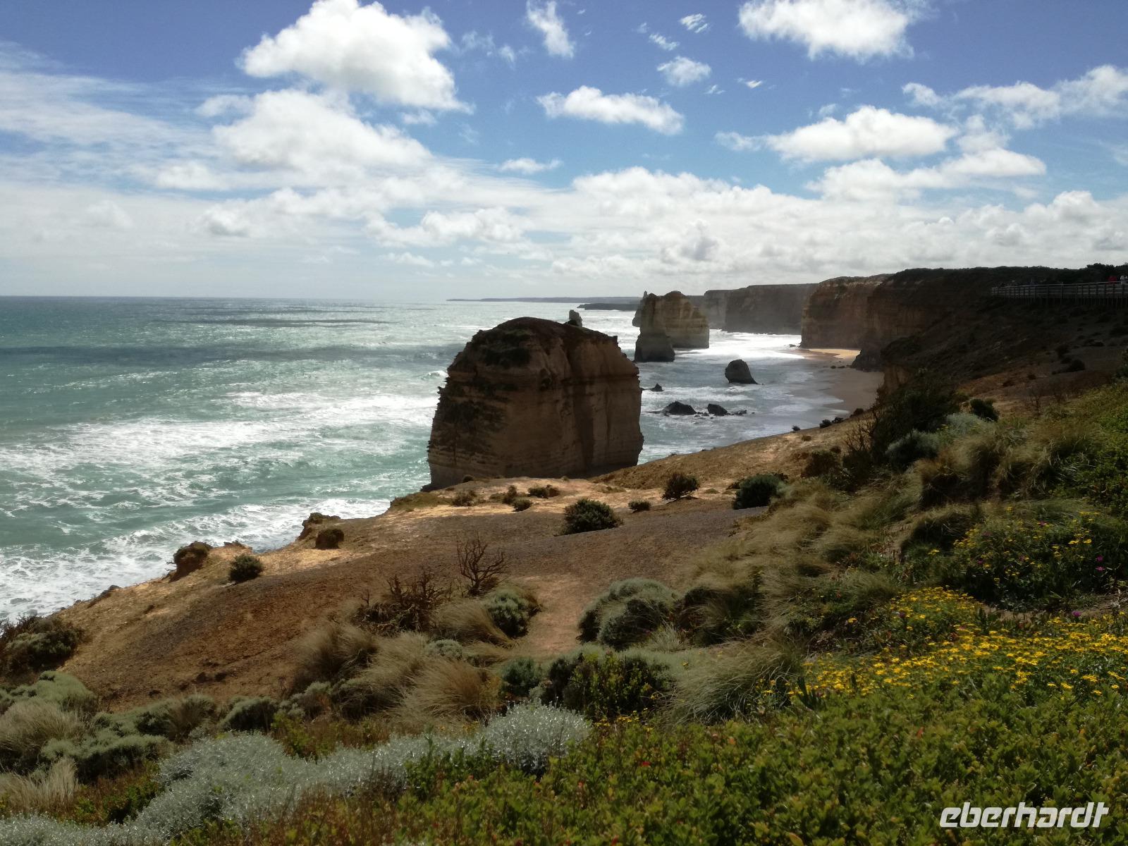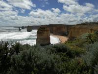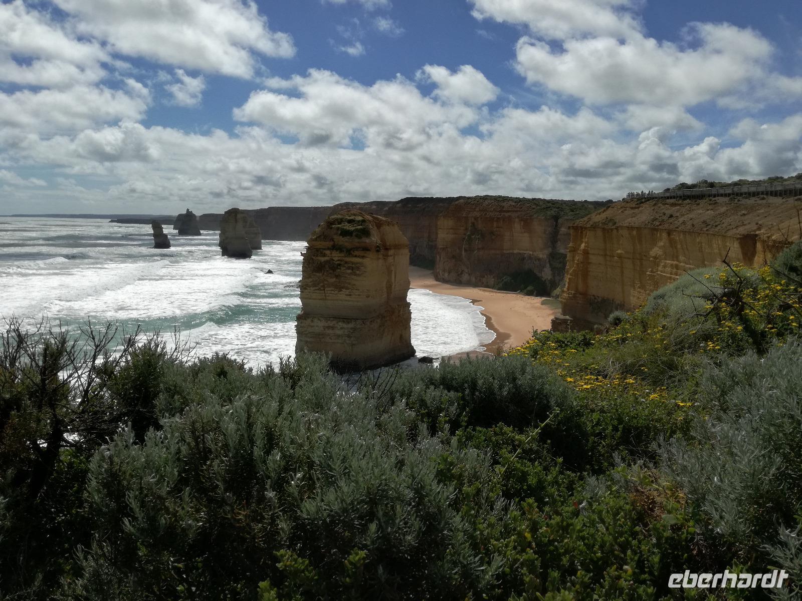 In Apollo Bay angekommen gehen wir im gleichnamigen Hotel Mittagessen, danach haben wir noch etwas Zeit um in den Geschäften zu stöbern und an den Strand zu gehen, trotz Regen. Wir verlassen für eine Weile die Küsten, denn die Straße führt uns nun durch Buschland, ins Hinterland. Immer wieder kann man am Horizont das Meer erspähen. Schließlich erreichen wir die 12 Apostel, die eigentlich nur noch 8 sind. Über einen gut ausgebauten Weg gelangen wir zu verschiedenen Aussichtspunkten und können die raue Steilküste bewundern und zum Glück hält der Regen auch inne und lässt uns diesen Ausblick bei Sonnenschein genießen. Ein weiteres Highlight ist eine Bucht etwas weiter westlich der 12 Apostel. Der Loch Ard Gorge ist eine Schlucht und wurde nach dem Klipper Loch Ard benannt, der in der Nähe vor dem Ende einer dreimonatigen Schiffsfahrt von Großbritannien nach Melbourne im Nebel auf Grund lief und sank. Von 54 Passagieren und der Mannschaft überlebten nur Tom Pearce, ein Schiffsjunge, und Eva Carmichael, eine Irin, die mit ihrer Familie einwandern wollte. Zum Schluss besuchen wir noch die „London Bridge", ebenfalls eine Felsformation an der Great Ocean Road und ein Zeuge der Erosion, denn die Brücke ist leider seit 2009 keine mehr, da in diesem Jahr der Bogen einstürzte. Unsere Reise entlang der Küste neigt sich dem Ende entgegen und wir fahren durch das Hinterland zurück nach Melbourne. Am Abend erreichen wir dann Melbourne wieder, wir verabschieden uns von Kirstin und gehen noch eine Kleinigkeit in der Nähe vom Hotel essen. Den ein oder anderen zieht es sogar noch einmal in die Stadt für einen abendlichen Spaziergang um noch einmal Stadtluft zu schnuppern, bevor es dann morgen ins weite Outback geht.