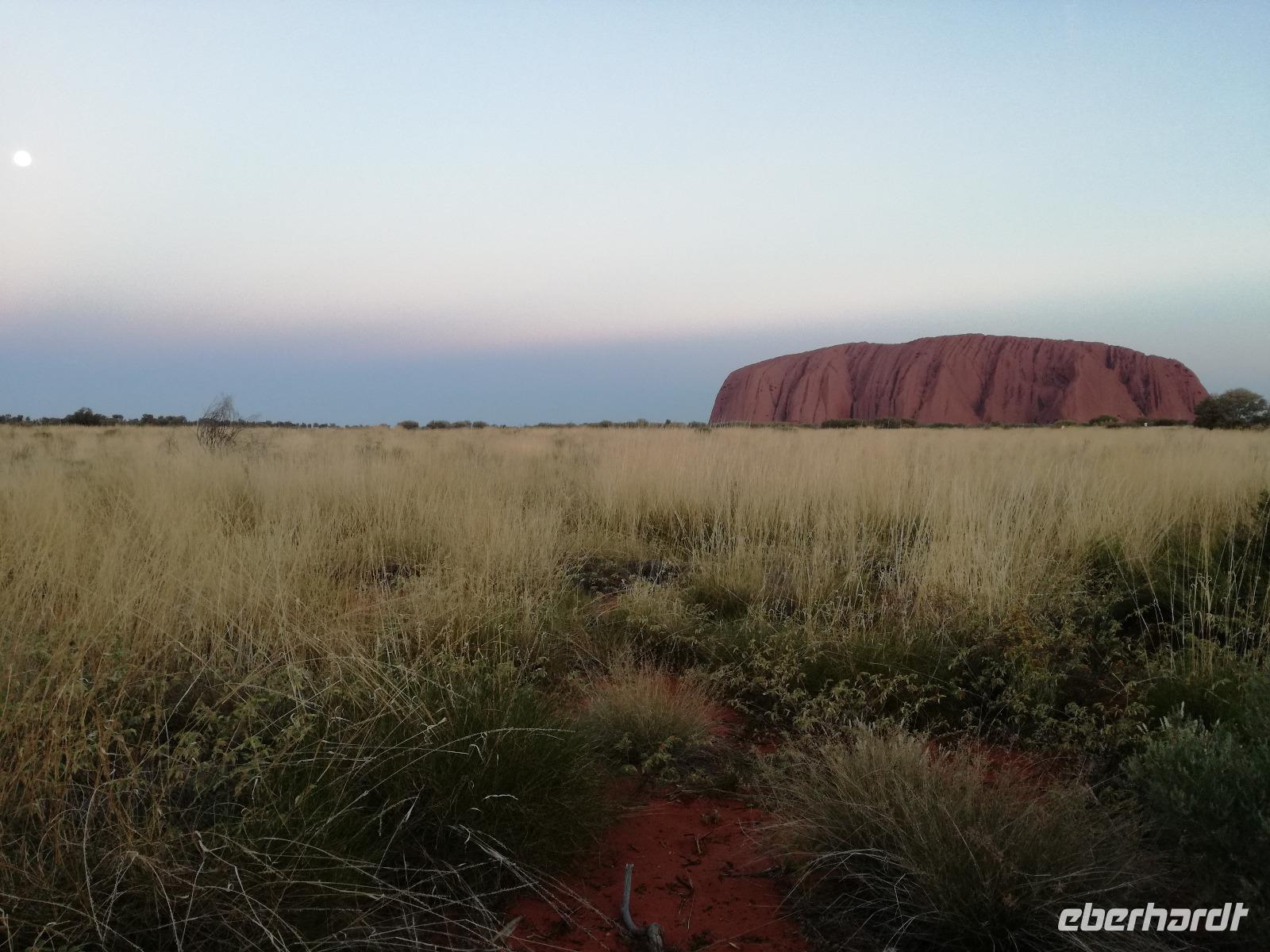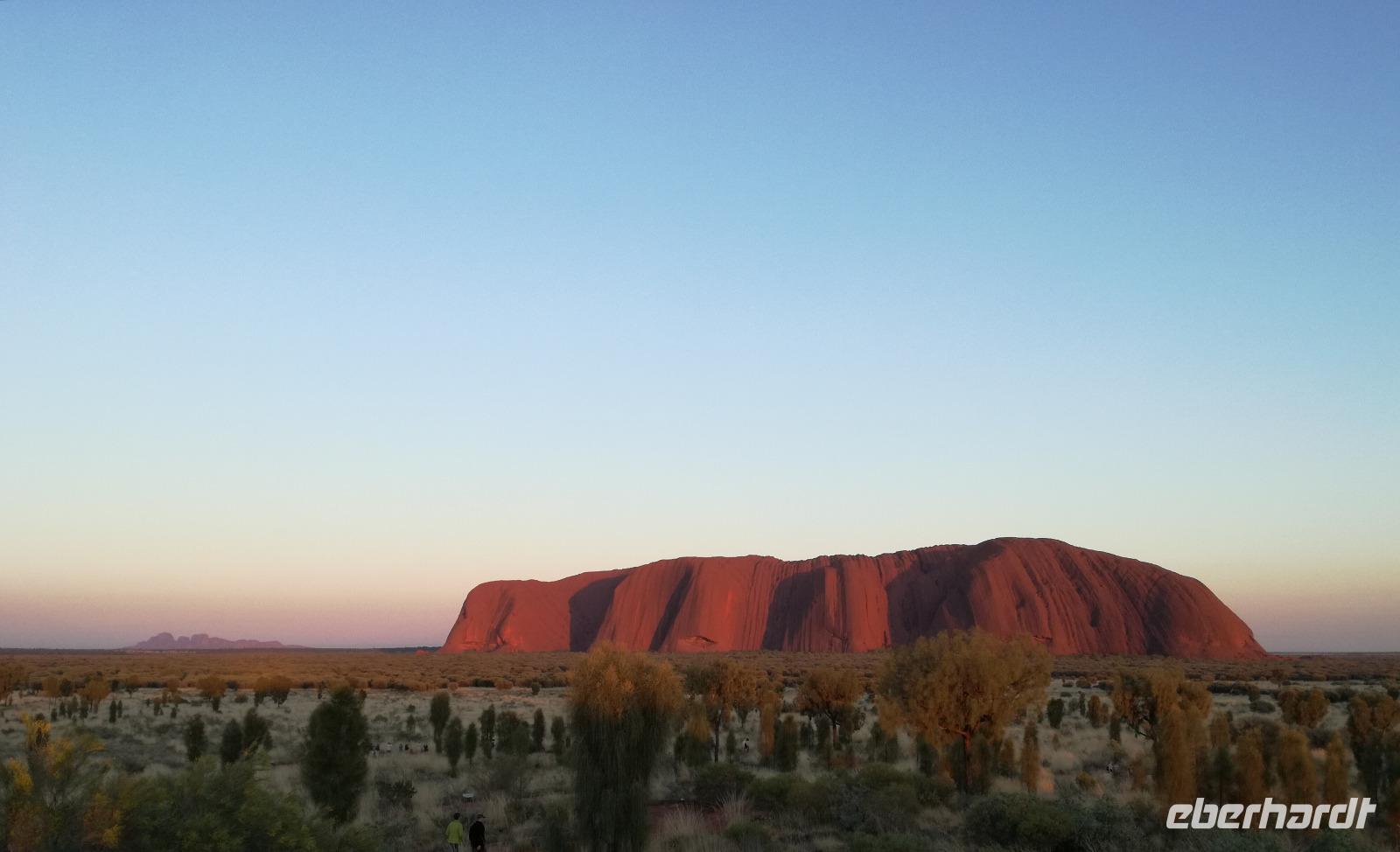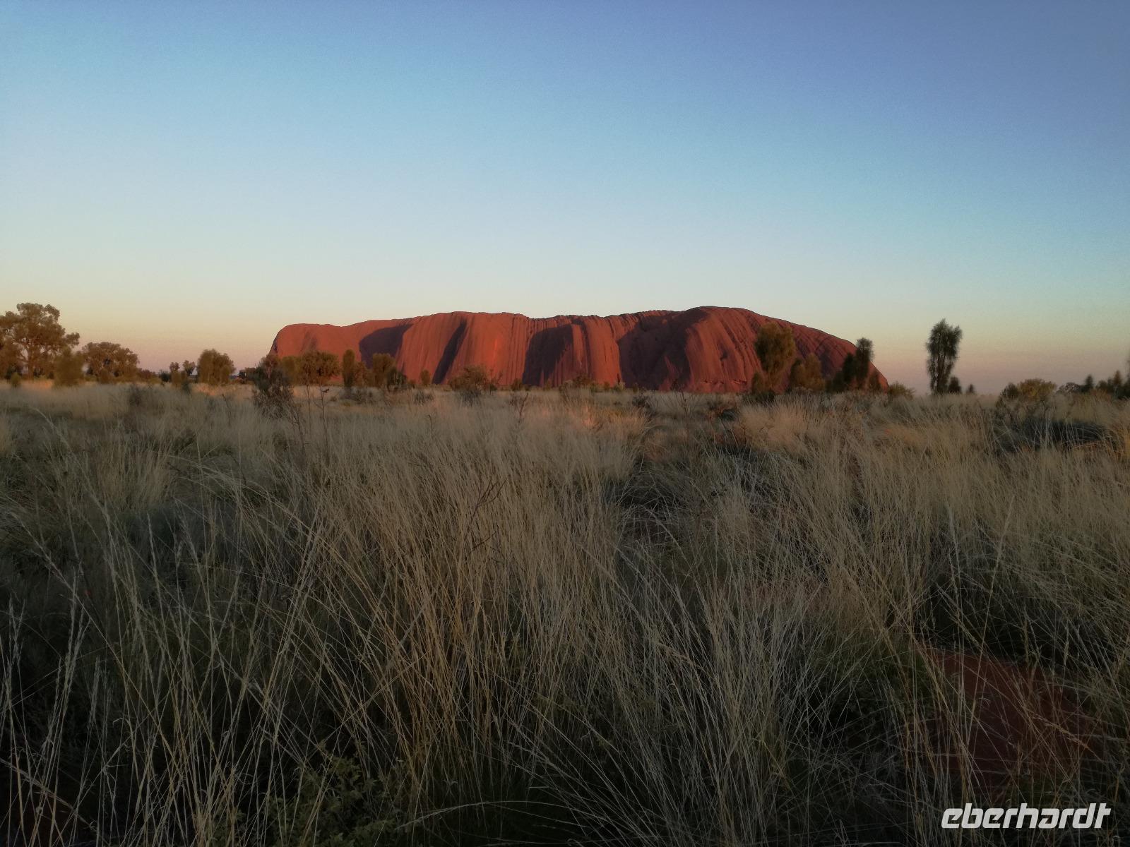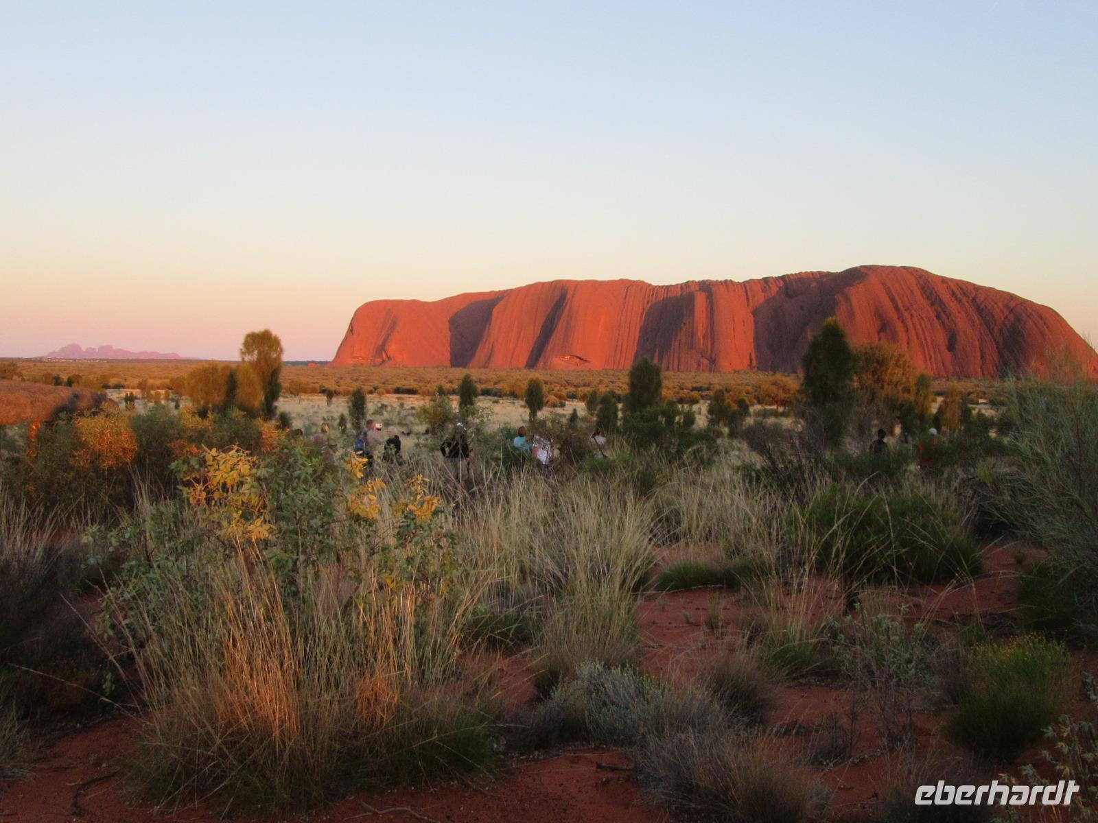 Nach dem Frühstück geht die Reise ins Outback weiter. Wir verlassen Alice Springs und begeben uns in Richtung Süden. Ein scheinbar endlos wirkende lange Straße, die immer nur gerade aus geht... Eva hat viele interessante Infos für uns auf Lager, sodass wir das Outback nicht gänzlich verschlafen, besonders die Idee bezüglich der Helikopterrundflüge weckt das Interesse bei einigen besonders. Nach einer Weile halten wir immer mal wieder an geeigneten und den einzigen Möglichkeiten an um eine Pause einzulegen. Gar nicht so leicht hier draußen, aber wir wurden ja gewarnt, richtig? Am frühen Nachmittag erreichen wir den Ort Ayers Rock Village und beziehen zuerst unser Hotelzimmer, nach einer kurzen Verschnaufpause und einem Snack fahren wir in den Nationalpark. Wir fahren zu den Olgas, Kata Tjuta - Köpfe Viele, und unternehmen eine kleine Wanderung in die Walpa Schlucht. Das ist der einzige Walk den wir aufgrund der Hitze und den steigenden Temperaturen unternehmen können, andere Strecken sind bereits gesperrt. Nach der Wanderung ist es auch schon fast Zeit den Platz für den Sonnenuntergang aufzusuchen. Ein richtiger Höhepunkt unserer Reise - der Sonnenuntergang am Ayers Rock mit einem Glas Sekt in der Hand. Wir genießen das spektakuläre Farbenspiel bis zur letzten Minute. Zurück im Hotel grillen wir unser Abendessen selbst bei einem Barbeque und gehen dann bei Zeiten schlafen, morgen früh müssen wir zeitig aufstehen...