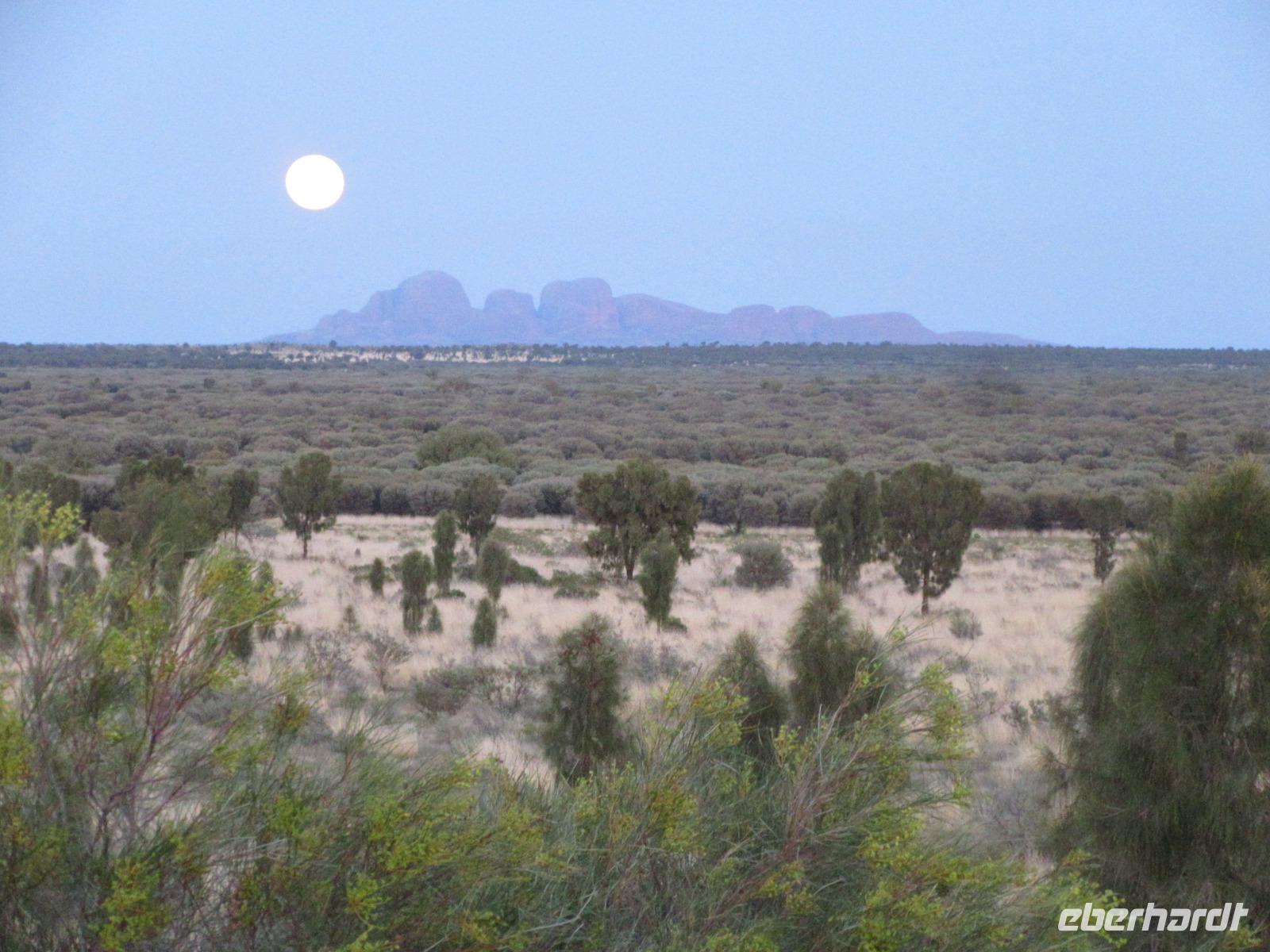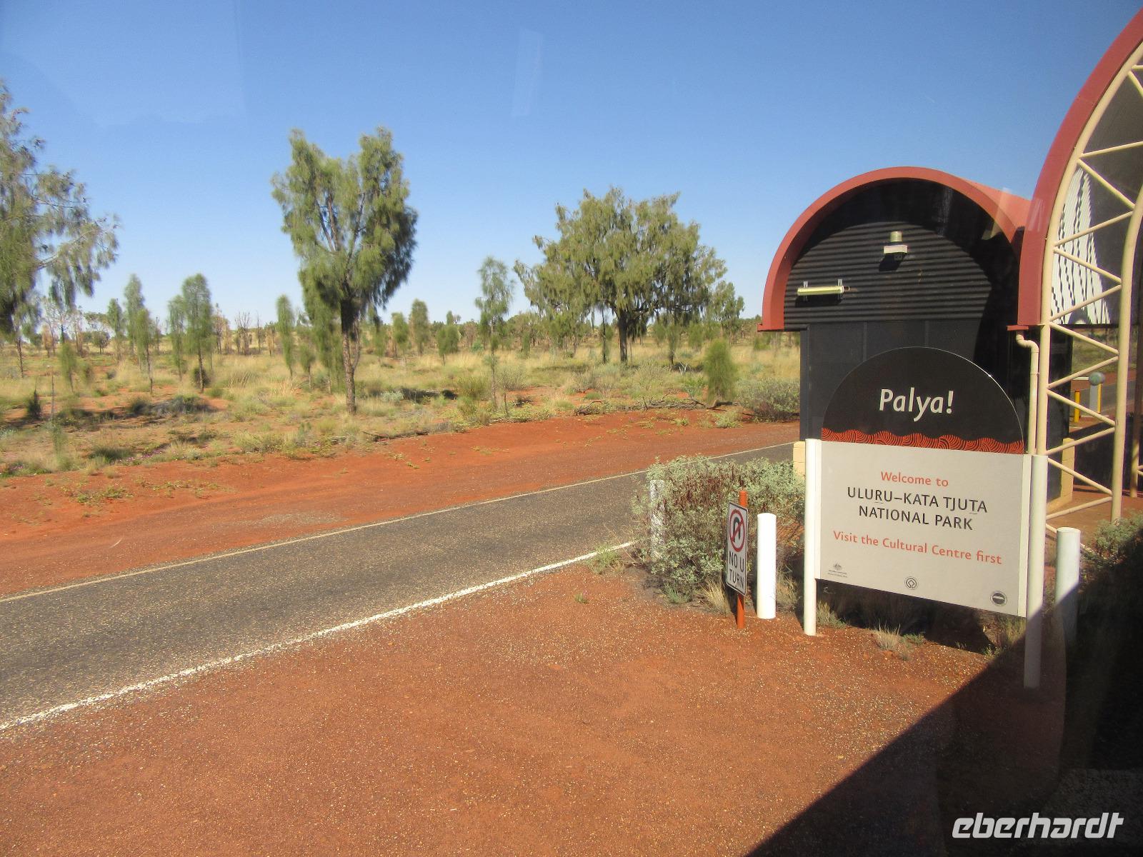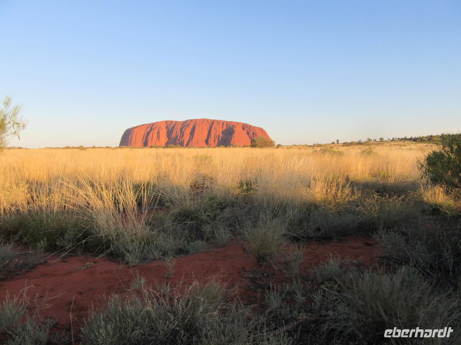 Nach dem Frühstück geht die Reise ins Outback weiter. Wir verlassen Alice Springs und begeben uns in Richtung Süden. Ein scheinbar endlos wirkende lange Straße, die immer nur gerade aus geht... Eva hat viele interessante Infos für uns auf Lager, sodass wir das Outback nicht gänzlich verschlafen, besonders die Idee bezüglich der Helikopterrundflüge weckt das Interesse bei einigen besonders. Nach einer Weile halten wir immer mal wieder an geeigneten und den einzigen Möglichkeiten an um eine Pause einzulegen. Gar nicht so leicht hier draußen, aber wir wurden ja gewarnt, richtig? Am frühen Nachmittag erreichen wir den Ort Ayers Rock Village und beziehen zuerst unser Hotelzimmer, nach einer kurzen Verschnaufpause und einem Snack fahren wir in den Nationalpark. Wir fahren zu den Olgas, Kata Tjuta - Köpfe Viele, und unternehmen eine kleine Wanderung in die Walpa Schlucht. Das ist der einzige Walk den wir aufgrund der Hitze und den steigenden Temperaturen unternehmen können, andere Strecken sind bereits gesperrt. Nach der Wanderung ist es auch schon fast Zeit den Platz für den Sonnenuntergang aufzusuchen. Ein richtiger Höhepunkt unserer Reise - der Sonnenuntergang am Ayers Rock mit einem Glas Sekt in der Hand. Wir genießen das spektakuläre Farbenspiel bis zur letzten Minute. Zurück im Hotel grillen wir unser Abendessen selbst bei einem Barbeque und gehen dann bei Zeiten schlafen, morgen früh müssen wir zeitig aufstehen...