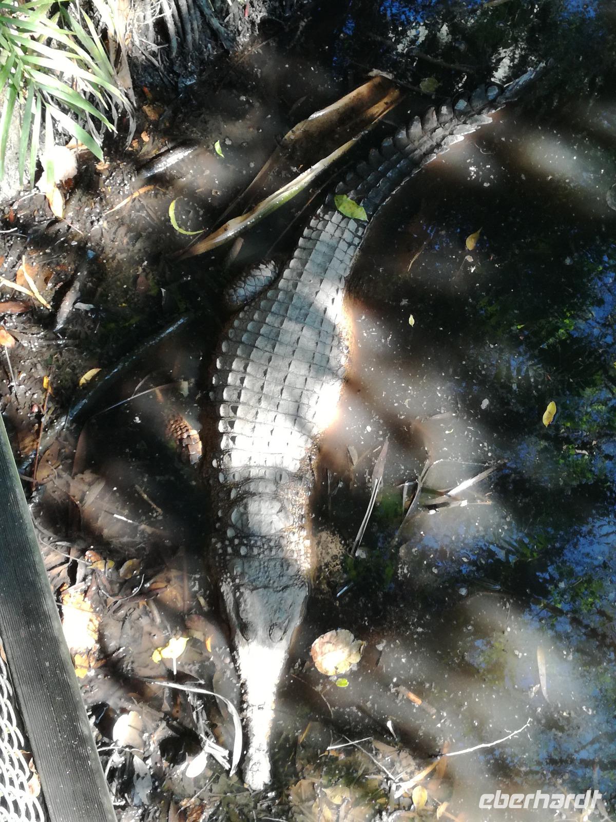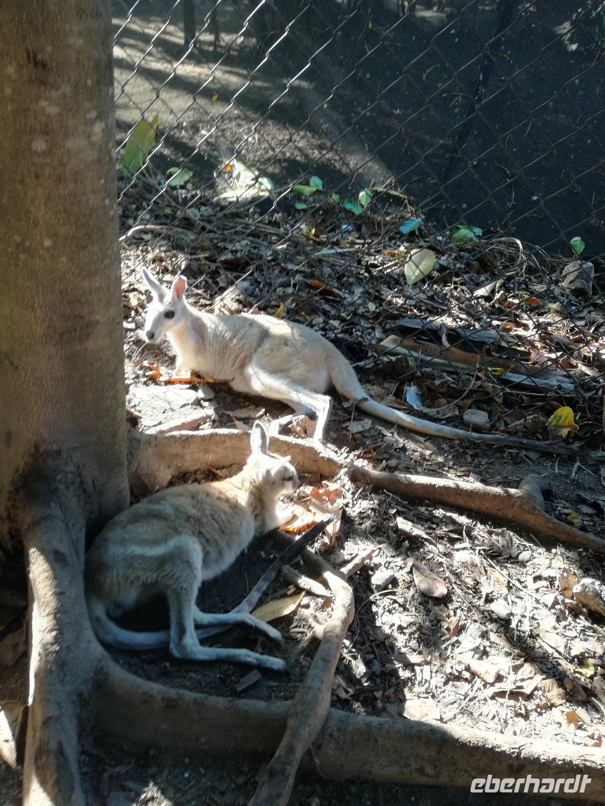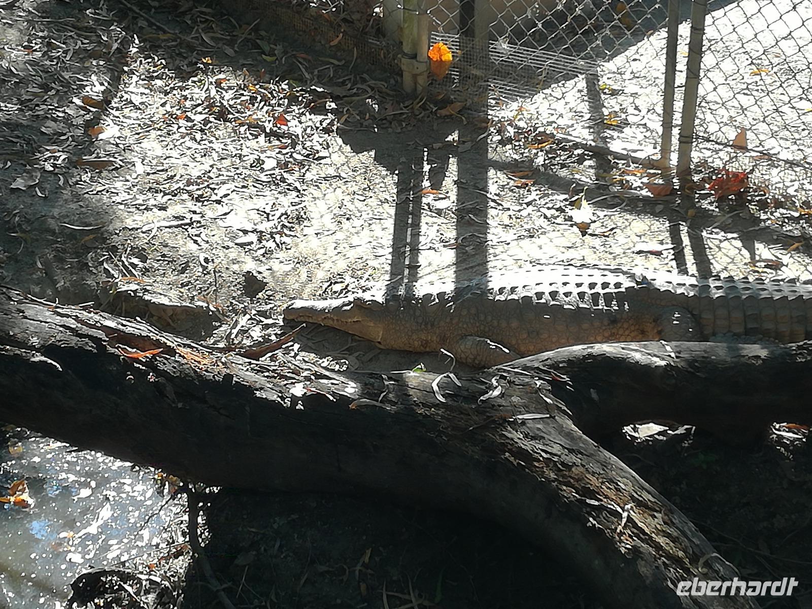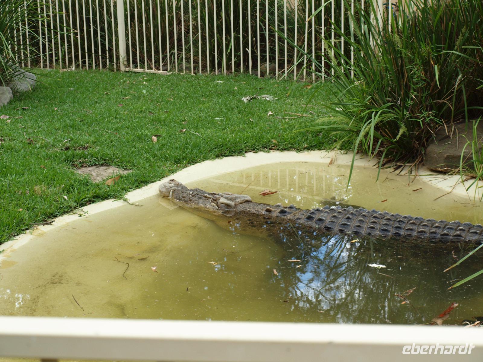 Der heutige Tag steht unter dem Motto „Regenwald" - gemeinsam mit Alfred, unserem heutigen Reiseleiter, fahren wir nach Mossman in den Norden. Hier gibt es auch wieder ein Aborigine-Center und während einer Rauchzeremonie werden wir von bösen Geistern gelöst und es soll wohl auch ein super Moskitoschutz sein. Zweiteres können wir nicht alle bestätigen. Nach der Zeremonie gehen wir im Regenwald spazieren. Über einen Steg, der ein paar Meter über dem Waldboden entlang geht, erreichen wir eine Lichtung. Hier sind bereits ein paar Leute und vergnügen sich im kühlen Nass. Weiter geht es zur Hängebrücke mit einem schönen Blick zur Schlucht. Zurück im Center fahren wir weiter in den Daintree. Hier erwartet uns zum Mittag ein kulinarisches Highlight. Sehr exotisch und schmackhaft. Gut gestärkt können wir uns nun den Krokodilen nähern... leider scheinen diese aber keinen Appetit zu haben... Während unserer Bootstour auf dem Daintree Fluss sehen wir zwar viele Pflanzen und Vogelarten, aber leider, oder soll ich besser sagen, glücklicherweise, kein Krokodil. Damit wir aber nicht ganz ohne Kroko-Fotos nach Hause müssen, steht der Besuch des Wildlife Habitats noch auf dem Programm. Hier sehen wir noch einmal die wilde tierische Seite Australiens und können noch einmal mit den Kängurus auf Kuschelkurs gehen. In einem anderen Gehege sehen wir dann auch die gefährlichen Krokodile, die aus dieser Perspektive gar nicht so furchteinflößend aussehen.