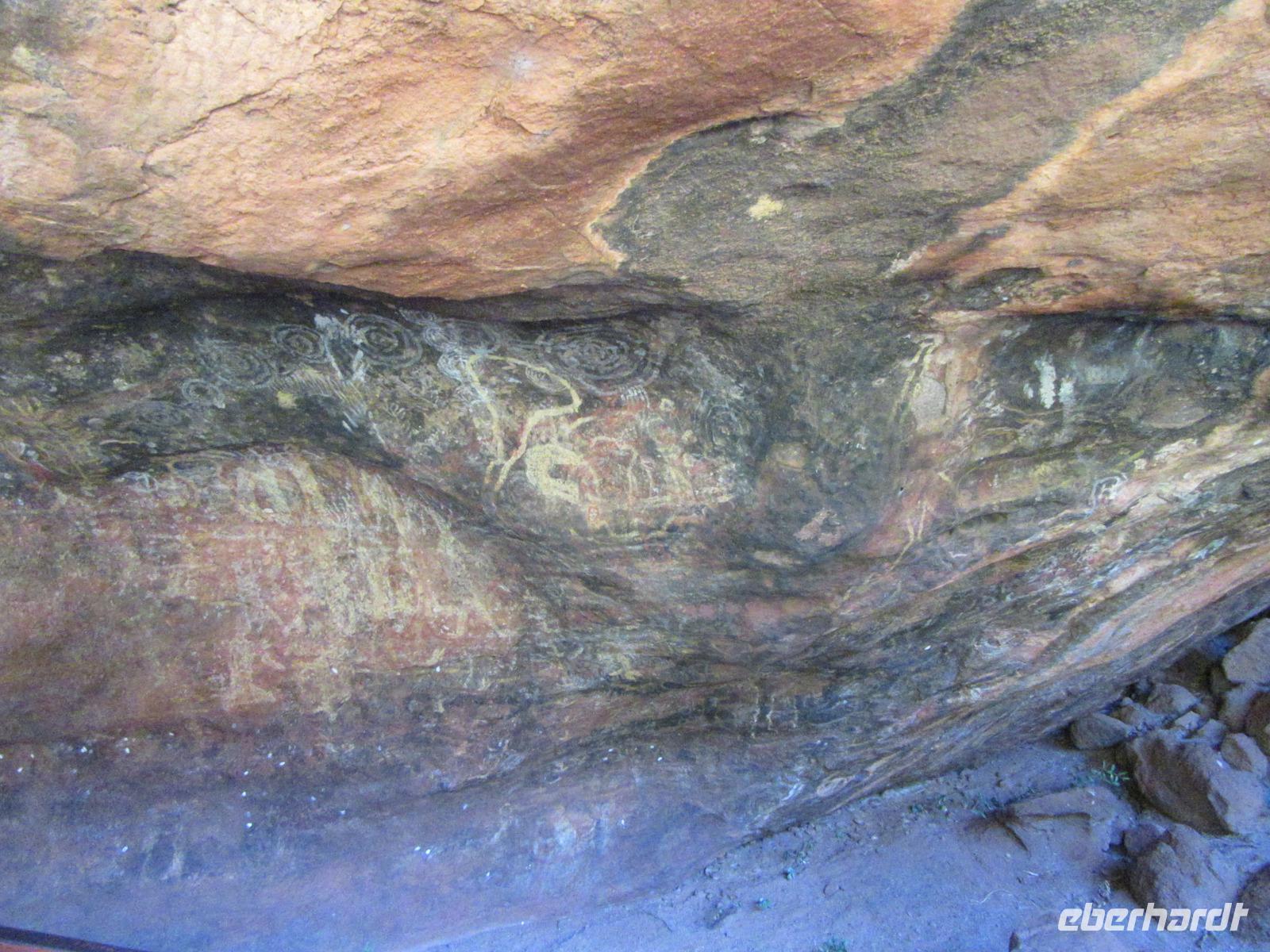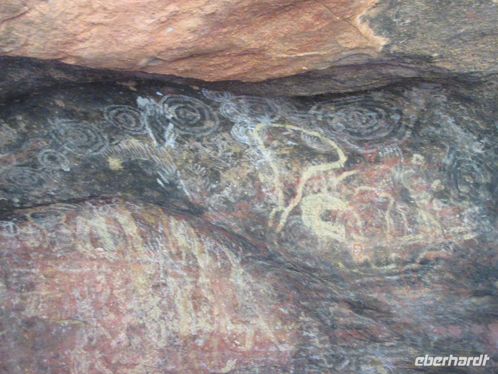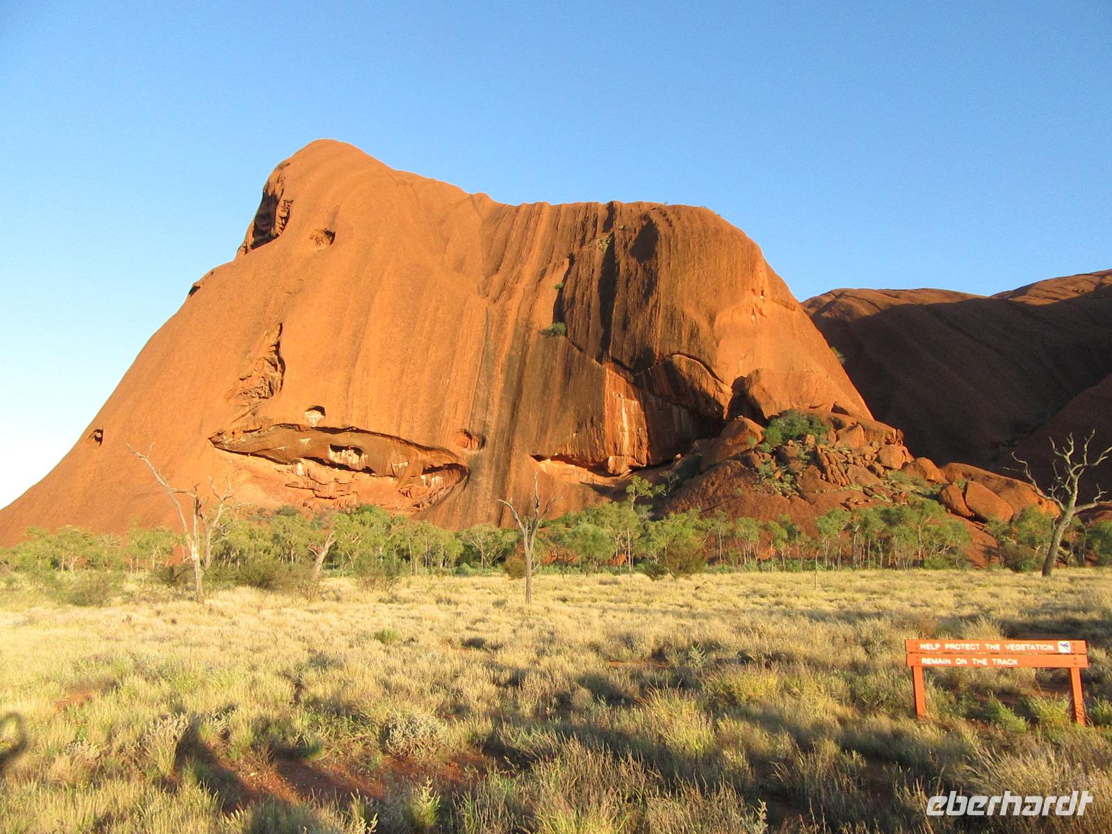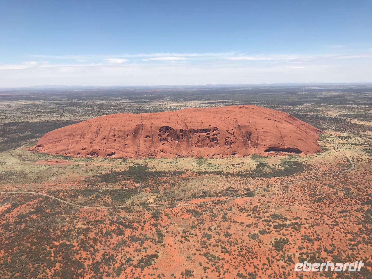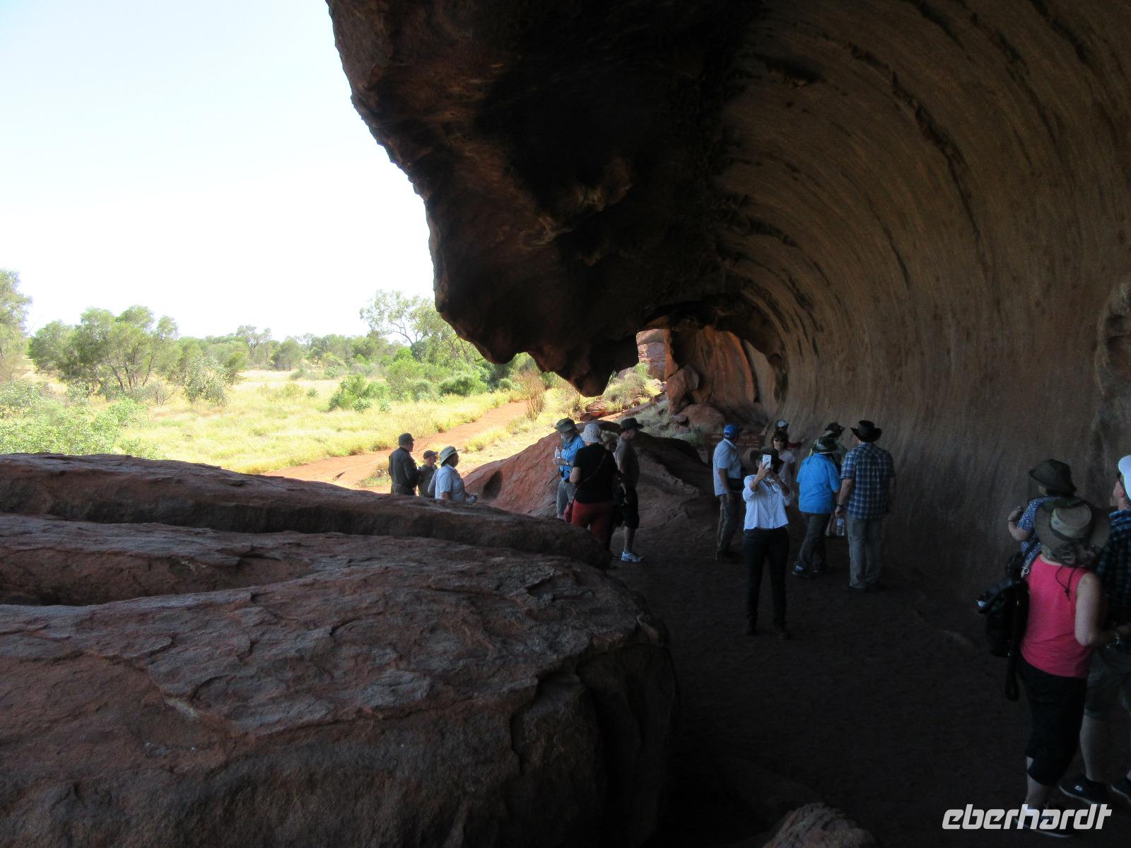 ... um 04:30 Uhr klingeln die Telefone. Pünktlich stehen wir zur Abfahrt bereit und fahren wieder in den Nationalpark. Diesmal stehen wir auf der anderen Seite des Uluru und sehen beim Sonnenaufgang dem Farbenspiel zu. Bevor wir zum Frühstück fahren unternehmen wir noch einen kleinen Spaziergang zu einem Wasserloch. Der Walk nennt sich Kuniya Walk und hier erzählen sich die Aborigines folgende Geschichte: „Kuniya (Schlange) kam aus einem weit entfernten Bereich im Osten, um am Uluru ihre Kinder zur Welt zu bringen. Sie trug die Eier um den Hals gebunden wie eine Kette und legte sie zur Rast an der nordöstlichen Ecke des Ulurus, Kuniya Piti, ab. Kuniya nächtigte bei Taputji, einem anderen Platz am Uluru, und jagte in den nahen Sandhügeln. Irgendwann hörte sie Kampfgeräusche auf der anderen Seite des Uluru und eilte so schnell sie konnte dort hin. Sie formte tiefe Furchen in den Fels, die man heute noch sehen kann. Als sie auf der anderen Seite ankam sah sie ihren Neffen Kuniyawati tot am Boden liegen. Kuniya war voller Gram und Wut und wandte sich an den Liru, der wohl dafür verantwortlich war. Sie wurde von ihm wegen eben jener Wut verspottet, worauf sie in einem Tanz voller Macht und Magie sich zu einer Frau verwandelte. Sie verfluchte das Land des Liru uns durchtränkte die Erde mit Gift. Der Liru jedoch verspottete sie immer weiter und ihre Wut wurde noch größer. Nun erhob sie ihren Wana, den Grabstock und schlug auf den Kopf des Liru, dieser lachte immer weiter, also schlug sie noch zweimal auf ihn ein bis er tot am Boden lag." Die Schläge der Kuniya sind noch heute im Felsen des Uluru als Risse zu sehen. Es ist Zeit für's Frühstück, im Kulturzentrum am Ayers Rock ist für uns das Buffet bereit und wir stärken uns für den Tag. Ein weiterer Spaziergang nach dem Essen zeigt uns ein paar Höhlen, Malereien und ein weiteres Wasserloch. Unser Weg führt uns an einigen spirituell sehr wichtigen Stellen der Aborigines und am Aufstieg vorbei. Es ist nun mittlerweile sehr warm geworden und unsere Reise durch das Outback ist ebenfalls fast zu Ende. Für ein paar von uns steht noch ein Highlight auf dem Programm und sie fliegen mit einem Helikopter über dem Uluru und den Kata Tjuta. Wir treffen uns alle wieder im Zentrum und fahren schließlich unsere Koffer holen und anschließend zum Flughafen. Von Eva müssen wir uns nun auch schon wieder verabschieden und gehen nach und nach durch den Check-In. Nach einem weiteren kurzen Flug erreichen wir Cairns und werden von Gabi in Empfang genommen. Sie bringt uns zum Hotel und gibt uns für die nächsten Tage einen kleinen Überblick über das Programm. Für den Abend treffen wir uns im Hotelrestaurant wieder und lassen ihn beim gemeinsamen Abendessen ausklingen.