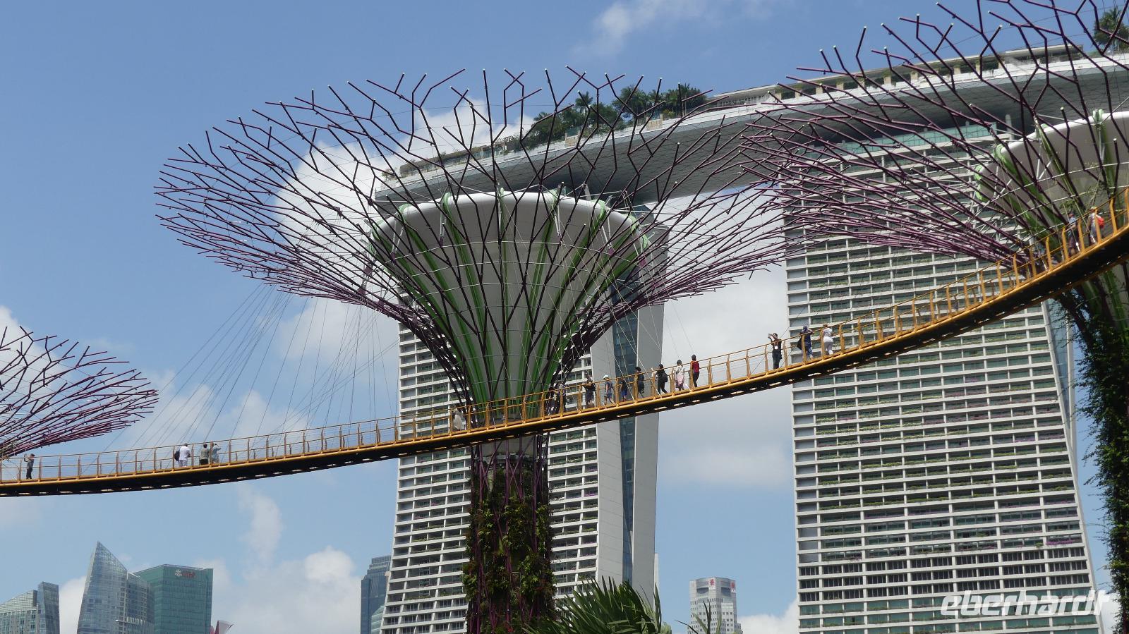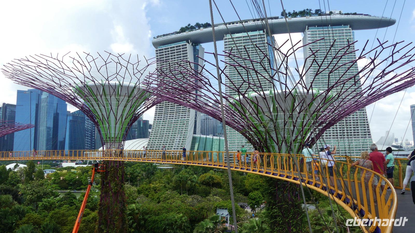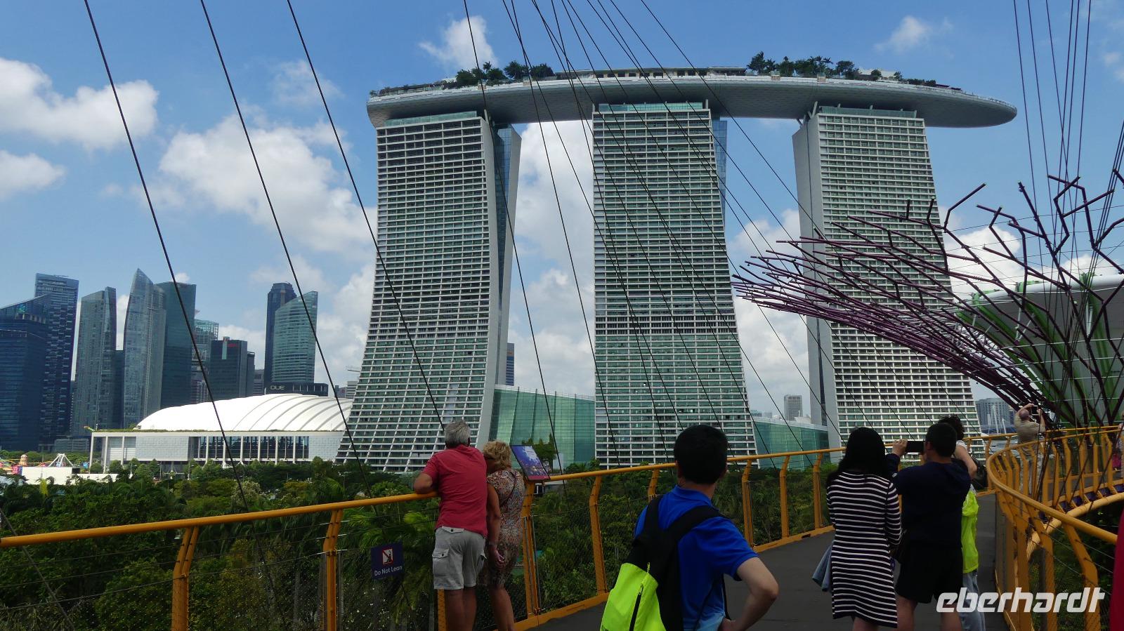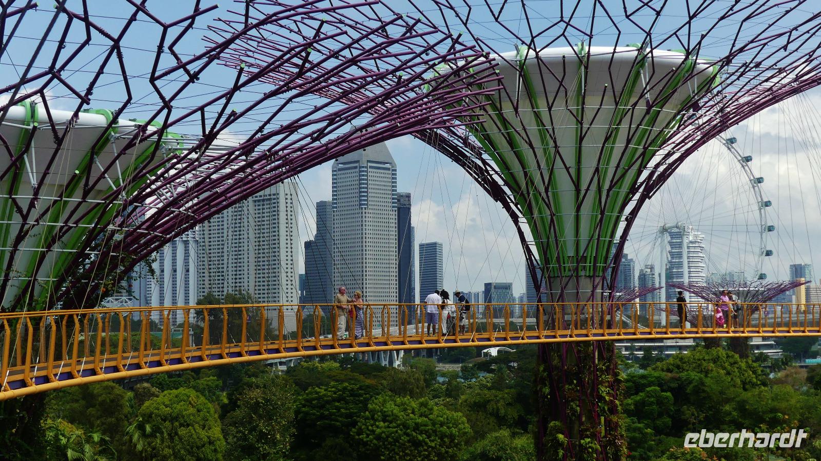 Am Vormittag geht es gleich nochmal zum Marina Bay Sands Hotel. Einer der drei Taxifahrer hat es mit der Zielangabe nicht so genau genommen, so dass wir uns erstmal finden müssen... Unser Ziel ist der Skypark, also die Aussichtsplattform auf dem „Bügeleisen". Das Wetter spielt gut mit, die Sonne strahlt und die Sicht aus 200 Meter Höhe ist auch gut. Etwas um die Ecke können wir den Infinity Pool erblicken. Außerdem sehen wir die Wolkenkratzer des Bankenviertels, Riesenrad und unser nächstes Ziel, den tropischen Garten mit den Superbäumen, Gardens by the Bay. Der Garten mit den künstlichen Superbäumen bietet zusammen mit dem Marina Bay Sands Hotel eine super Kulisse. Einige von uns nehmen den sogenannten Skyway, den Pfad oben entlang an den Kronen der Superbäume.