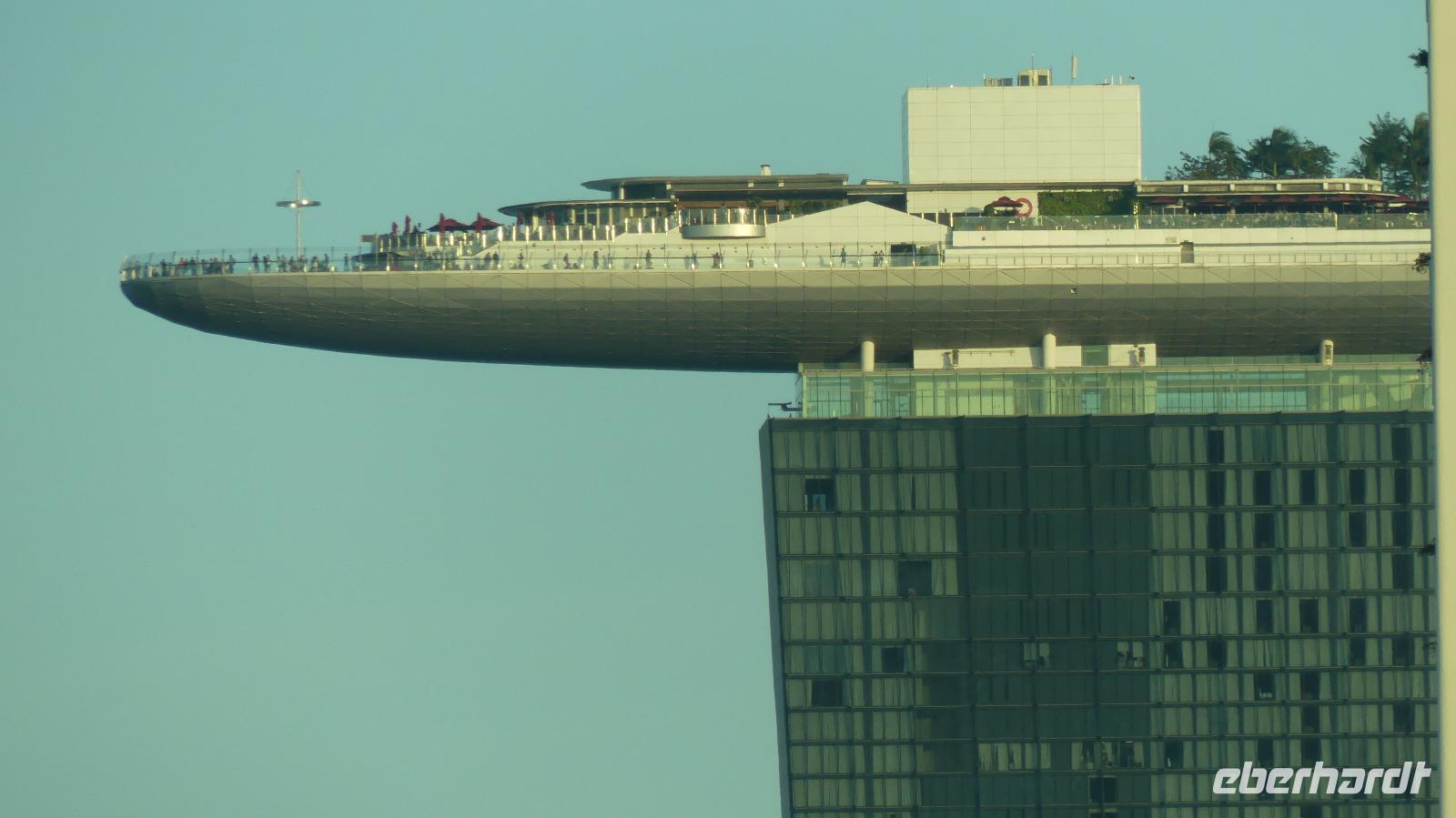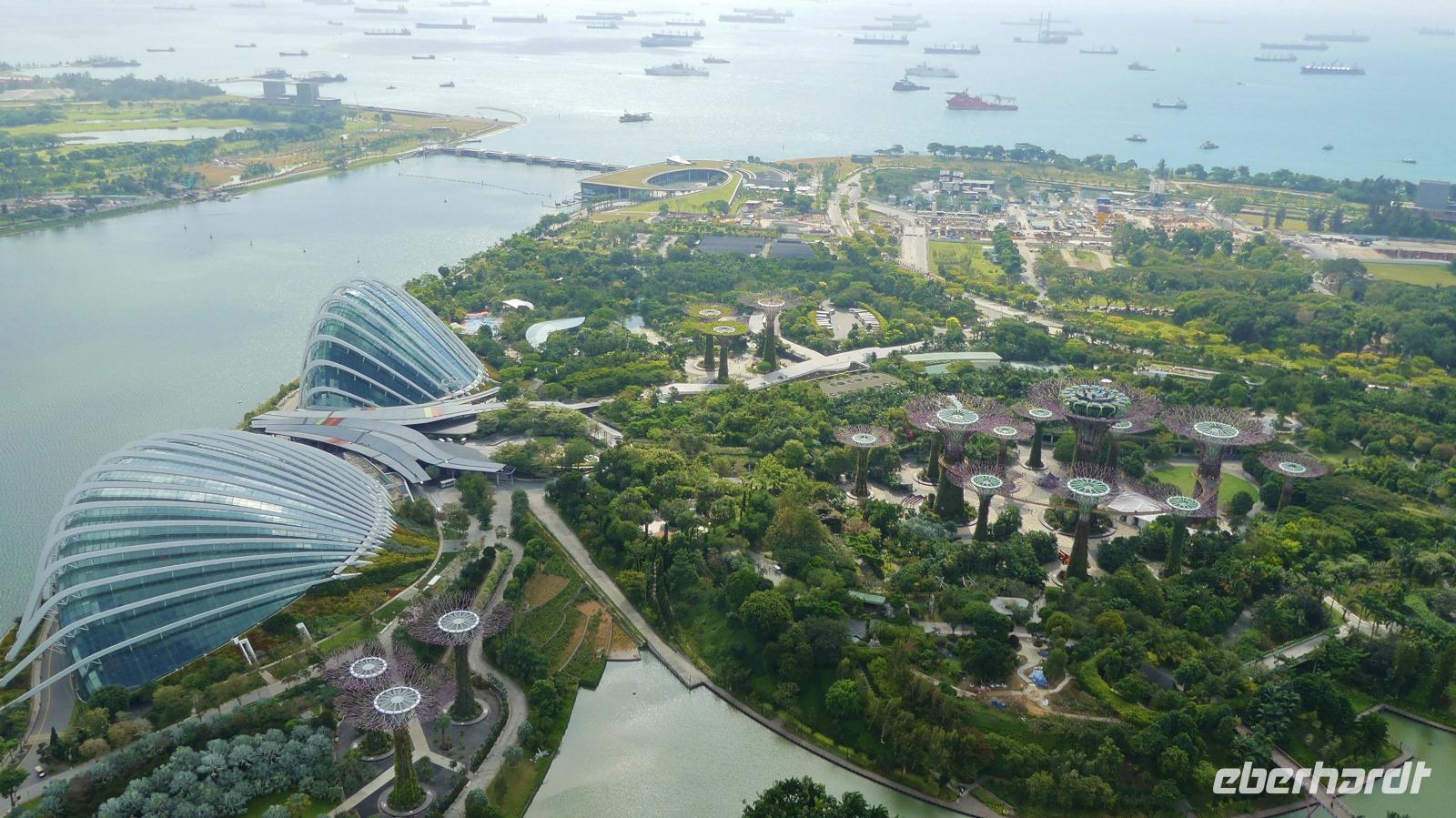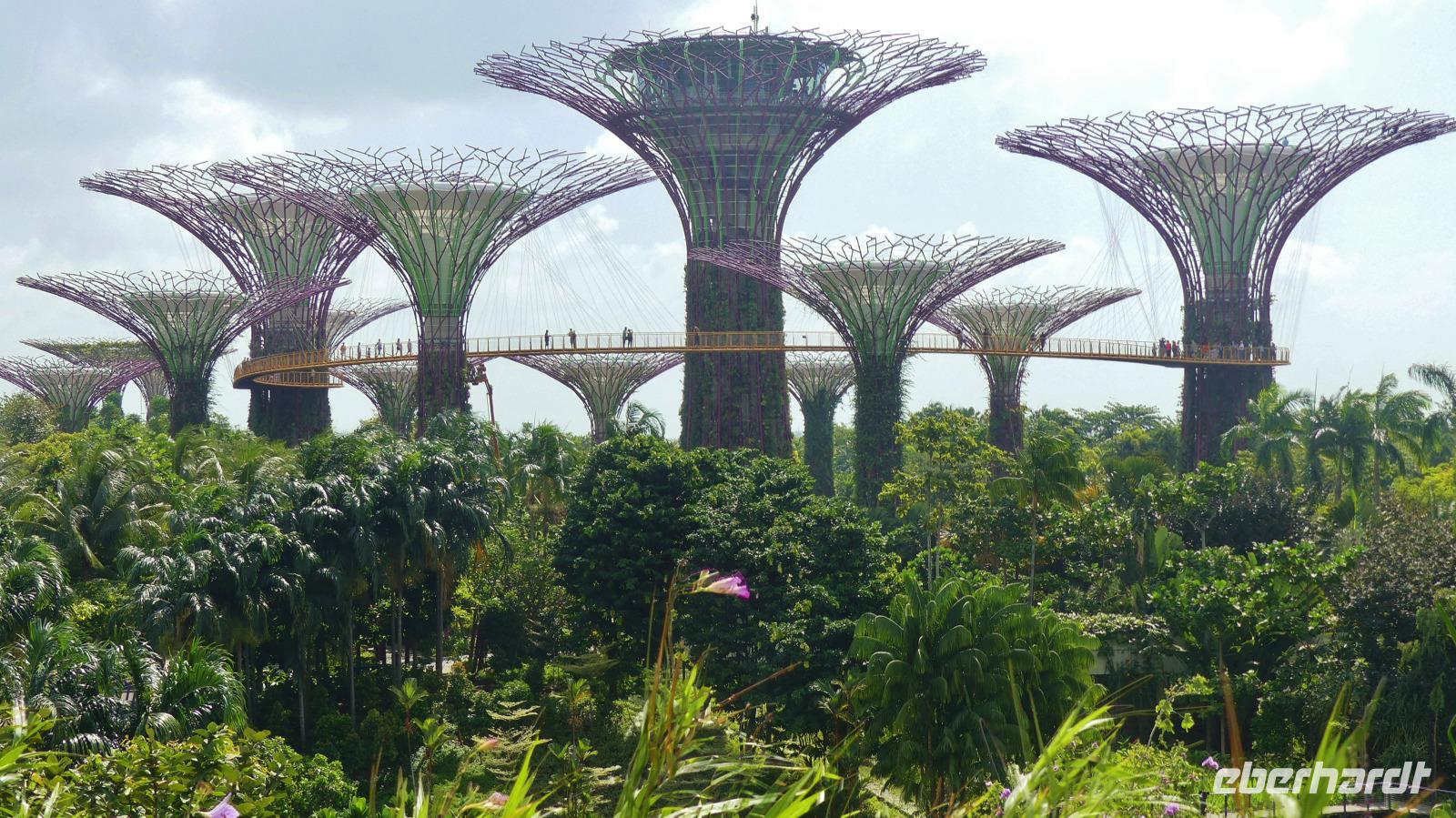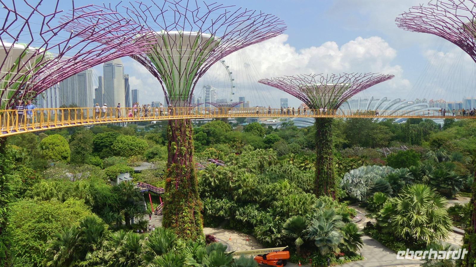 Am Vormittag geht es gleich nochmal zum Marina Bay Sands Hotel. Einer der drei Taxifahrer hat es mit der Zielangabe nicht so genau genommen, so dass wir uns erstmal finden müssen... Unser Ziel ist der Skypark, also die Aussichtsplattform auf dem „Bügeleisen". Das Wetter spielt gut mit, die Sonne strahlt und die Sicht aus 200 Meter Höhe ist auch gut. Etwas um die Ecke können wir den Infinity Pool erblicken. Außerdem sehen wir die Wolkenkratzer des Bankenviertels, Riesenrad und unser nächstes Ziel, den tropischen Garten mit den Superbäumen, Gardens by the Bay. Der Garten mit den künstlichen Superbäumen bietet zusammen mit dem Marina Bay Sands Hotel eine super Kulisse. Einige von uns nehmen den sogenannten Skyway, den Pfad oben entlang an den Kronen der Superbäume.