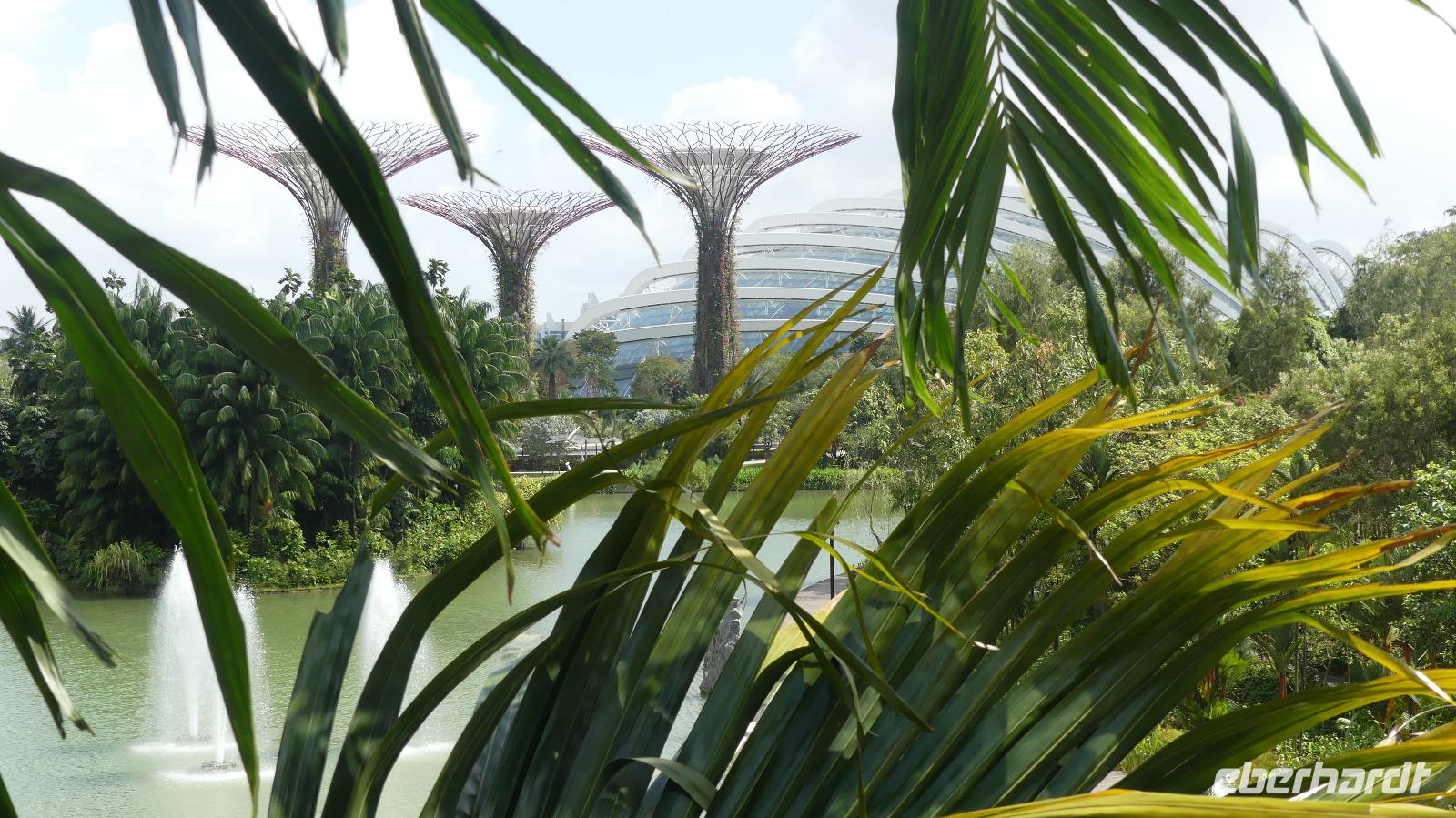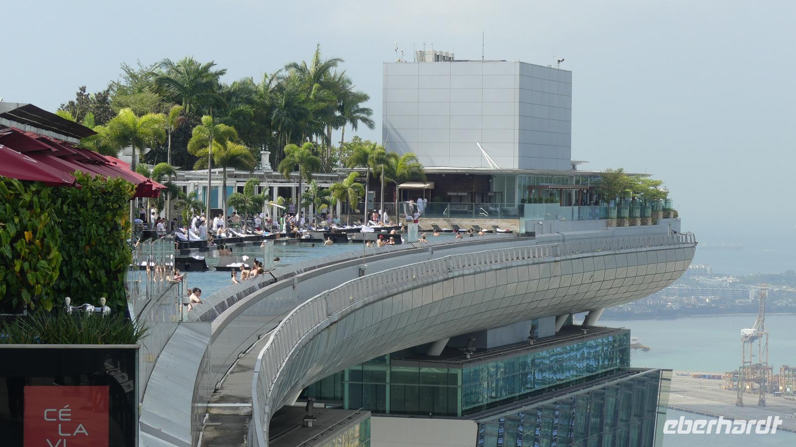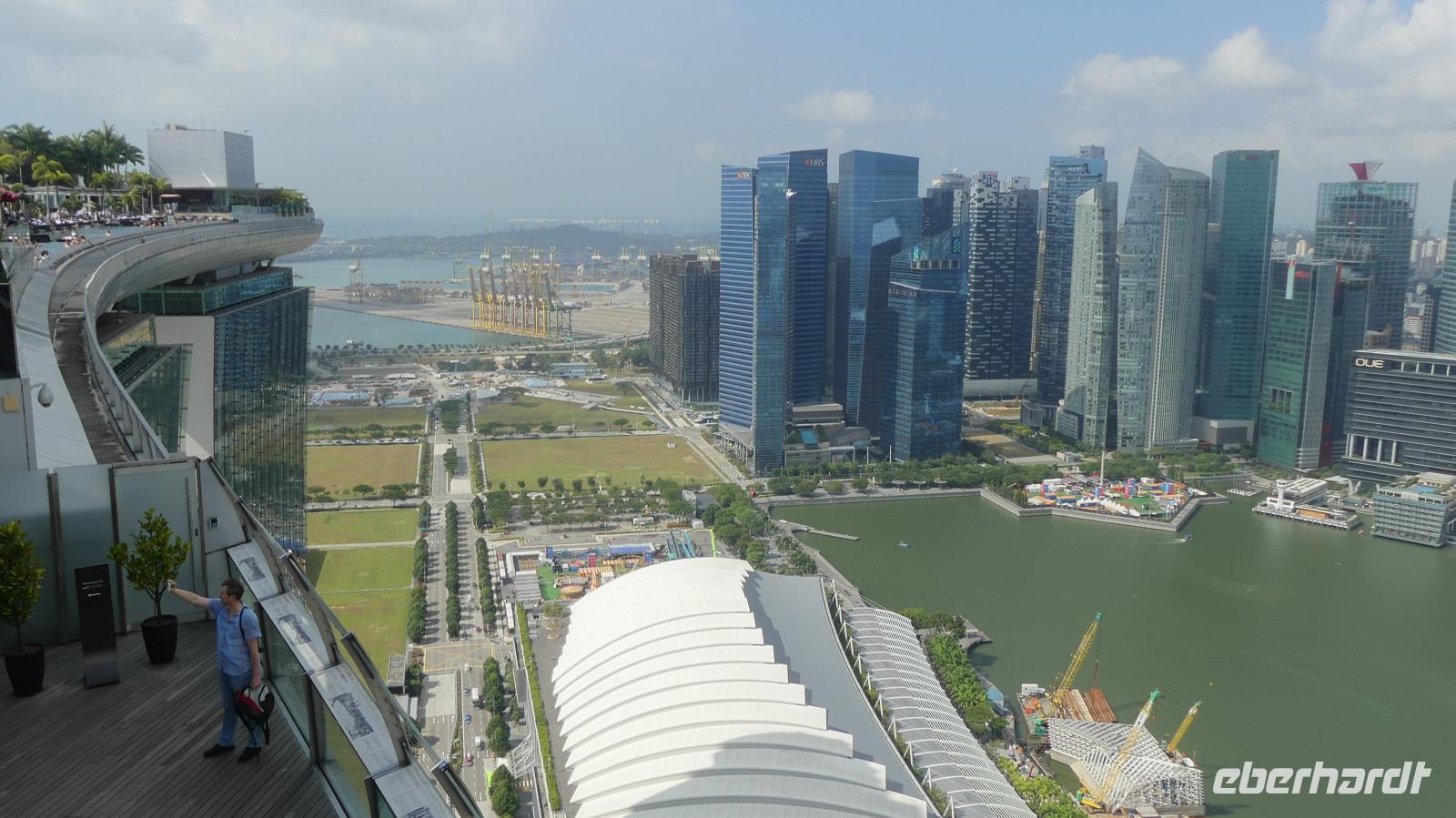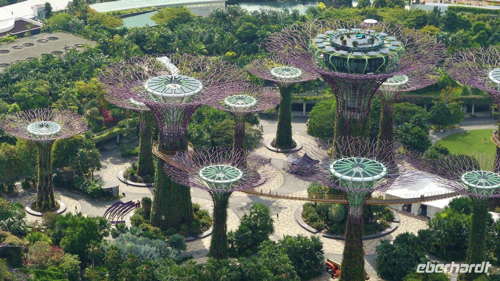 Am Vormittag geht es gleich nochmal zum Marina Bay Sands Hotel. Einer der drei Taxifahrer hat es mit der Zielangabe nicht so genau genommen, so dass wir uns erstmal finden müssen... Unser Ziel ist der Skypark, also die Aussichtsplattform auf dem „Bügeleisen". Das Wetter spielt gut mit, die Sonne strahlt und die Sicht aus 200 Meter Höhe ist auch gut. Etwas um die Ecke können wir den Infinity Pool erblicken. Außerdem sehen wir die Wolkenkratzer des Bankenviertels, Riesenrad und unser nächstes Ziel, den tropischen Garten mit den Superbäumen, Gardens by the Bay. Der Garten mit den künstlichen Superbäumen bietet zusammen mit dem Marina Bay Sands Hotel eine super Kulisse. Einige von uns nehmen den sogenannten Skyway, den Pfad oben entlang an den Kronen der Superbäume.