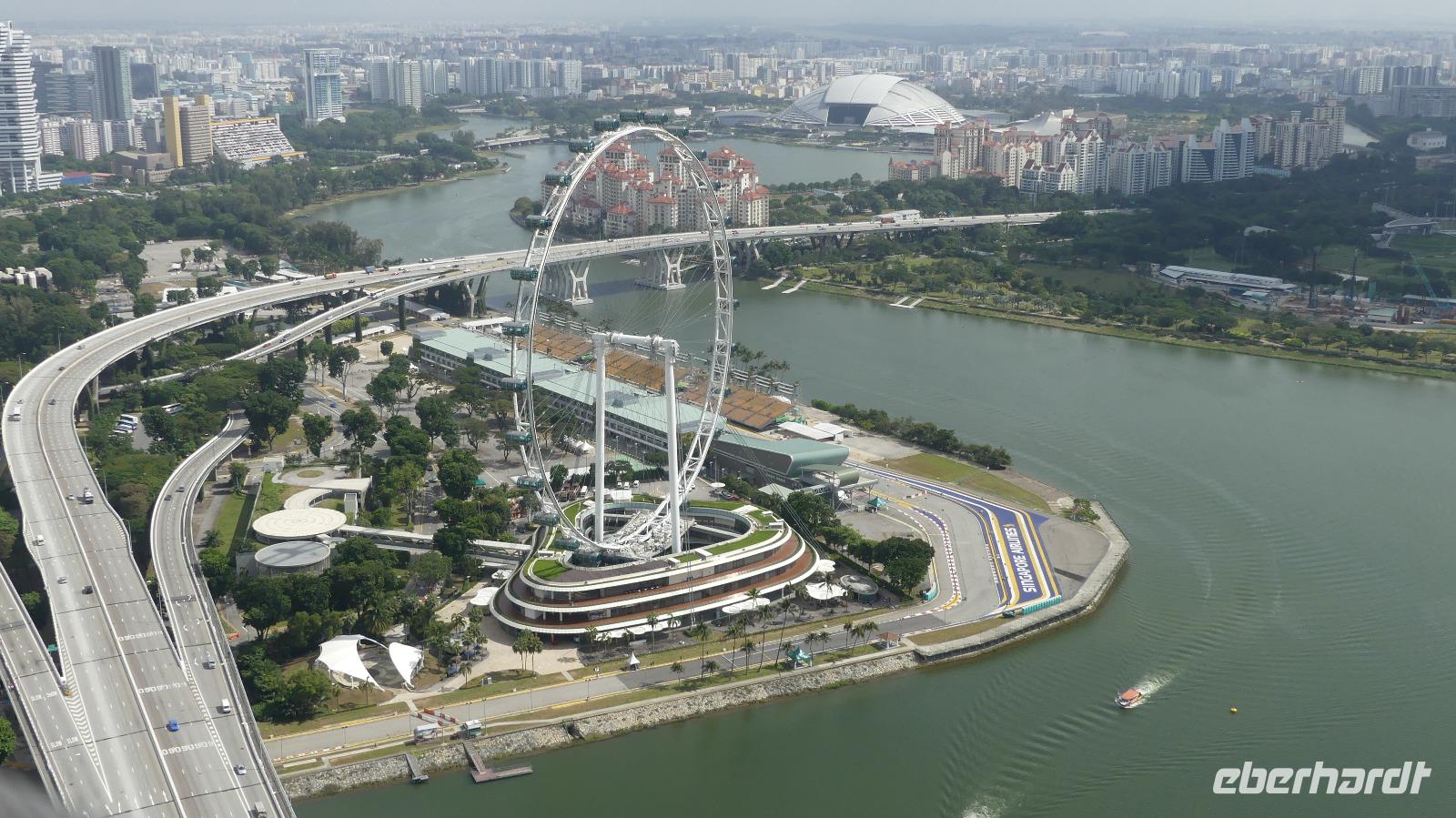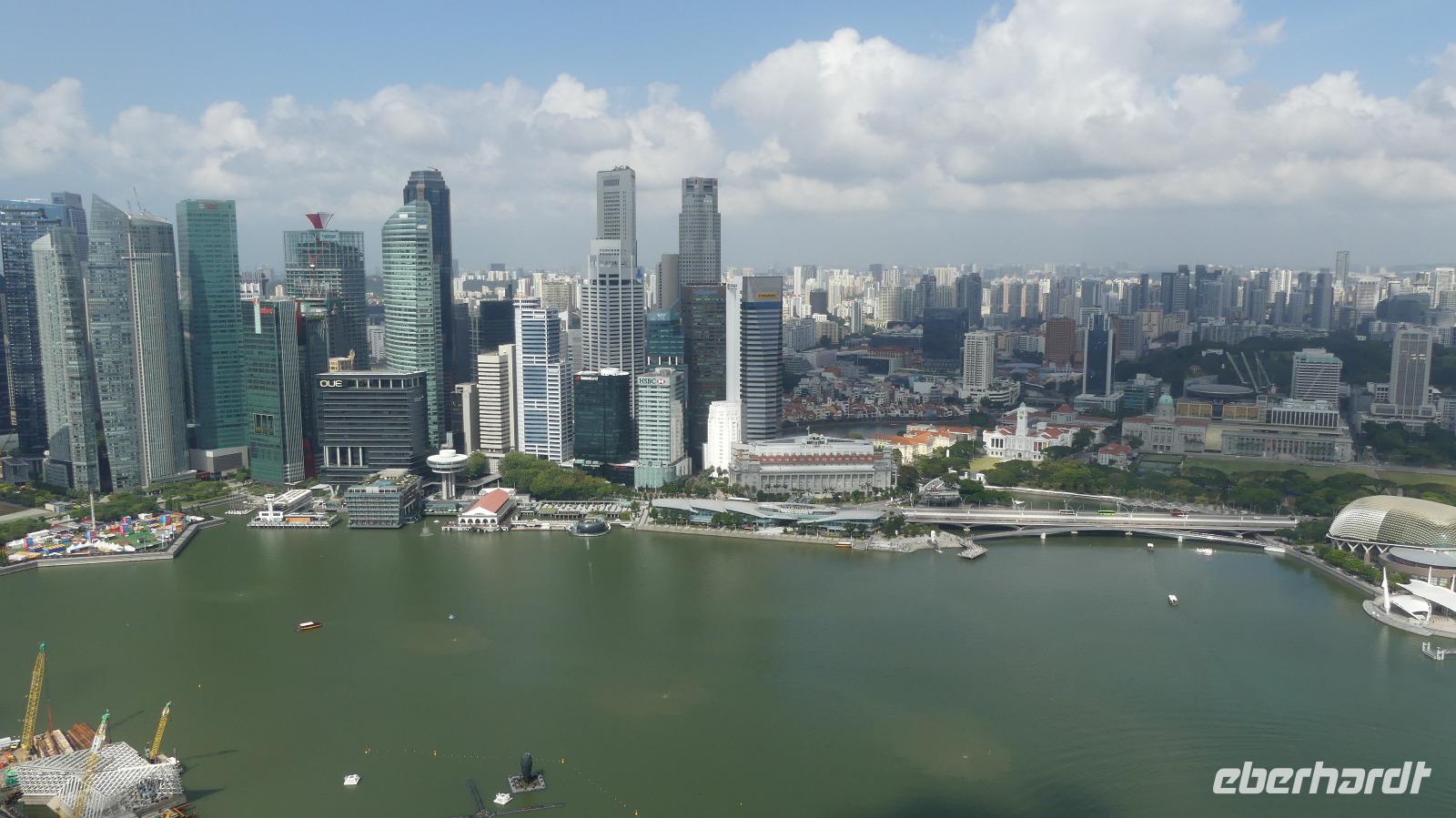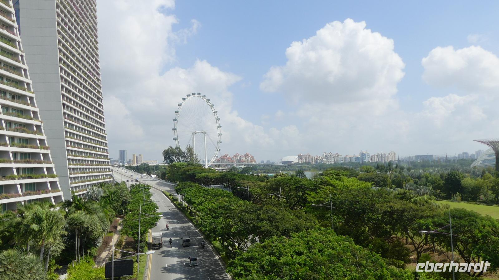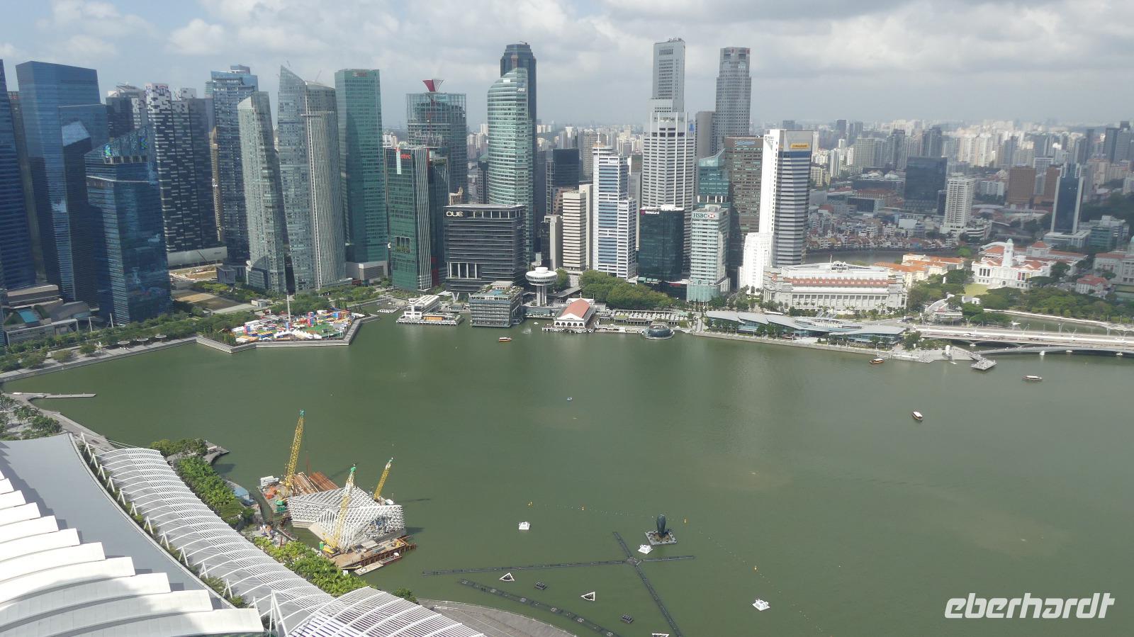 Am Vormittag geht es gleich nochmal zum Marina Bay Sands Hotel. Einer der drei Taxifahrer hat es mit der Zielangabe nicht so genau genommen, so dass wir uns erstmal finden müssen... Unser Ziel ist der Skypark, also die Aussichtsplattform auf dem „Bügeleisen". Das Wetter spielt gut mit, die Sonne strahlt und die Sicht aus 200 Meter Höhe ist auch gut. Etwas um die Ecke können wir den Infinity Pool erblicken. Außerdem sehen wir die Wolkenkratzer des Bankenviertels, Riesenrad und unser nächstes Ziel, den tropischen Garten mit den Superbäumen, Gardens by the Bay. Der Garten mit den künstlichen Superbäumen bietet zusammen mit dem Marina Bay Sands Hotel eine super Kulisse. Einige von uns nehmen den sogenannten Skyway, den Pfad oben entlang an den Kronen der Superbäume.