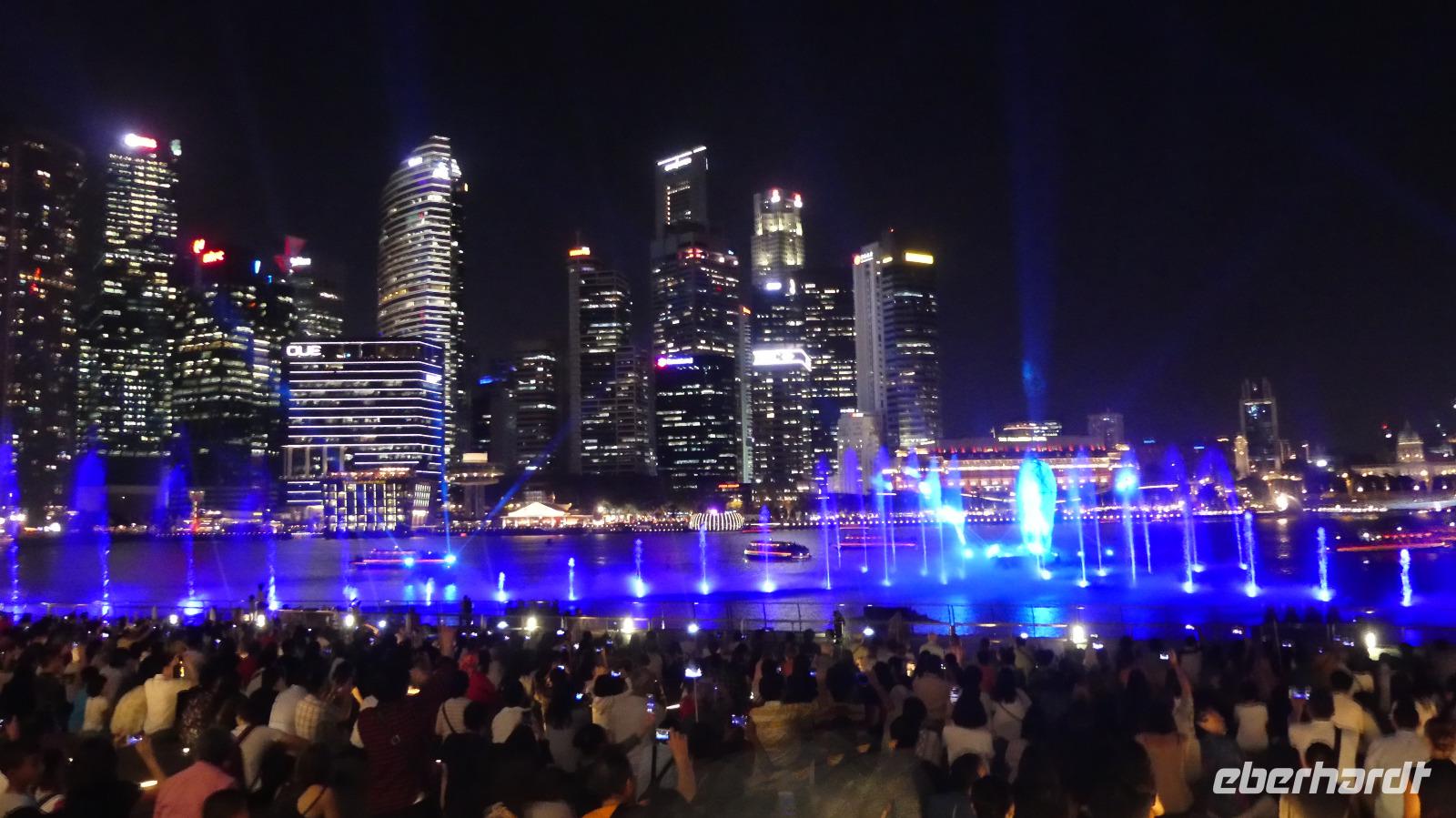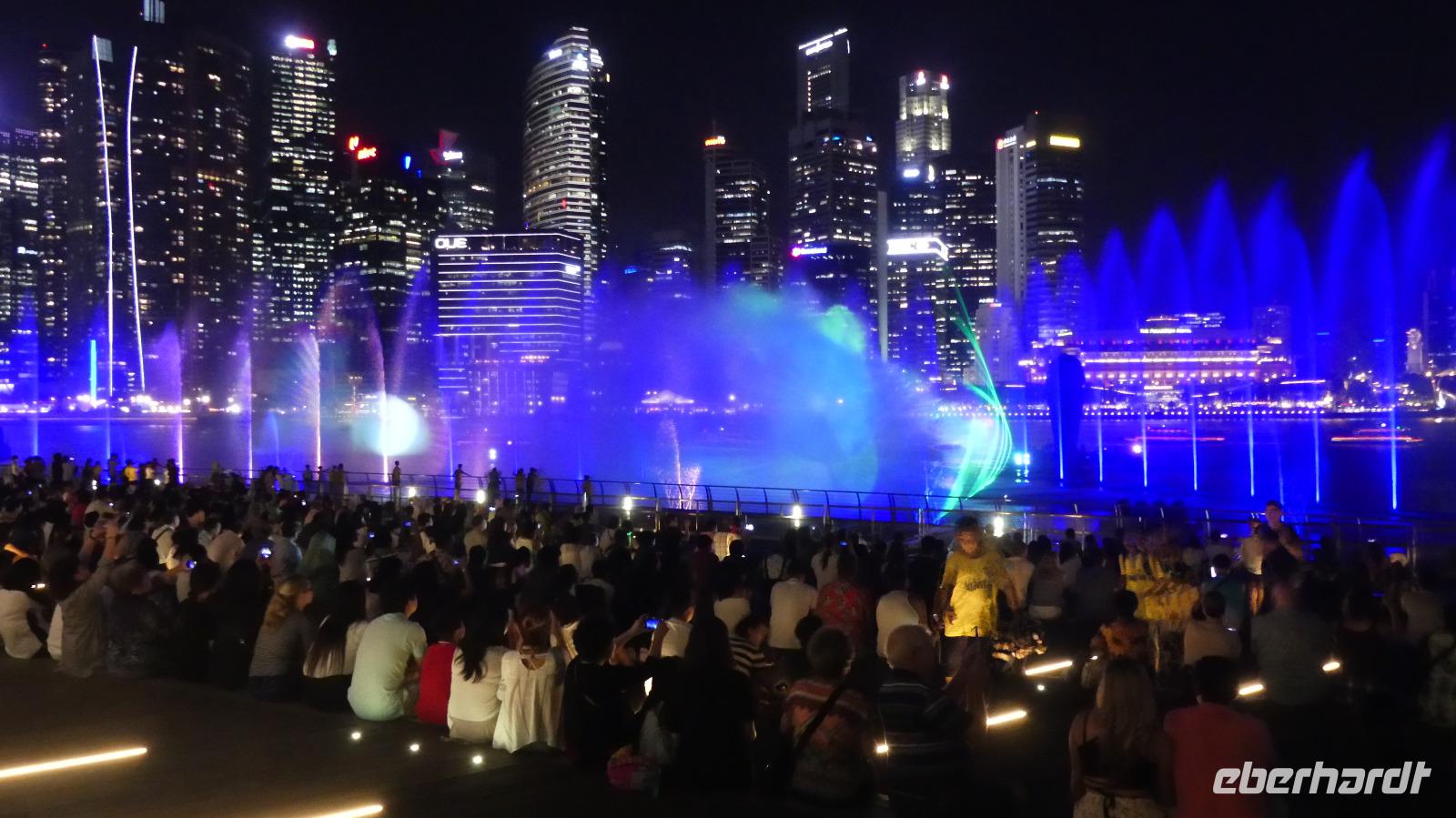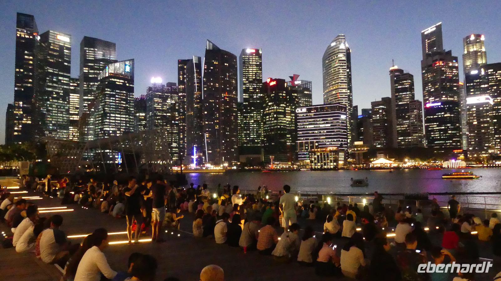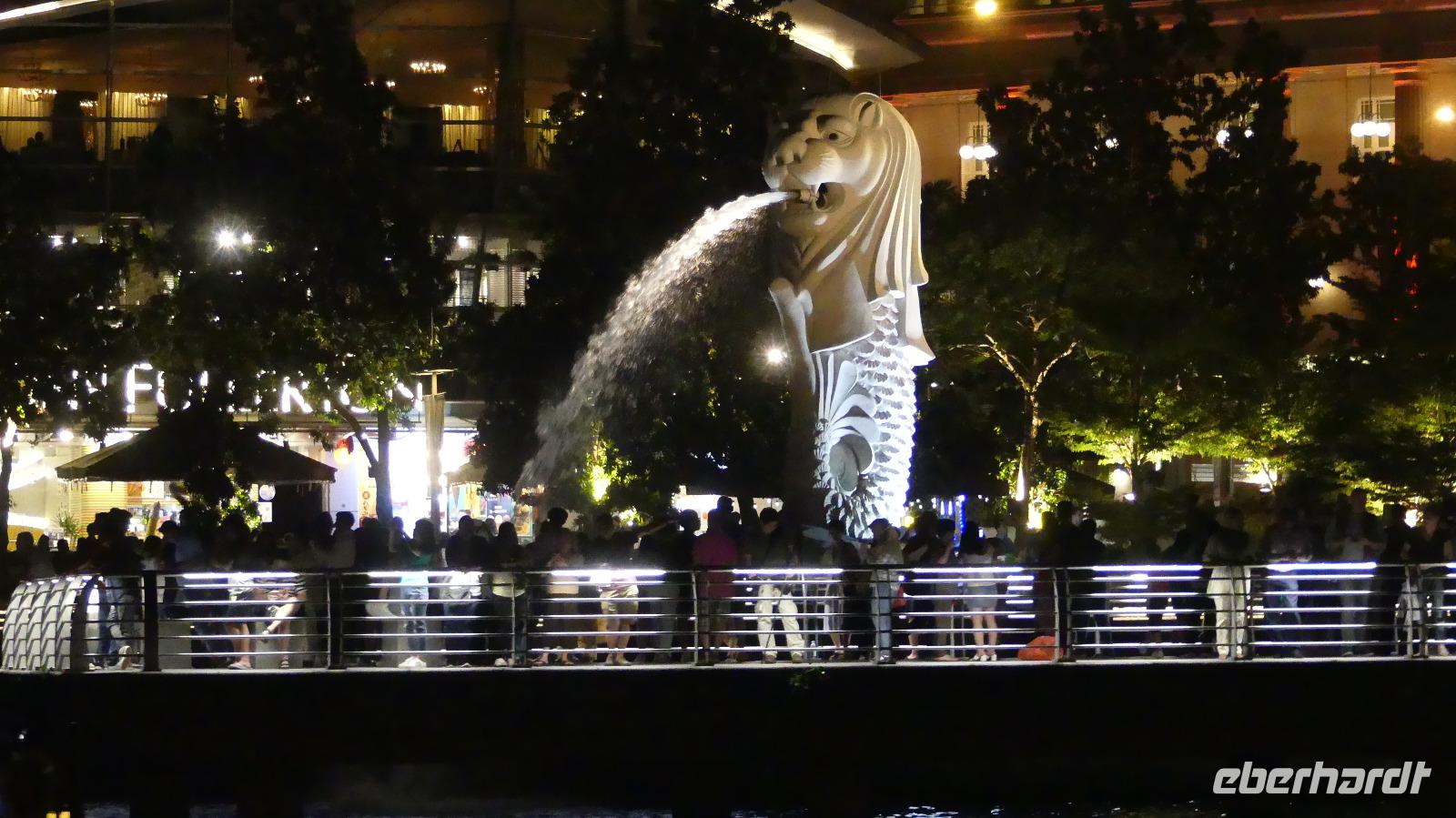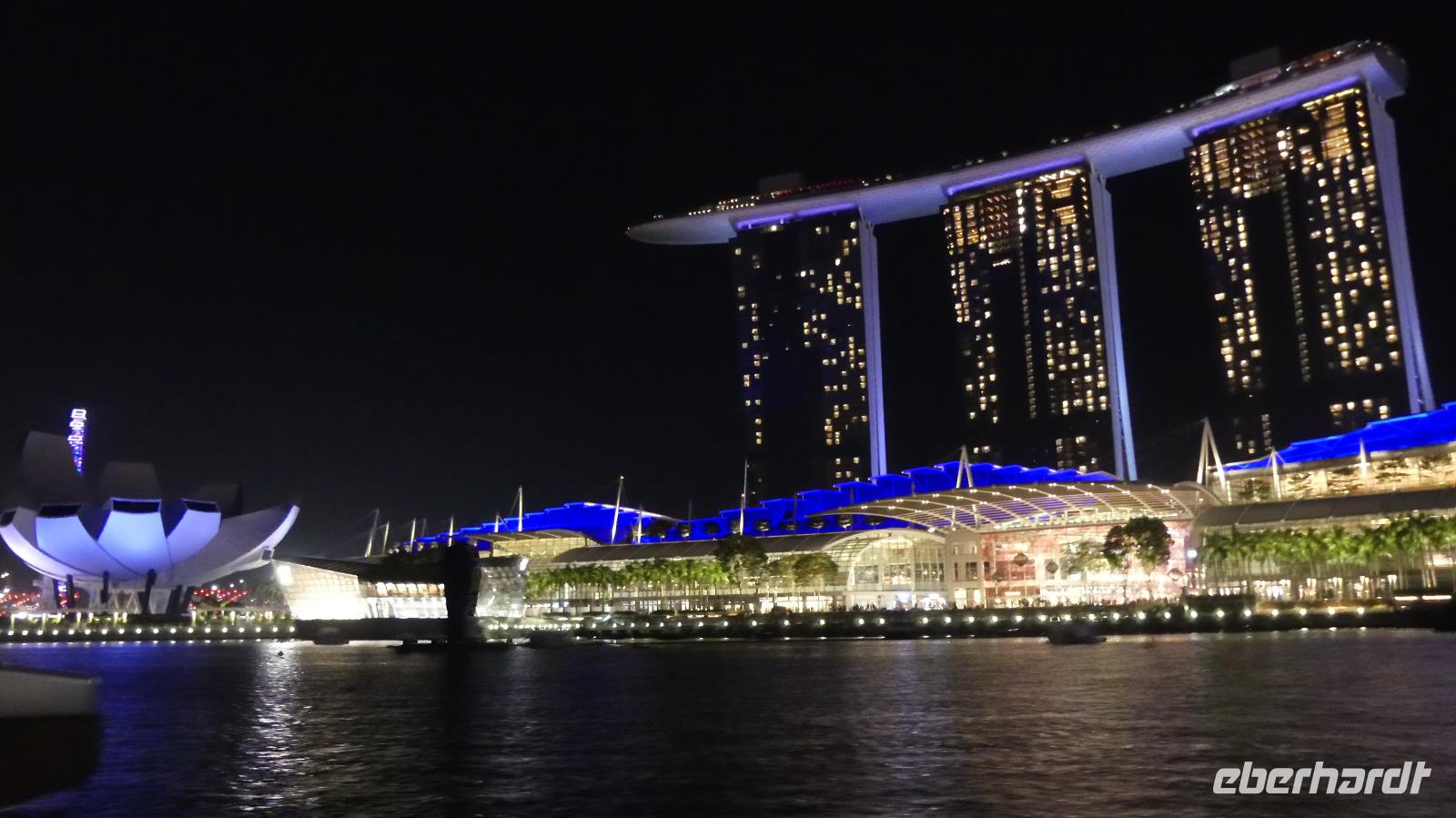 Singapur empfängt uns am Montagnachmittag von seiner besten Seite - Sonnenschein und 28 Grad. David begrüßt uns und während der Fahrt zum Hotel stellt er uns schon mal seine Stadt vor. Uns fällt das üppige Grün auf, darunter die riesigen Alleebäume, die Raintrees. Auch das Wahrzeichen Singapurs, das Marina Bay Sands Hotel sehen wir schon. Für sein Dach mit Infinity Pool gibt es solche Gleichnisse wie Bügelbrett, Skateboard auf drei Pfeilern oder den Vergleich mit einem Schiff. Am Abend ist dann auch Marina Bay Sands unser Ziel. Am Event Plaza verfolgen wir eine beeindruckende Lasershow vor der Kulisse des Bankenviertels. Nach einem Imbiss nehmen wir ein Ausflugsboot Richtung Singapore River zu unserem Hotel, so können wir die Skyline bei Nacht bewundern.