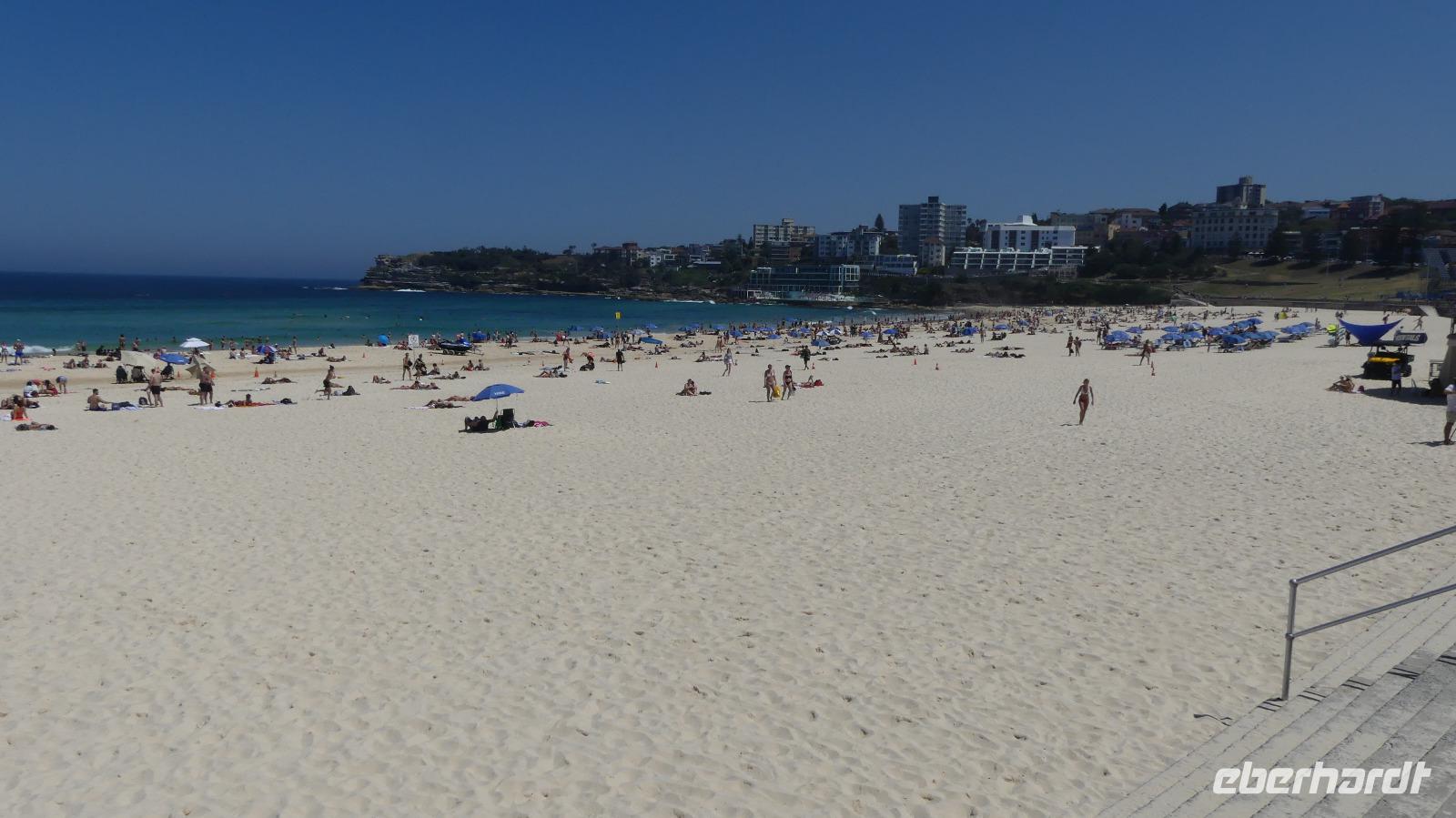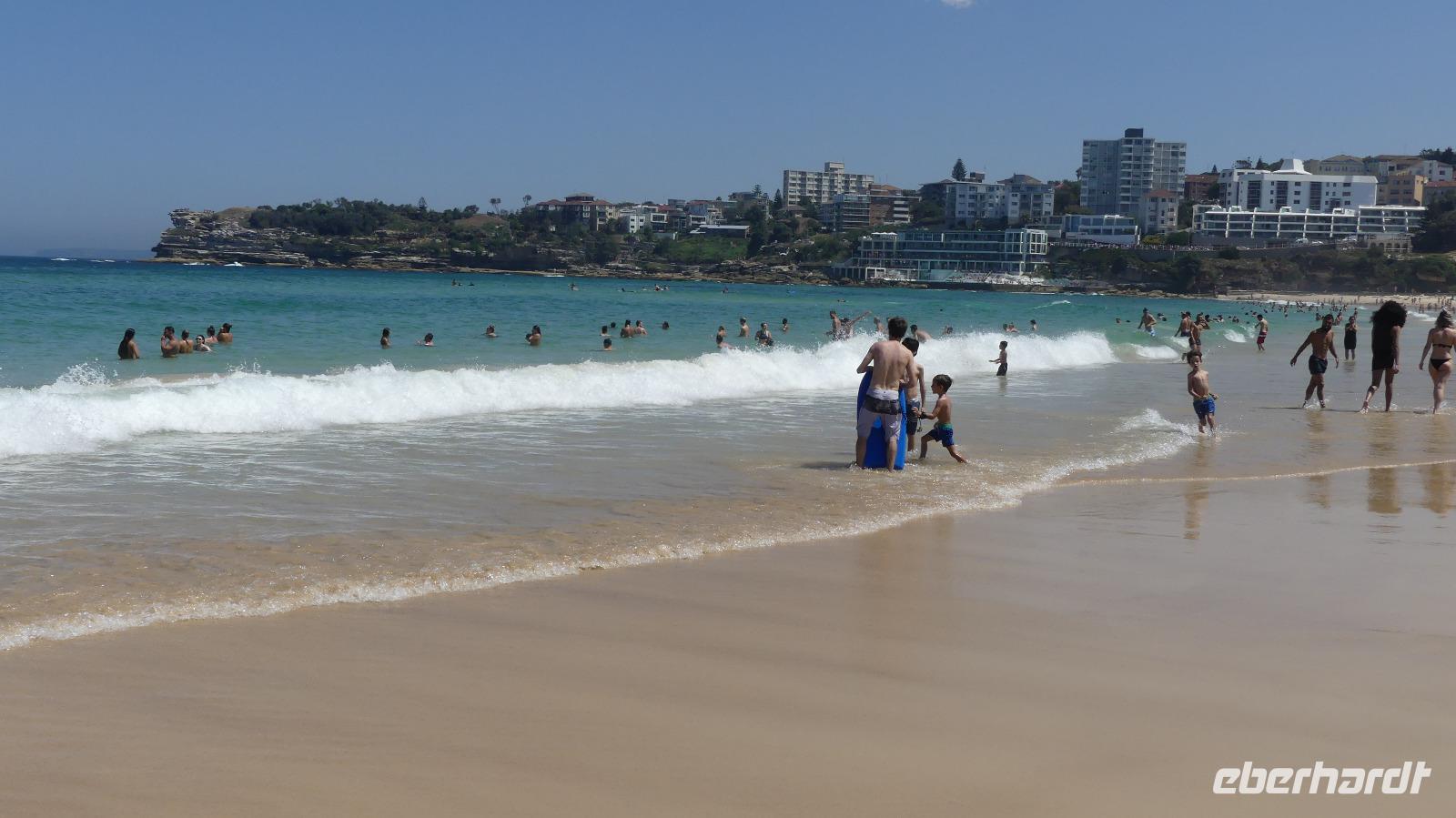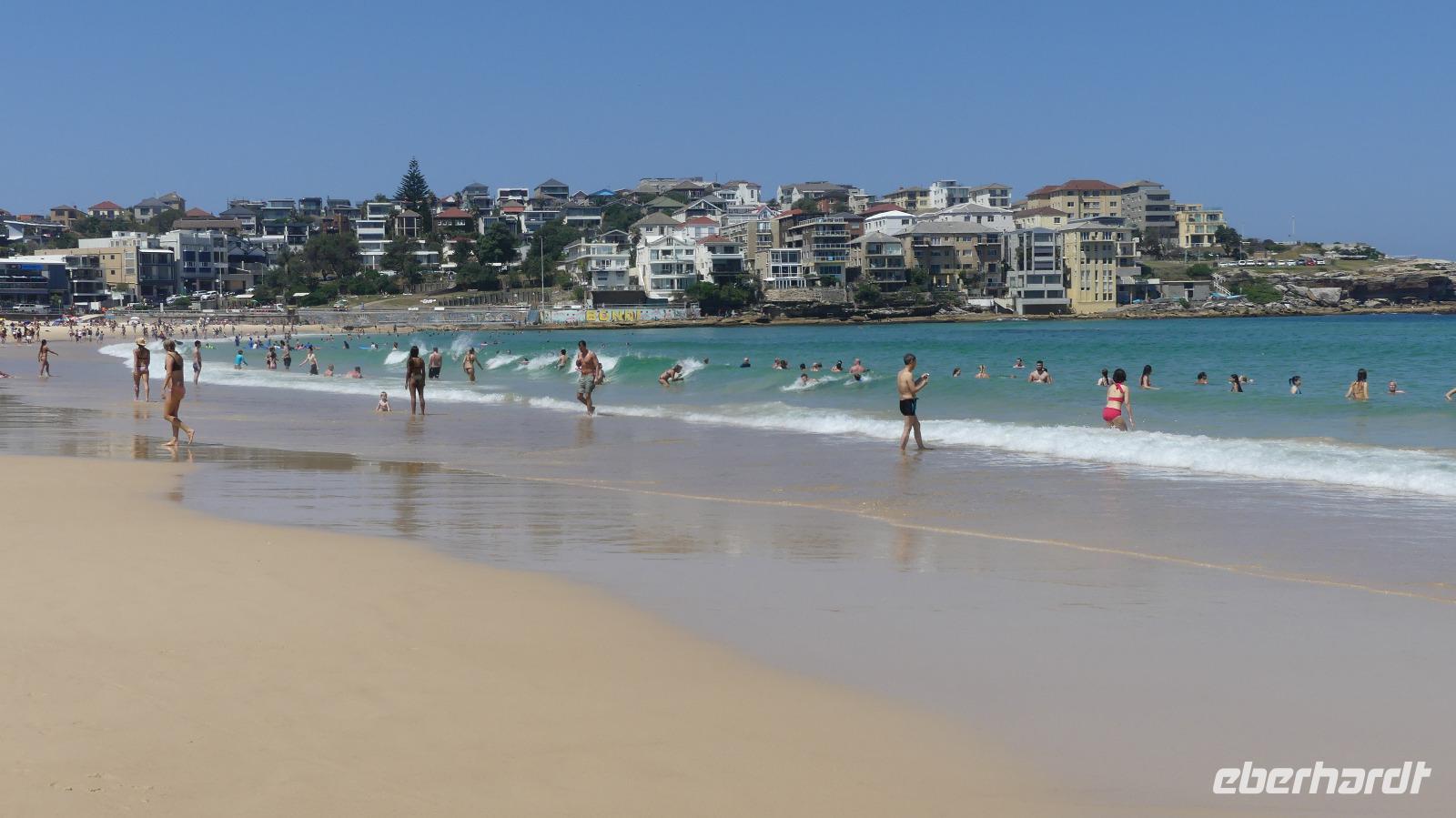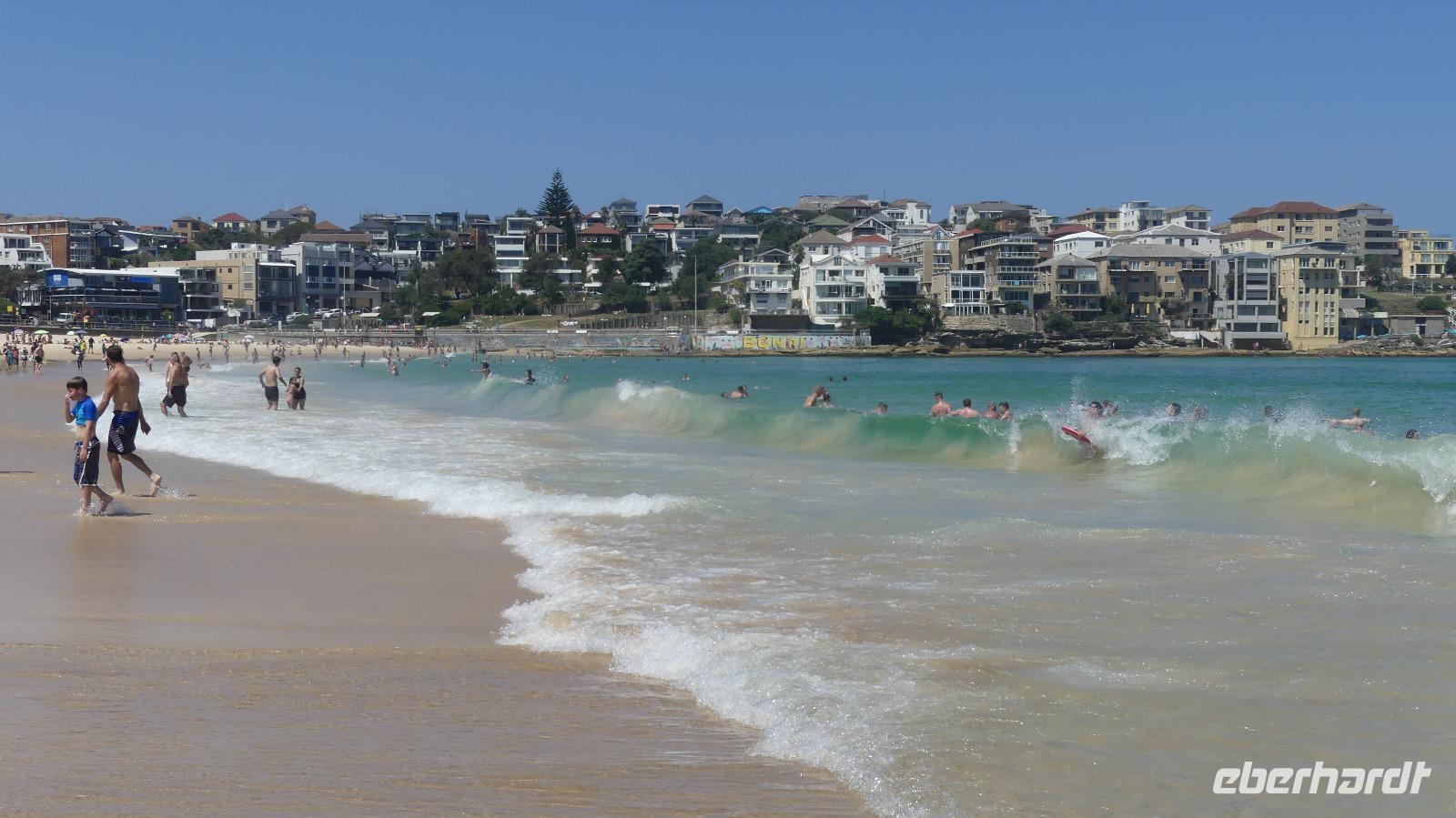 Gegen 7.00 Uhr am Morgen landen wir in Sydney. Während der letzten Stunden im Flieger waren mehrere Kleinkinder ziemlich aktiv, es war also nicht viel mit Schlafen...Die lange Warteschlange bei der Einreise bewegt sich zügig, wir kommen (fast) alle zügig durch die Kontrollen. Vorm Flughafen empfängt uns Ulricke, kurz Uli und auch unsere vier „Neuseeländer" sind pünktlich angekommen. Nun sind wir also eine Gruppe von 14 Reiselustigen auf dem Weg durch das „Goldene Dreieck" Australiens. Im zentral gelegenen Hotel können wir schon am Morgen unsere Zimmer beziehen, noch frühstücken und uns etwas ausruhen. Dann zeigt uns Uli ihre Stadt. Nach einer Orientierungsfahrt durch Sydneys Innenstadt halten wir direkt unter der riesigen Harbour Bridge. Von hier aus sehen wir erstmals das berühmte Opernhaus. Weitere Stationen sind die Rose Bay, Vaucluse (Fotostopp mit Blick auf Sydney) und die Steilküste am Pazifik mit dem Hornby Leuchtturm, wo die Bucht von Sydney beginnt. Einen längeren Halt legen wir am berühmtesten Strand Sydneys, dem Bondi Beach ein. Zeit für einen Strandspaziergang oder ein Bad im etwa 22-23 Grad warmen Pazifik bei sommerlichen Lufttemperaturen von bis zu 32 Grad. Und wer jetzt schwitzt, der denke einfach mal an das Wetter zu Hause...