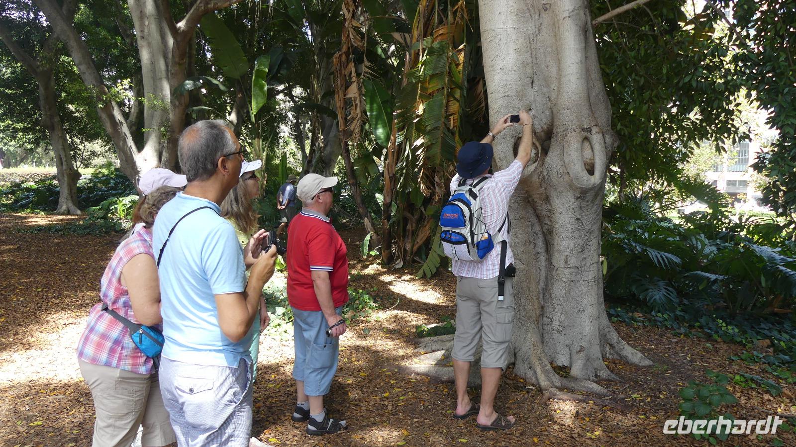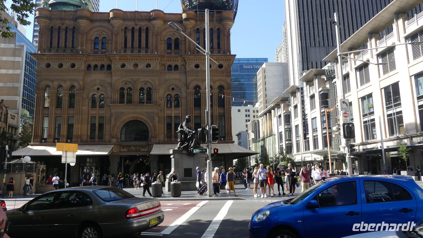 Wir lassen es heute ruhig angehen, erstmal ausschlafen und in Ruhe frühstücken. Dann unternehmen wir mit Uli einen entspannten Spaziergang durch Sydneys Innenstadt. Zuerst kommen wir in den Hyde Park mit dem ANZAC Denkmal (ANZAC steht für Australian and New Zealand Army Corps). Wir erfahren, dass man in australischen Parkanlagen „Rasenlatscher" sein darf und unter riesigen Fikusbäumen entdecken wir in einem Baumstamm sogar ein Opossum. Auf unserem weiteren Weg kommen wir vorbei an: