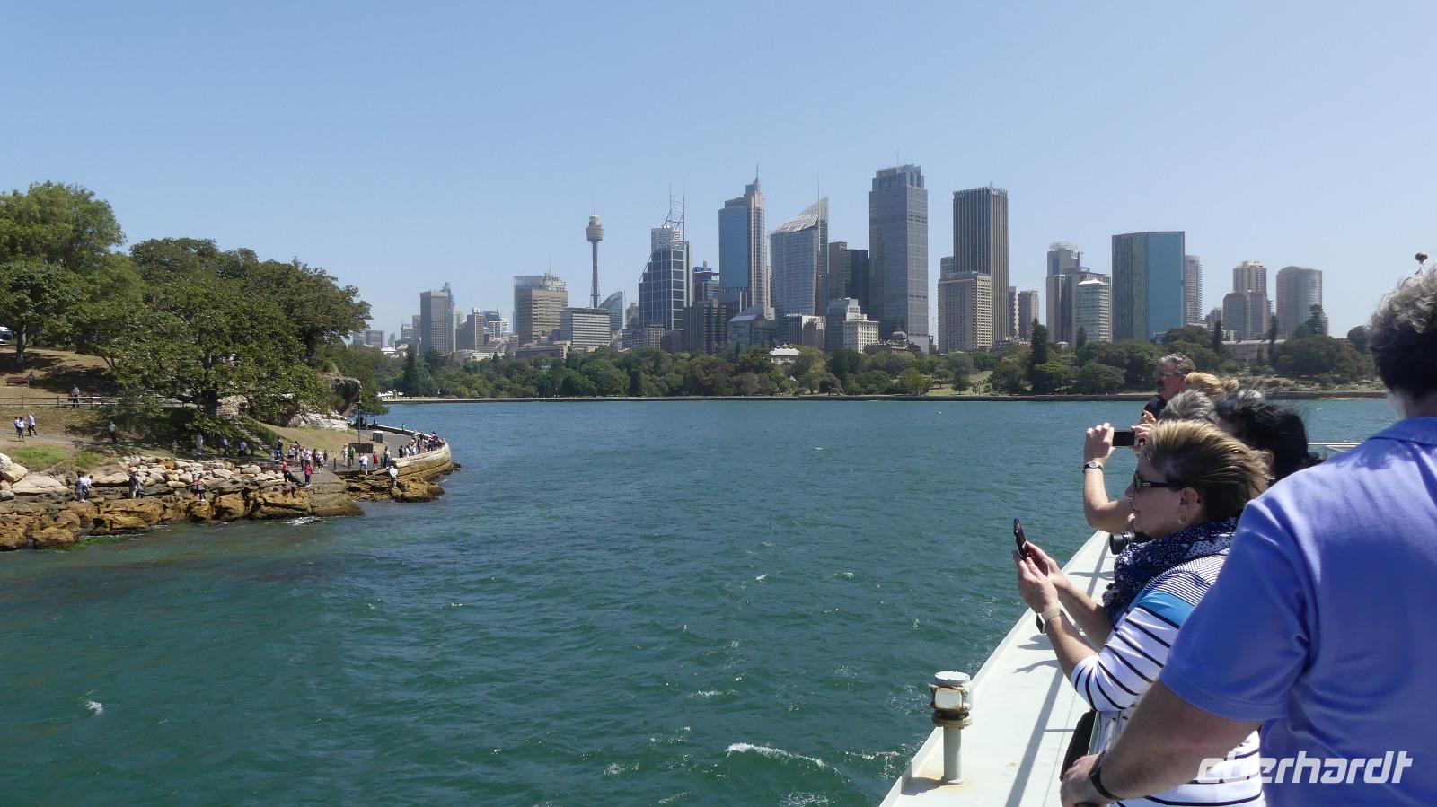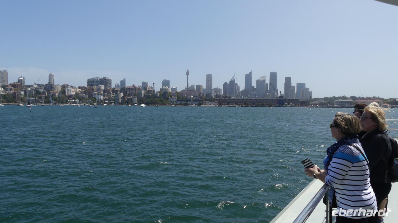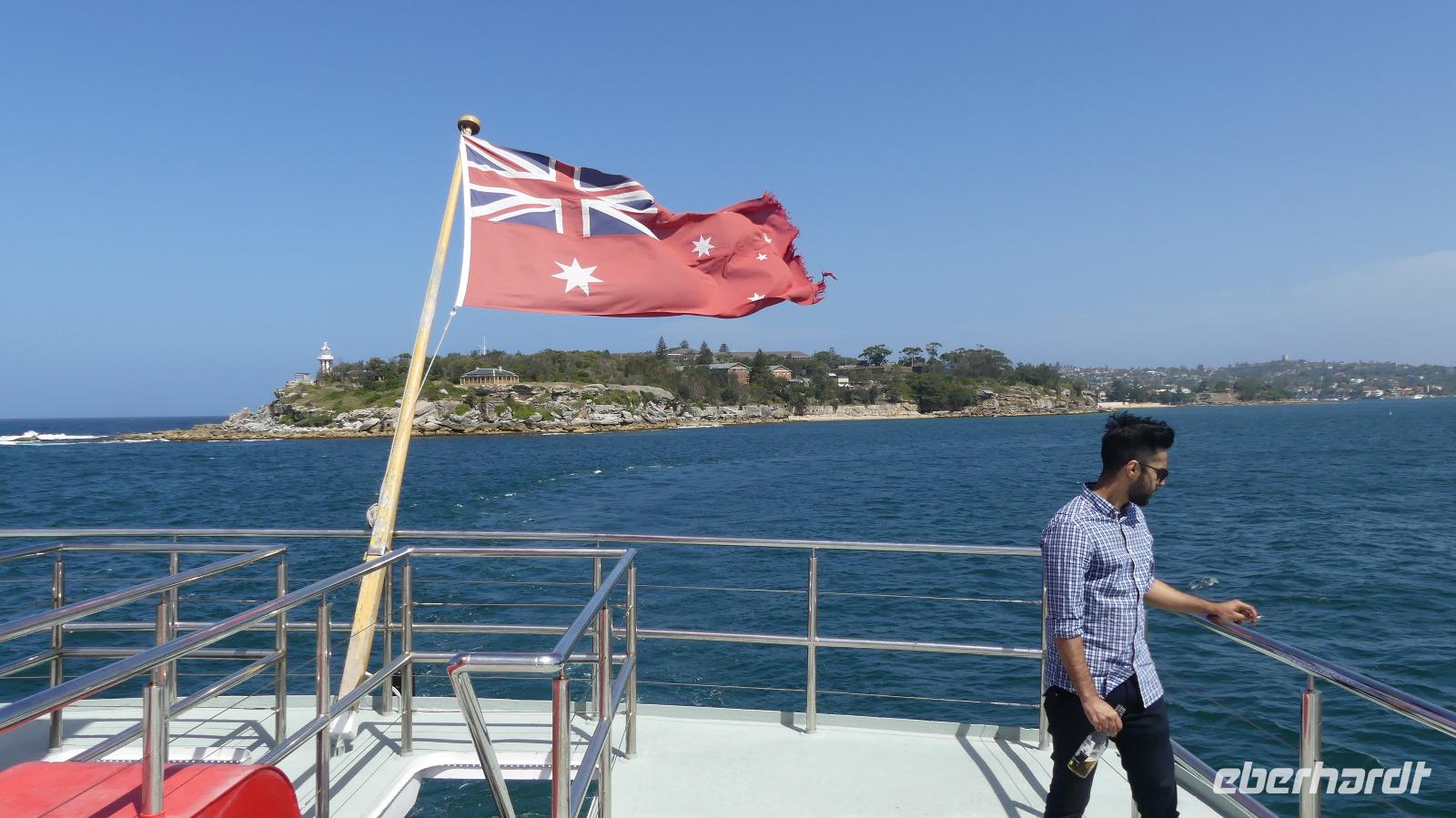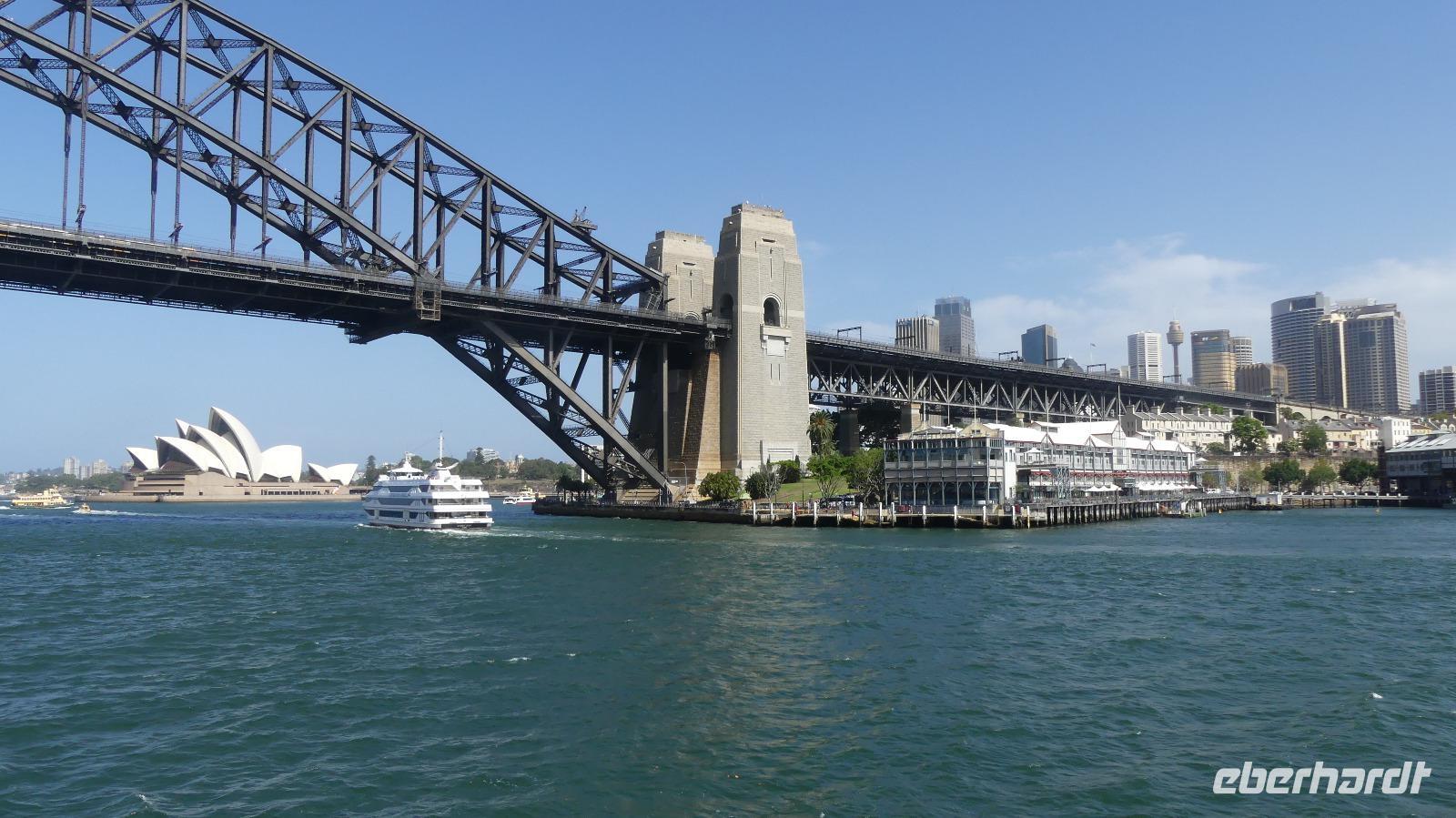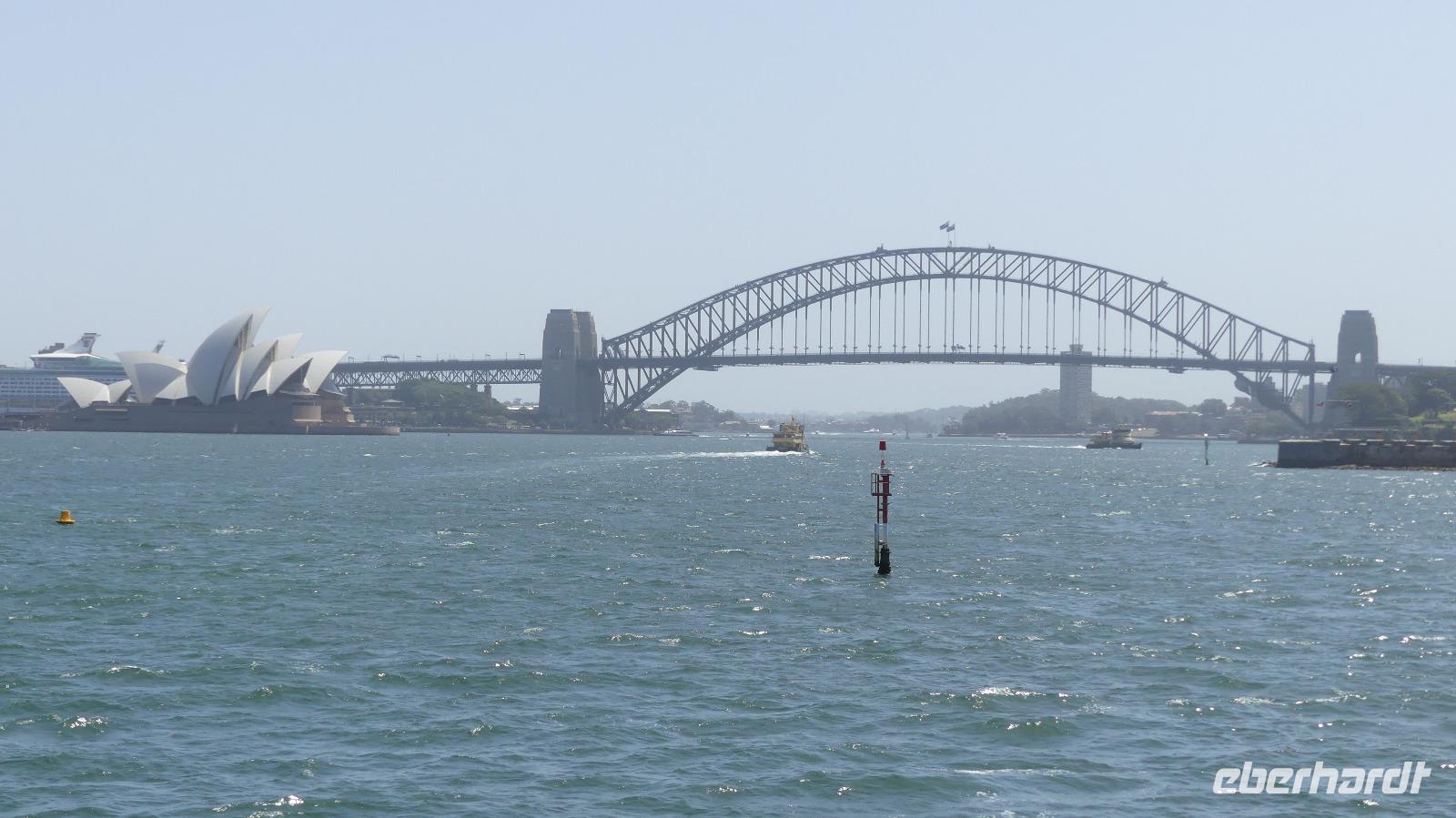 Im Hafen neben der Oper am Clarke Quay gehen wir an Bord eines Schiffes. Die zweistündige Rundfahrt durch diesen riesigen Naturhafen führt entlang vieler Buchten, Villen bebauter Ufer (erinnert mich irgendwie an Stockholm) bis an die 1,5 Kilometer breite Öffnung des Naturhafens zum Pazifik. In der anderen Richtung durchqueren wir die imposante Harbour Bridge bis zum Darling Harbour, wo wir heute Abend essen werden.