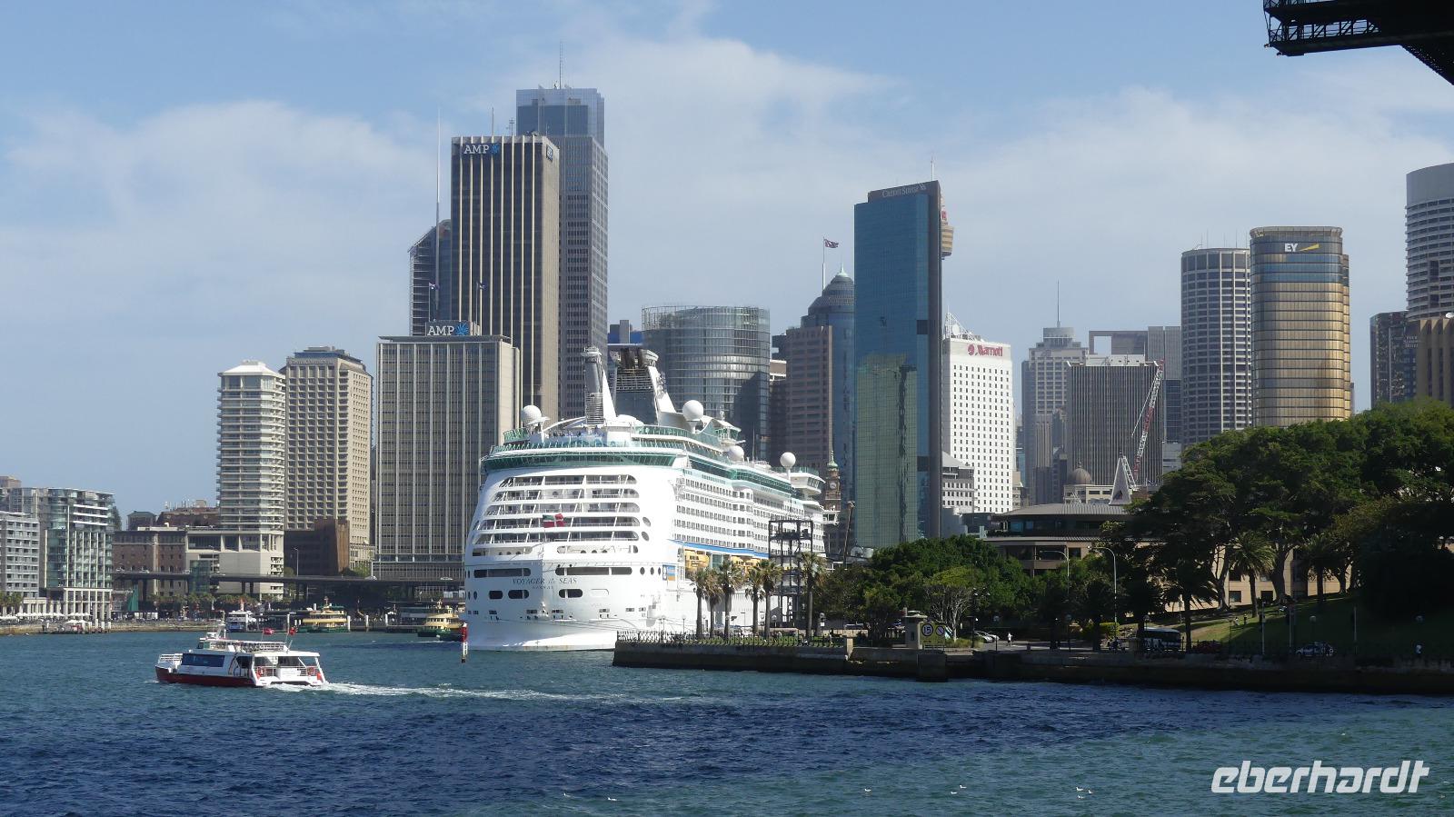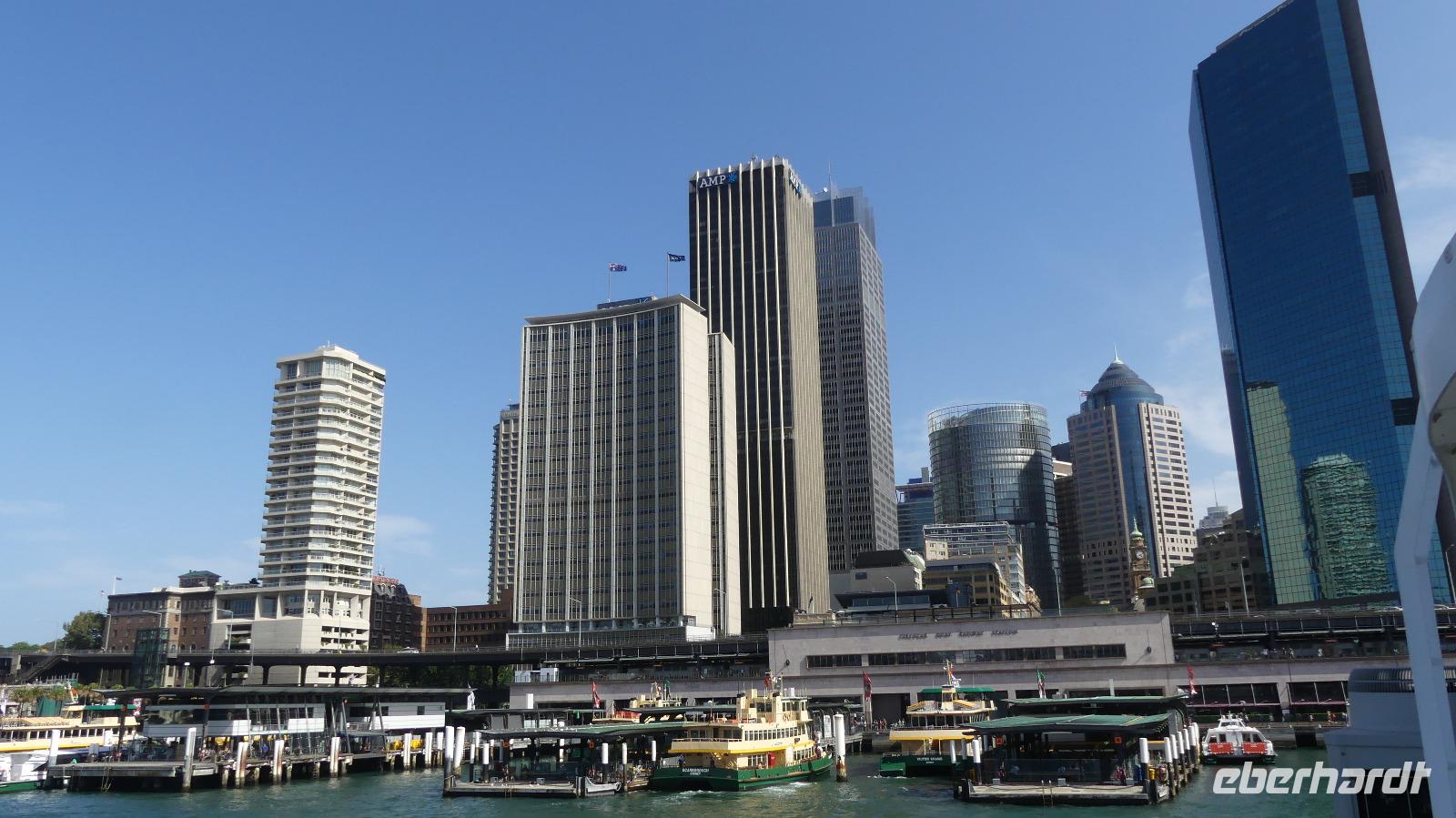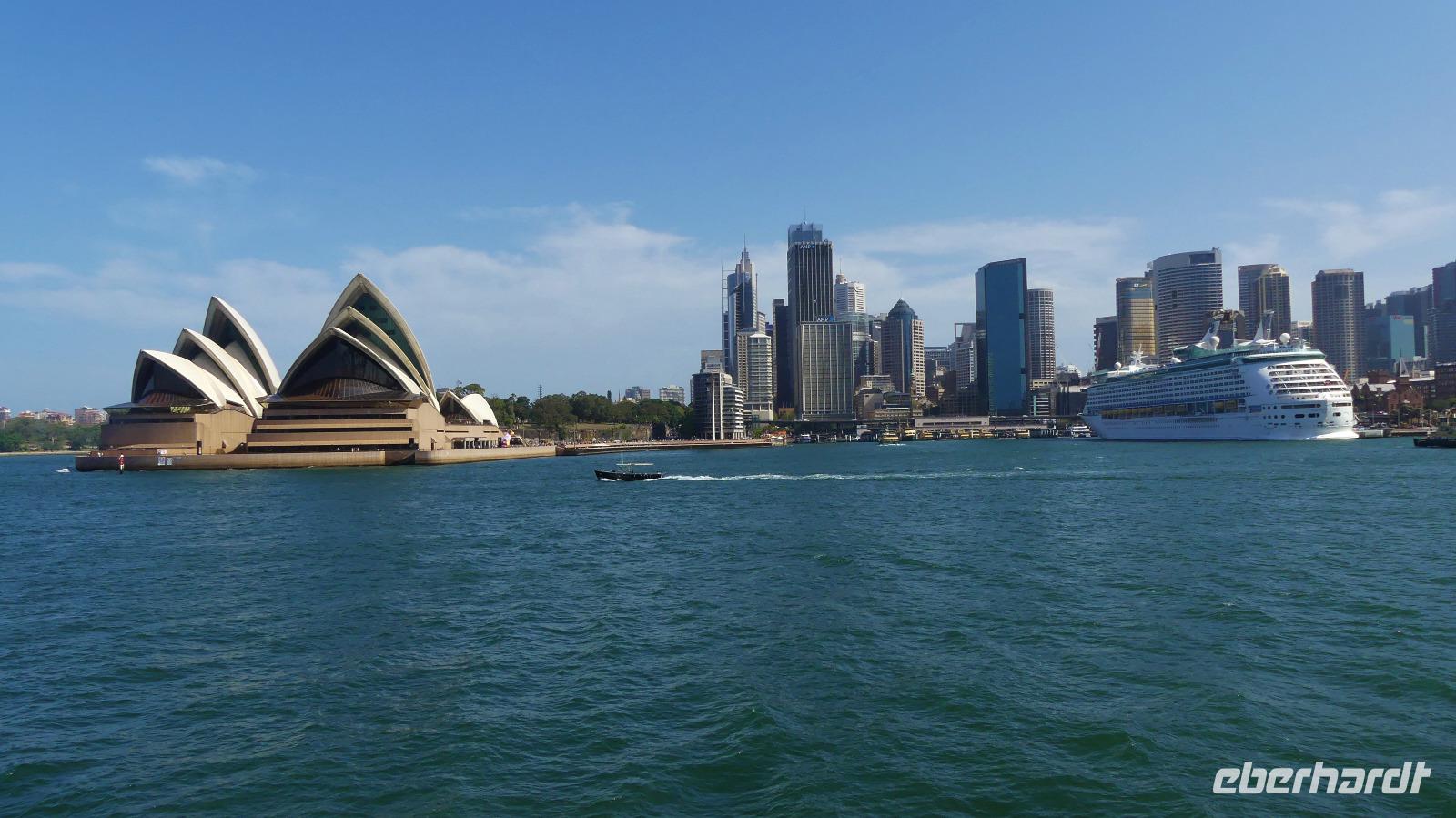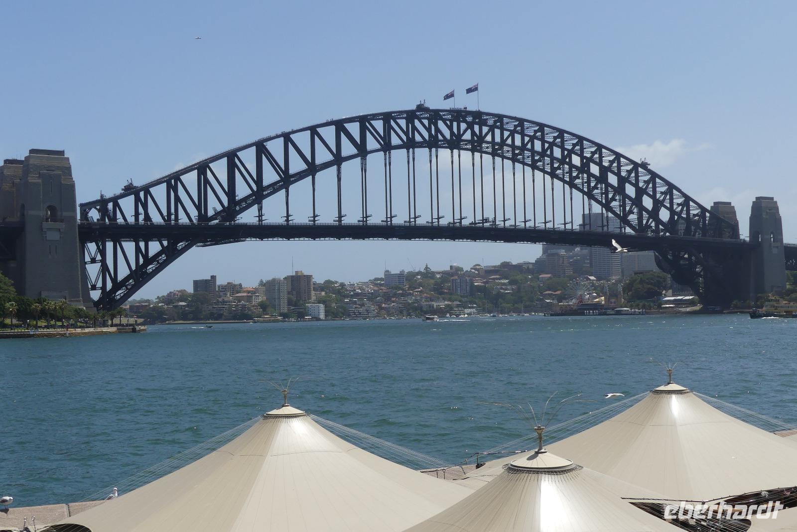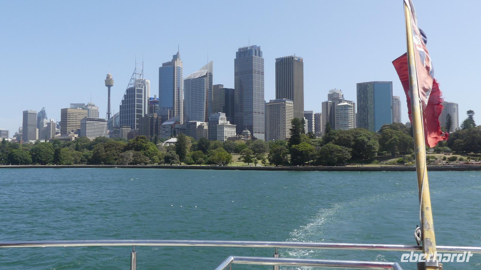 Im Hafen neben der Oper am Clarke Quay gehen wir an Bord eines Schiffes. Die zweistündige Rundfahrt durch diesen riesigen Naturhafen führt entlang vieler Buchten, Villen bebauter Ufer (erinnert mich irgendwie an Stockholm) bis an die 1,5 Kilometer breite Öffnung des Naturhafens zum Pazifik. In der anderen Richtung durchqueren wir die imposante Harbour Bridge bis zum Darling Harbour, wo wir heute Abend essen werden.