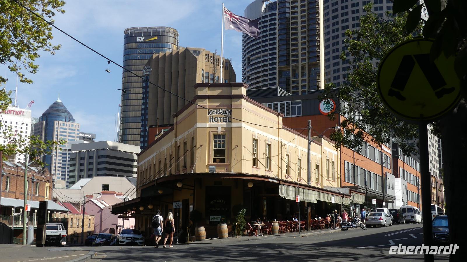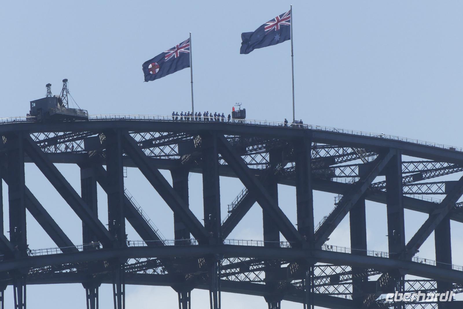 Nach unserer Hafenrundfahrt „entlassen" wir Uli für heute und unternehmen noch einen Abstecher durch The Rocks, die Altstadt hinauf zur Harbour Bridge...einmal auf dieser Brücke gestanden haben! Von der Mitte aus bietet sich ein grandioser Blick auf die Stadt und den Hafen.