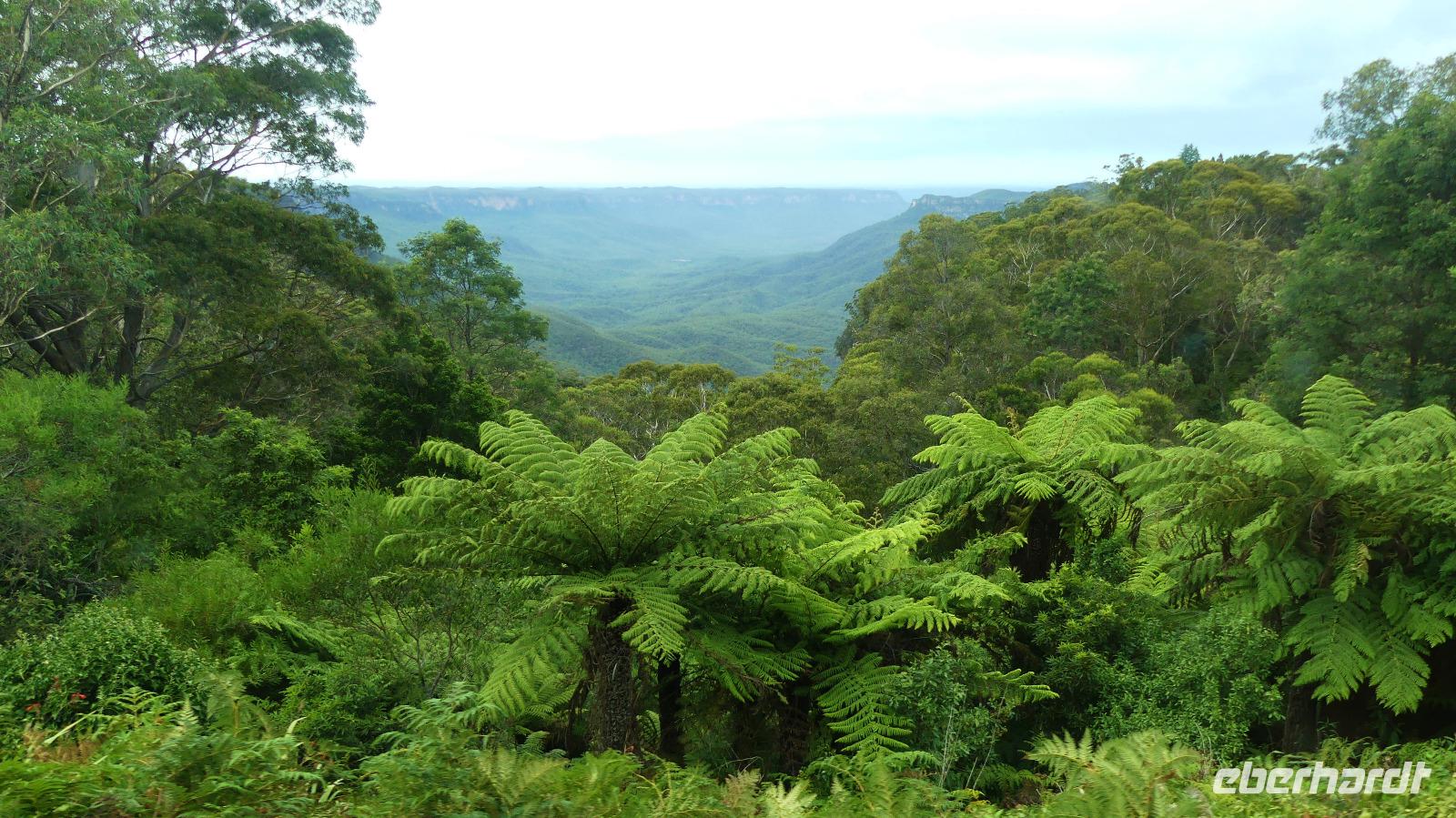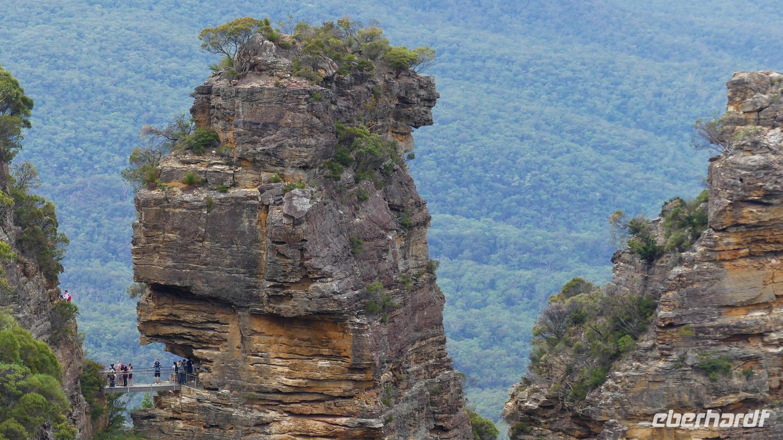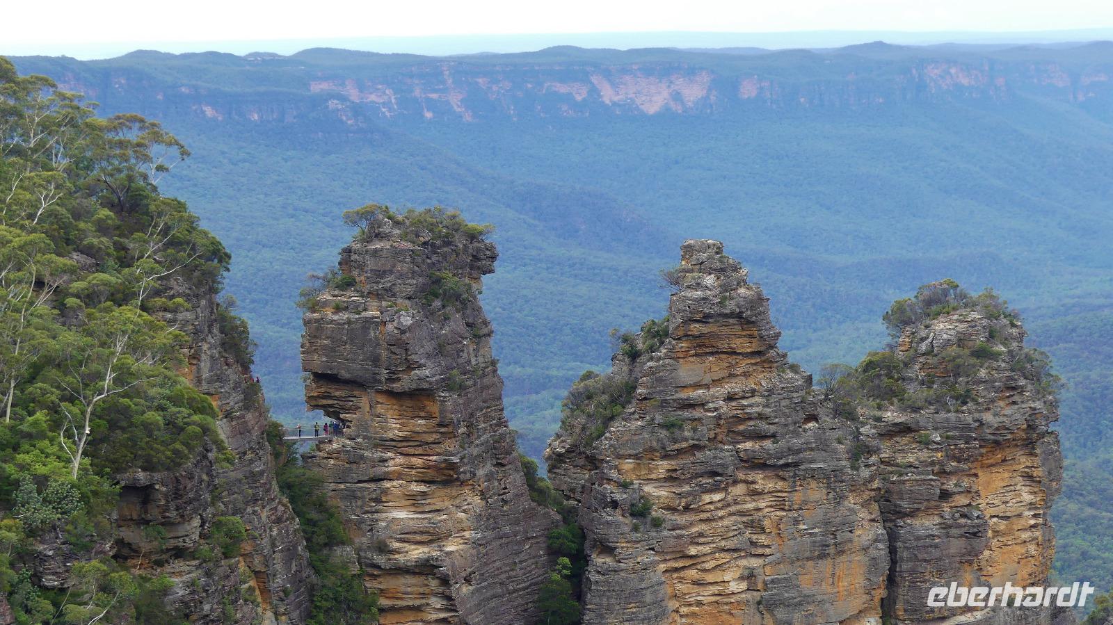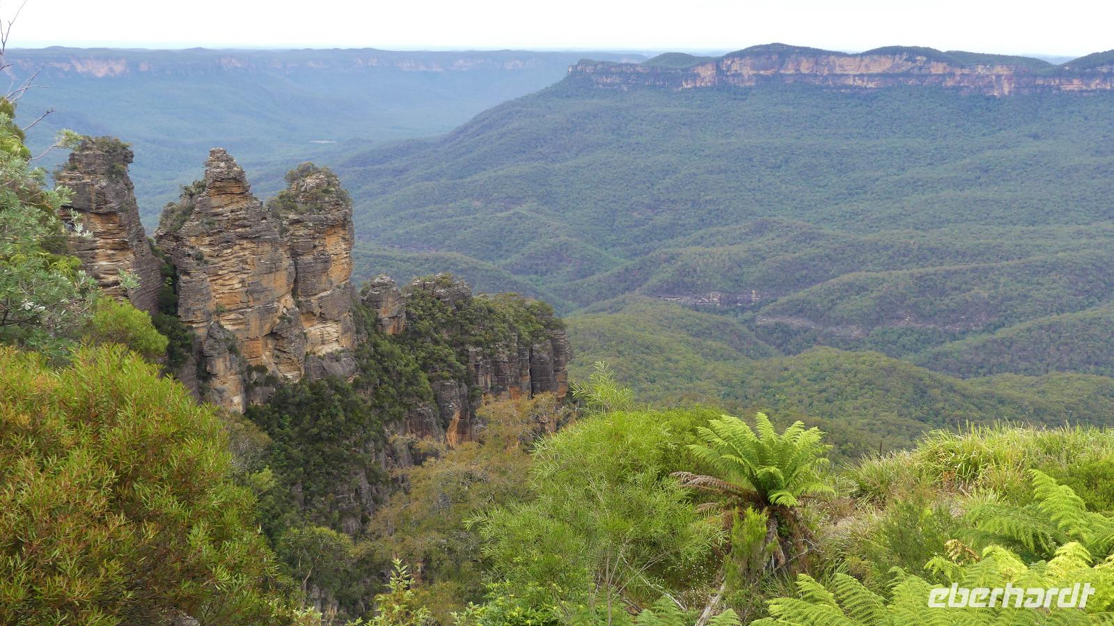 Nach einer Pause in Glenbrook (ich glaube hier sehen wir erstmals Kakadus) erreichen wir die Region Katoomba. An verschiedenen Aussichtspunkten sehen wir Sandsteinformationen der Blue Mountains, weite grüne Täler mit Eukalyptusbaumwäldern und die berühmte Felsformation der drei Schwestern. Als Dresdner erinnert mich diese Landschaft an unser Elbsandsteingebirge - die Blue Mountains wenn man so will das Elbsandsteingebirge mit Eukalyptusbaumwäldern? Und eben die Eukalyptusbäume sind es, die für das Blau in den Bergen sorgen, denn verdunstende ätherische Öle ihrer Blätter verursachen dieses blaue Schimmern. Bei einem kurzen Spaziergang durch den „Zauberwald" wie ihn Uli nennt, lernen wir etwas von der australischen Flora kennen, zum Beispiel die Küstenbanksie (Strauch mit gelb-oranger Blüte),den Bergteufel mit seiner roten Blüte, Teebaumsträucher und Baumfarne. An einer Aussichtsplattform haben wir das Glück, Rosellas (Crimson Rosella, eine Sittichart) zur beobachten. Queen Elisabeth war auch schon hier, eine Tafel erinnert an ihren Besuch 1954.
